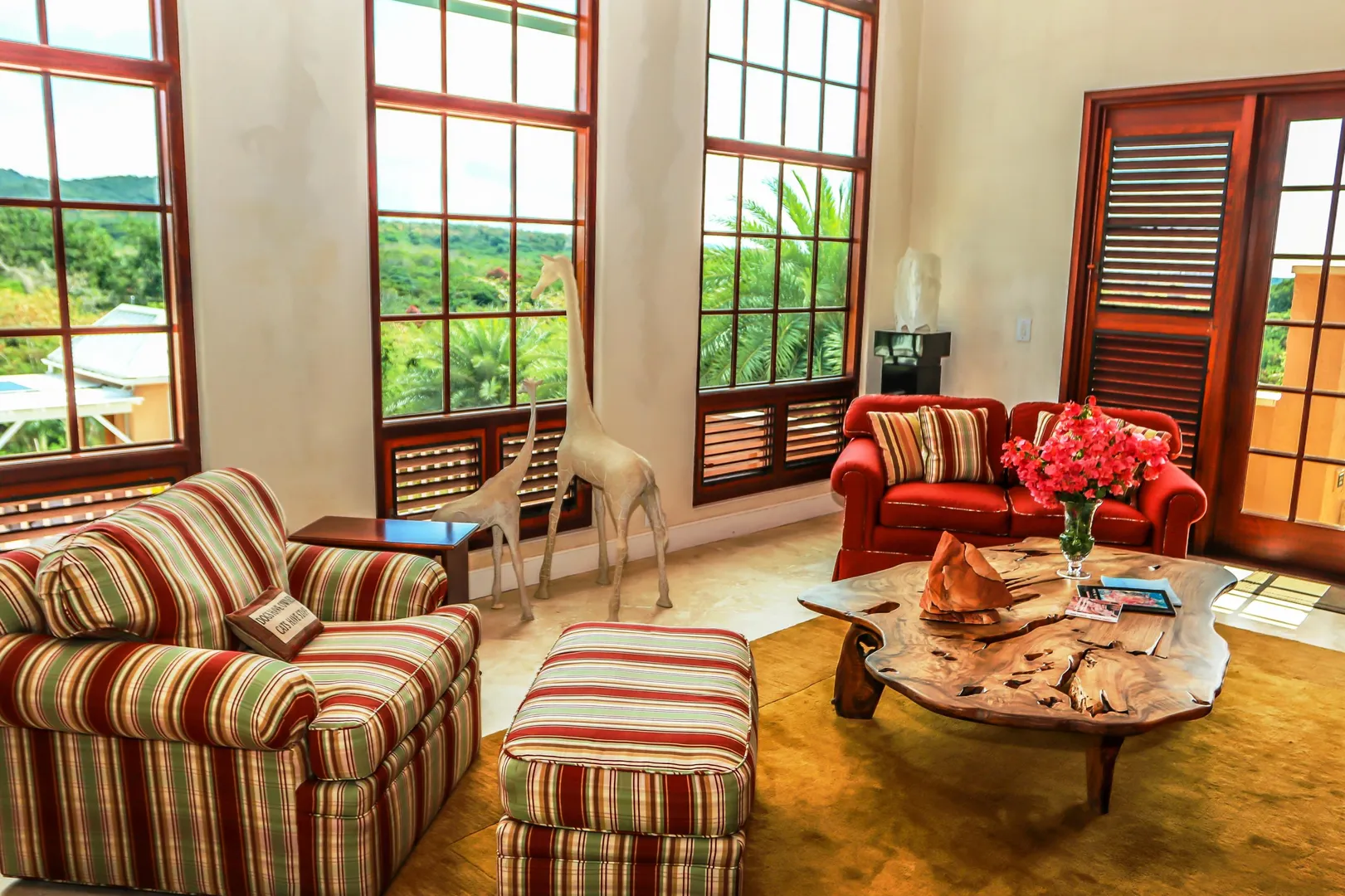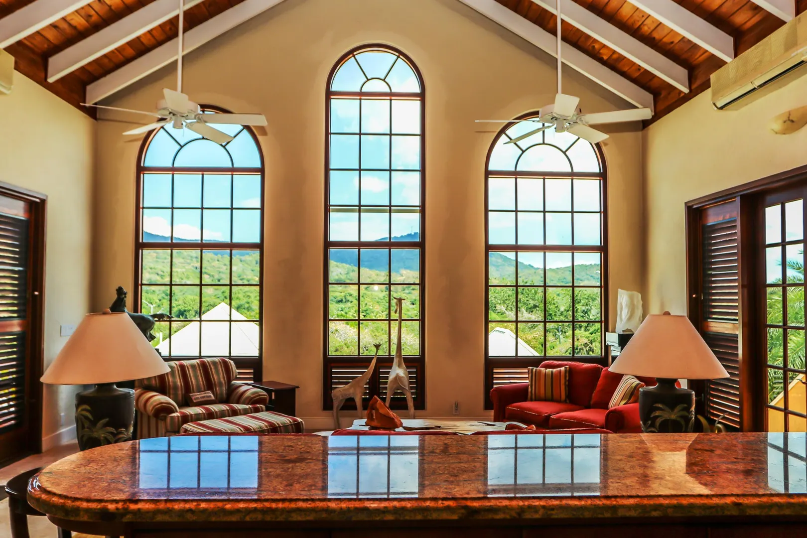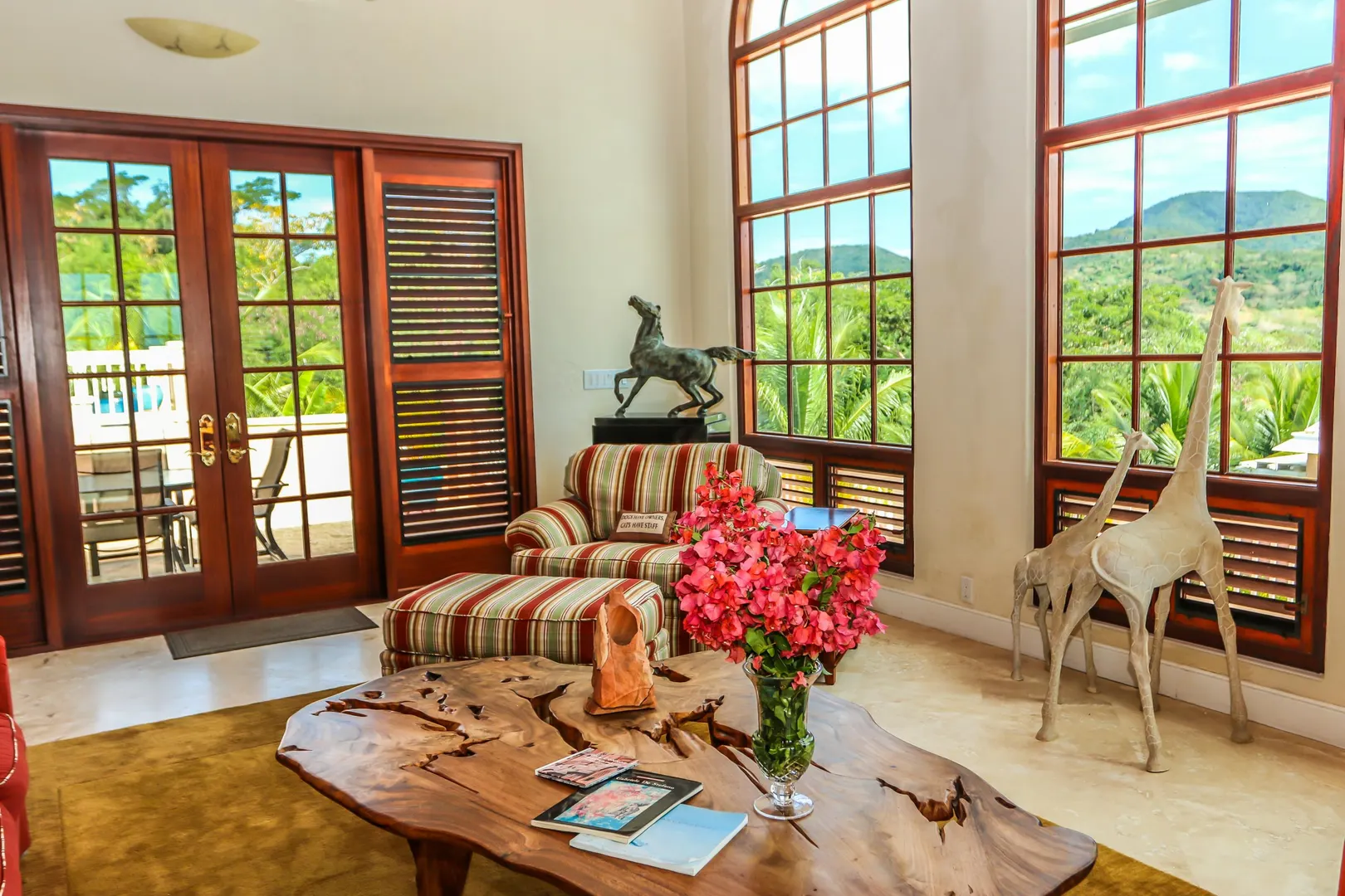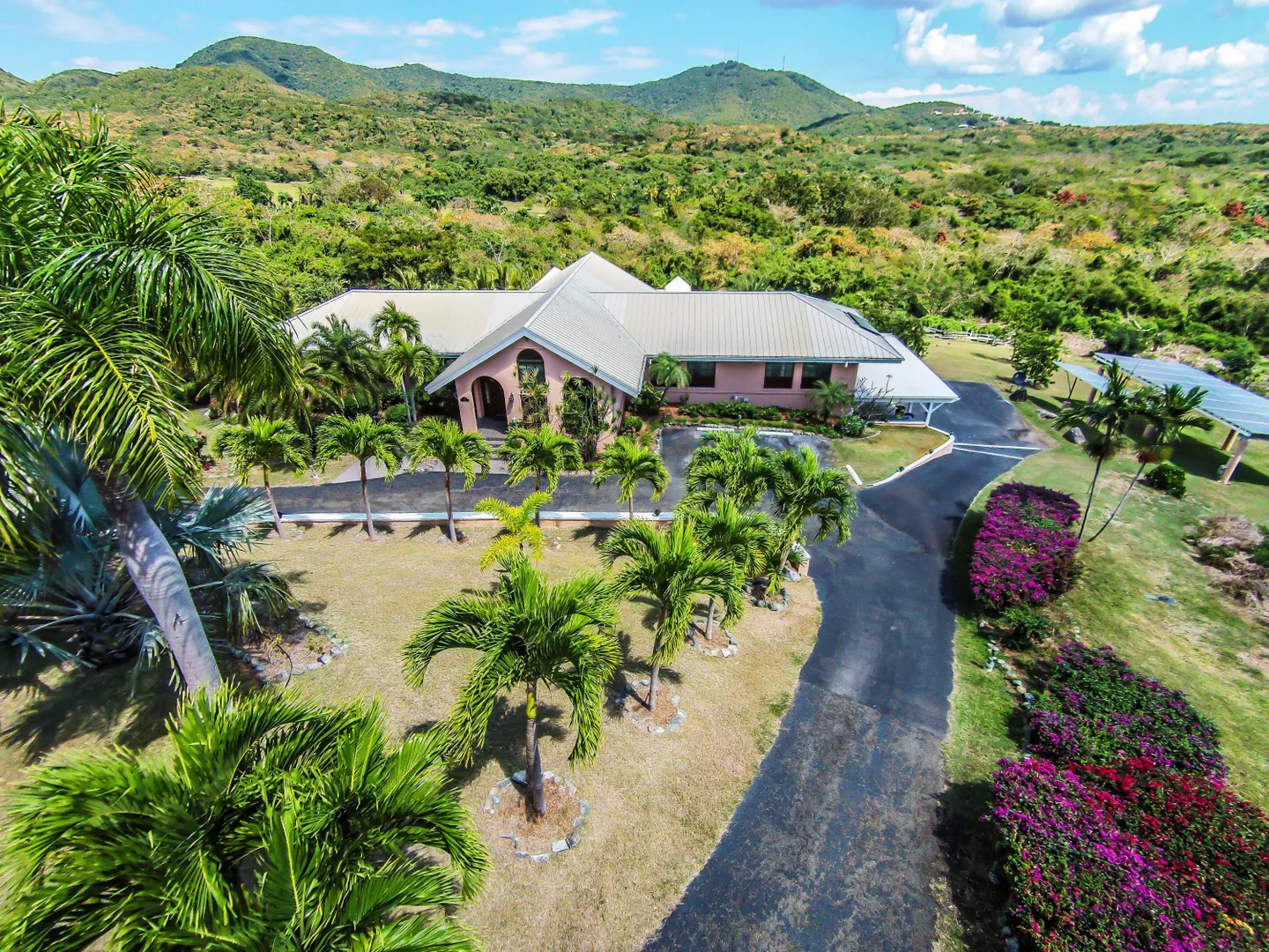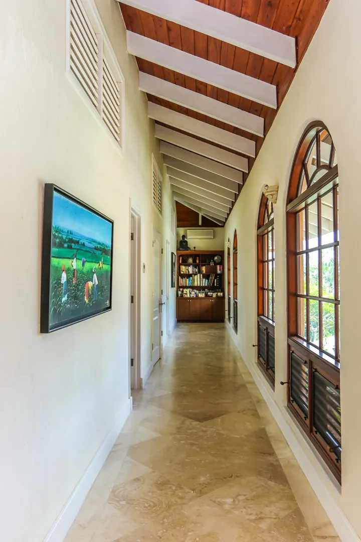 Las Palmas located in gated Carambola on 2.36 tropically landscaped acres is a pristine home encompassing 3 bedrooms ensuite, office, gym & large apartment. Travertine tiles throughout, beautiful outdoor summer kitchen & media area, 36ft pool and spa. Great room has 19 ft cathedral ceilings with gorgeous Mahogany windows, solar powered, well, generator, all next to Robert Trent Jones golf course!Las Palmas is an exquisite home; some of the highlights are: • 2011 installed all new custom mahogany window doors and louvers. The glass is 7/16" thick for hurricane resistance • All 3 bedrooms have custom closet built- ins made locally by Andre McBean of local Mahogany • 2013 travertine tile installed on the diagonal throughout the main house • Gourmet kitchen made by Quality Cabinets of Cherry with granite counter tops, sub-zero refrigerator and freezer and all stainless steel appliances • Outdoor area is as approximately 4,000 sq. feet, and done in coral stone tile; the deck, summer kitchen, media area, pool and apartment were completed in 2010 • At the pool deck there is a full summer kitchen with grill, sinks and cooler and a TV retractable screen painted by artist Marie Graci. • Full bath with shower at pool level • Apartment at lowest level is approximately 800 sq. ft. one bedroom apartment with open concept kitchen, 3 fans, A/C, washer/dryer and is also connected to Solar/backup system • 2010 Solar system phase I was completed • 2014 Solar Phase II was completed producing 15 KW approximately 2000 KW per month, a net metering system, it has battery backup with a generator to recharge the batteries if needed. • 2015 new septic system installed • The water system contains 2 cisterns. One cistern collects rain water and holds approximately 30,000 gallons. The smaller cistern holds 15,000 gallons. The water in the smaller cistern holds water that comes from a well on the property after it has gone through a reverse osmosis system. It is an automatic system that creates RO water on an as needed basis. • The house uses a recirculation system that avoids wasting water while waiting for hot water. • There is abundant spaces at the lower level of the home, providing a gym, storage, a workshop and a garage. • Standing seam metal roof • Alarm system • Lower level has a separate gated entry for apartment privacy and or service providers • Community pool, tennis courts and Robert Trent Jones Championship golf course all in close proximity • The property is beautifully landscaped with drip irrigation and there are numerous native fruit trees including bananas, lime, coconut, sour sop, pineapple, avocado and papaya