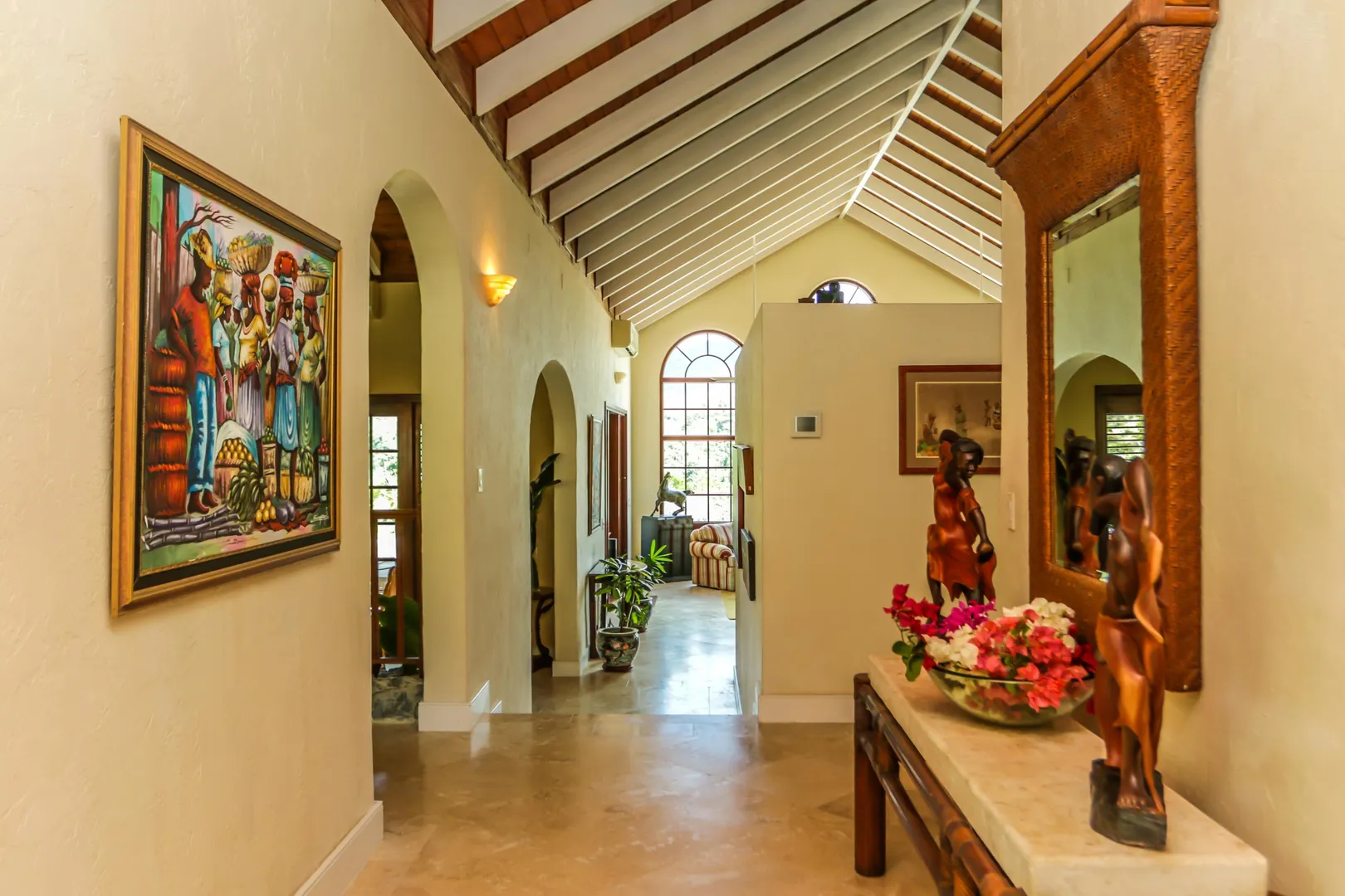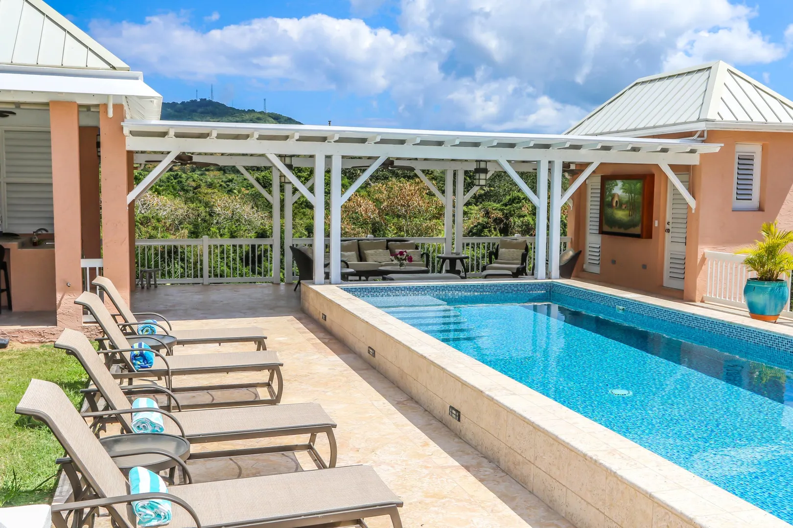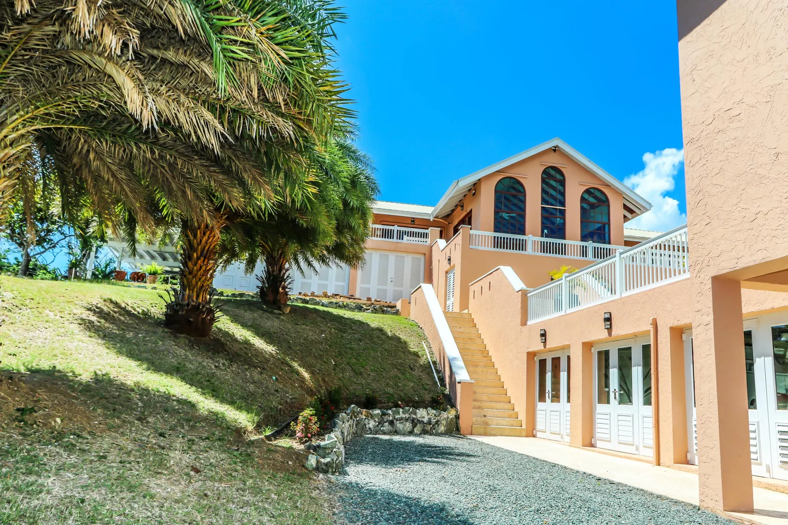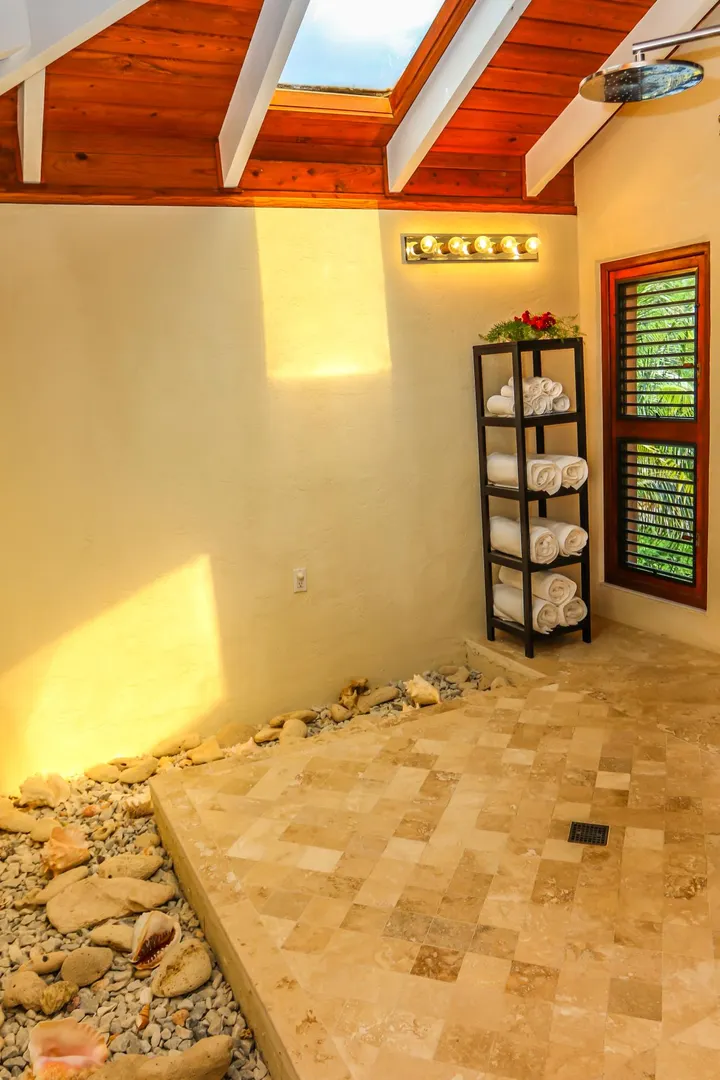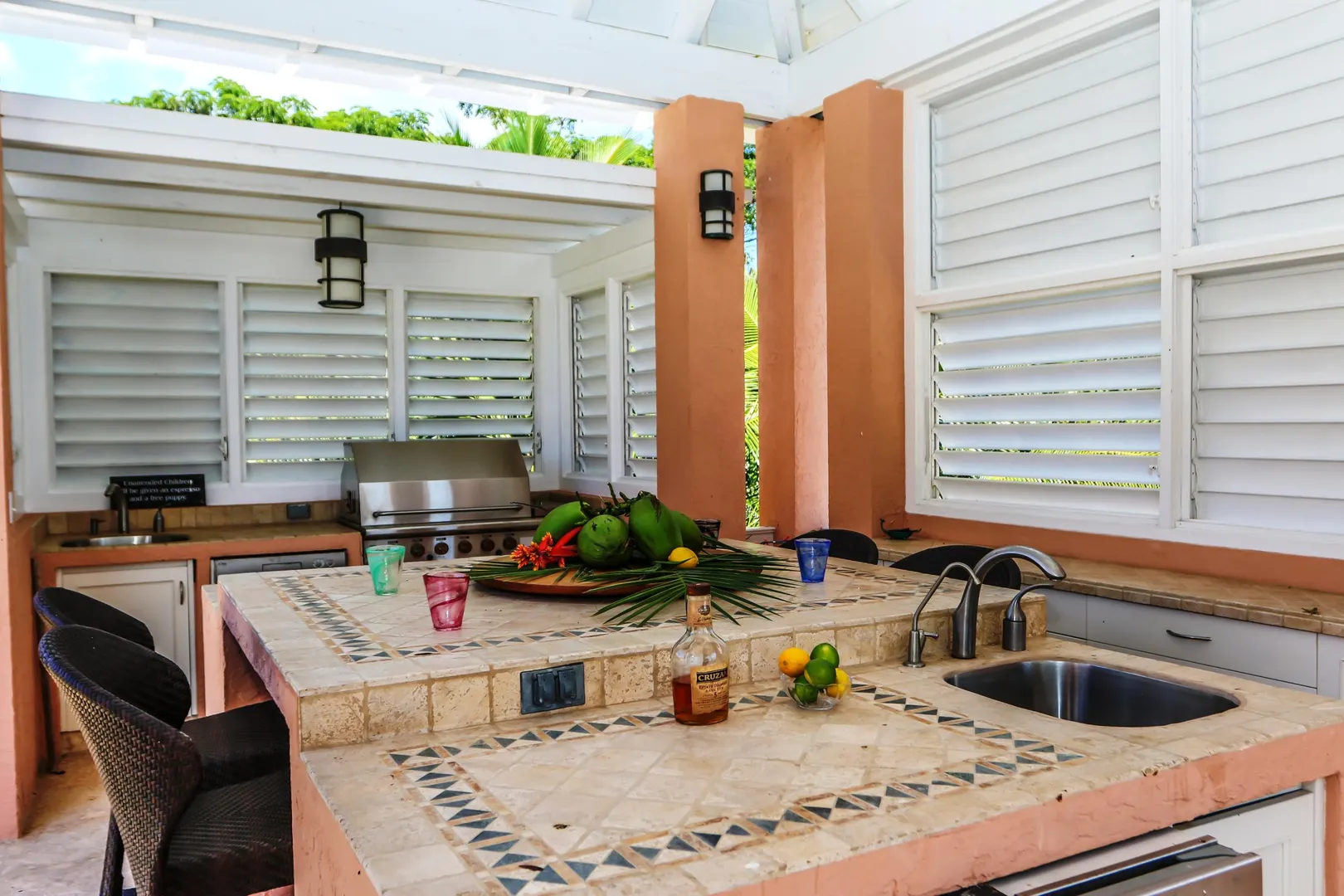 Las Palmas located in gated Carambola on 2.36 tropically landscaped acres is a pristine home encompassing 3 bedrooms ensuite, office, gym & large apartment. Travertine tiles throughout, beautiful outdoor summer kitchen & media area, 36ft pool and spa. Great room has 19 ft cathedral ceilings with gorgeous Mahogany windows, solar powered, well, generator, all next to Robert Trent Jones golf course!Las Palmas is an exquisite home; some of the highlights are: • 2011 installed all new custom mahogany window doors and louvers. The glass is 7/16" thick for hurricane resistance • All 3 bedrooms have custom closet built- ins made locally by Andre McBean of local Mahogany • 2013 travertine tile installed on the diagonal throughout the main house • Gourmet kitchen made by Quality Cabinets of Cherry with granite counter tops, sub-zero refrigerator and freezer and all stainless steel appliances • Outdoor area is as approximately 4,000 sq. feet, and done in coral stone tile; the deck, summer kitchen, media area, pool and apartment were completed in 2010 • At the pool deck there is a full summer kitchen with grill, sinks and cooler and a TV retractable screen painted by artist Marie Graci. • Full bath with shower at pool level • Apartment at lowest level is approximately 800 sq. ft. one bedroom apartment with open concept kitchen, 3 fans, A/C, washer/dryer and is also connected to Solar/backup system • 2010 Solar system phase I was completed • 2014 Solar Phase II was completed producing 15 KW approximately 2000 KW per month, a net metering system, it has battery backup with a generator to recharge the batteries if needed. • 2015 new septic system installed • The water system contains 2 cisterns. One cistern collects rain water and holds approximately 30,000 gallons. The smaller cistern holds 15,000 gallons. The water in the smaller cistern holds water that comes from a well on the property after it has gone through a reverse osmosis system. It is an automatic system that creates RO water on an as needed basis. • The house uses a recirculation system that avoids wasting water while waiting for hot water. • There is abundant spaces at the lower level of the home, providing a gym, storage, a workshop and a garage. • Standing seam metal roof • Alarm system • Lower level has a separate gated entry for apartment privacy and or service providers • Community pool, tennis courts and Robert Trent Jones Championship golf course all in close proximity • The property is beautifully landscaped with drip irrigation and there are numerous native fruit trees including bananas, lime, coconut, sour sop, pineapple, avocado and papaya