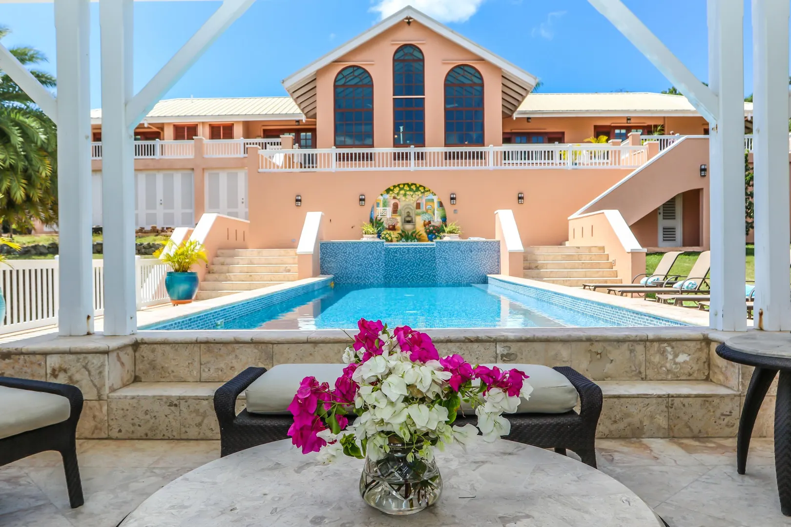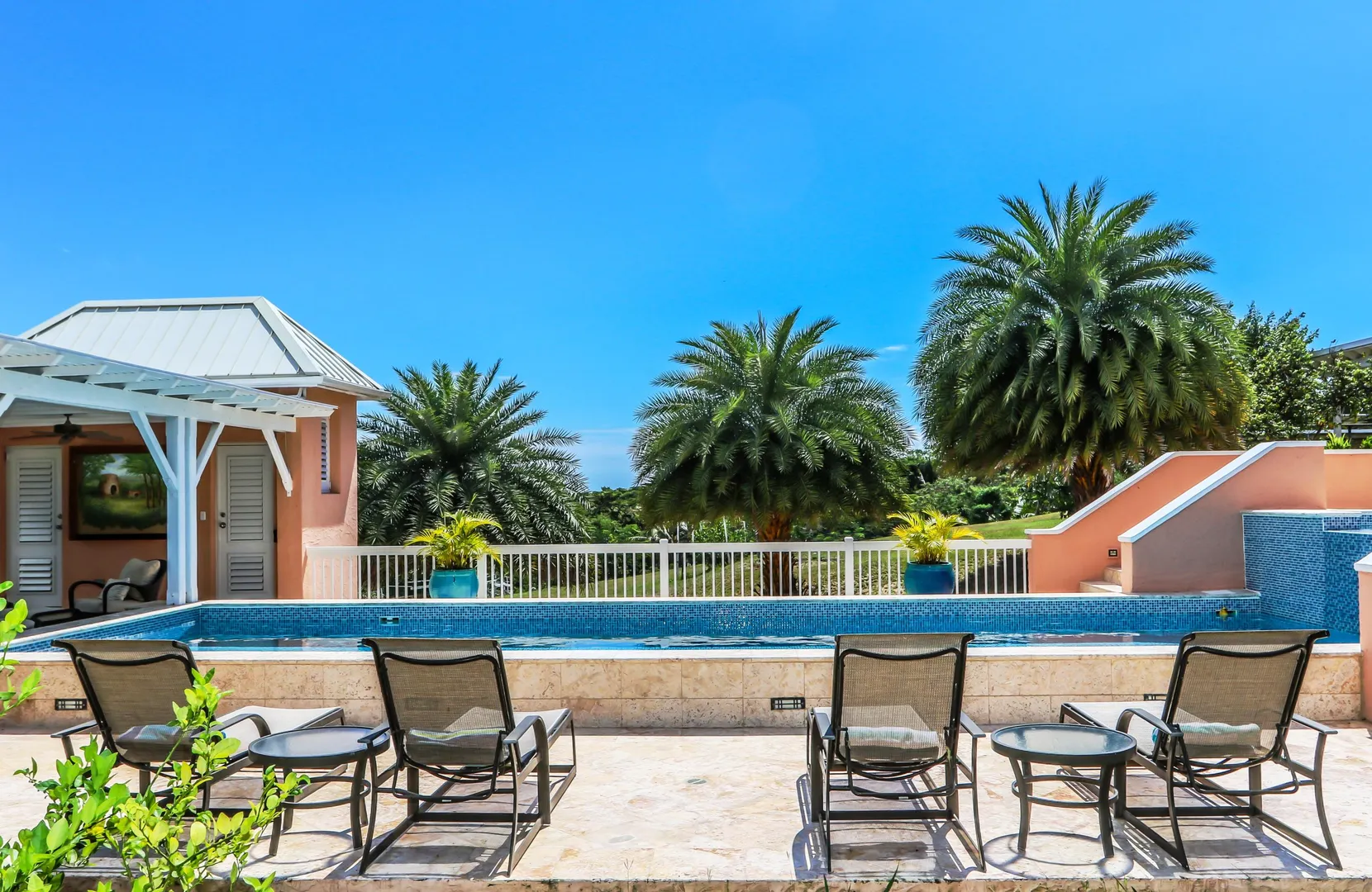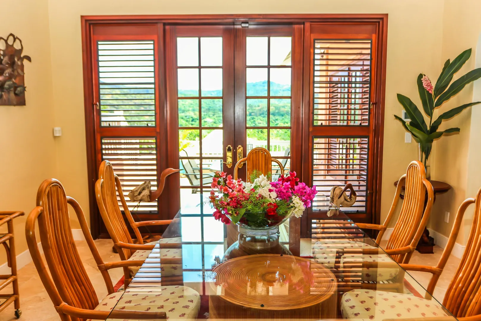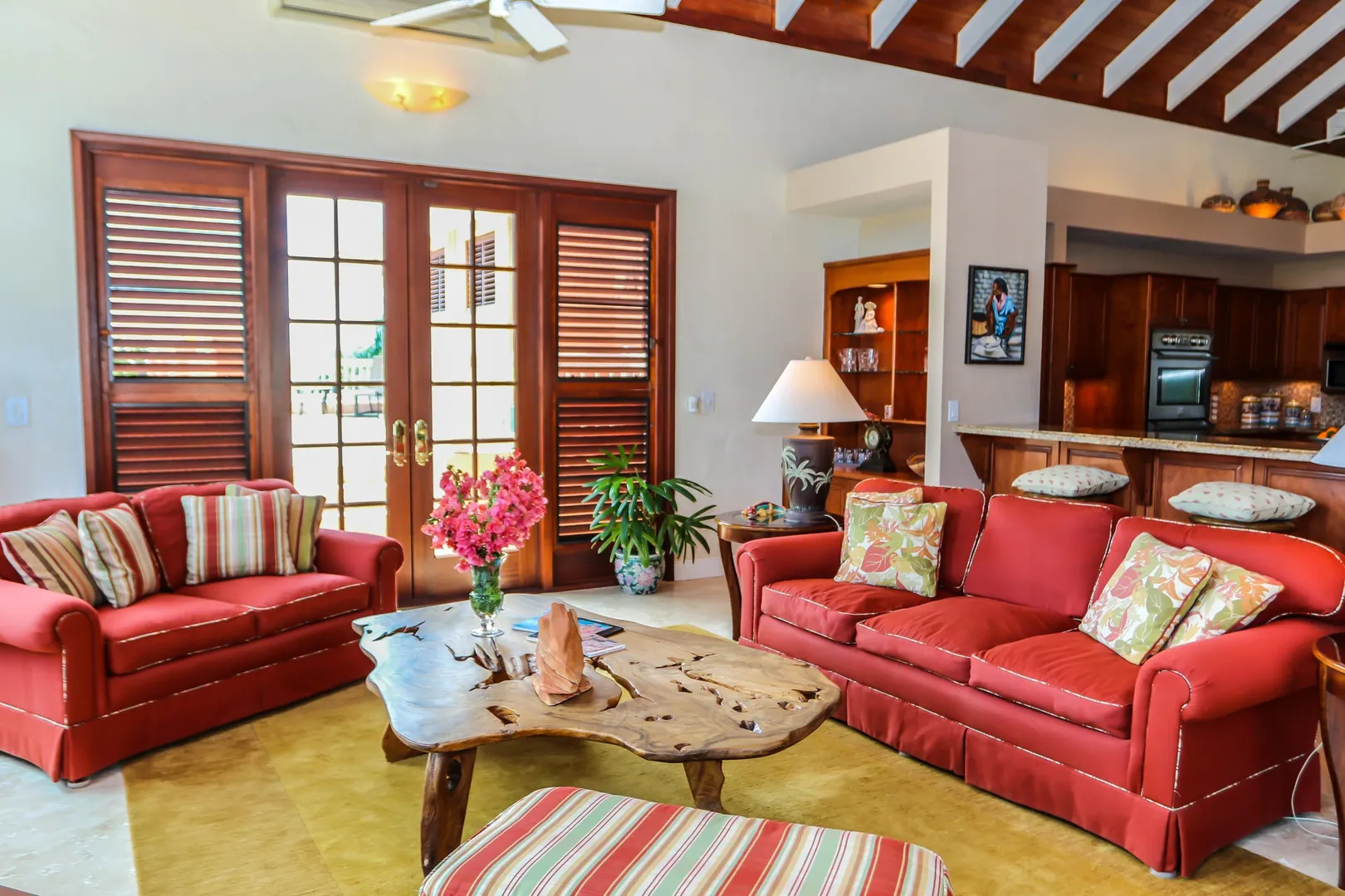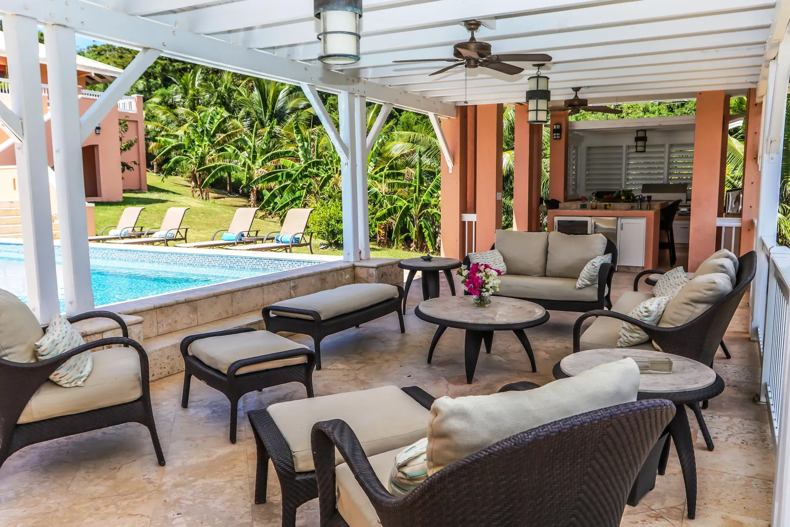 Las Palmas located in gated Carambola on 2.36 tropically landscaped acres is a pristine home encompassing 3 bedrooms ensuite, office, gym & large apartment. Travertine tiles throughout, beautiful outdoor summer kitchen & media area, 36ft pool and spa. Great room has 19 ft cathedral ceilings with gorgeous Mahogany windows, solar powered, well, generator, all next to Robert Trent Jones golf course!Las Palmas is an exquisite home; some of the highlights are: • 2011 installed all new custom mahogany window doors and louvers. The glass is 7/16" thick for hurricane resistance • All 3 bedrooms have custom closet built- ins made locally by Andre McBean of local Mahogany • 2013 travertine tile installed on the diagonal throughout the main house • Gourmet kitchen made by Quality Cabinets of Cherry with granite counter tops, sub-zero refrigerator and freezer and all stainless steel appliances • Outdoor area is as approximately 4,000 sq. feet, and done in coral stone tile; the deck, summer kitchen, media area, pool and apartment were completed in 2010 • At the pool deck there is a full summer kitchen with grill, sinks and cooler and a TV retractable screen painted by artist Marie Graci. • Full bath with shower at pool level • Apartment at lowest level is approximately 800 sq. ft. one bedroom apartment with open concept kitchen, 3 fans, A/C, washer/dryer and is also connected to Solar/backup system • 2010 Solar system phase I was completed • 2014 Solar Phase II was completed producing 15 KW approximately 2000 KW per month, a net metering system, it has battery backup with a generator to recharge the batteries if needed. • 2015 new septic system installed • The water system contains 2 cisterns. One cistern collects rain water and holds approximately 30,000 gallons. The smaller cistern holds 15,000 gallons. The water in the smaller cistern holds water that comes from a well on the property after it has gone through a reverse osmosis system. It is an automatic system that creates RO water on an as needed basis. • The house uses a recirculation system that avoids wasting water while waiting for hot water. • There is abundant spaces at the lower level of the home, providing a gym, storage, a workshop and a garage. • Standing seam metal roof • Alarm system • Lower level has a separate gated entry for apartment privacy and or service providers • Community pool, tennis courts and Robert Trent Jones Championship golf course all in close proximity • The property is beautifully landscaped with drip irrigation and there are numerous native fruit trees including bananas, lime, coconut, sour sop, pineapple, avocado and papaya
