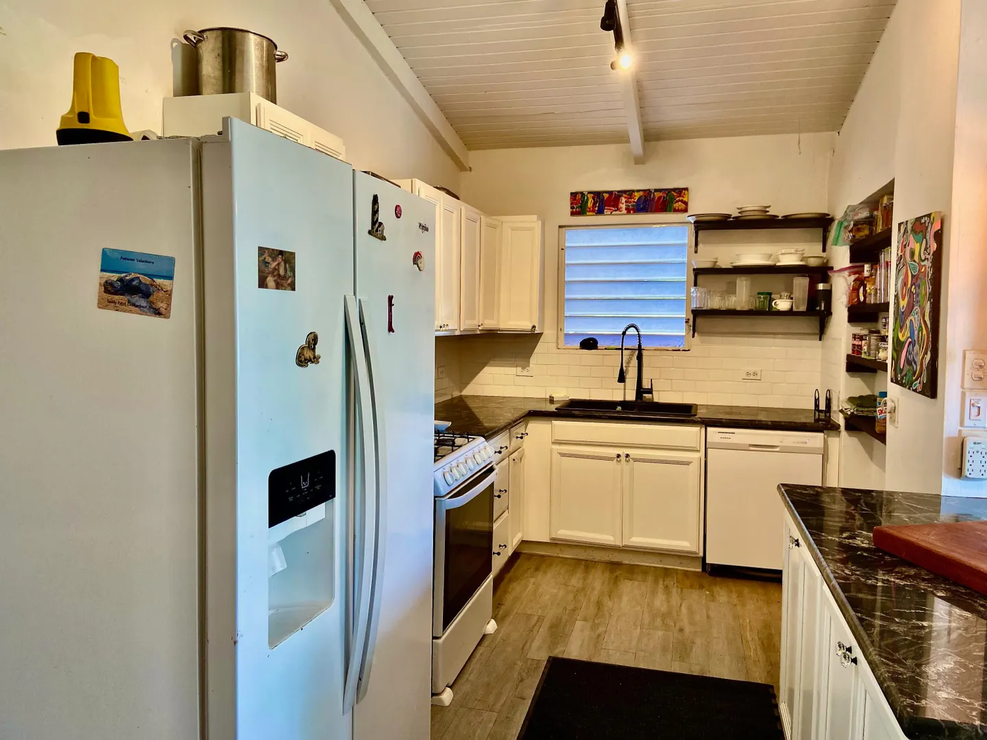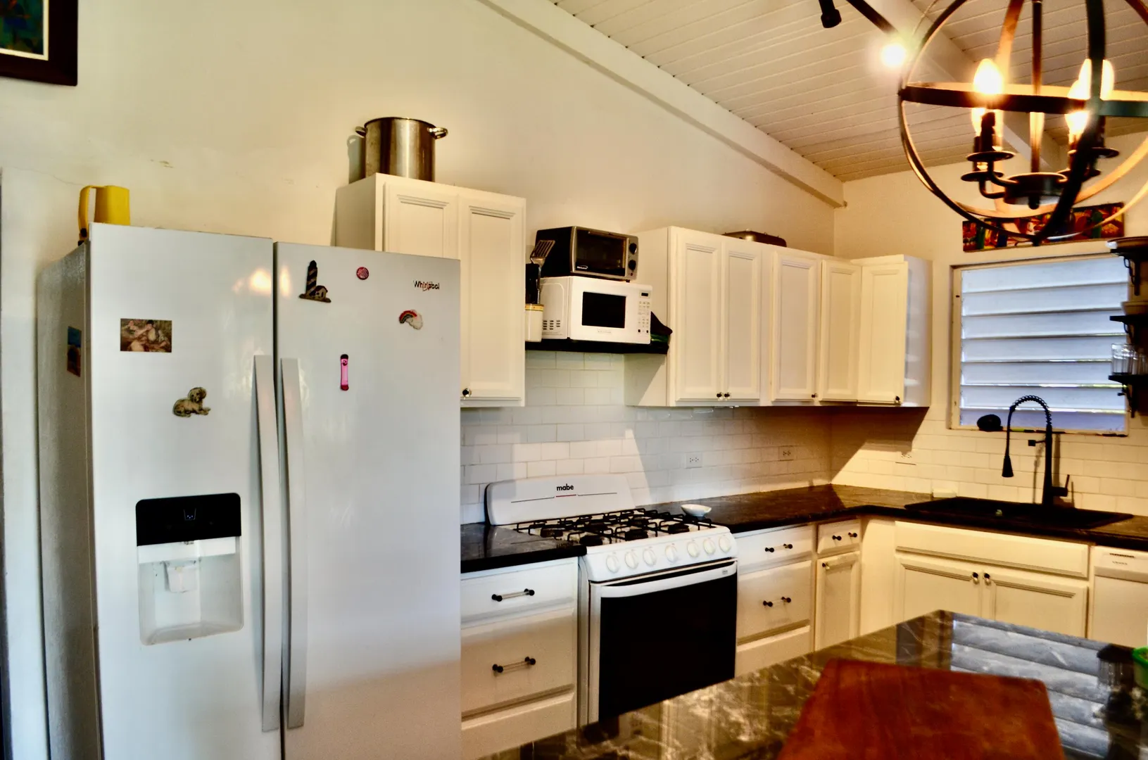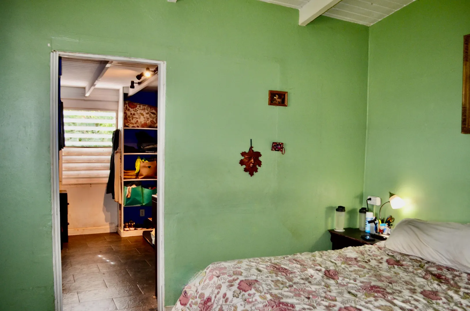 This STYLISHLY RENOVATED 3 bed/2 bath home is located in a cute Frederiksted cul-de-sac. Cooking is a pleasure w/the kitchen's crisp white cabinetry topped w/ gorgeous dark grey granite & deep double sink. High ceilings & fans open the combined living/dining/kitchen to wonderful breezes or from the cute front porch. The primary bedroom suite offers a separate dressing area loaded w/built-in closets & shelving & roomy enough for a desk. Totally modern spa baths include the chic en suite primary featuring a double shower, 2 free-standing vanities & built-in shelving. The guest bath is another elegant space. The 3rd bedroom can be a lovely in-law suite as it has direct access to the fabulous covered back patio. Mature mango, carambola, bay & soursop trees dot the fenced back yard. A must see