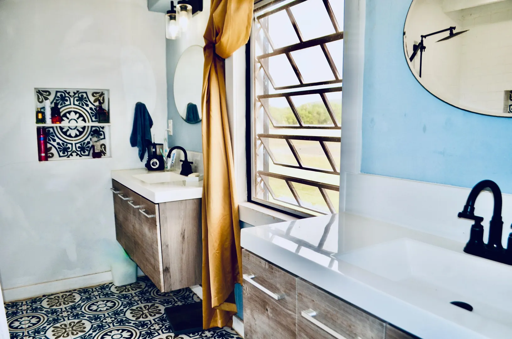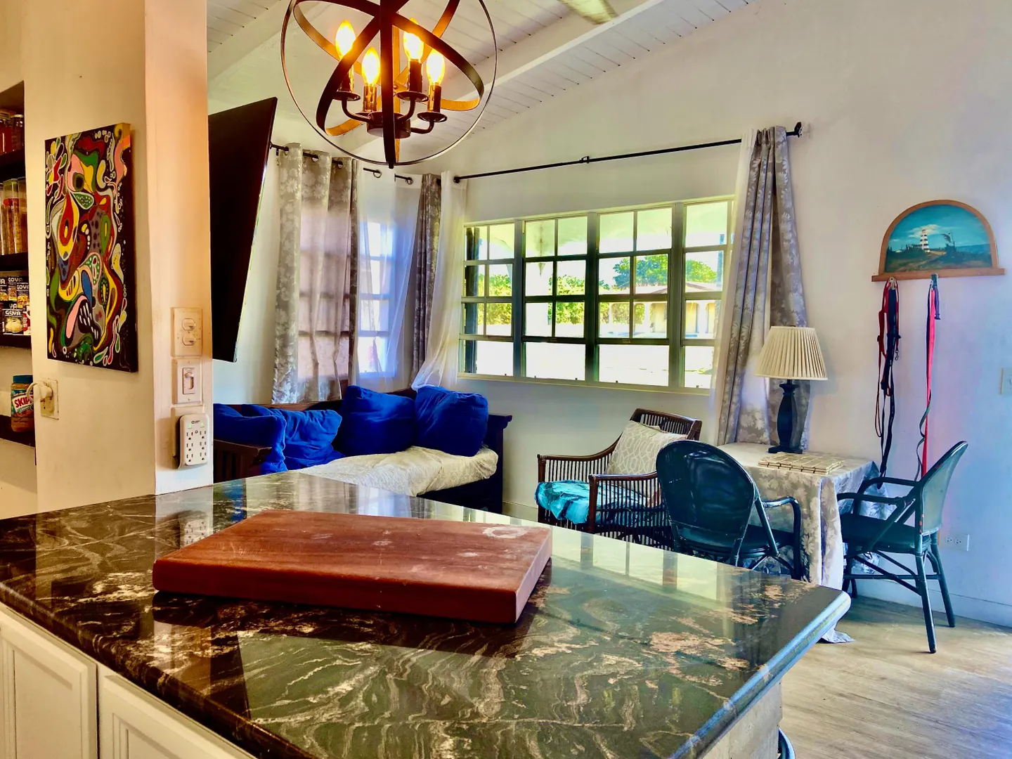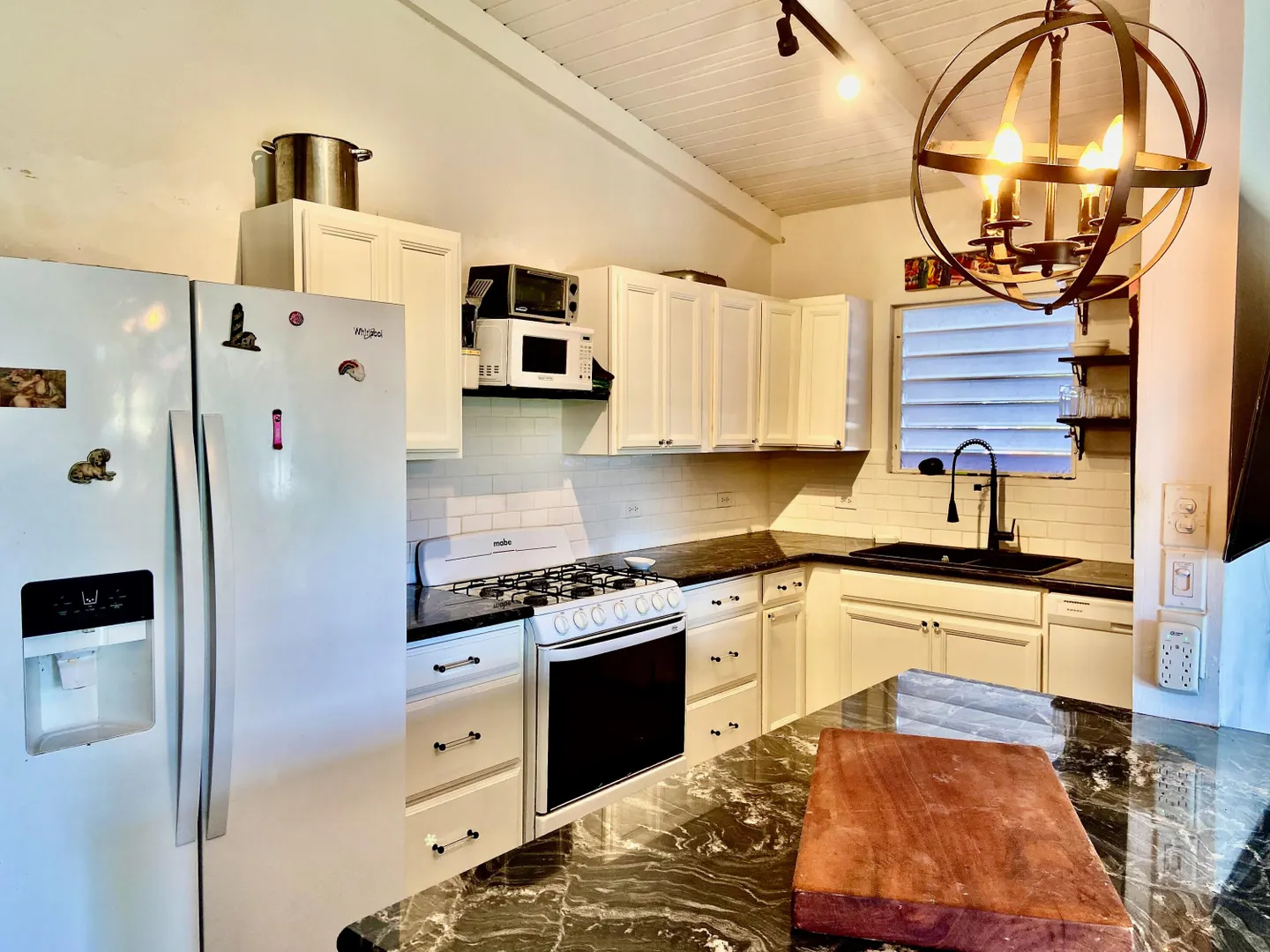 This STYLISHLY RENOVATED 3 bed/2 bath home is located in a cute Frederiksted cul-de-sac. Cooking is a pleasure w/the kitchen's crisp white cabinetry topped w/ gorgeous dark grey granite & deep double sink. High ceilings & fans open the combined living/dining/kitchen to wonderful breezes or from the cute front porch. The primary bedroom suite offers a separate dressing area loaded w/built-in closets & shelving & roomy enough for a desk. Totally modern spa baths include the chic en suite primary featuring a double shower, 2 free-standing vanities & built-in shelving. The guest bath is another elegant space. The 3rd bedroom can be a lovely in-law suite as it has direct access to the fabulous covered back patio. Mature mango, carambola, bay & soursop trees dot the fenced back yard. A must see
