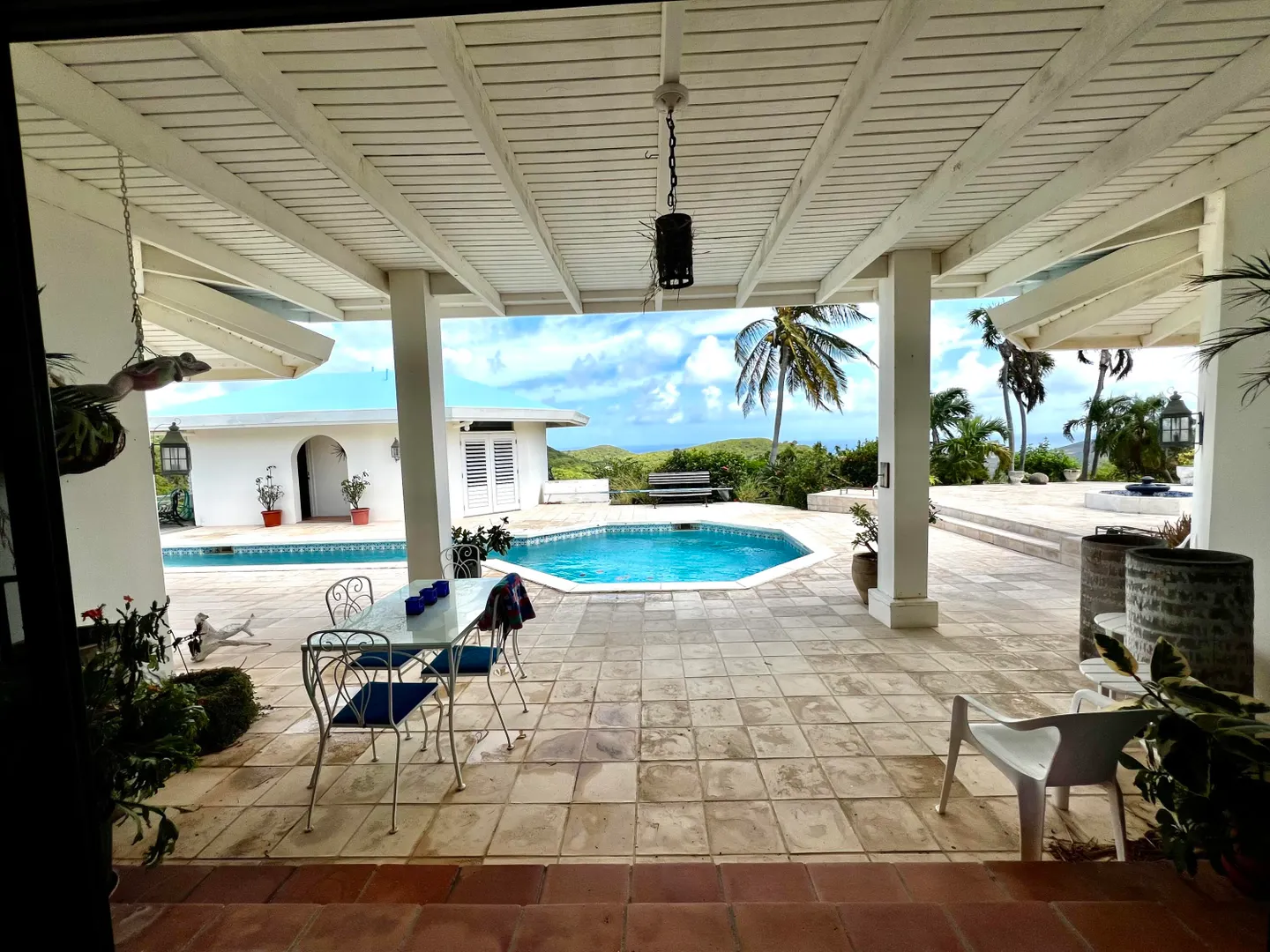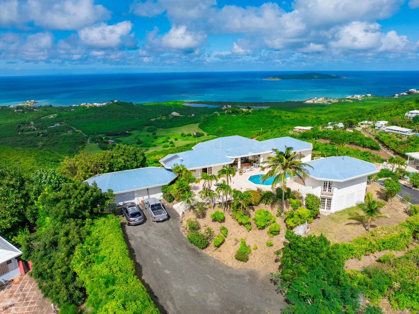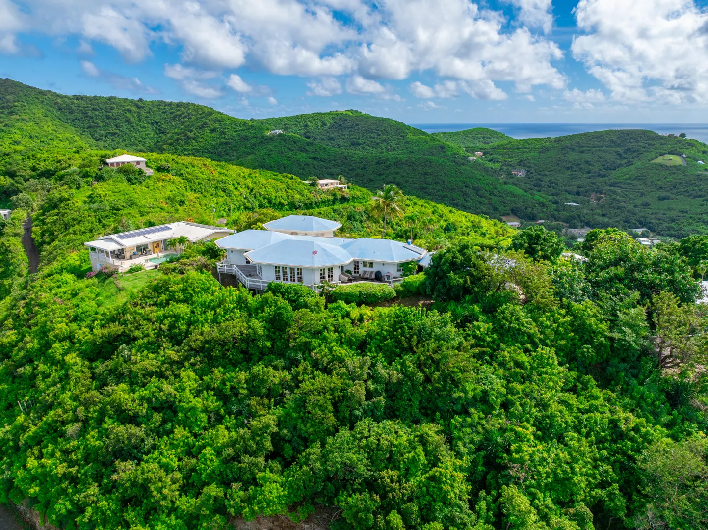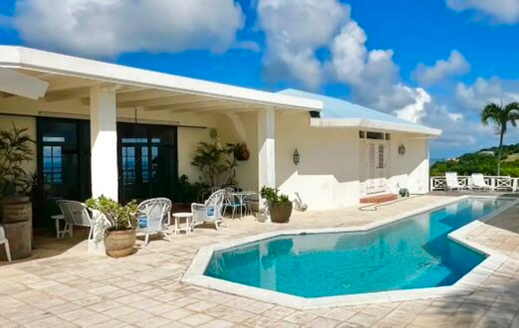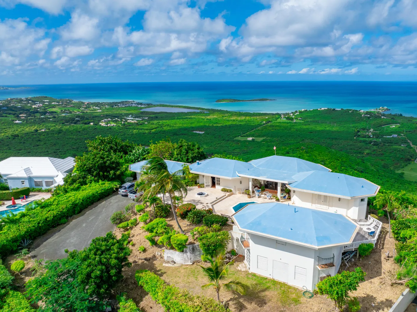 This incredible four-bedroom estate sits on the highest hill in Seven Hills, offering almost 360-degree views of the Caribbean Sea. From the iconic Buck Island to the Southshore and westward to Judith's Fancy and downtown Christiansted, every vantage point captures stunning natural beauty, including breathtaking sunsets. Custom-designed to maximize these vistas, the home features a unique layout with a central pool taking center stage, surrounded by uninterrupted views and an expansive pool deck. The estate is thoughtfully designed with two distinct living pods flanking the pool. The main pod is a bright and spacious retreat, highlighted by an open great room that blends the dining and large seating area.Wrapped in doors with 1/4-inch glass on the seaside & custom sliding impact glass doors on the poolside that pocket out of view, the space offers seamless indoor-outdoor living. The great room flows effortlessly to a covered gallery on the pool side and a large gallery that spans the entire northern sea facing side with some of the most breathtaking views on the island. Connected to the great room is a spacious kitchen featuring a cozy seating area with a fireplace, perfect for gathering and half bath. The main pod also includes the primary suite that is angled perfectly towards Buck Island so you wake to that stunning island view. Wake in the morning to the gorgeous view and roll out of your bed to do some laps in your pool before a day of island adventures. There is also a garage that is detached from the main pod, that currently only has one opening but was built to be a two-car garage with plenty of storage space, a workshop and the laundry room. The breezes are continuously blowing through the home for comfort and minimizing your power bill.