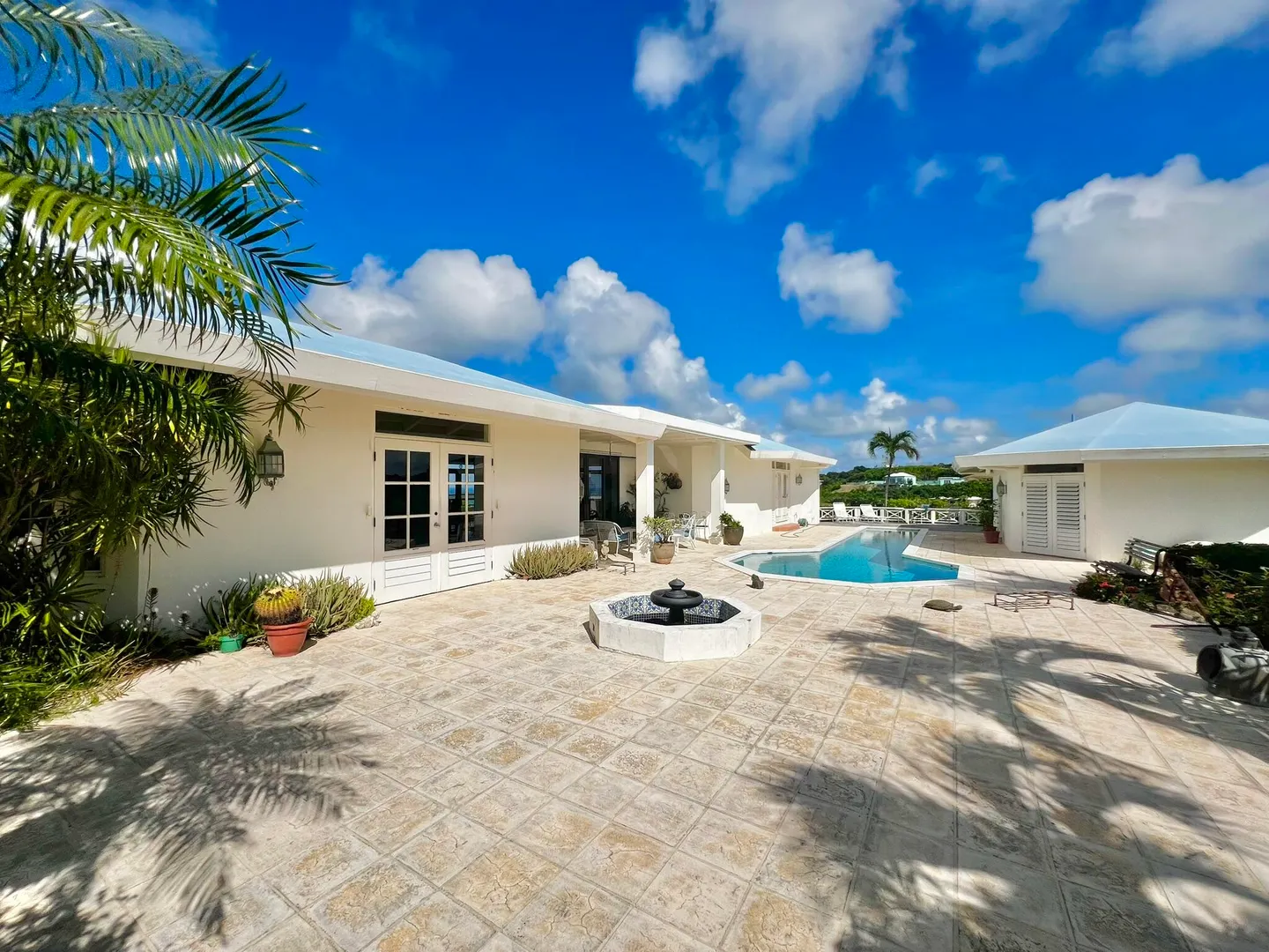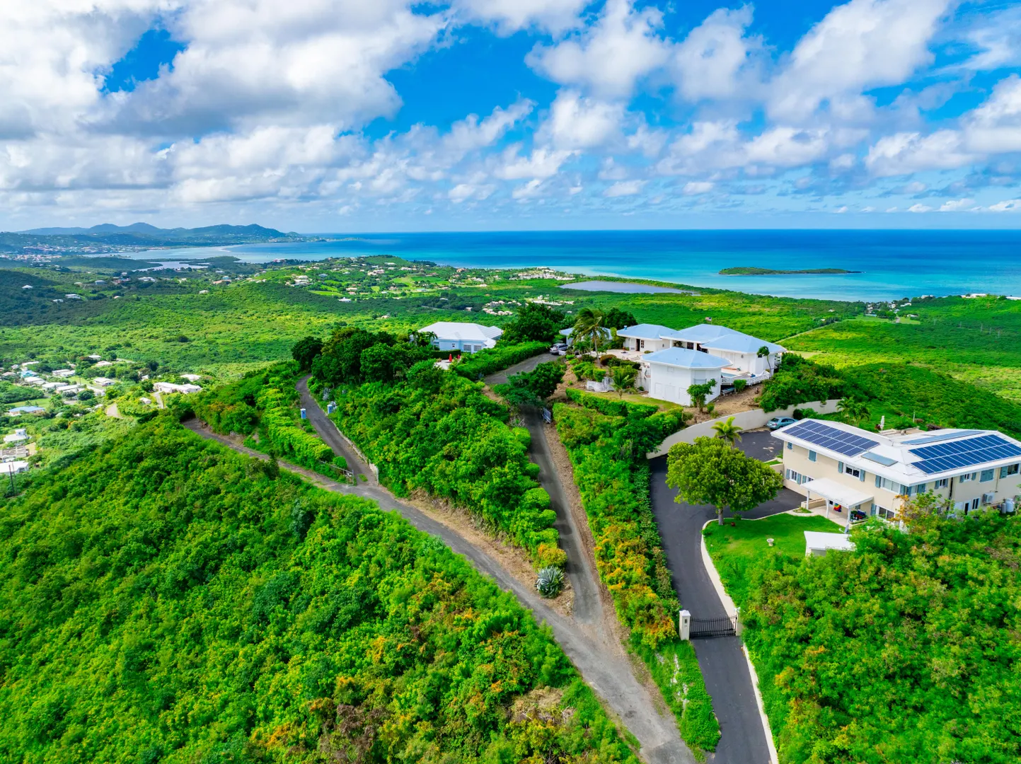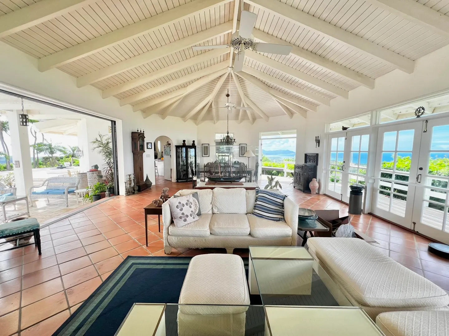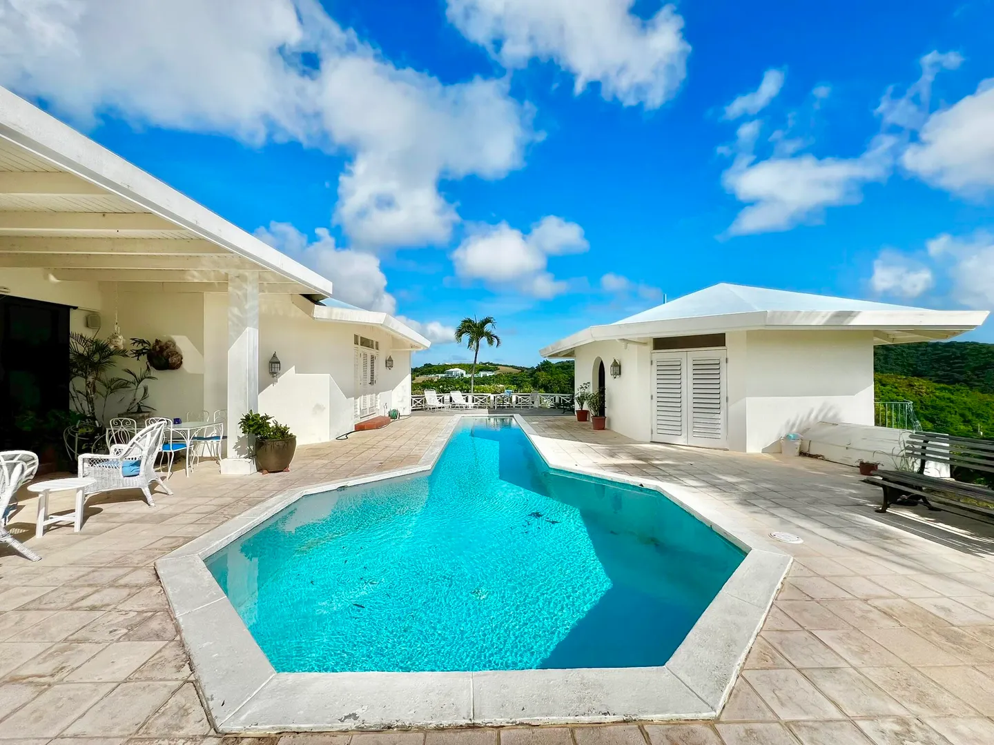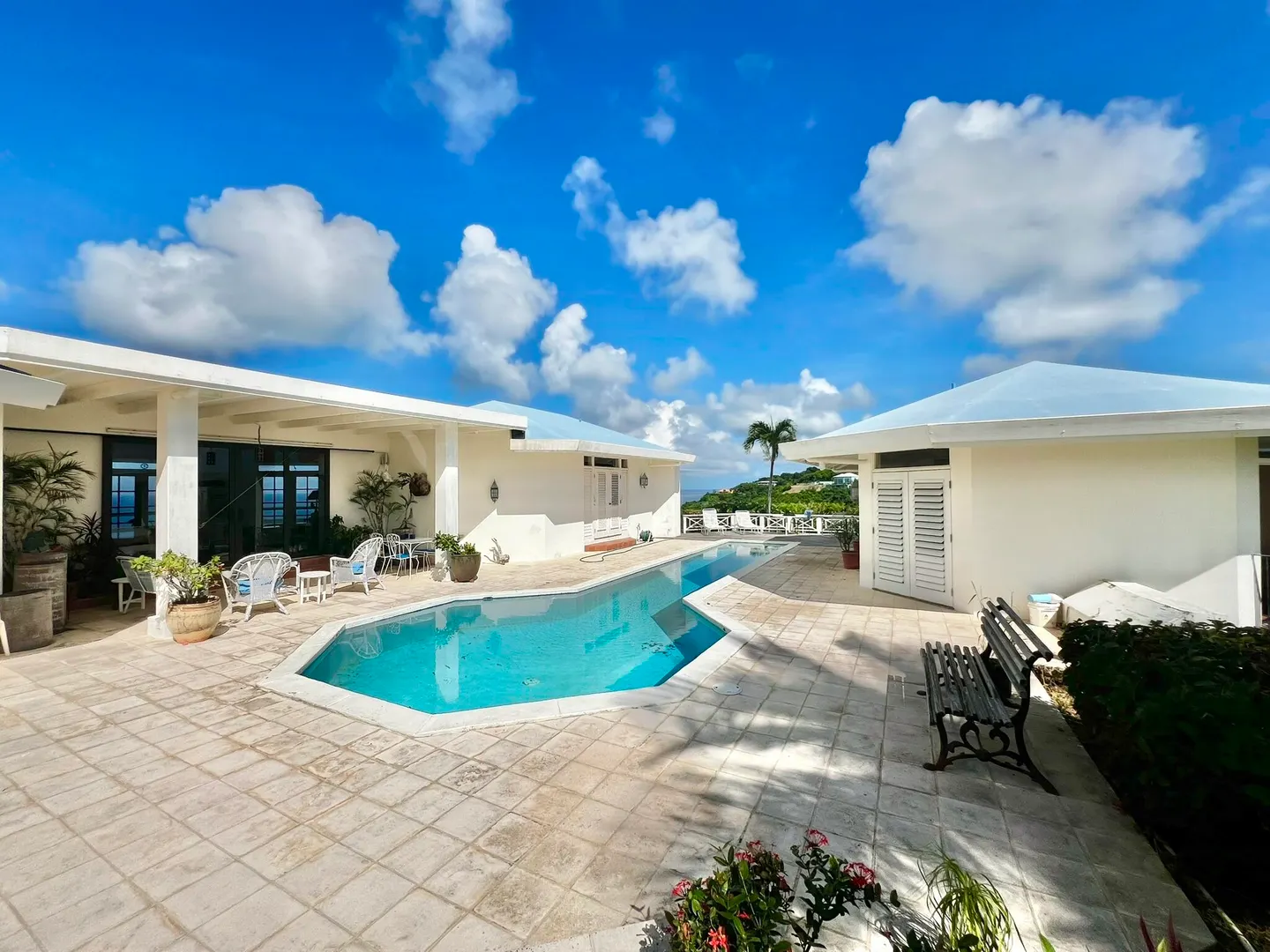 This incredible four-bedroom estate sits on the highest hill in Seven Hills, offering almost 360-degree views of the Caribbean Sea. From the iconic Buck Island to the Southshore and westward to Judith's Fancy and downtown Christiansted, every vantage point captures stunning natural beauty, including breathtaking sunsets. Custom-designed to maximize these vistas, the home features a unique layout with a central pool taking center stage, surrounded by uninterrupted views and an expansive pool deck. The estate is thoughtfully designed with two distinct living pods flanking the pool. The main pod is a bright and spacious retreat, highlighted by an open great room that blends the dining and large seating area.Wrapped in doors with 1/4-inch glass on the seaside & custom sliding impact glass doors on the poolside that pocket out of view, the space offers seamless indoor-outdoor living. The great room flows effortlessly to a covered gallery on the pool side and a large gallery that spans the entire northern sea facing side with some of the most breathtaking views on the island. Connected to the great room is a spacious kitchen featuring a cozy seating area with a fireplace, perfect for gathering and half bath. The main pod also includes the primary suite that is angled perfectly towards Buck Island so you wake to that stunning island view. Wake in the morning to the gorgeous view and roll out of your bed to do some laps in your pool before a day of island adventures. There is also a garage that is detached from the main pod, that currently only has one opening but was built to be a two-car garage with plenty of storage space, a workshop and the laundry room. The breezes are continuously blowing through the home for comfort and minimizing your power bill.