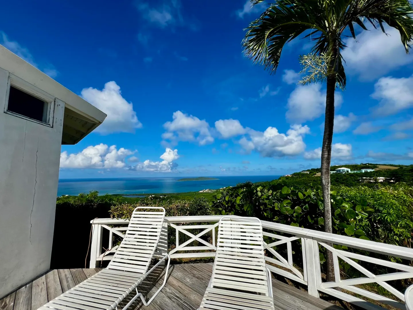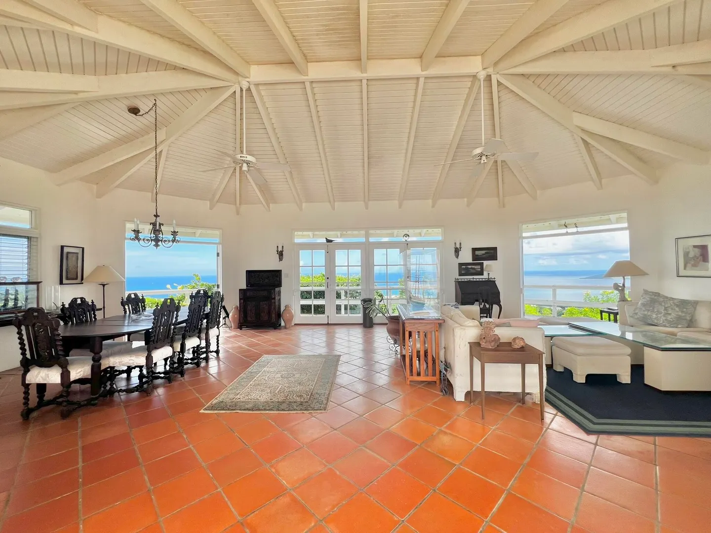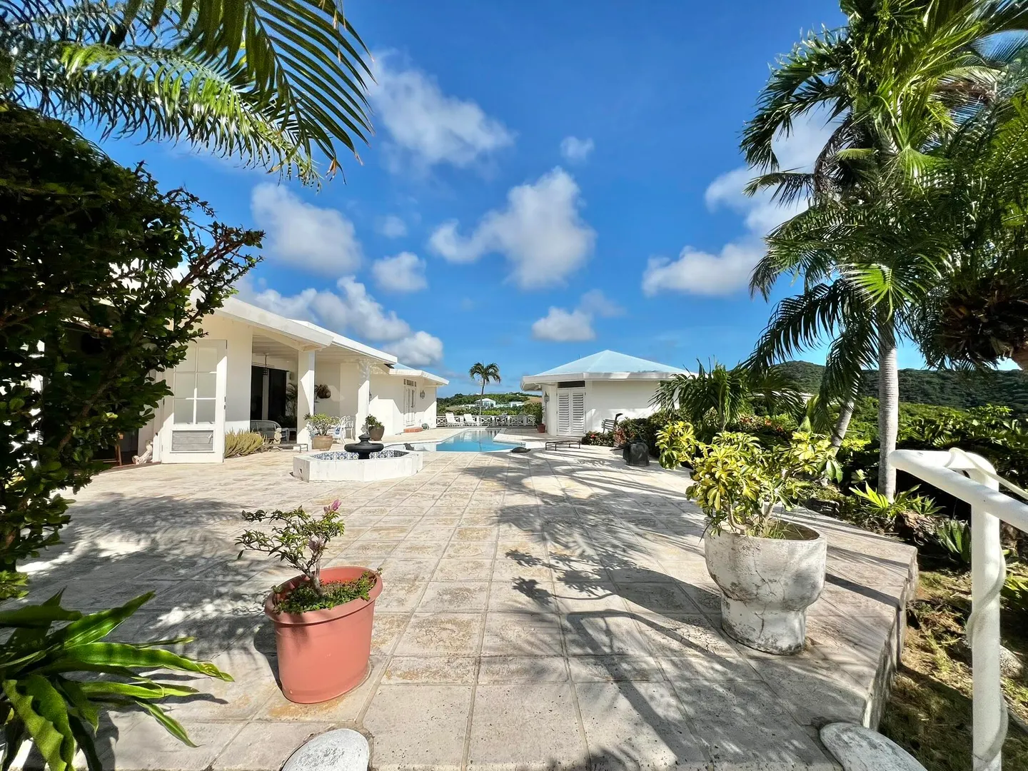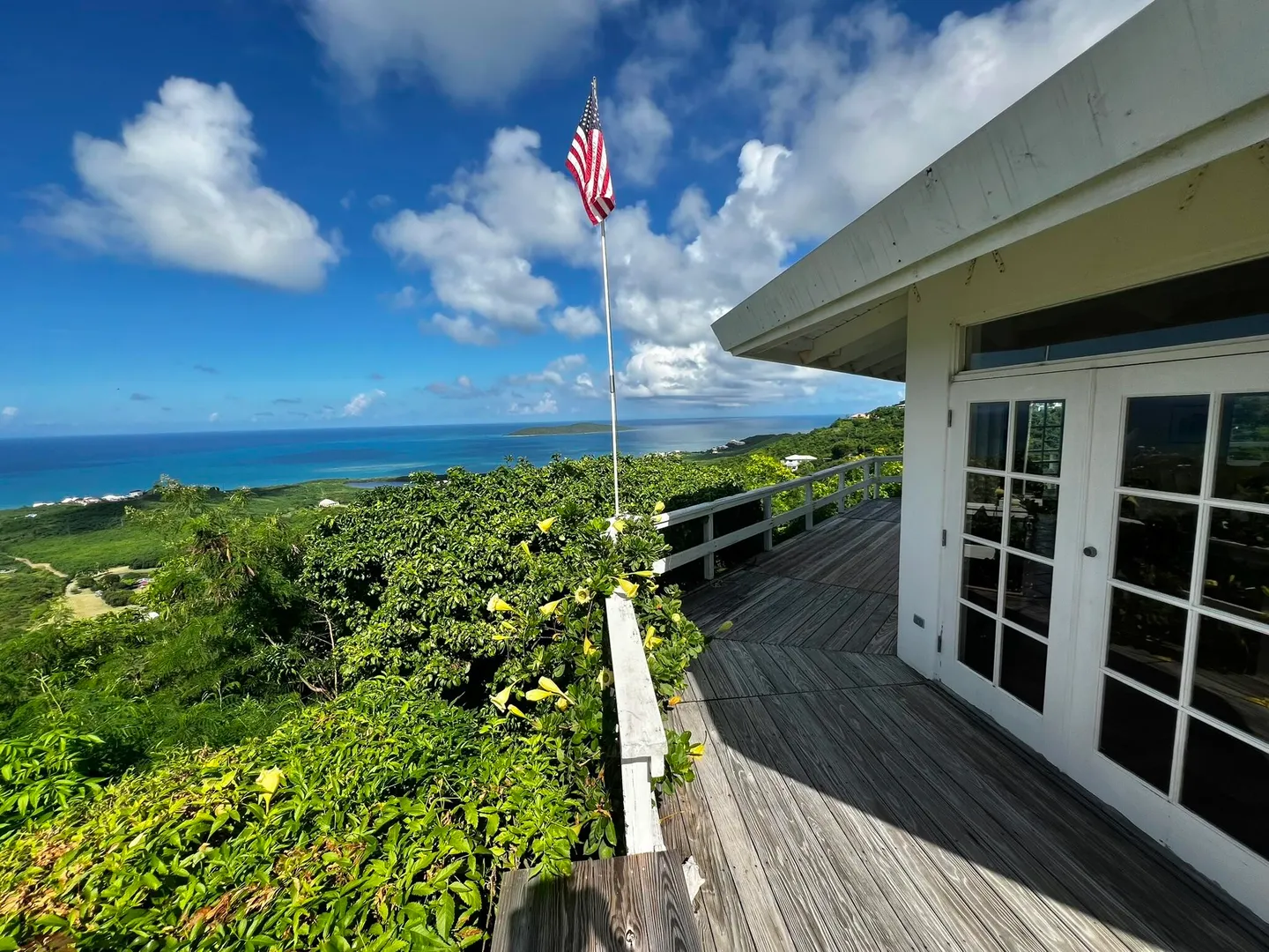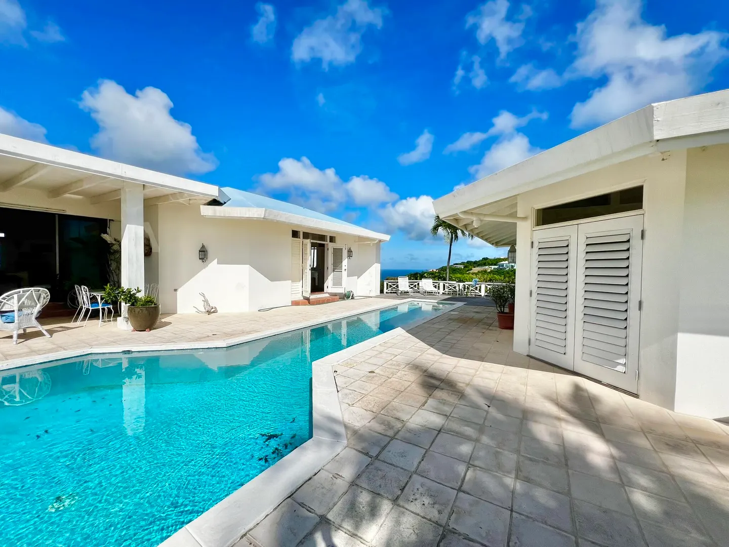This incredible four-bedroom estate sits on the highest hill in Seven Hills, offering almost 360-degree views of the Caribbean Sea. From the iconic Buck Island to the Southshore and westward to Judith's Fancy and downtown Christiansted, every vantage point captures stunning natural beauty, including breathtaking sunsets. Custom-designed to maximize these vistas, the home features a unique layout with a central pool taking center stage, surrounded by uninterrupted views and an expansive pool deck. The estate is thoughtfully designed with two distinct living pods flanking the pool. The main pod is a bright and spacious retreat, highlighted by an open great room that blends the dining and large seating area.Wrapped in doors with 1/4-inch glass on the seaside & custom sliding impact glass doors on the poolside that pocket out of view, the space offers seamless indoor-outdoor living. The great room flows effortlessly to a covered gallery on the pool side and a large gallery that spans the entire northern sea facing side with some of the most breathtaking views on the island. Connected to the great room is a spacious kitchen featuring a cozy seating area with a fireplace, perfect for gathering and half bath. The main pod also includes the primary suite that is angled perfectly towards Buck Island so you wake to that stunning island view. Wake in the morning to the gorgeous view and roll out of your bed to do some laps in your pool before a day of island adventures. There is also a garage that is detached from the main pod, that currently only has one opening but was built to be a two-car garage with plenty of storage space, a workshop and the laundry room. The breezes are continuously blowing through the home for comfort and minimizing your power bill.