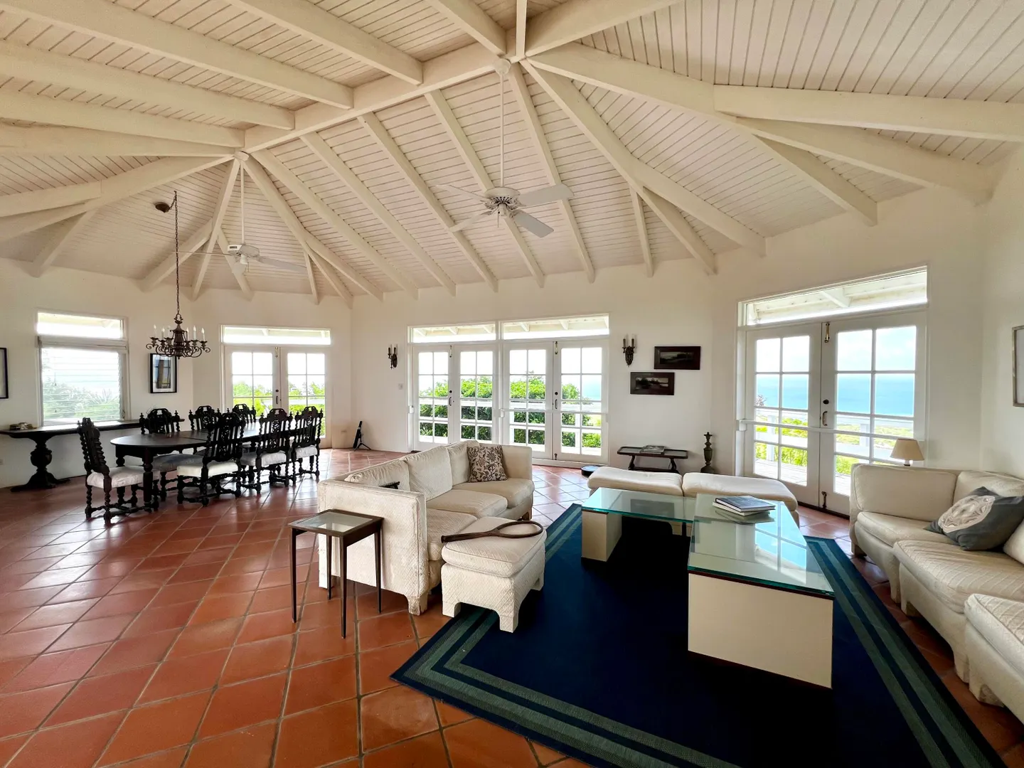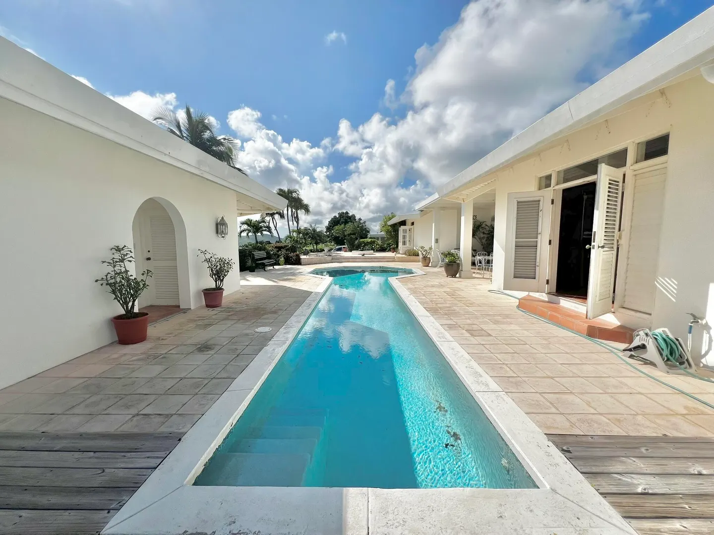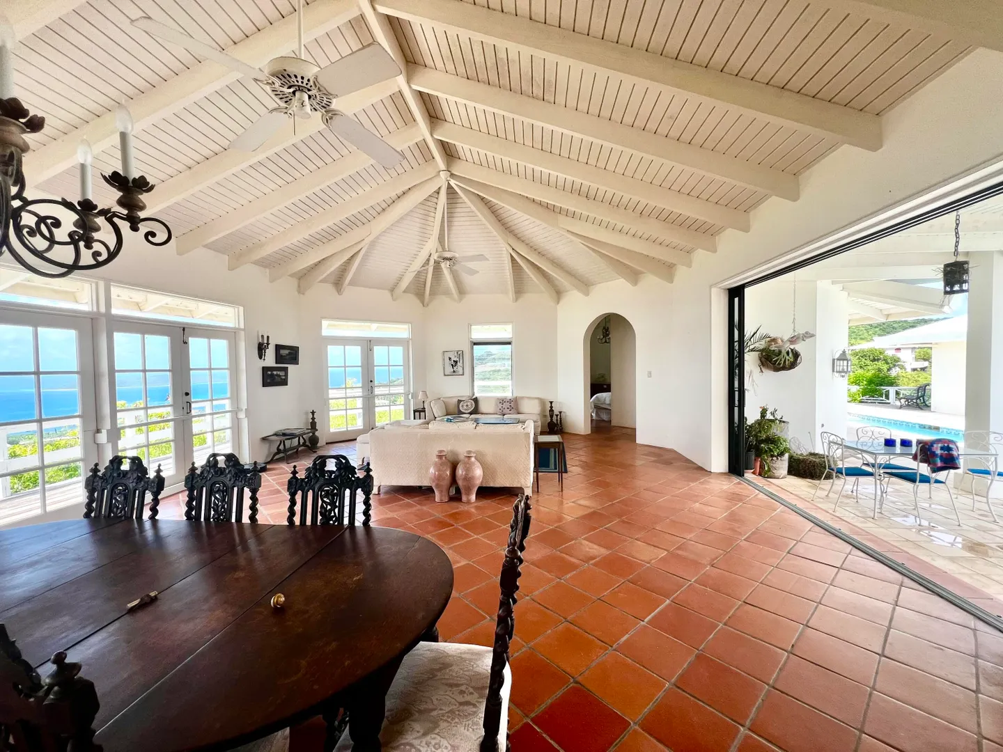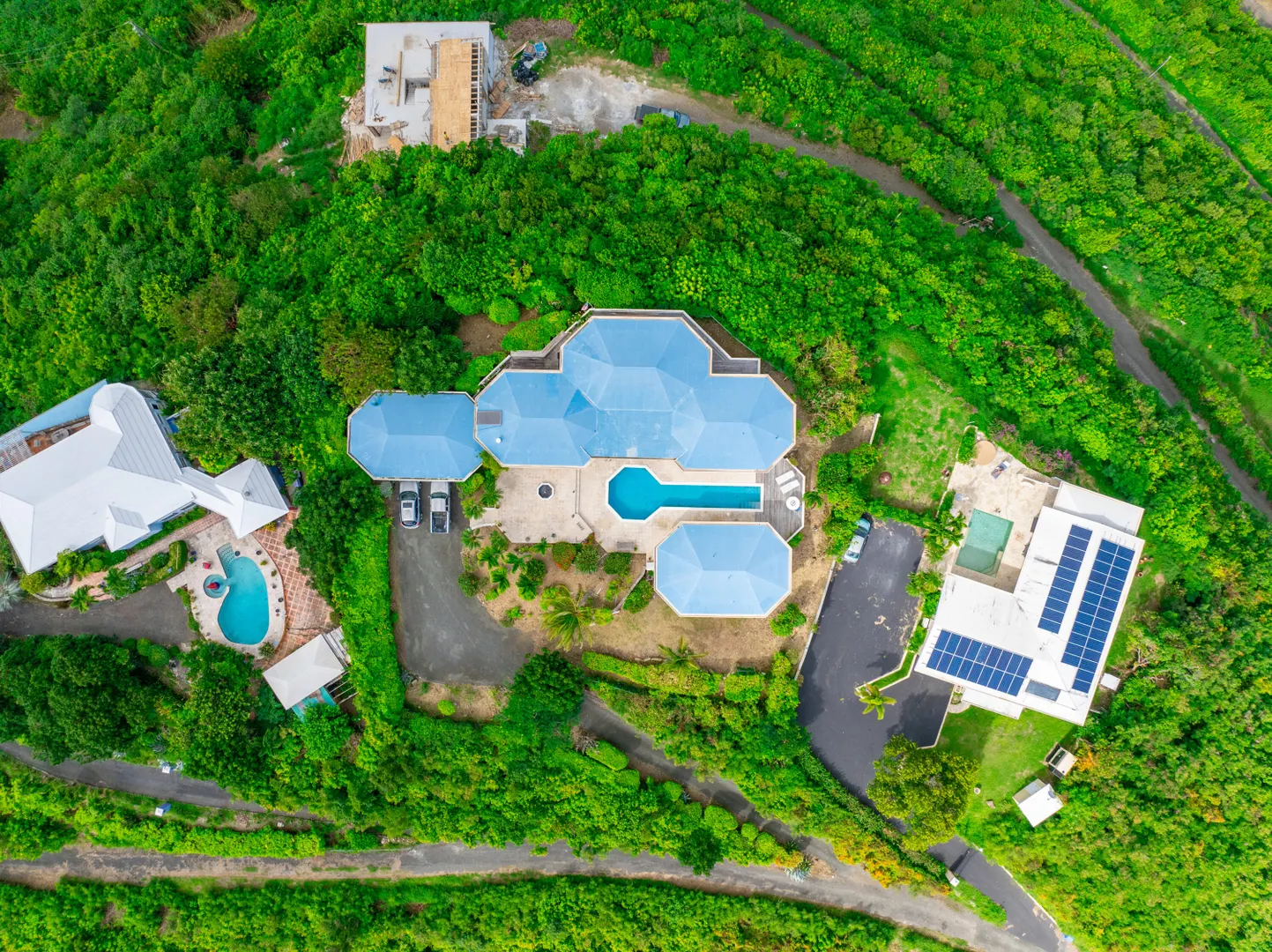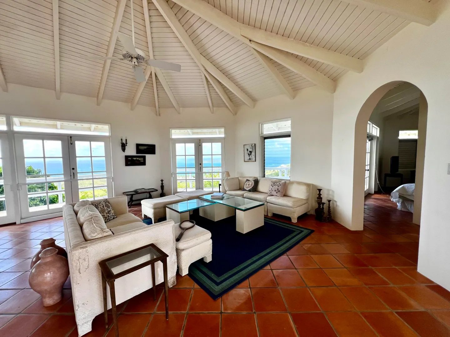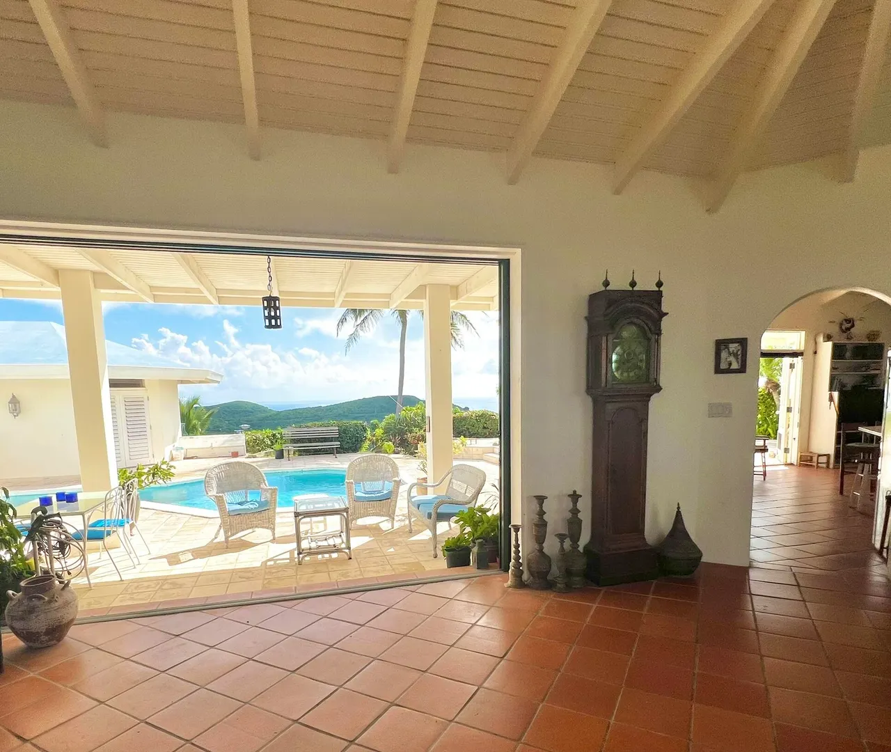 This incredible four-bedroom estate sits on the highest hill in Seven Hills, offering almost 360-degree views of the Caribbean Sea. From the iconic Buck Island to the Southshore and westward to Judith's Fancy and downtown Christiansted, every vantage point captures stunning natural beauty, including breathtaking sunsets. Custom-designed to maximize these vistas, the home features a unique layout with a central pool taking center stage, surrounded by uninterrupted views and an expansive pool deck. The estate is thoughtfully designed with two distinct living pods flanking the pool. The main pod is a bright and spacious retreat, highlighted by an open great room that blends the dining and large seating area.Wrapped in doors with 1/4-inch glass on the seaside & custom sliding impact glass doors on the poolside that pocket out of view, the space offers seamless indoor-outdoor living. The great room flows effortlessly to a covered gallery on the pool side and a large gallery that spans the entire northern sea facing side with some of the most breathtaking views on the island. Connected to the great room is a spacious kitchen featuring a cozy seating area with a fireplace, perfect for gathering and half bath. The main pod also includes the primary suite that is angled perfectly towards Buck Island so you wake to that stunning island view. Wake in the morning to the gorgeous view and roll out of your bed to do some laps in your pool before a day of island adventures. There is also a garage that is detached from the main pod, that currently only has one opening but was built to be a two-car garage with plenty of storage space, a workshop and the laundry room. The breezes are continuously blowing through the home for comfort and minimizing your power bill.