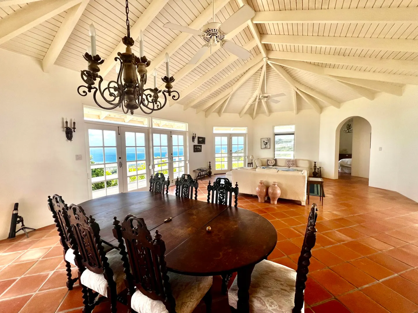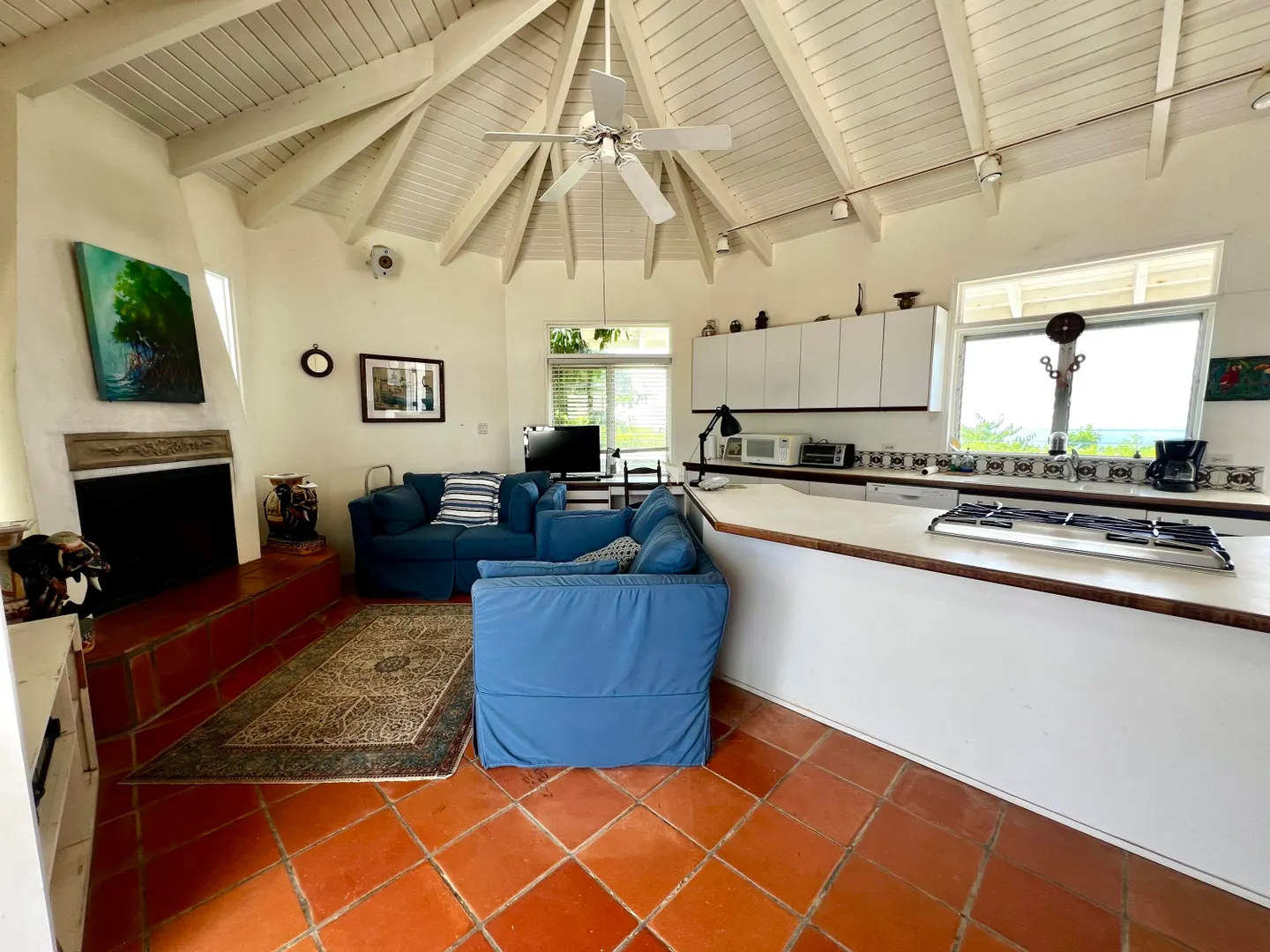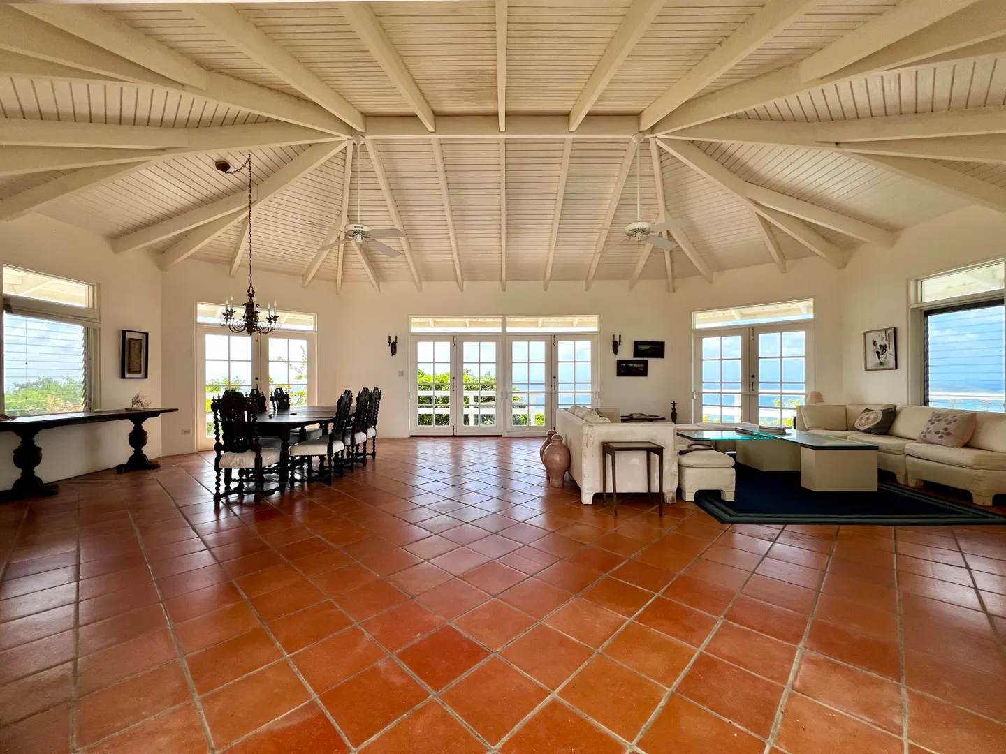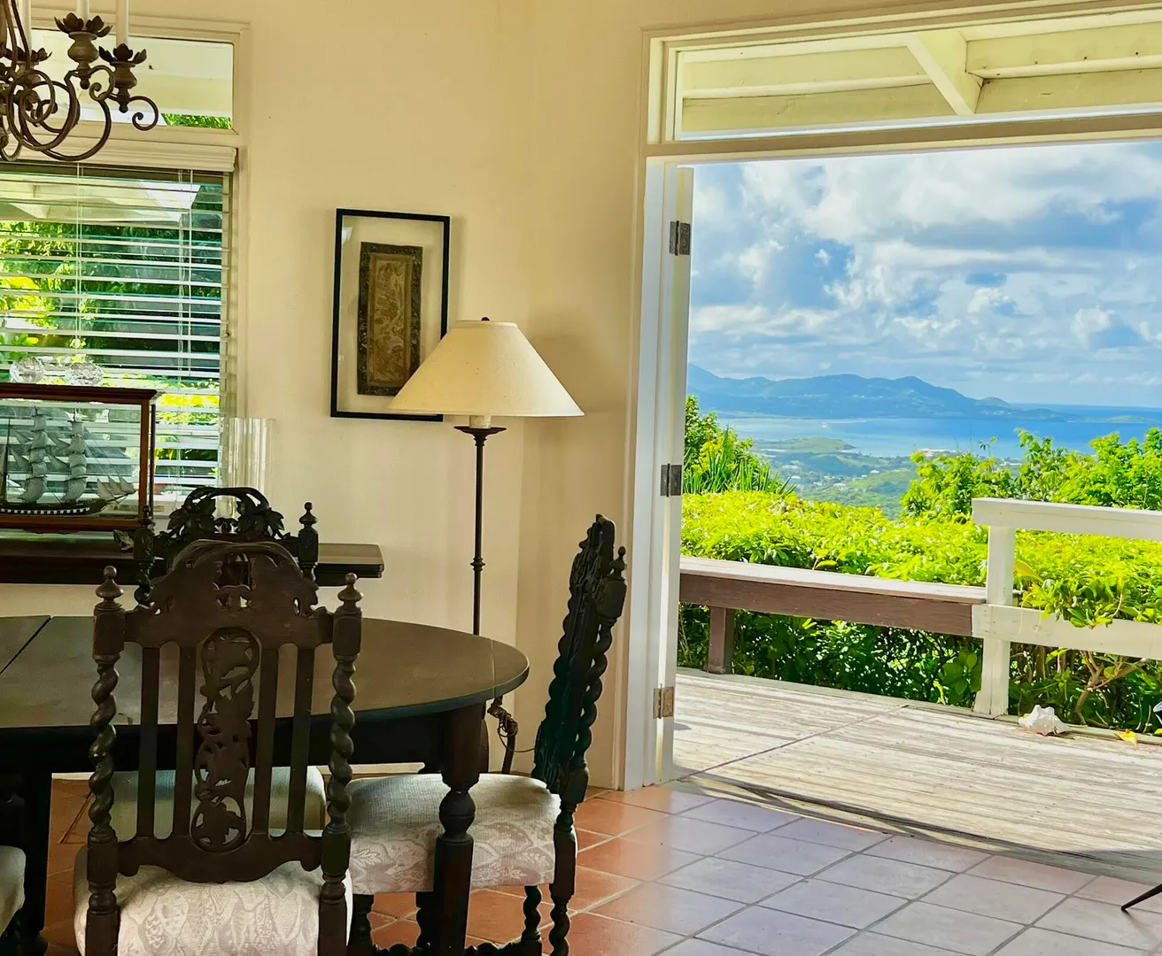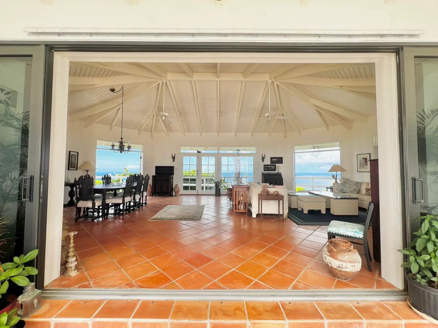 This incredible four-bedroom estate sits on the highest hill in Seven Hills, offering almost 360-degree views of the Caribbean Sea. From the iconic Buck Island to the Southshore and westward to Judith's Fancy and downtown Christiansted, every vantage point captures stunning natural beauty, including breathtaking sunsets. Custom-designed to maximize these vistas, the home features a unique layout with a central pool taking center stage, surrounded by uninterrupted views and an expansive pool deck. The estate is thoughtfully designed with two distinct living pods flanking the pool. The main pod is a bright and spacious retreat, highlighted by an open great room that blends the dining and large seating area.Wrapped in doors with 1/4-inch glass on the seaside & custom sliding impact glass doors on the poolside that pocket out of view, the space offers seamless indoor-outdoor living. The great room flows effortlessly to a covered gallery on the pool side and a large gallery that spans the entire northern sea facing side with some of the most breathtaking views on the island. Connected to the great room is a spacious kitchen featuring a cozy seating area with a fireplace, perfect for gathering and half bath. The main pod also includes the primary suite that is angled perfectly towards Buck Island so you wake to that stunning island view. Wake in the morning to the gorgeous view and roll out of your bed to do some laps in your pool before a day of island adventures. There is also a garage that is detached from the main pod, that currently only has one opening but was built to be a two-car garage with plenty of storage space, a workshop and the laundry room. The breezes are continuously blowing through the home for comfort and minimizing your power bill.