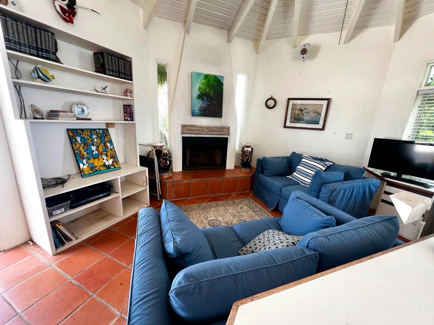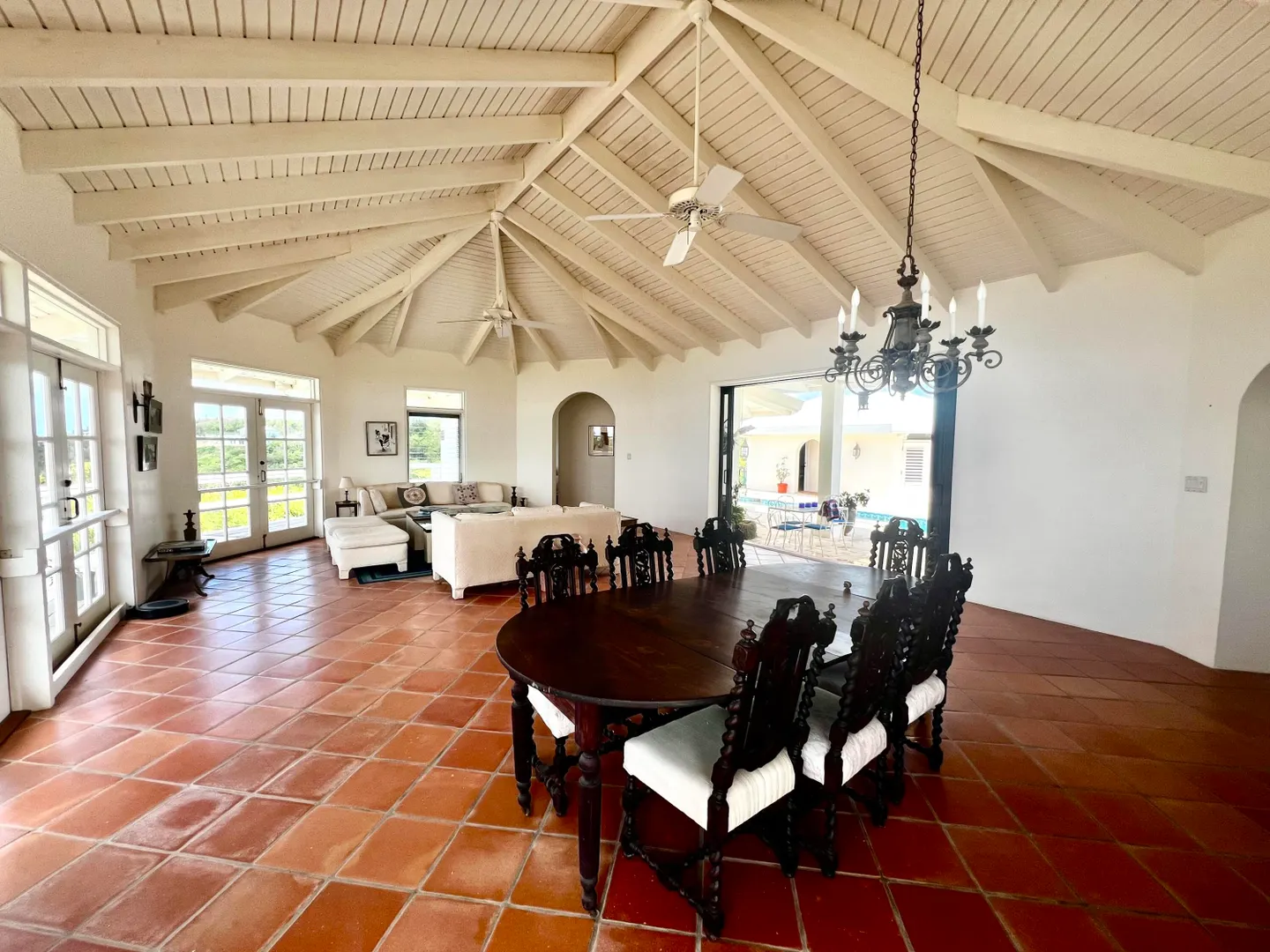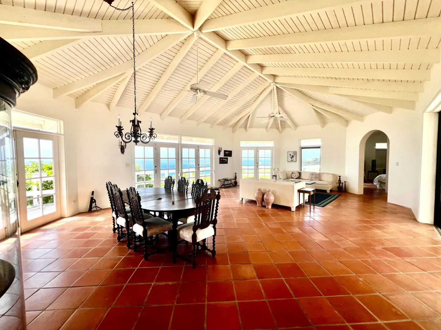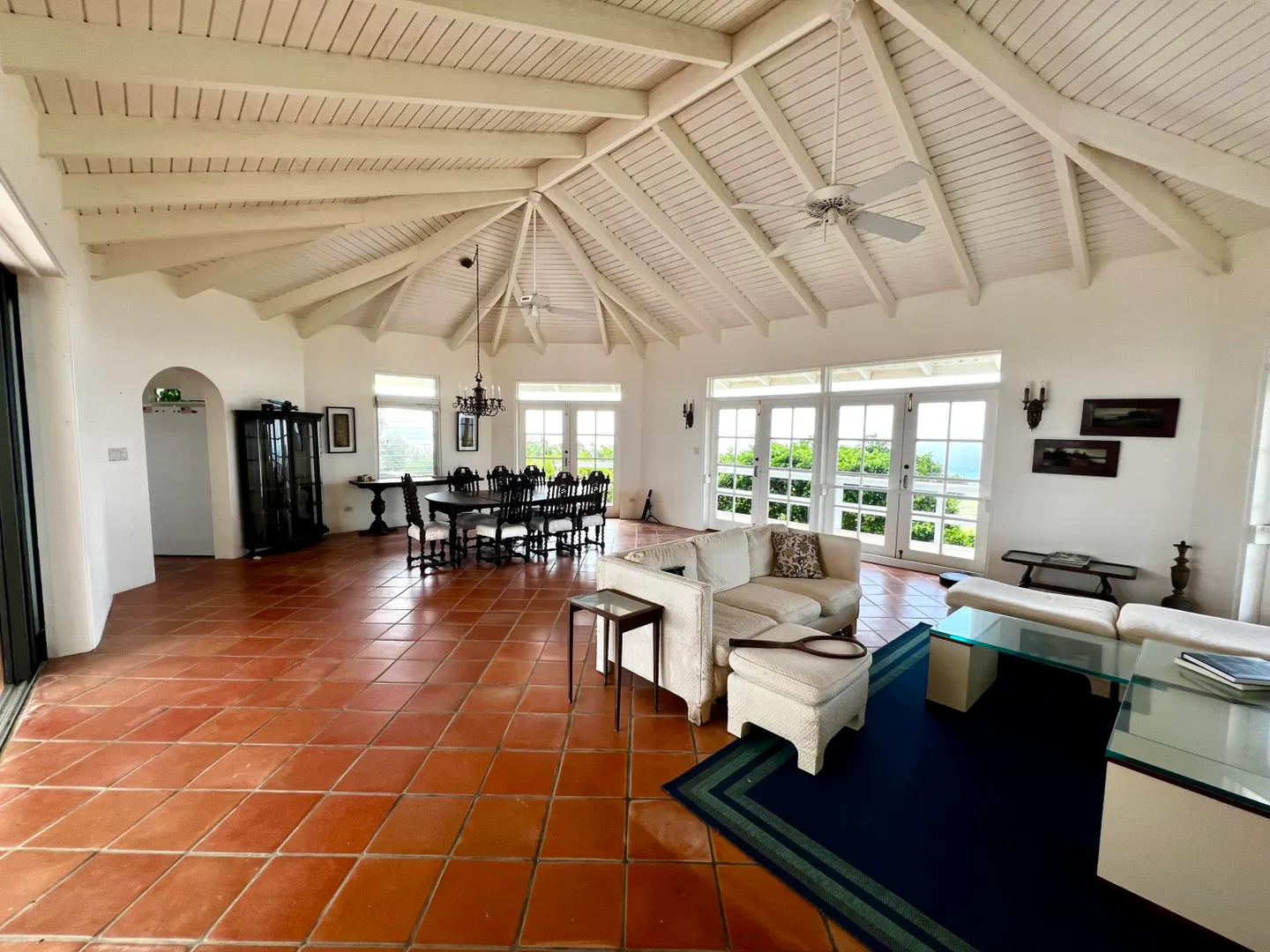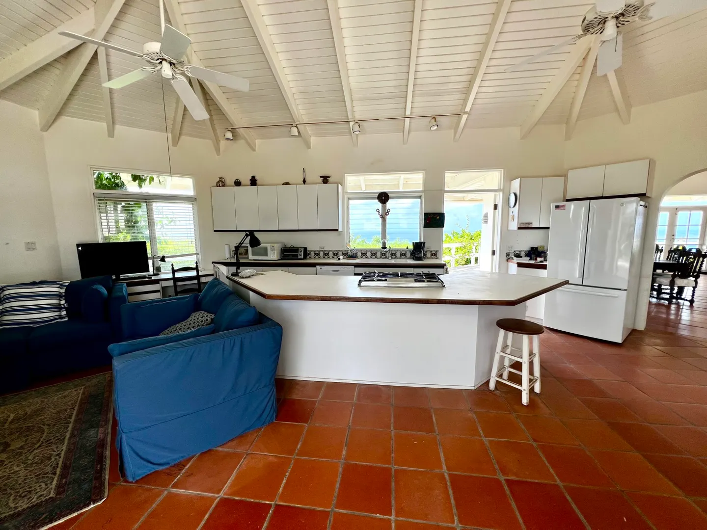 This incredible four-bedroom estate sits on the highest hill in Seven Hills, offering almost 360-degree views of the Caribbean Sea. From the iconic Buck Island to the Southshore and westward to Judith's Fancy and downtown Christiansted, every vantage point captures stunning natural beauty, including breathtaking sunsets. Custom-designed to maximize these vistas, the home features a unique layout with a central pool taking center stage, surrounded by uninterrupted views and an expansive pool deck. The estate is thoughtfully designed with two distinct living pods flanking the pool. The main pod is a bright and spacious retreat, highlighted by an open great room that blends the dining and large seating area.Wrapped in doors with 1/4-inch glass on the seaside & custom sliding impact glass doors on the poolside that pocket out of view, the space offers seamless indoor-outdoor living. The great room flows effortlessly to a covered gallery on the pool side and a large gallery that spans the entire northern sea facing side with some of the most breathtaking views on the island. Connected to the great room is a spacious kitchen featuring a cozy seating area with a fireplace, perfect for gathering and half bath. The main pod also includes the primary suite that is angled perfectly towards Buck Island so you wake to that stunning island view. Wake in the morning to the gorgeous view and roll out of your bed to do some laps in your pool before a day of island adventures. There is also a garage that is detached from the main pod, that currently only has one opening but was built to be a two-car garage with plenty of storage space, a workshop and the laundry room. The breezes are continuously blowing through the home for comfort and minimizing your power bill.