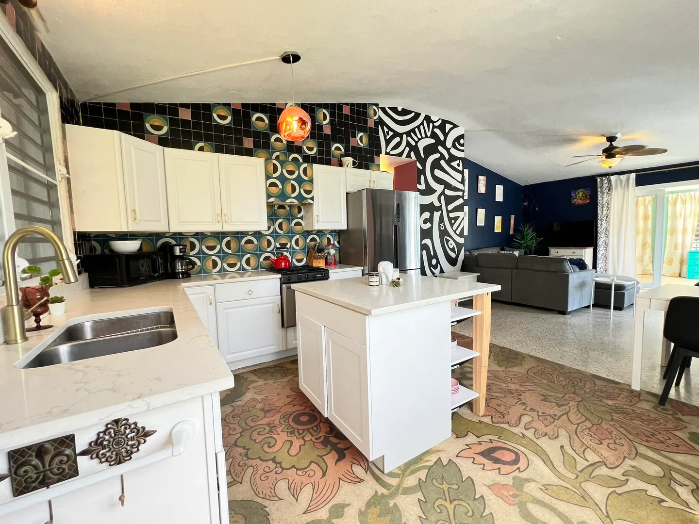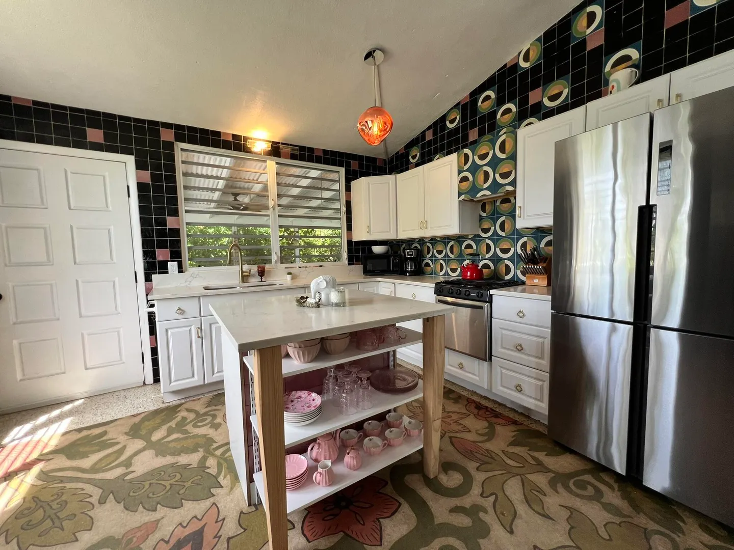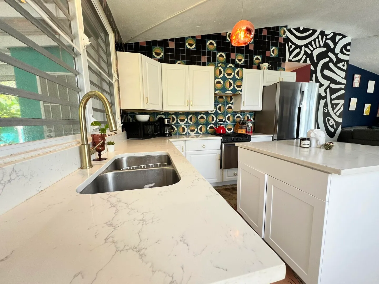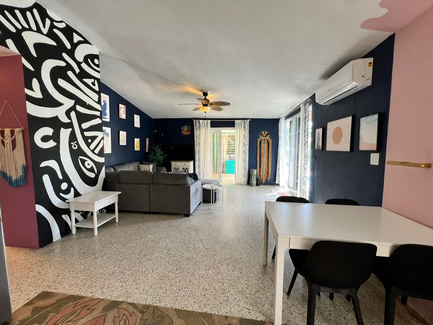 Discover this hip and funky home, where eclectic design meets modern comfort. Featuring three bedrooms and two bathrooms, including a newly renovated primary bathroom with double sinks and an outdoor shower, this home is a true gem. The open-concept, remodeled kitchen enhances the living space, while the lush, tropical landscaping offers a fenced yard and a refreshing pool. Embrace year-round Caribbean living in this vibrant and stylish retreat.