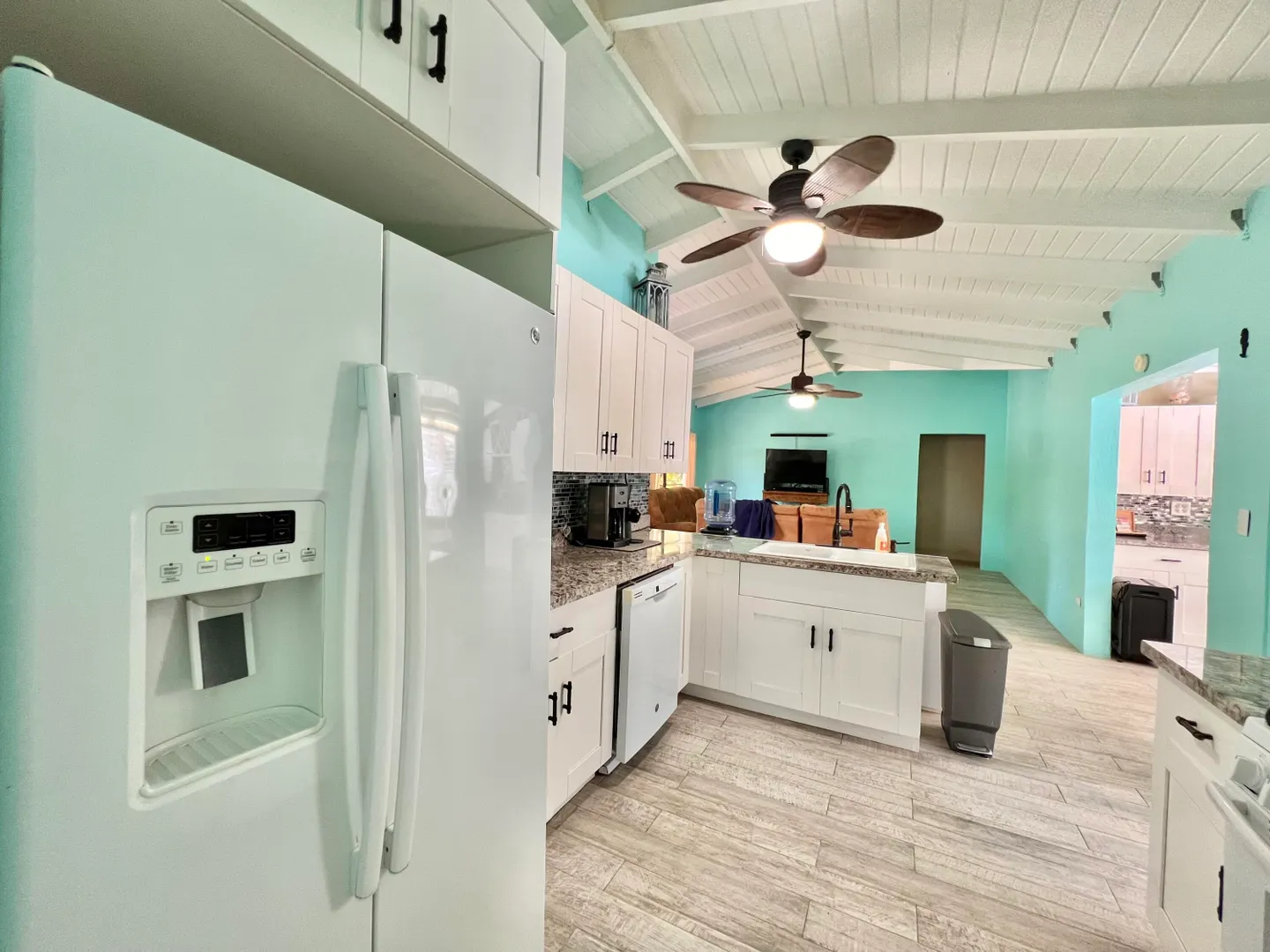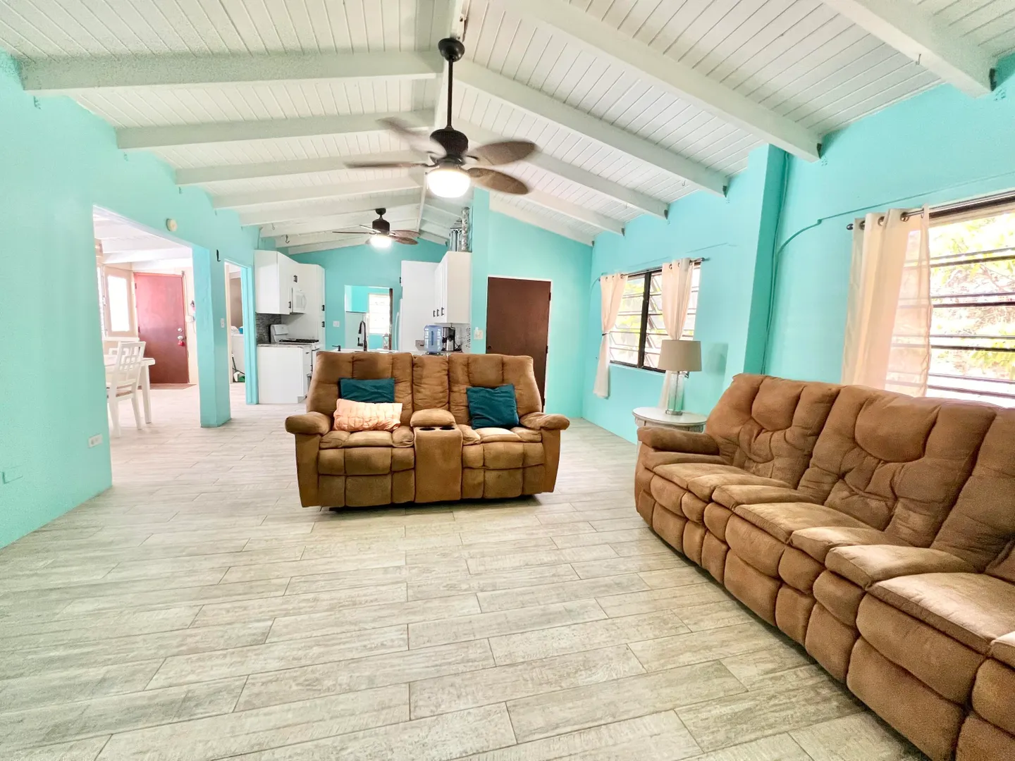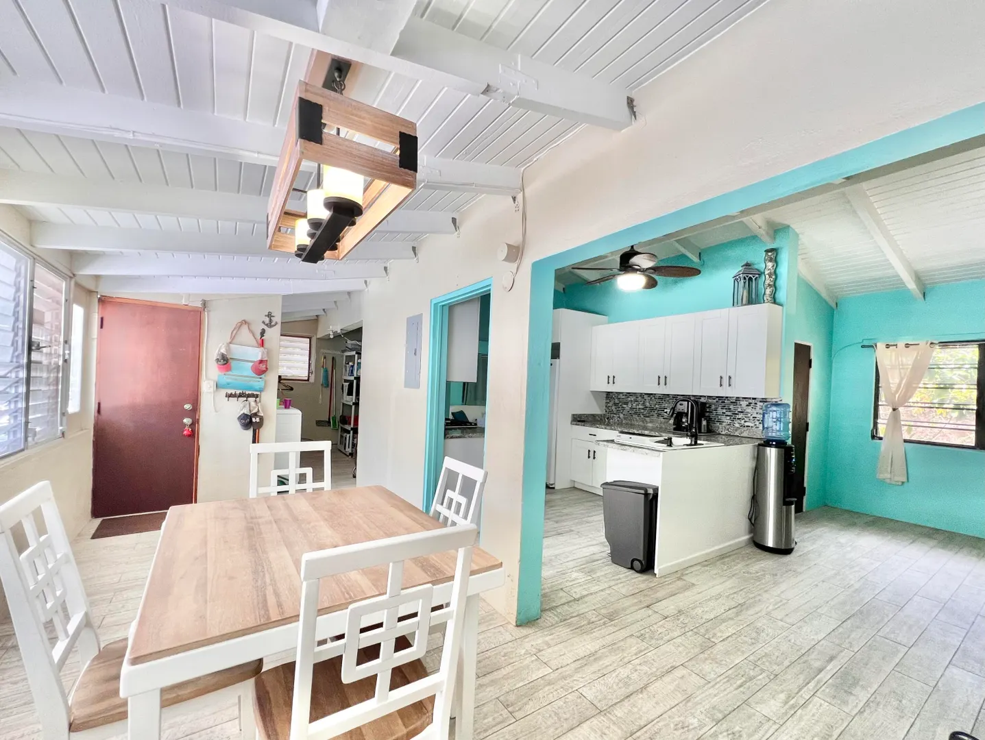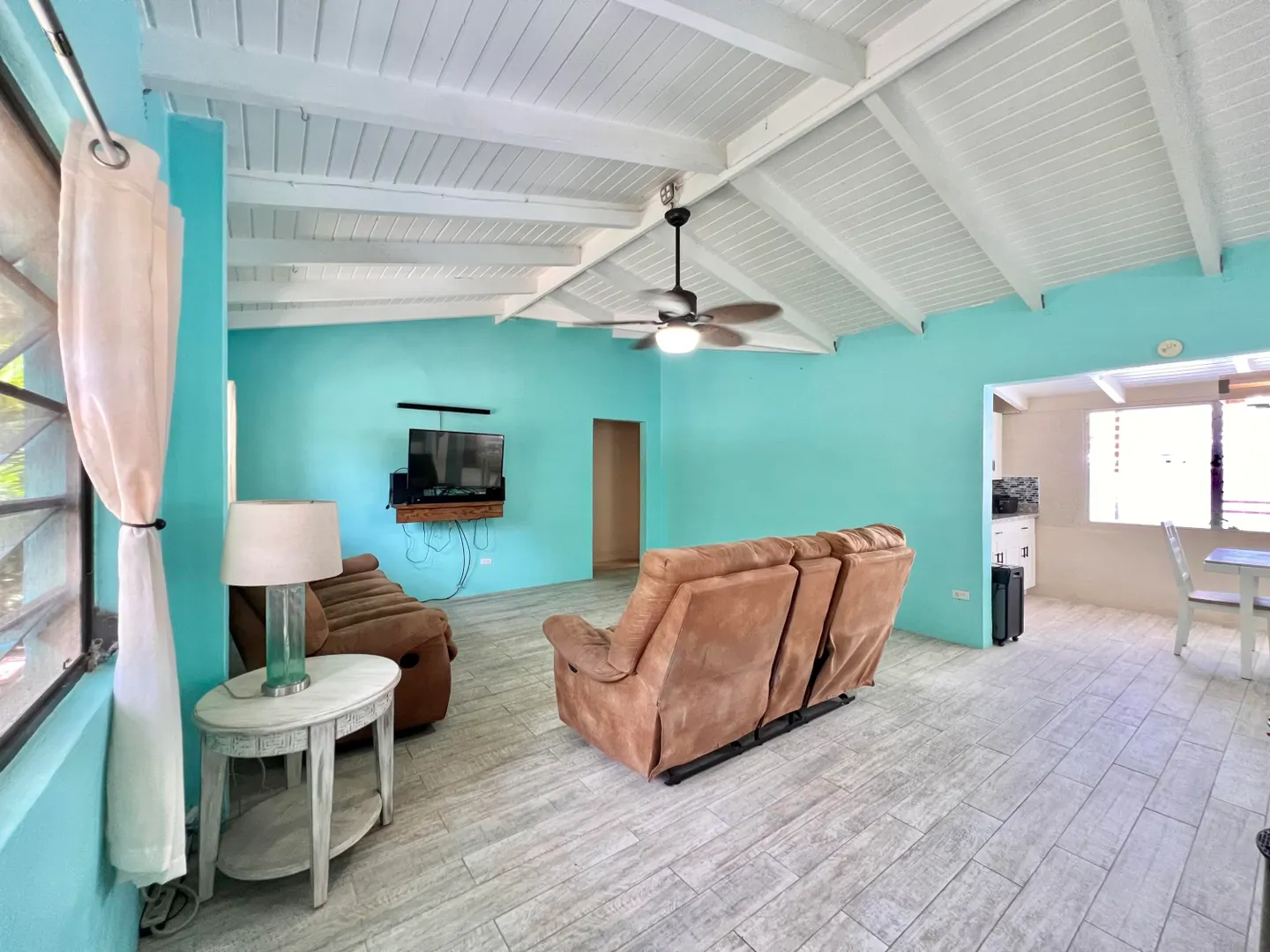 This three bedroom two bathroom island villa with beautiful upgrades and lush tropical landscaping is a the perfect home for anyone looking for a serene and comfortable lifestyle! Located on a dead end street, this property offers a private and peaceful oasis away from the noise and hustle of the mid-island location, yet is so close to all your conveniences. The interior of the house is spacious and inviting with fresh design elements and quality finishes that includes updated flooring and an open kitchen concept finished with white cabinetry and granite countertops. The two updated bathrooms were finished with custom tile work and modern vanities and fixtures. The large living room, with tall cathedral ceilings, boasts large windows that let in plenty of natural light, highlighting
