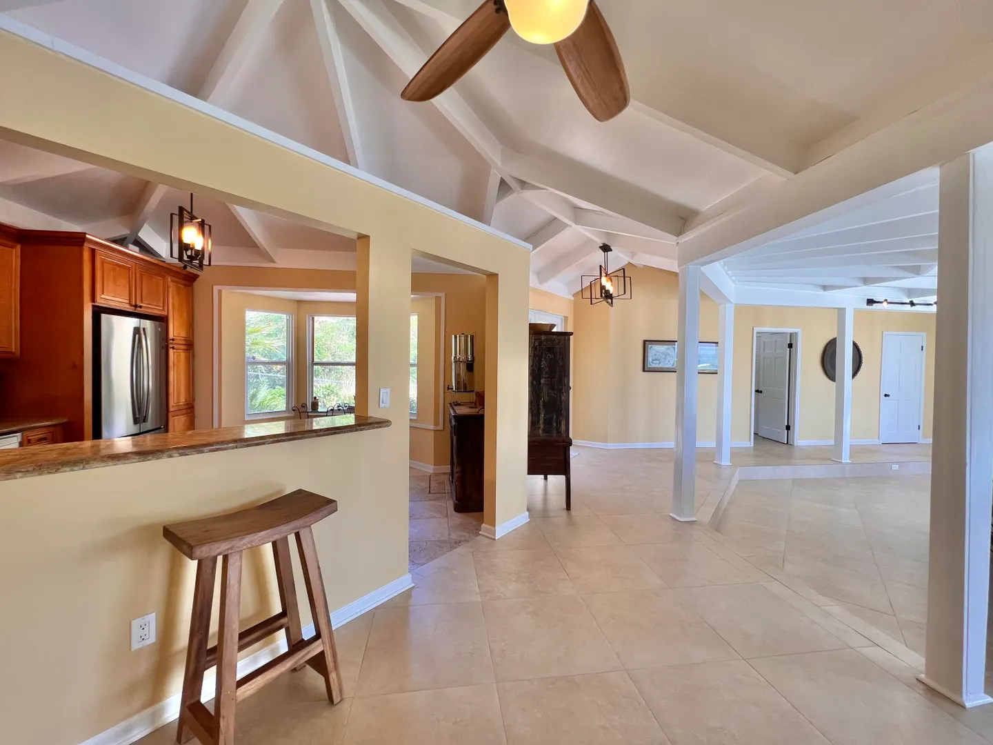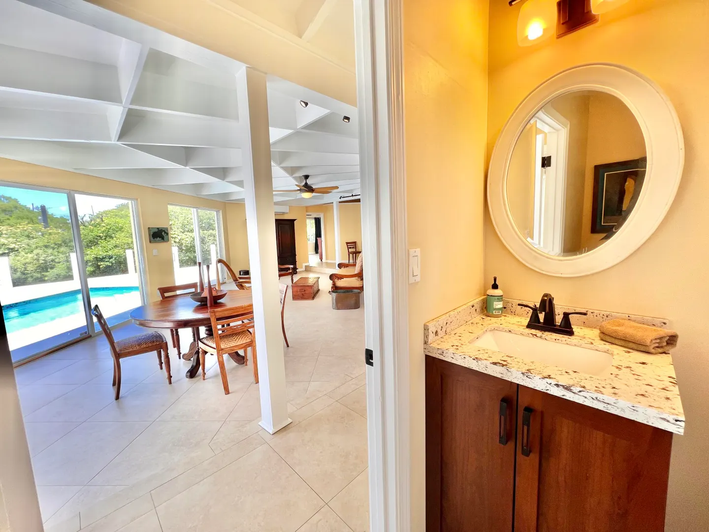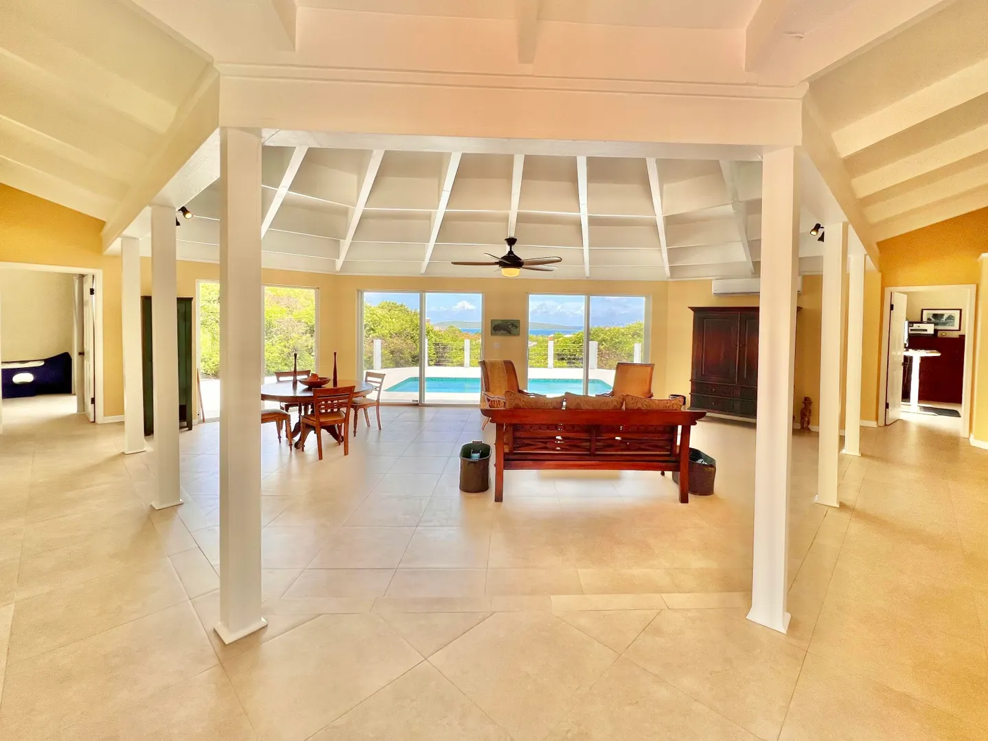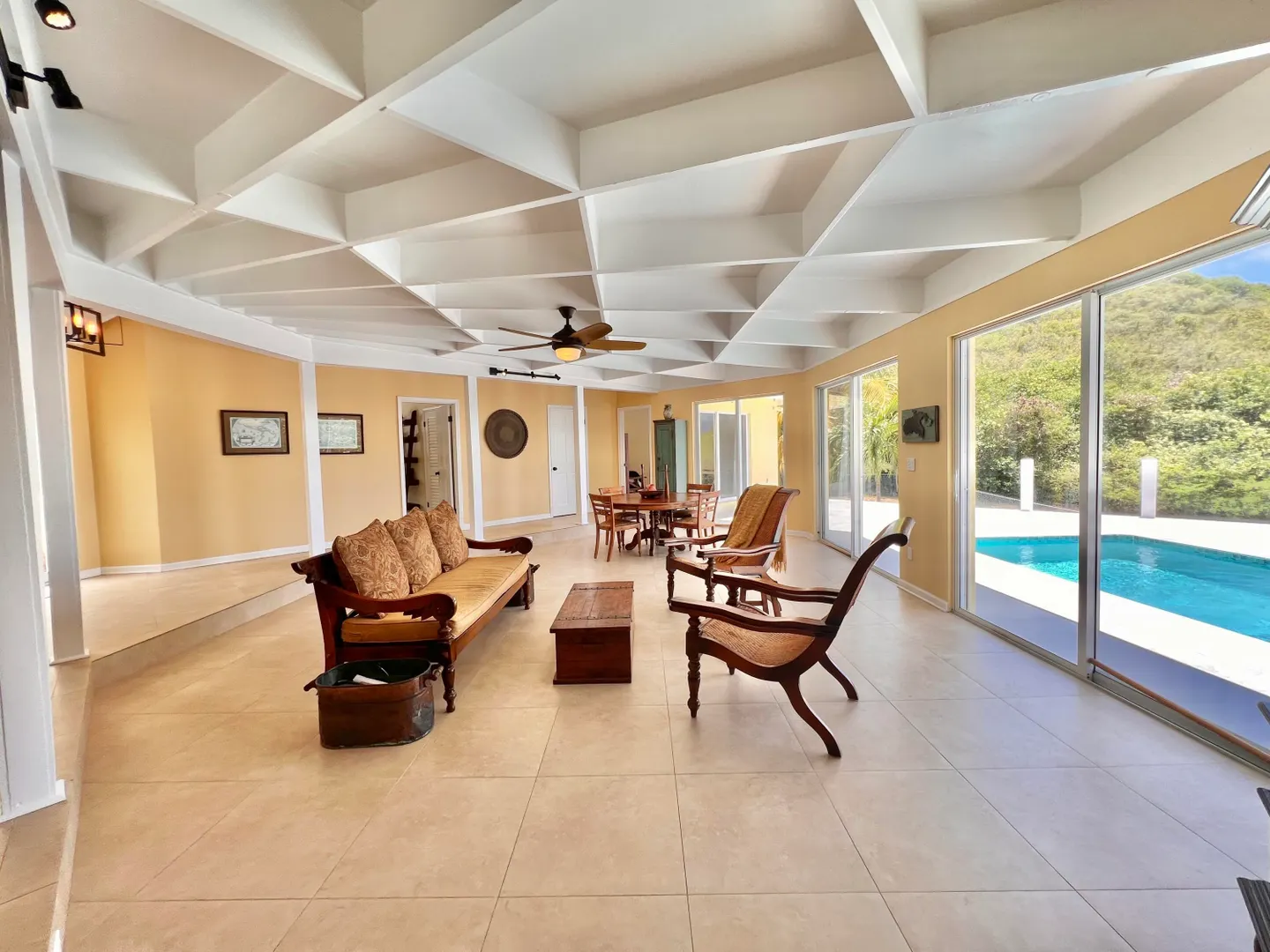 Discover the ultimate Caribbean retreat at Coral Reef Villa, a stunning three-bedroom, two and a half-bath home with SOLAR net-metering, a pool and a one-bedroom recently renovated apartment. Located on the east end with straight-on Buck Island views and a refreshing salt-water swimming pool, this move-in ready villa embodies the very essence of Caribbean living, complete with high-quality finishes and expert craftsmanship throughout. The V-shaped design seamlessly connects indoor and outdoor living spaces, immersing you in spectacular views from every angle. All bedrooms are situated under one roof, framing the living room and newly poured concrete pool deck. Step into the beautiful kitchen complete with Italia granite countertops, stainless steel appliances, and custom cabinetry.