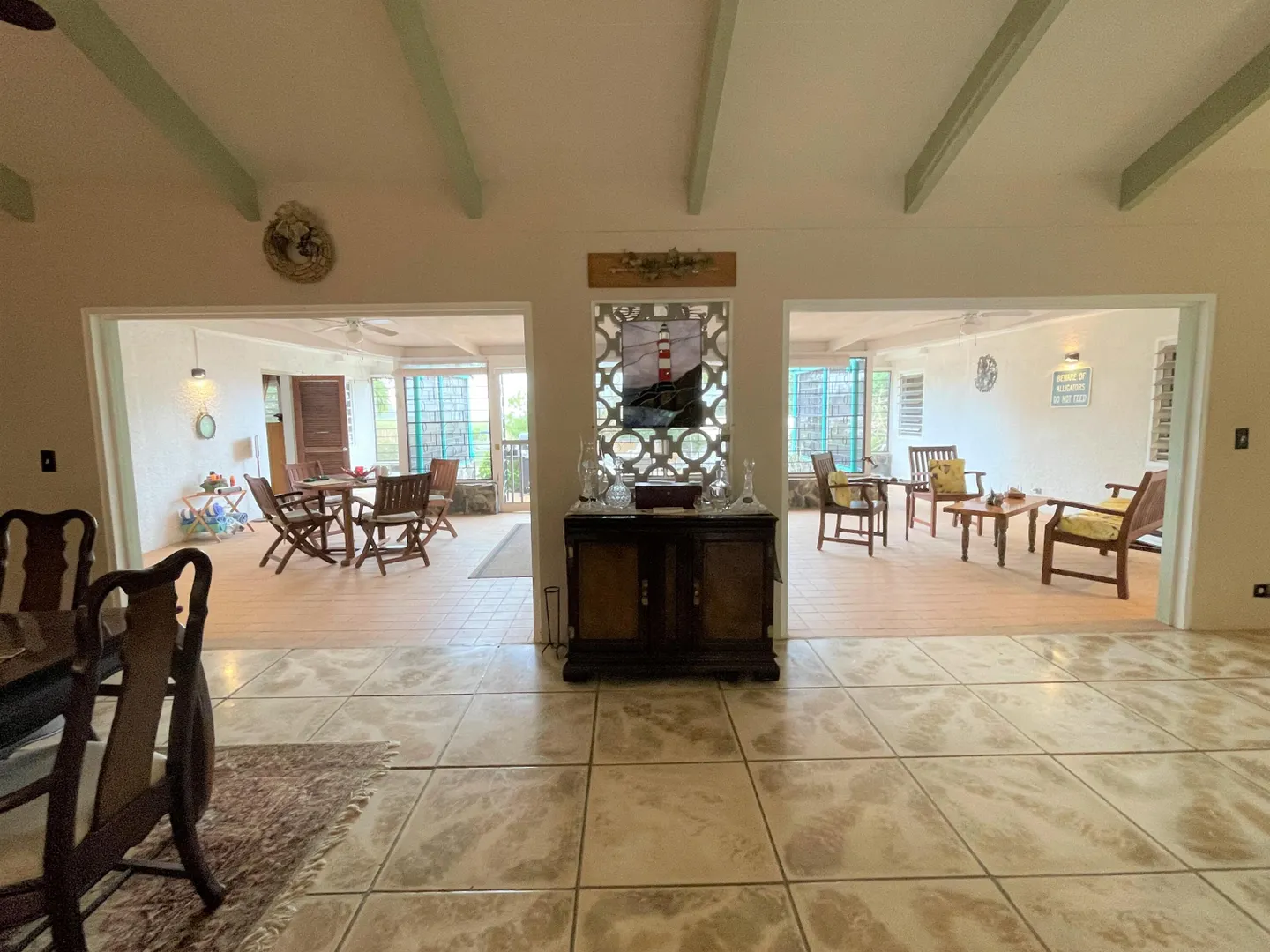 Large open living spaces make this lovely home comfortable and inviting. Located in the Prosperity neighborhood across the road from Rainbow Beach, the nice, fenced yard, pool and sea view offer lots of options for those who love the water and enjoy the beautiful West End beaches. Inside, the large veranda has been screened and secured to be fully appreciated as living space. Vaulted ceilings and fans throughout complement the cool sea breezes. Four bedrooms offer flexibility. Plenty space for a large family, or enjoy the sea view from the large master bedroom and convert extra bedrooms into office, studio or play space. Tool shed, solar hot water, security bars in windows, two cisterns, fruit trees, and a large whole house generator add to the comfort and security of this beautiful home.