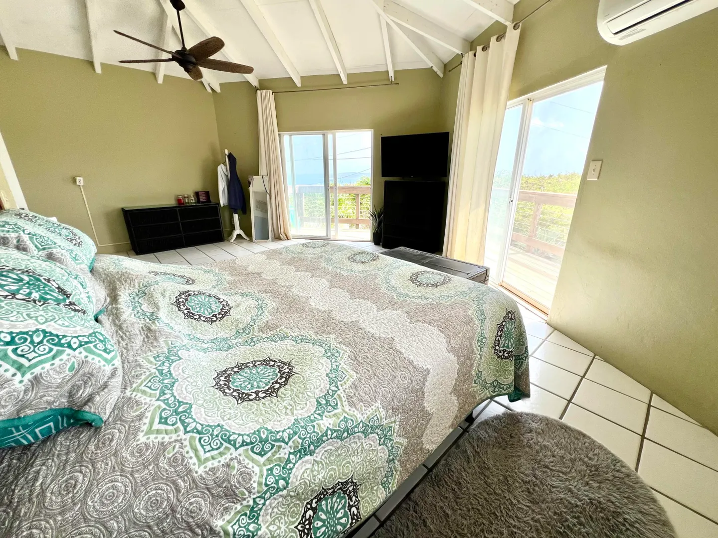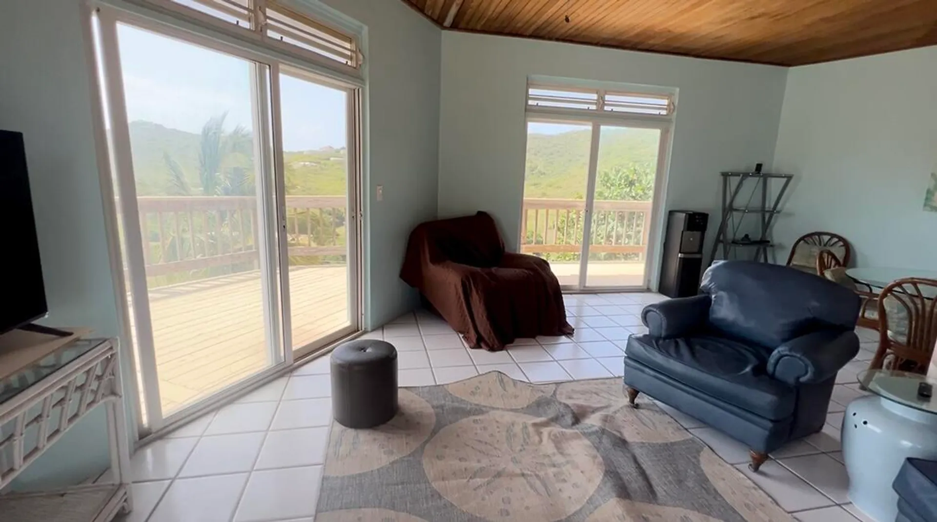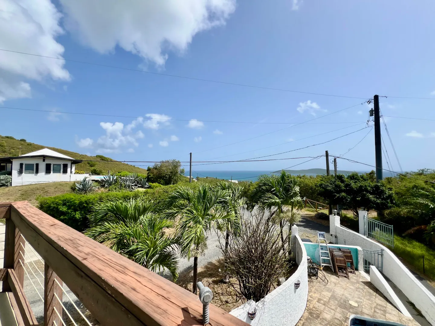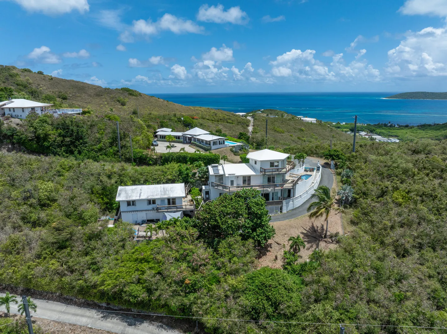This spacious East End property located on half an acre is uniquely suited for anyone with a large family or seeking a vacation rental, corporate retreat, multi-family dwelling, separate space for rental income or plenty of room to stretch out and relax in paradise. The 2623 sq ft 3BR/3BA main house has views of Buck Island, the iconic Cotton Valley sugar mill and gorgeous green valley views. The main house with soaring cypress ceilings has a large living/dining/kitchen area that opens to the fun pool deck offering panoramic views including Buck Island. On this same level there are two bedrooms and two baths (one en suite with granite countertop and mahogany and the other has a unique open atrium) and each bedroom opens to the deck and views. The primary suite, on the upper level,complete with a full bath and walk-in closet, is accessed via spiral staircase and spans the top level of the main house. You'll feel like royalty taking in the sweeping sea and pastoral views from the private bedroom's wrap-around deck.