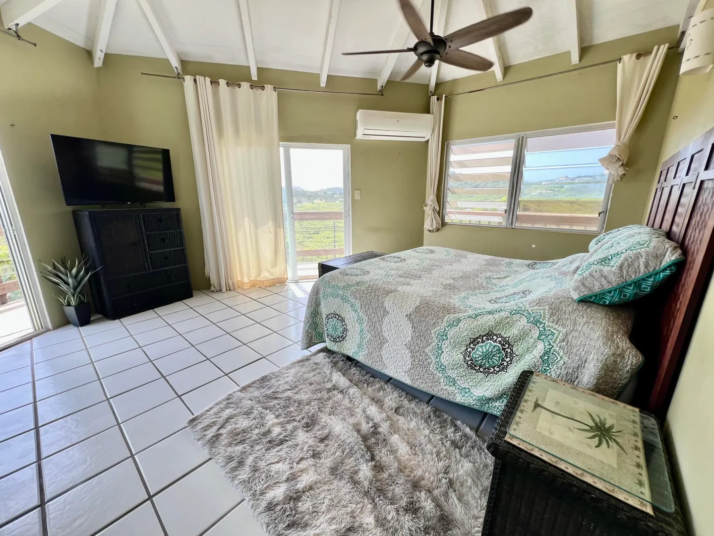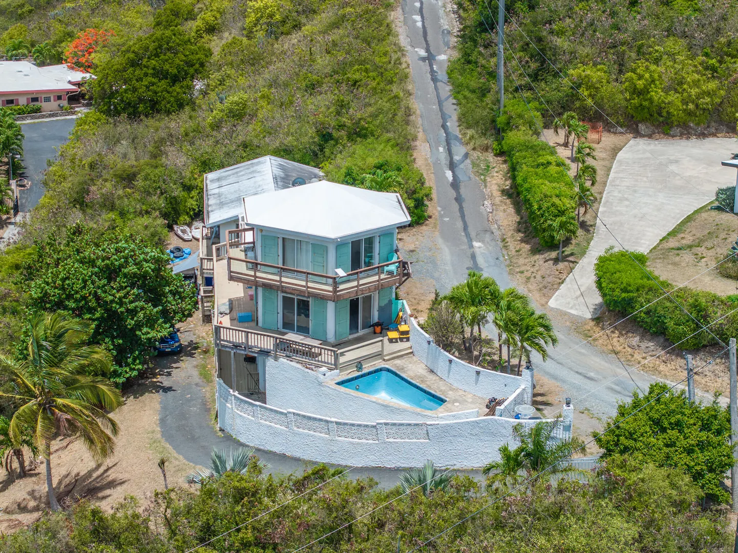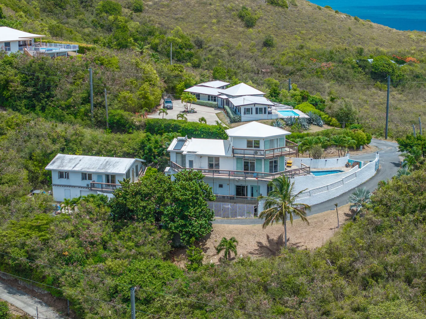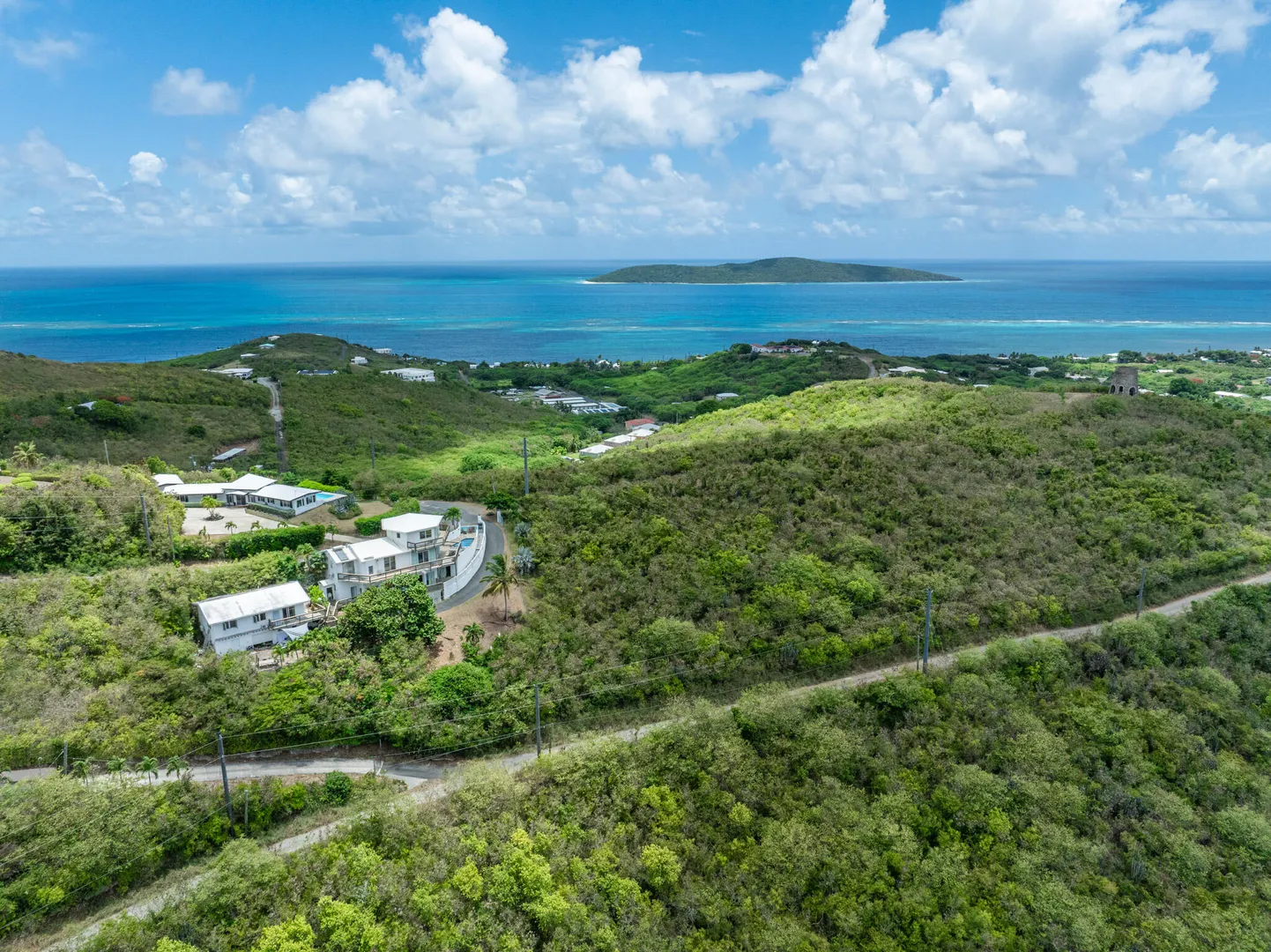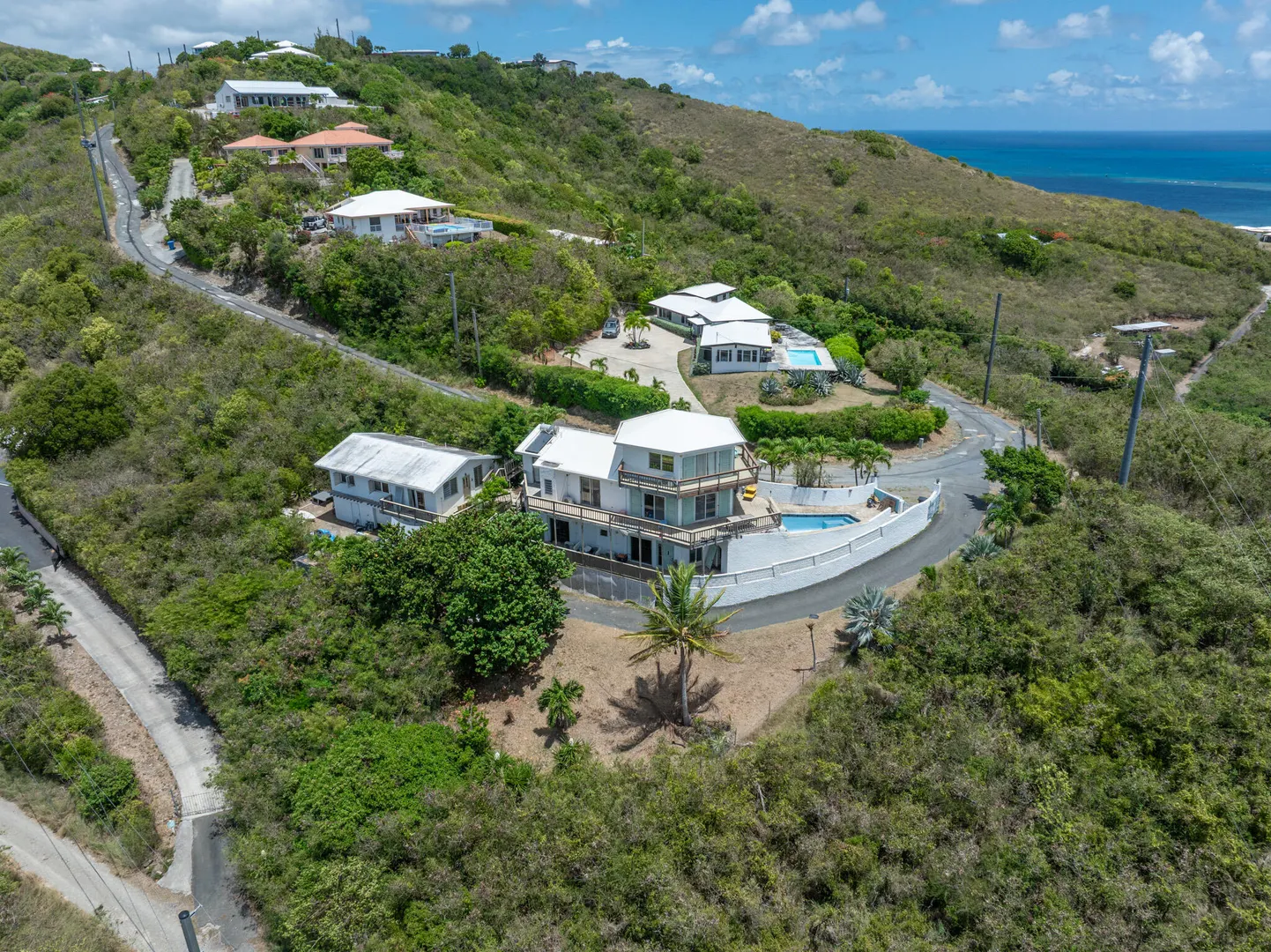 This spacious East End property located on half an acre is uniquely suited for anyone with a large family or seeking a vacation rental, corporate retreat, multi-family dwelling, separate space for rental income or plenty of room to stretch out and relax in paradise. The 2623 sq ft 3BR/3BA main house has views of Buck Island, the iconic Cotton Valley sugar mill and gorgeous green valley views. The main house with soaring cypress ceilings has a large living/dining/kitchen area that opens to the fun pool deck offering panoramic views including Buck Island. On this same level there are two bedrooms and two baths (one en suite with granite countertop and mahogany and the other has a unique open atrium) and each bedroom opens to the deck and views. The primary suite, on the upper level,complete with a full bath and walk-in closet, is accessed via spiral staircase and spans the top level of the main house. You'll feel like royalty taking in the sweeping sea and pastoral views from the private bedroom's wrap-around deck.