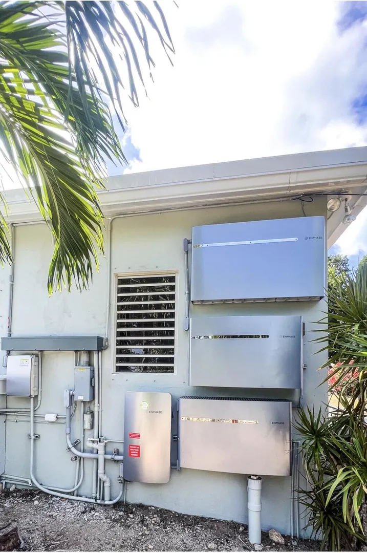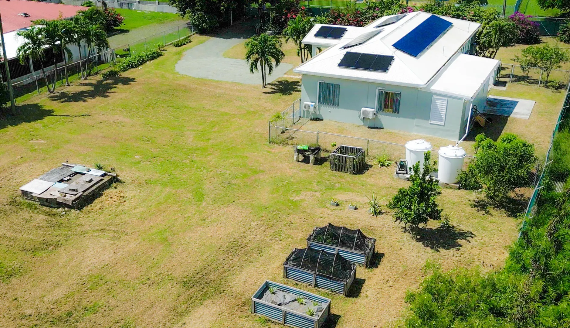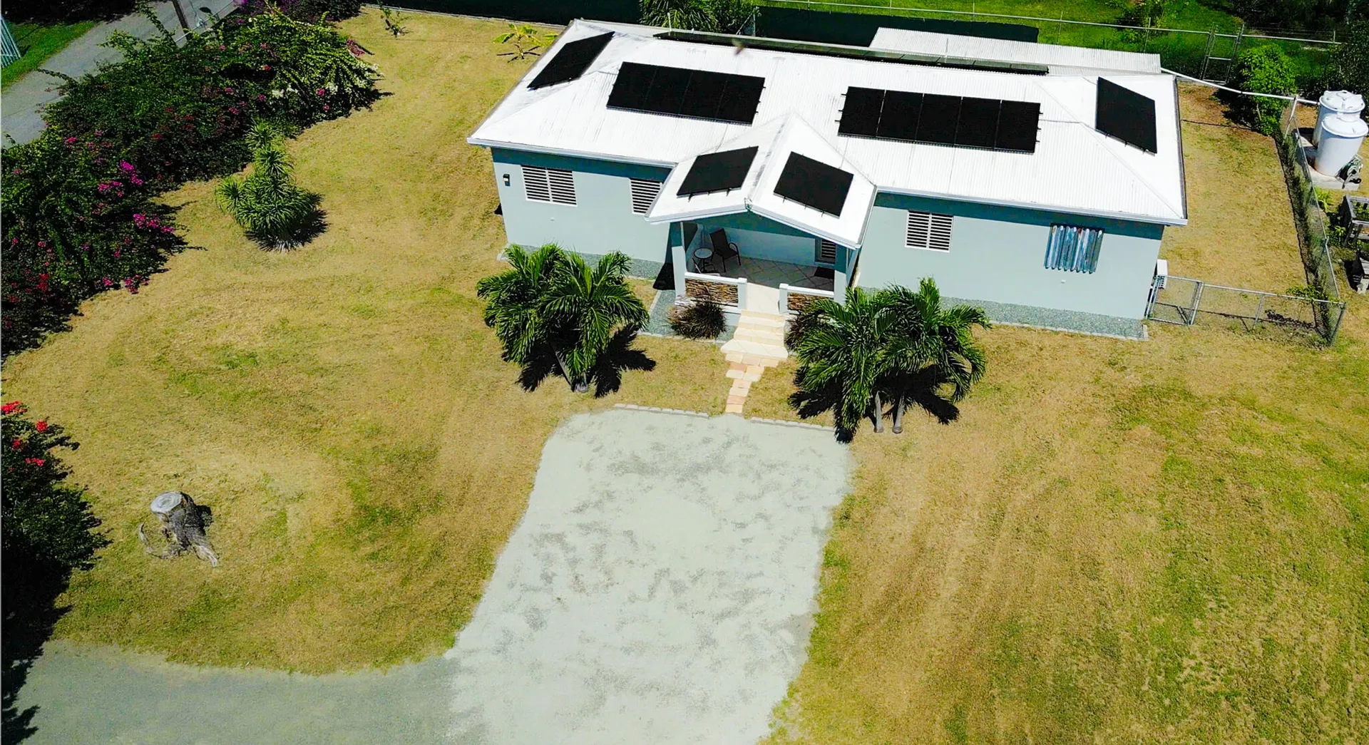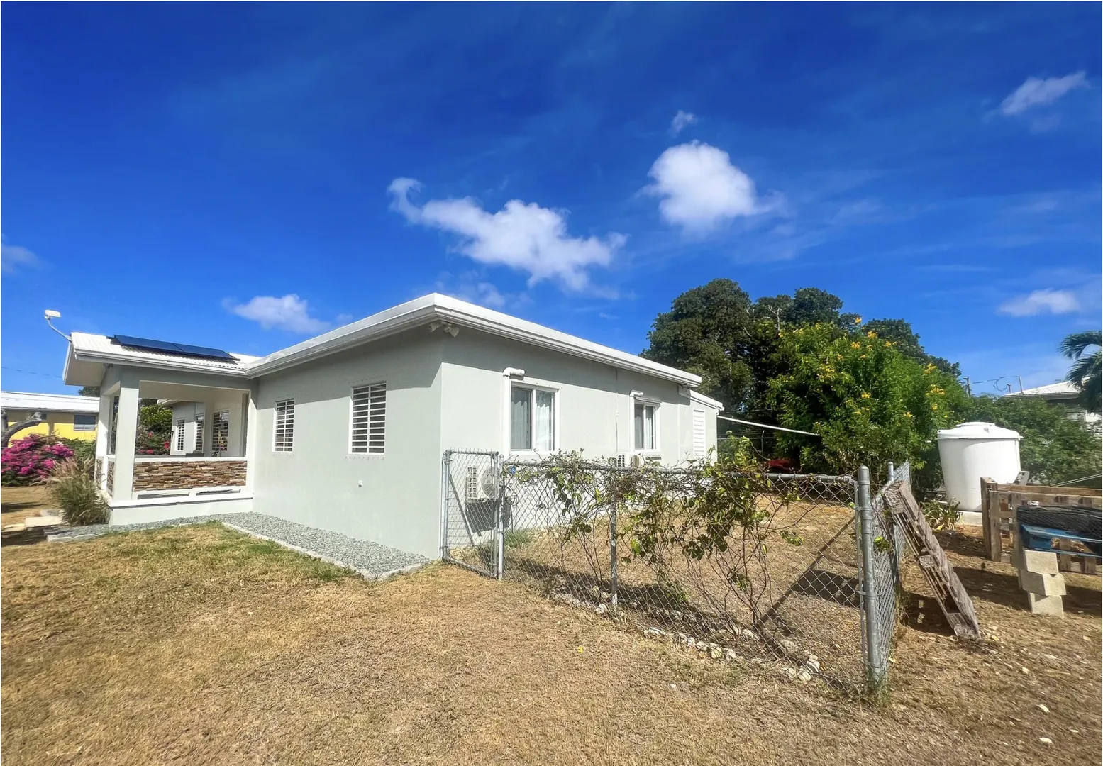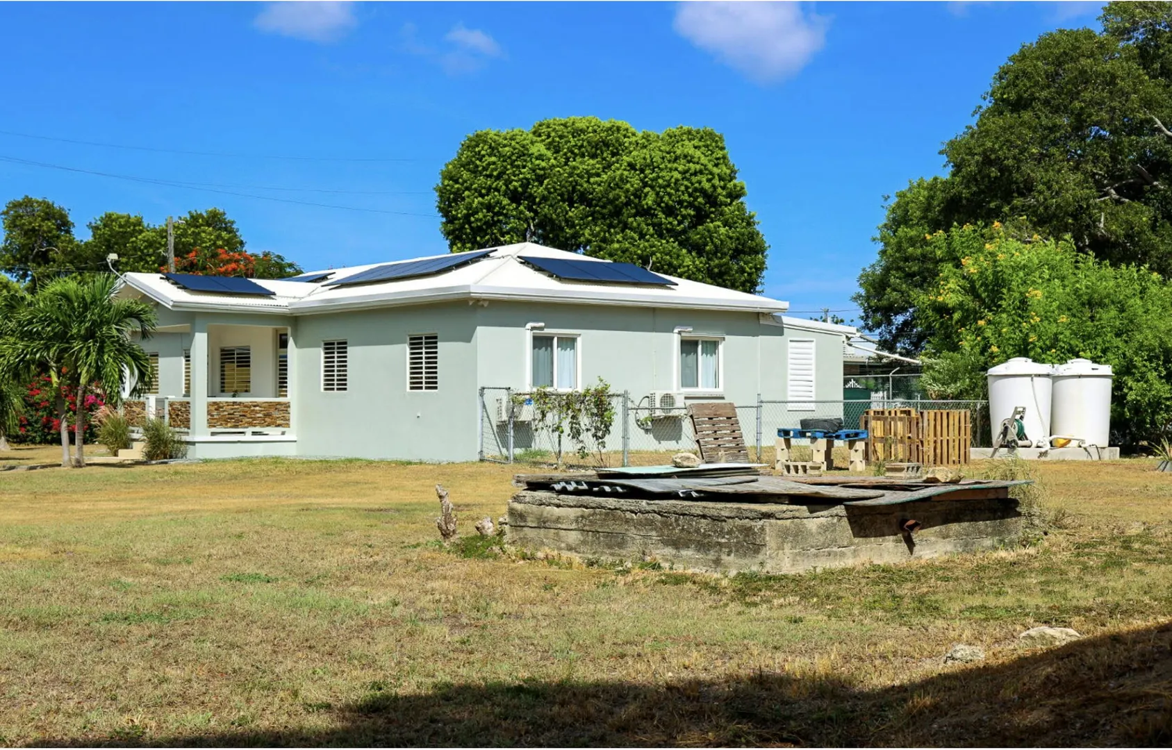 Nestled just outside Frederiksted town, this stunning 3-bedroom, 2-bathroom home offers a serene lifestyle on a private, fully fenced acre. It features extensive updates, including brand-new electrical wiring, a cutting-edge Enphase solar system with battery backup for off grid sustainable living, and modern appliances. The fully air-conditioned interior is complemented by new fans, light fixtures, and many windows that bring natural light into the home.Ideal for those with a green thumb, the property is outfitted with two compost beds, three raised garden beds, and two 600-gallon water buffalos. The 20x9 two-chambered cistern provides ample water storage, supplemented by an old cistern reserved for gardening. Flowering and fruiting plants add to the lush, tropical setting.Pet lovers will appreciate the double fencing that ensures a safe space for furry friends.