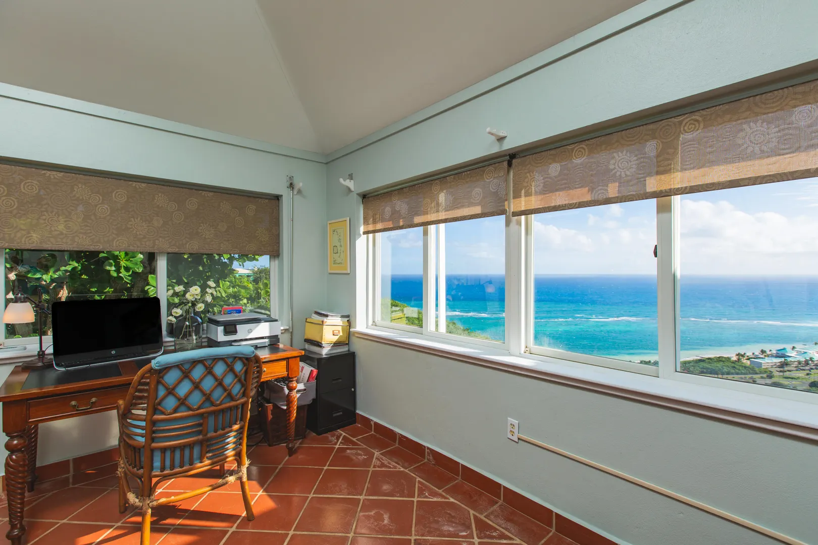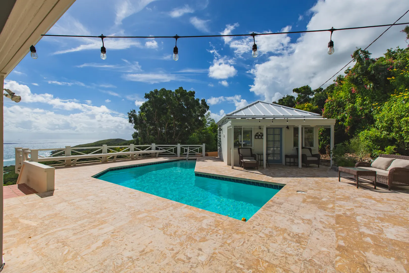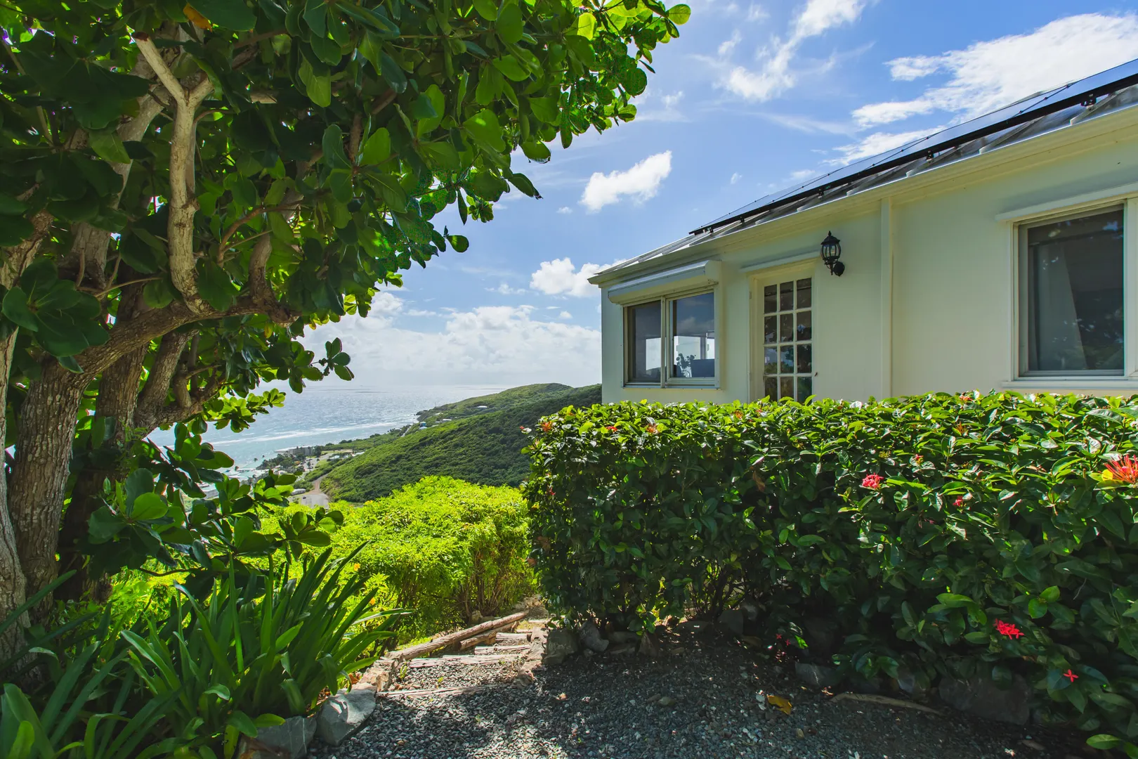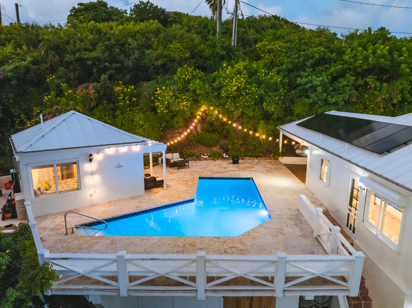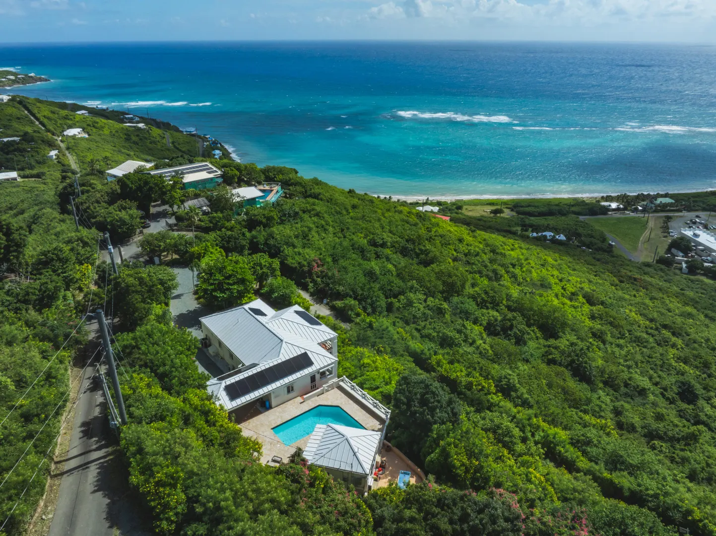 Nestled in the leafy enclave of Maggie Hill is this furnished, turn-key, 2 bedroom, 2 bath home with a pool, solar, central AC and mini splits, a studio cottage, lush landscaping and sweeping views of the South Shore. Gorgeous ocean blues fill the open floor plan through huge windows that line the entire southern exposure of the home. A terraced front yard filled with trees, perfect for dogs - the entire property has been fully fenced. Meticulously maintained....the Sellers have completed a multitude of improvements in the short time, they have owned the property - a full list of improvements is in the documents section. Perfect as a first or second home or turnkey vacation rental! (continued)The kitchen features new appliances, new backsplash tile, granite countertops, a separate wine fridge and a large pantry. The kitchen has a west facing door for easy access to the pool and grill when entertaining. The dining table with upholstered bench provides for comfy and relaxing meals while starring out at the ocean. There is enough seating for more than 10 people comfortably at this window seat bench/dining area. There are many areas to lounge in this home. The spacious covered deck off the two living rooms has lots of cozy seating for ocean gazing or watching the activity down at Divi. The second living room leads to two bedrooms, both with their own bathroom. The primary bedroom has a large seating area, its own exit to the driveway, a walk-in closet and a dressing room between the ensuite bathroom and closet -any clotheshorse dream come true. The guest bathroom has been redone.