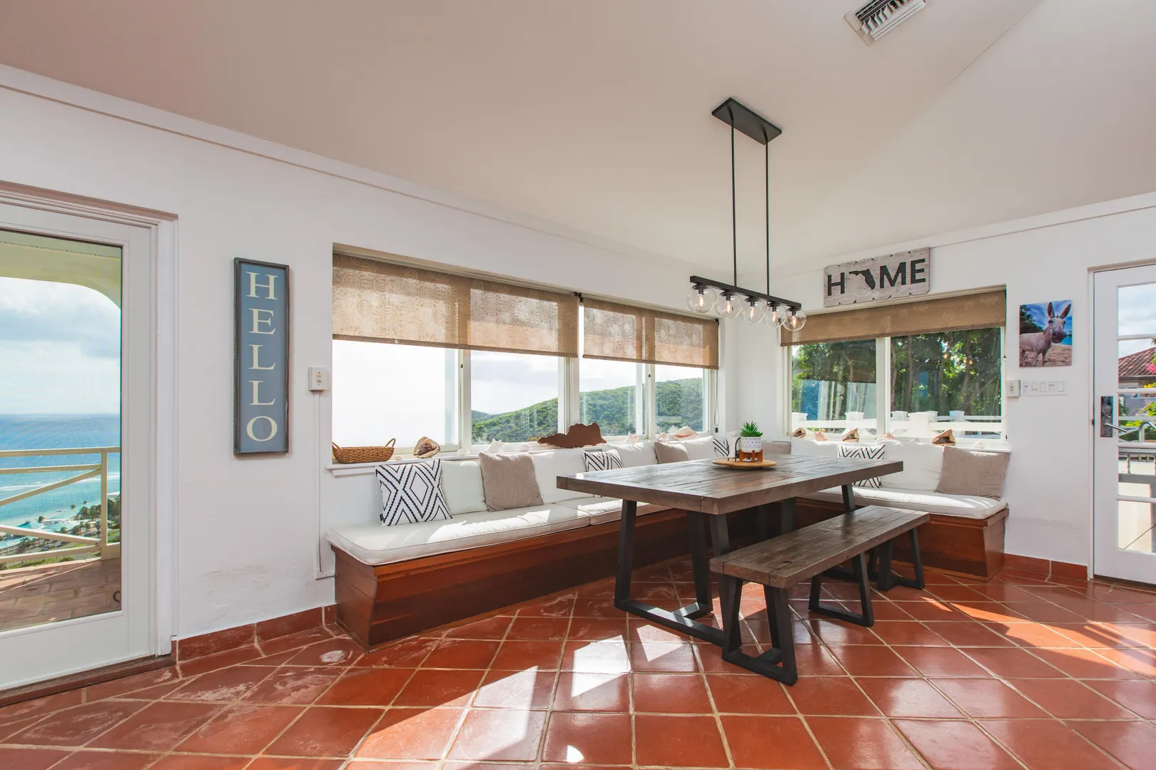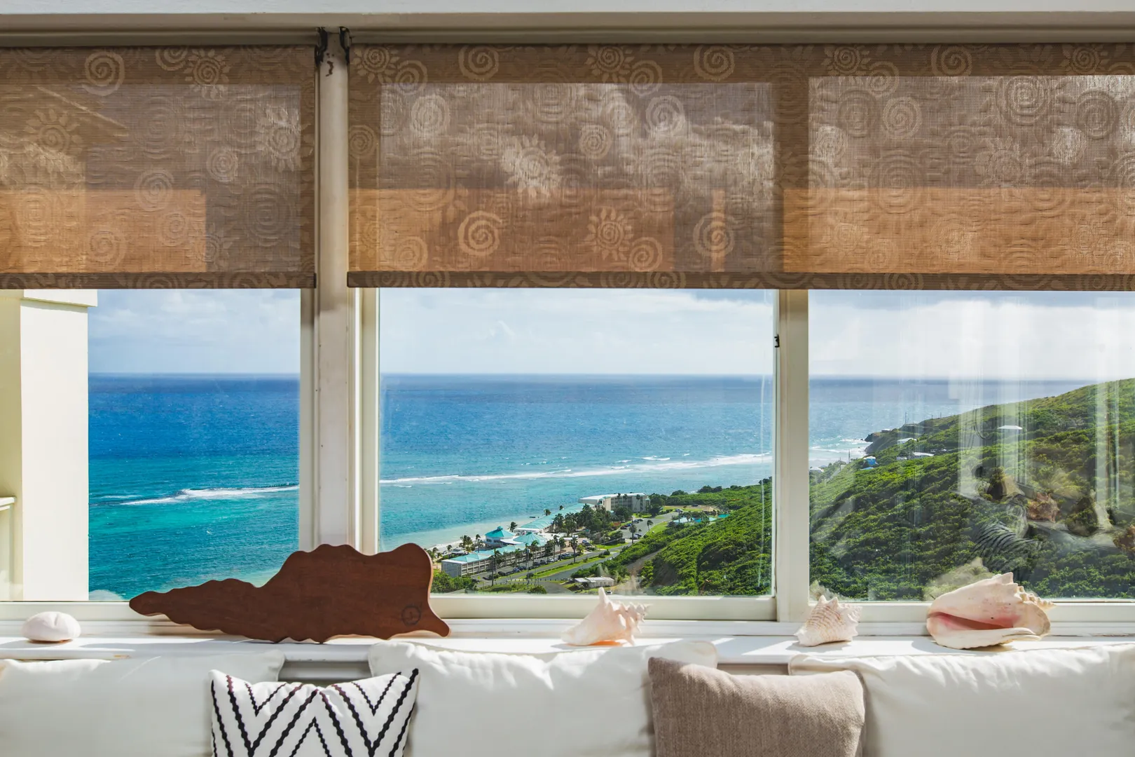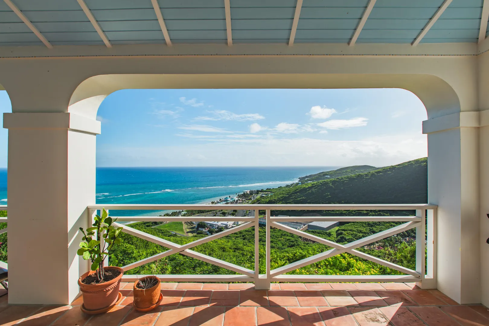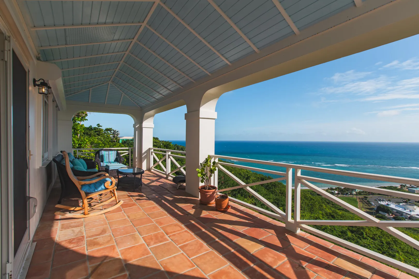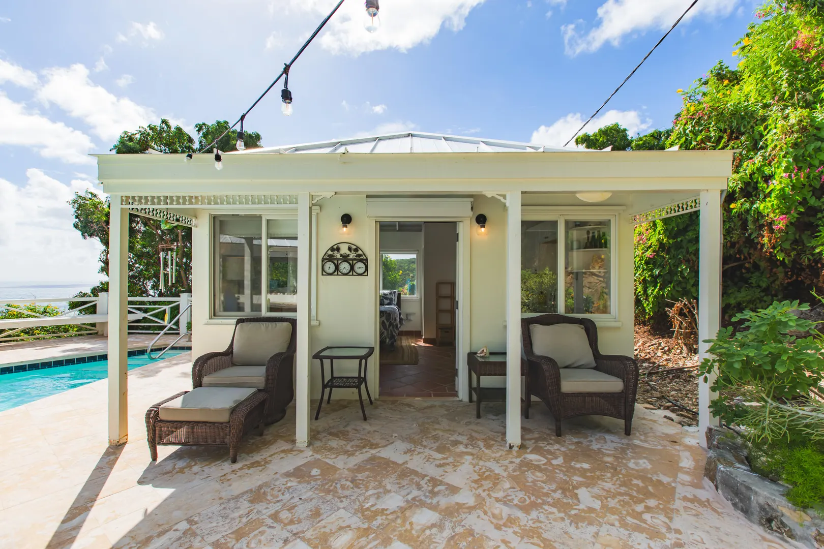 Nestled in the leafy enclave of Maggie Hill is this furnished, turn-key, 2 bedroom, 2 bath home with a pool, solar, central AC and mini splits, a studio cottage, lush landscaping and sweeping views of the South Shore. Gorgeous ocean blues fill the open floor plan through huge windows that line the entire southern exposure of the home. A terraced front yard filled with trees, perfect for dogs - the entire property has been fully fenced. Meticulously maintained....the Sellers have completed a multitude of improvements in the short time, they have owned the property - a full list of improvements is in the documents section. Perfect as a first or second home or turnkey vacation rental! (continued)The kitchen features new appliances, new backsplash tile, granite countertops, a separate wine fridge and a large pantry. The kitchen has a west facing door for easy access to the pool and grill when entertaining. The dining table with upholstered bench provides for comfy and relaxing meals while starring out at the ocean. There is enough seating for more than 10 people comfortably at this window seat bench/dining area. There are many areas to lounge in this home. The spacious covered deck off the two living rooms has lots of cozy seating for ocean gazing or watching the activity down at Divi. The second living room leads to two bedrooms, both with their own bathroom. The primary bedroom has a large seating area, its own exit to the driveway, a walk-in closet and a dressing room between the ensuite bathroom and closet -any clotheshorse dream come true. The guest bathroom has been redone.