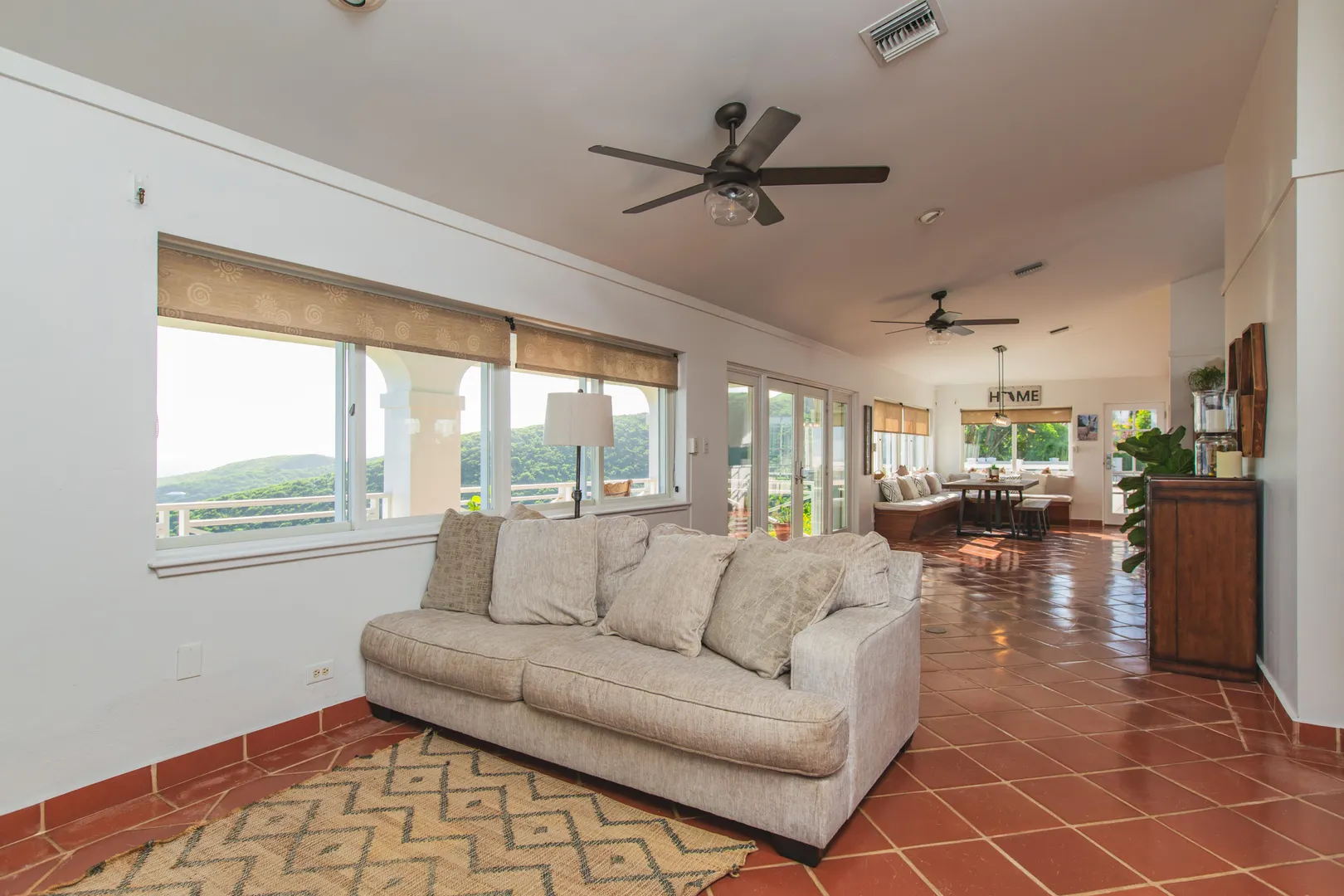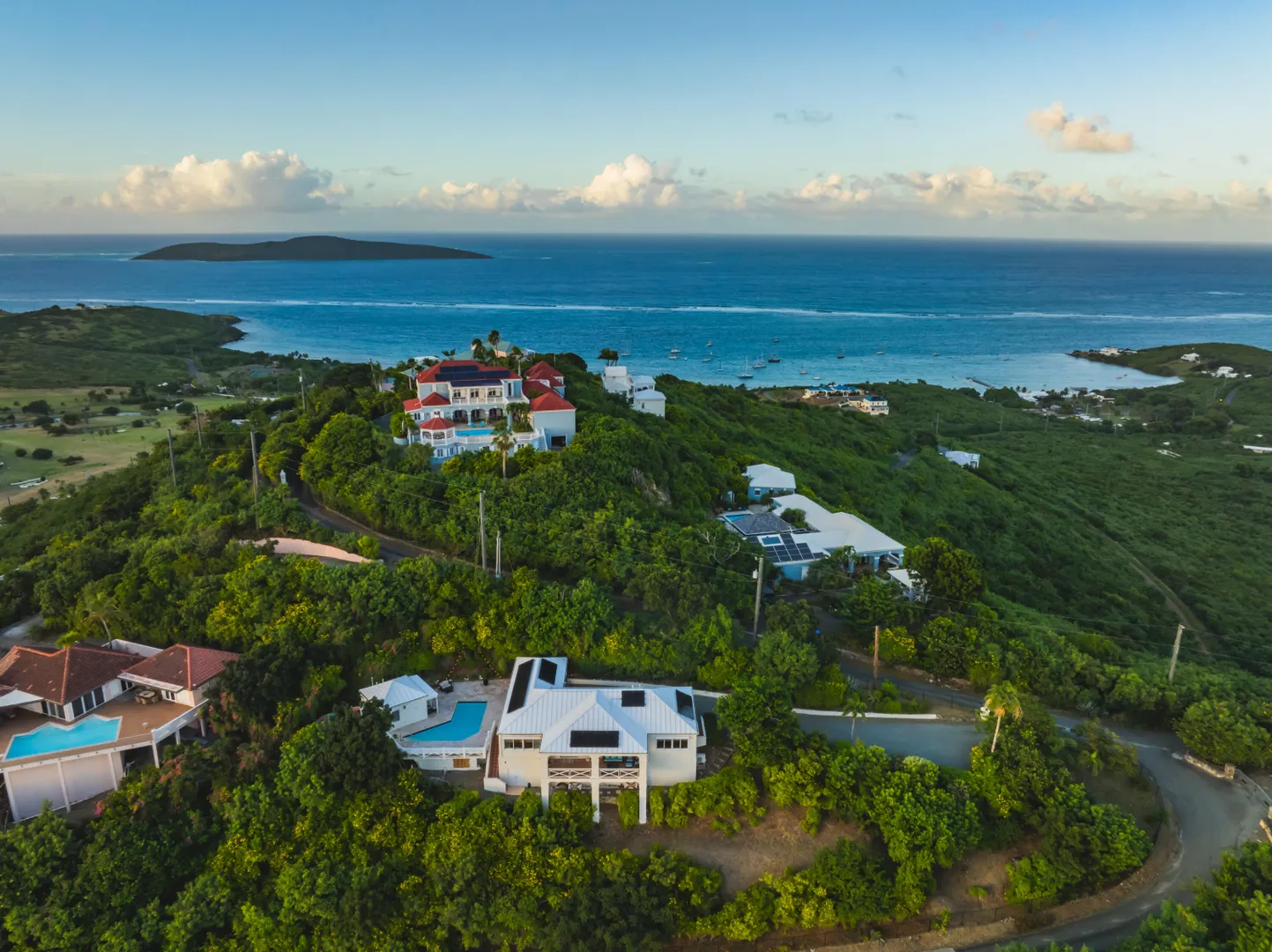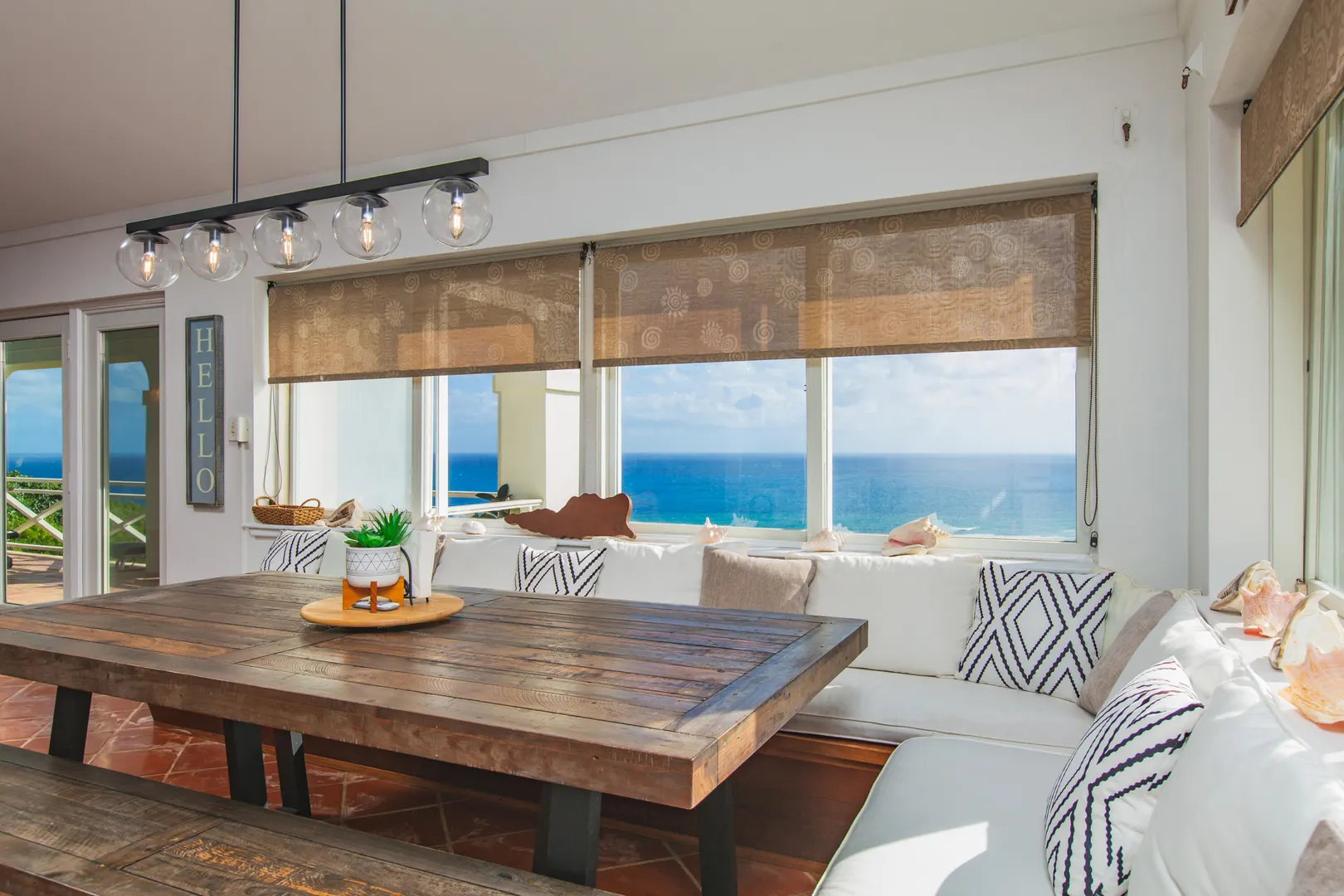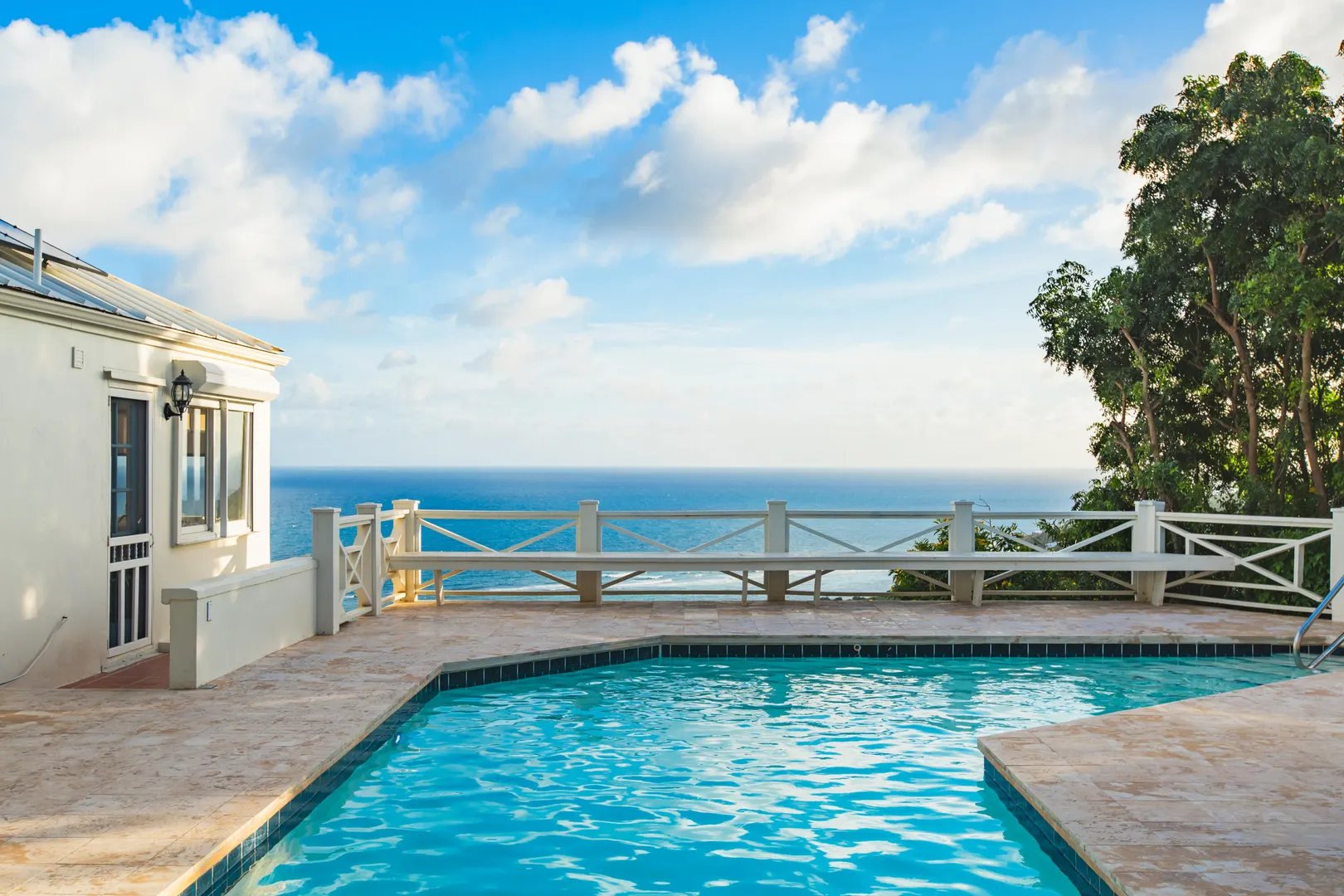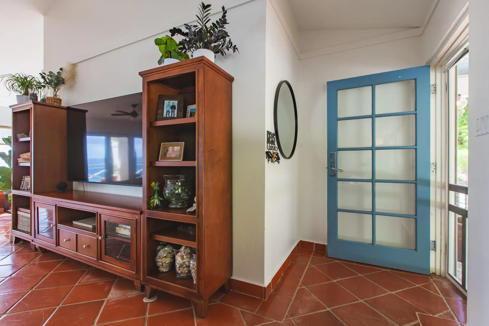 Nestled in the leafy enclave of Maggie Hill is this furnished, turn-key, 2 bedroom, 2 bath home with a pool, solar, central AC and mini splits, a studio cottage, lush landscaping and sweeping views of the South Shore. Gorgeous ocean blues fill the open floor plan through huge windows that line the entire southern exposure of the home. A terraced front yard filled with trees, perfect for dogs - the entire property has been fully fenced. Meticulously maintained....the Sellers have completed a multitude of improvements in the short time, they have owned the property - a full list of improvements is in the documents section. Perfect as a first or second home or turnkey vacation rental! (continued)The kitchen features new appliances, new backsplash tile, granite countertops, a separate wine fridge and a large pantry. The kitchen has a west facing door for easy access to the pool and grill when entertaining. The dining table with upholstered bench provides for comfy and relaxing meals while starring out at the ocean. There is enough seating for more than 10 people comfortably at this window seat bench/dining area. There are many areas to lounge in this home. The spacious covered deck off the two living rooms has lots of cozy seating for ocean gazing or watching the activity down at Divi. The second living room leads to two bedrooms, both with their own bathroom. The primary bedroom has a large seating area, its own exit to the driveway, a walk-in closet and a dressing room between the ensuite bathroom and closet -any clotheshorse dream come true. The guest bathroom has been redone.