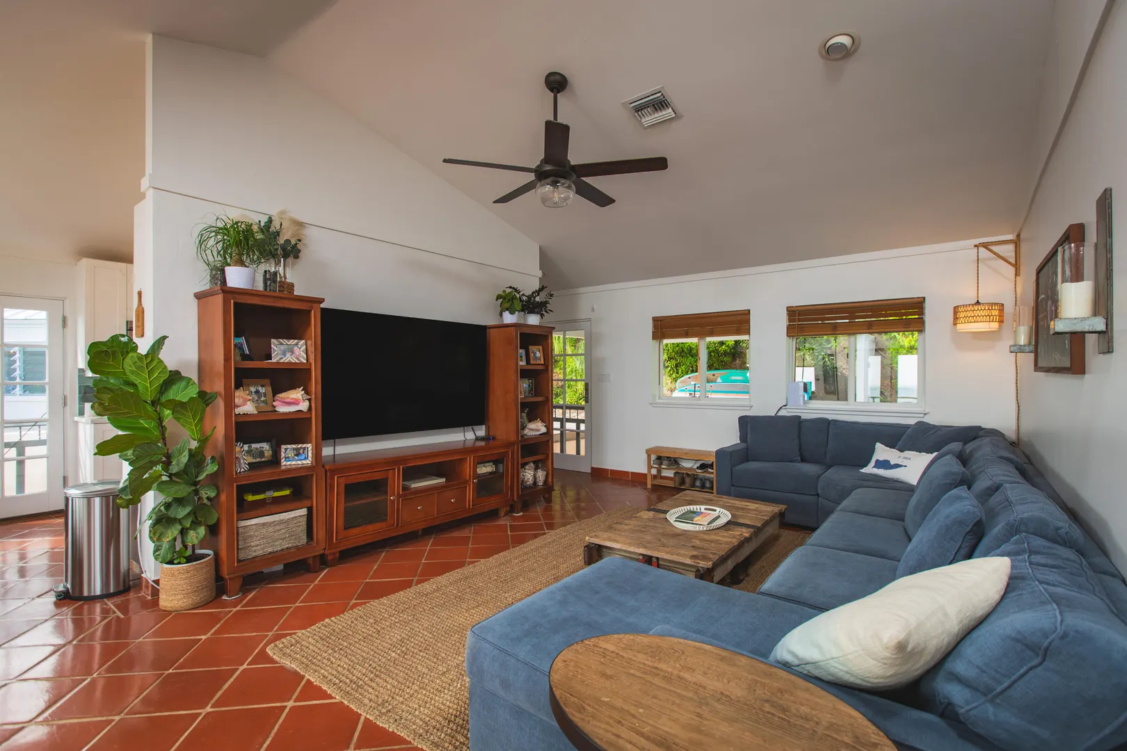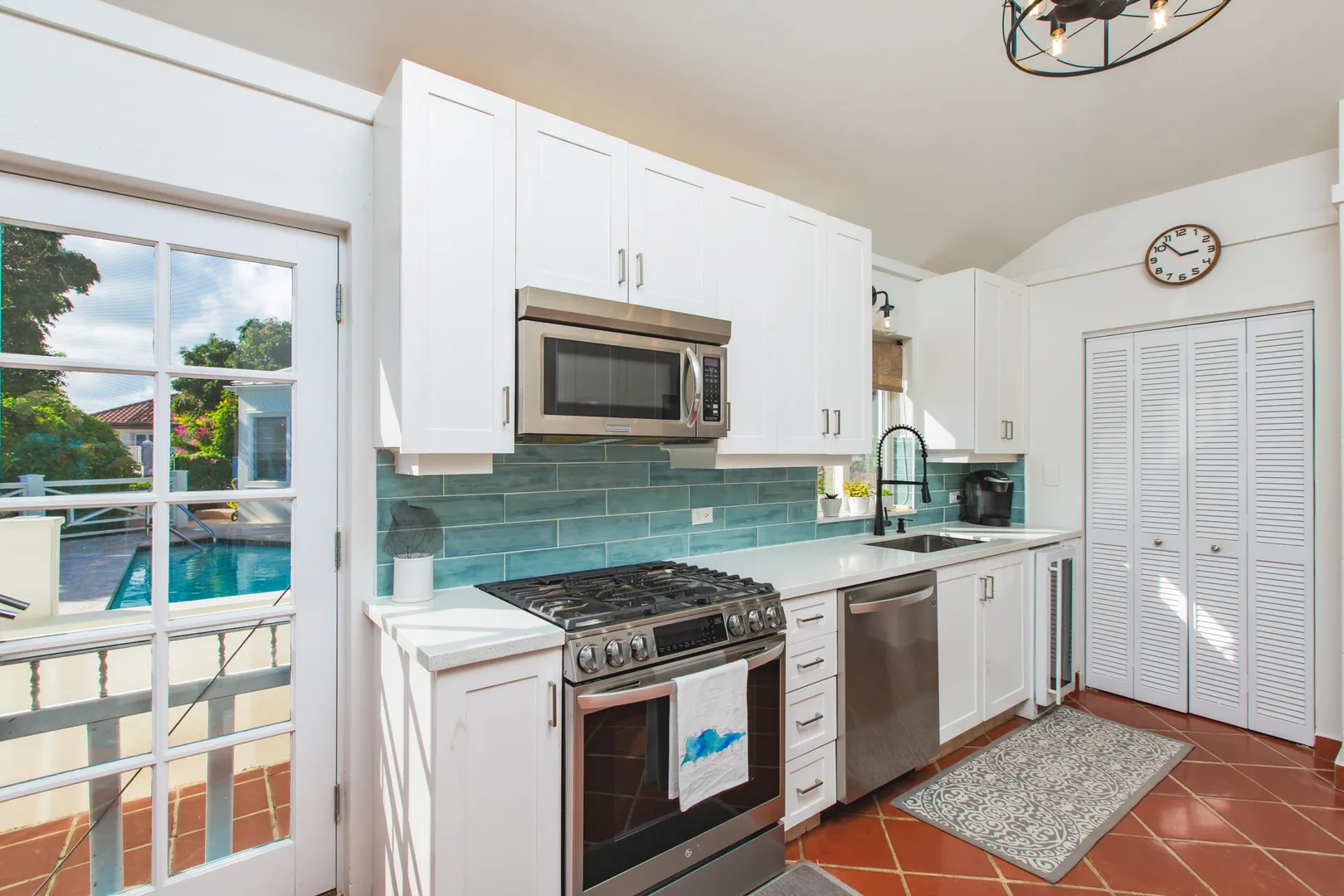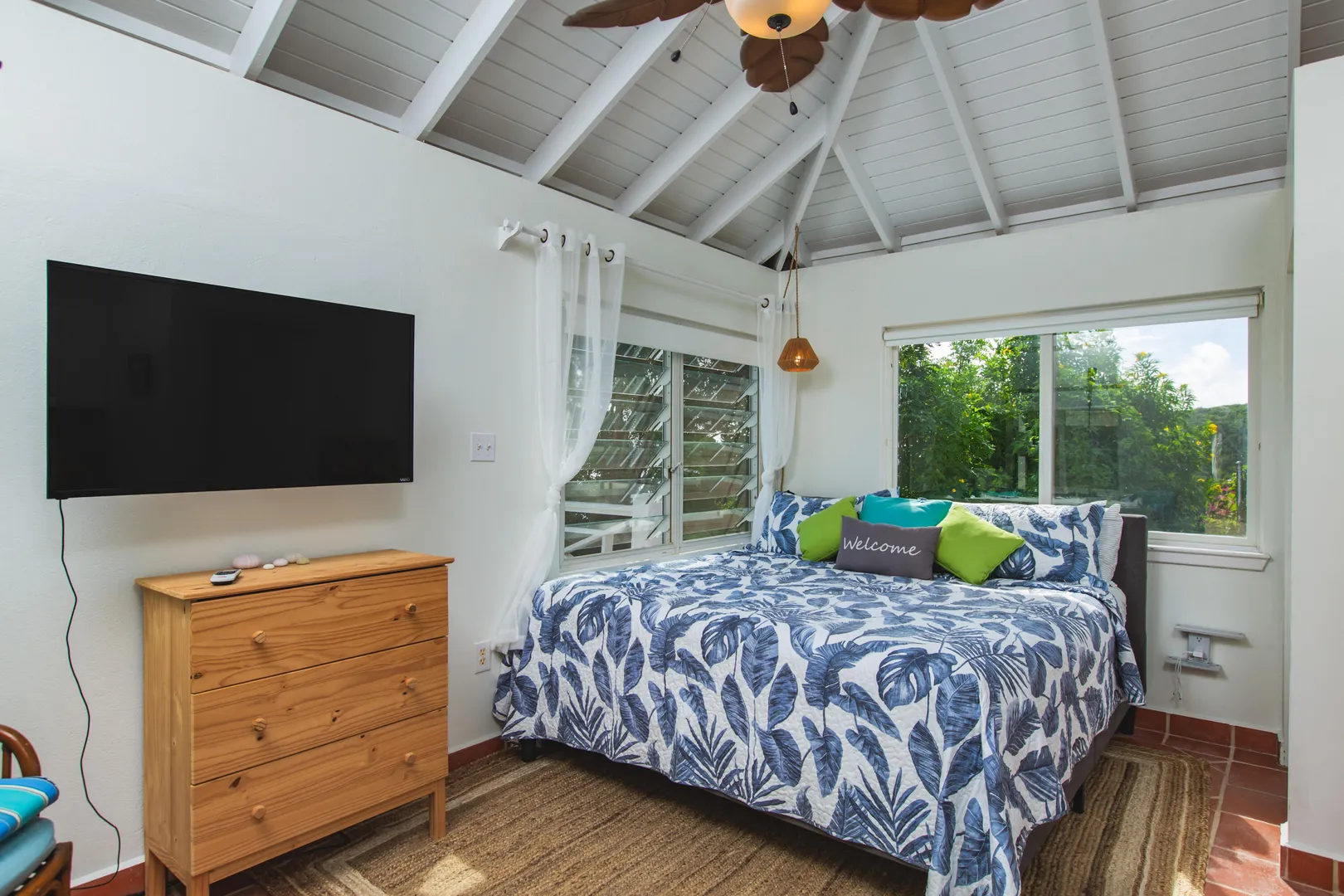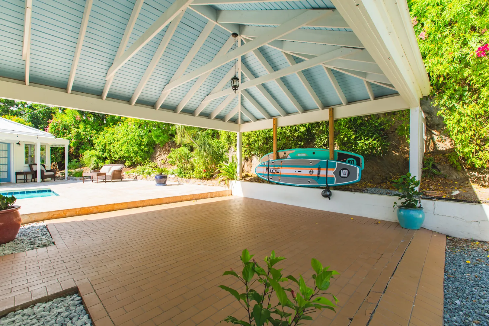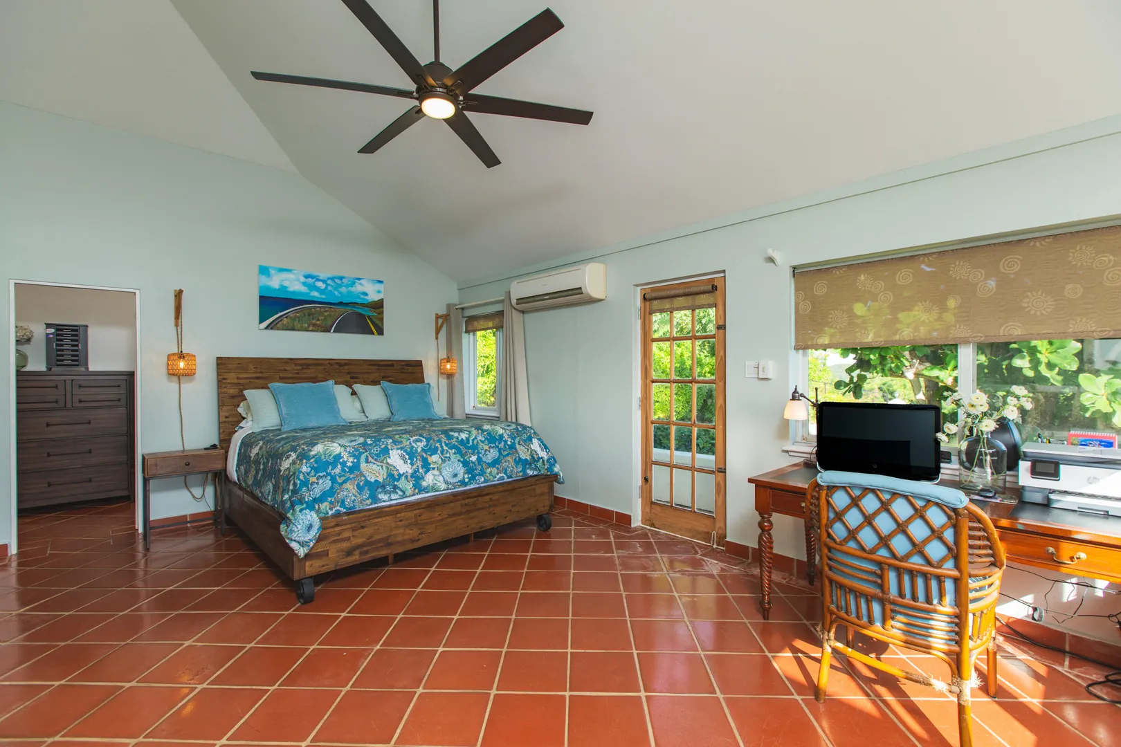 Nestled in the leafy enclave of Maggie Hill is this furnished, turn-key, 2 bedroom, 2 bath home with a pool, solar, central AC and mini splits, a studio cottage, lush landscaping and sweeping views of the South Shore. Gorgeous ocean blues fill the open floor plan through huge windows that line the entire southern exposure of the home. A terraced front yard filled with trees, perfect for dogs - the entire property has been fully fenced. Meticulously maintained....the Sellers have completed a multitude of improvements in the short time, they have owned the property - a full list of improvements is in the documents section. Perfect as a first or second home or turnkey vacation rental! (continued)The kitchen features new appliances, new backsplash tile, granite countertops, a separate wine fridge and a large pantry. The kitchen has a west facing door for easy access to the pool and grill when entertaining. The dining table with upholstered bench provides for comfy and relaxing meals while starring out at the ocean. There is enough seating for more than 10 people comfortably at this window seat bench/dining area. There are many areas to lounge in this home. The spacious covered deck off the two living rooms has lots of cozy seating for ocean gazing or watching the activity down at Divi. The second living room leads to two bedrooms, both with their own bathroom. The primary bedroom has a large seating area, its own exit to the driveway, a walk-in closet and a dressing room between the ensuite bathroom and closet -any clotheshorse dream come true. The guest bathroom has been redone.