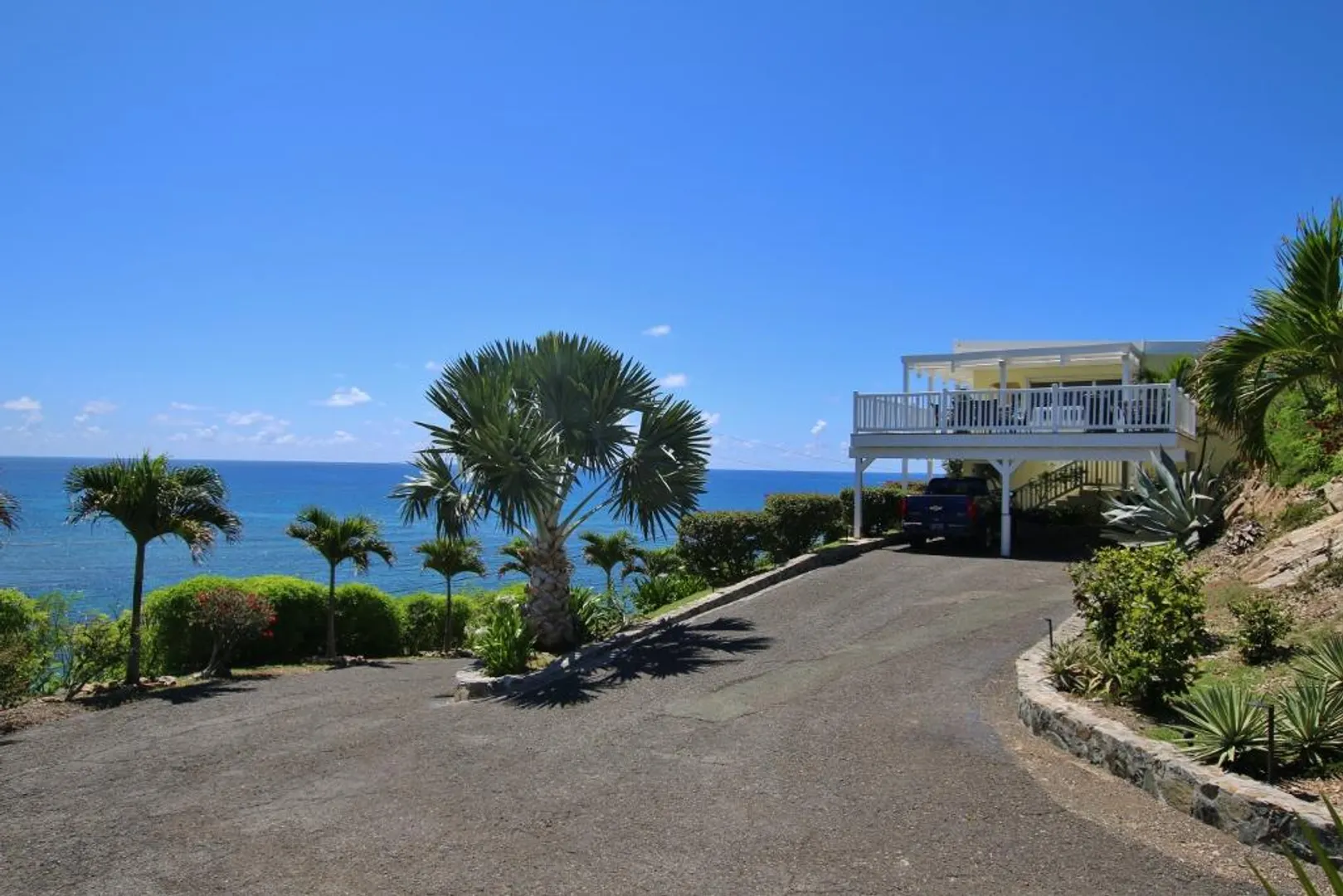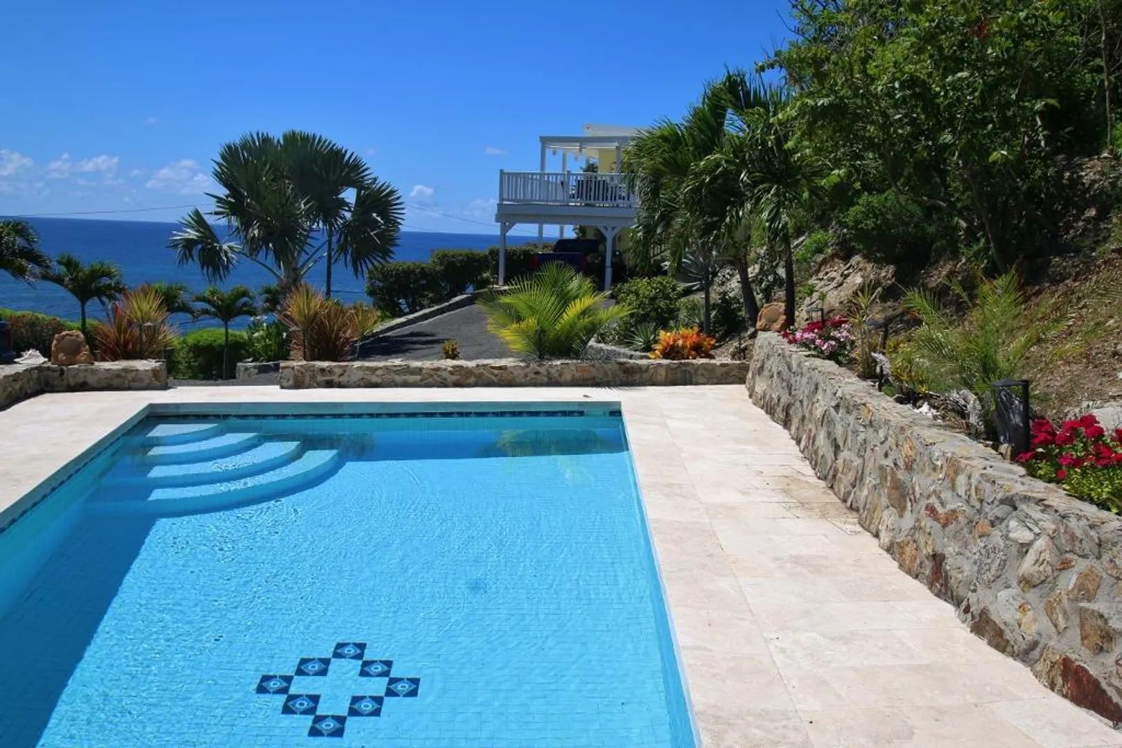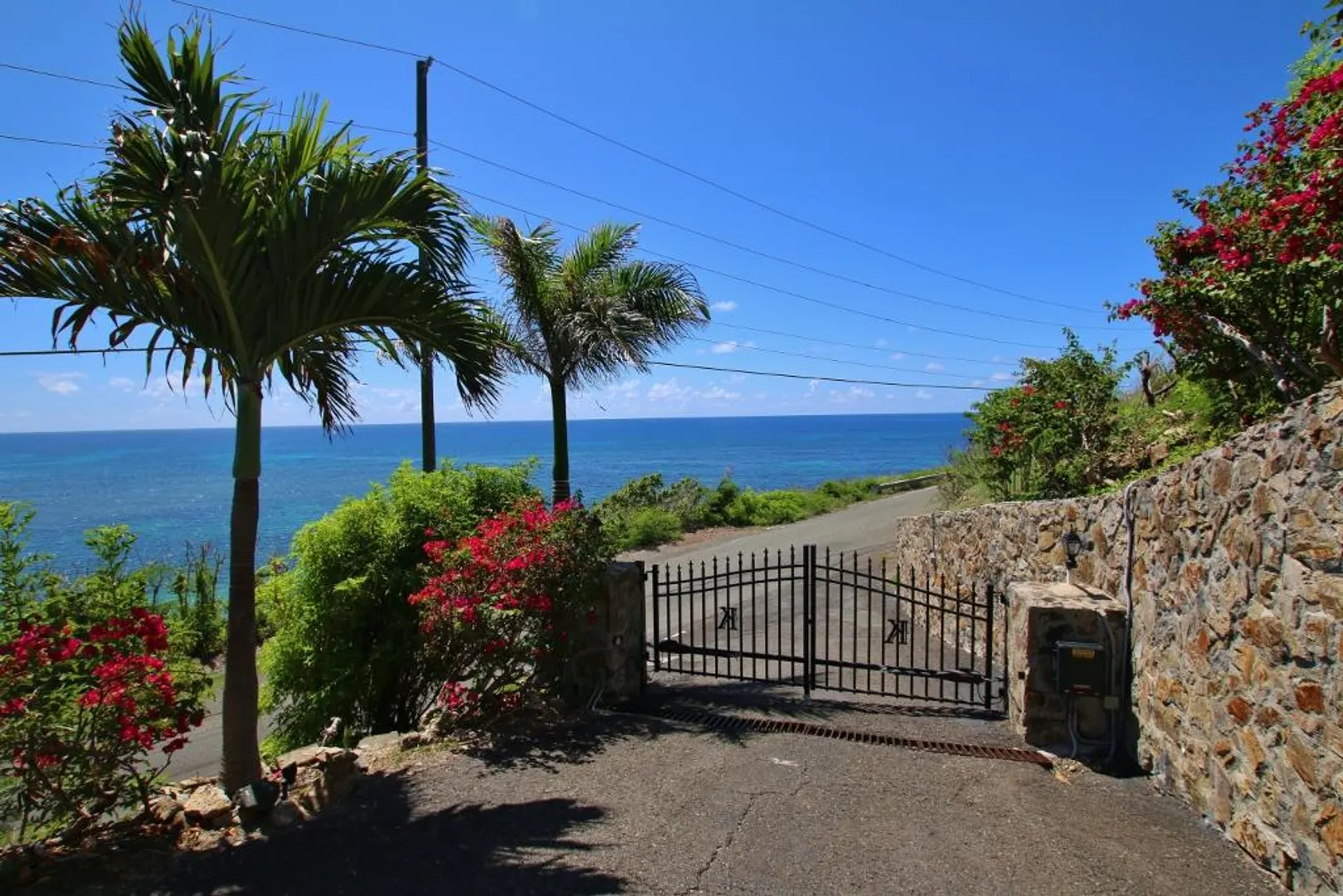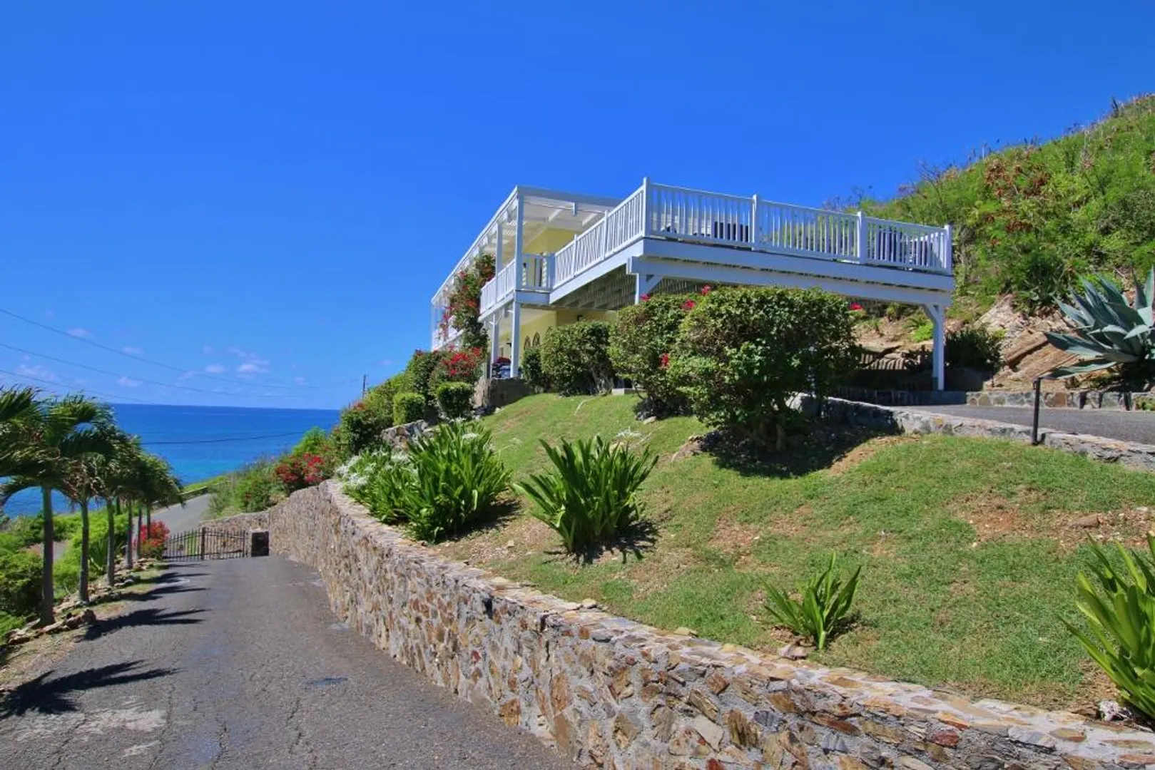 Sweet 2/2 home overlooking Grapetree Beach with a spacious 1 bedroom apartment below. Both have great views! Kitchens and 1 bath remodeled. Nice pool area with gazebo. Walk to the beach! Gated and nicely landscaped. Totally Solar (6000 watts) with 24 KW battery backup. New gas appliances. Workshop. Furnished.