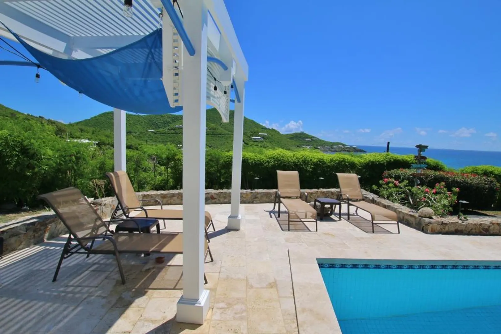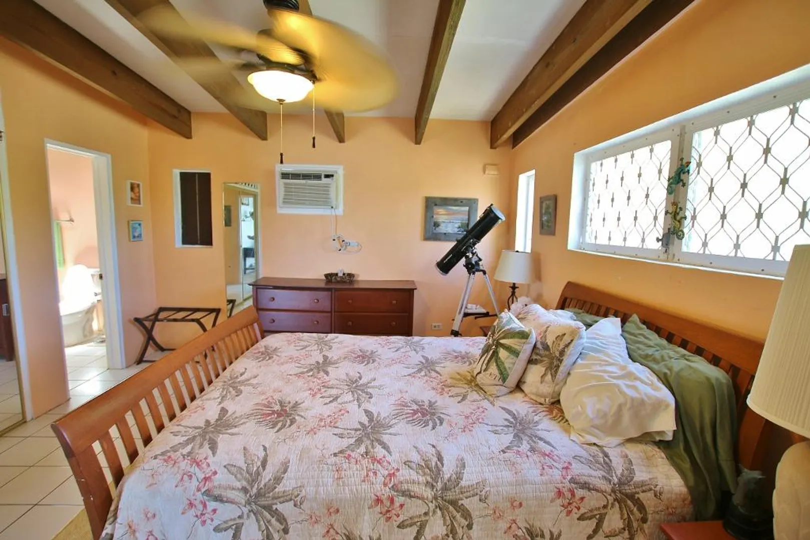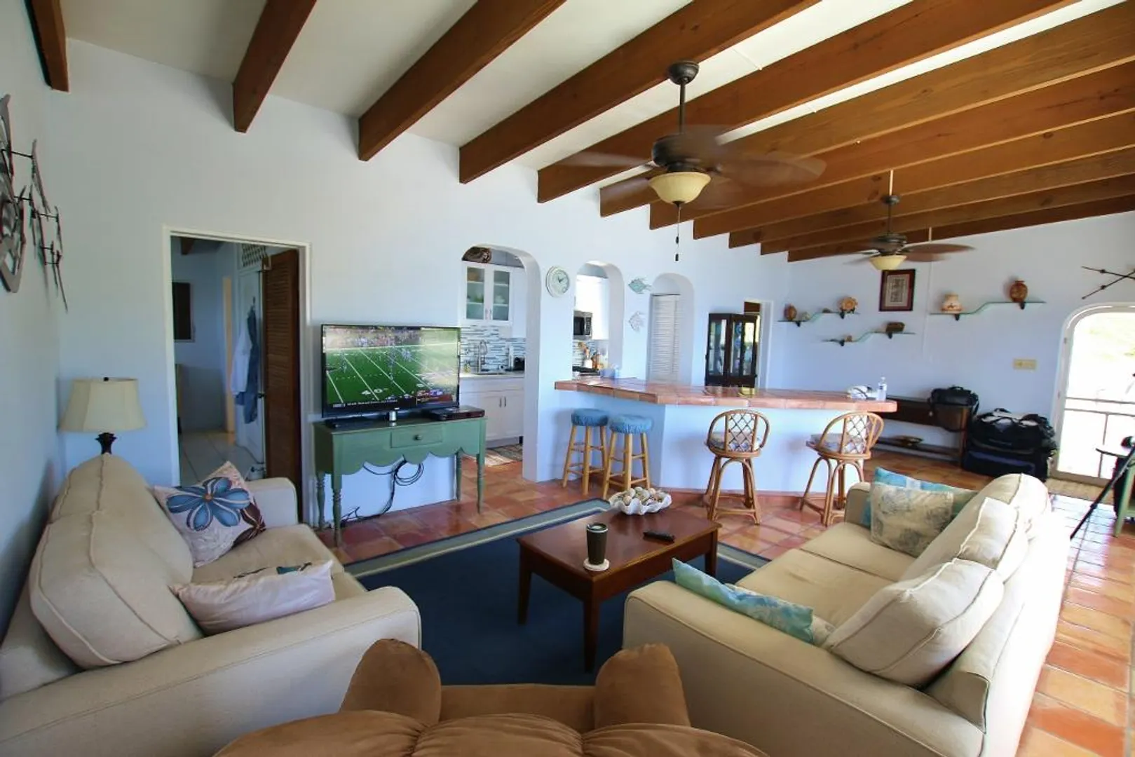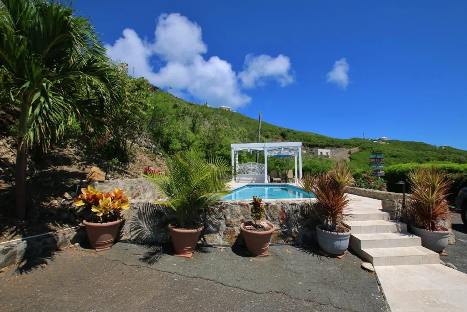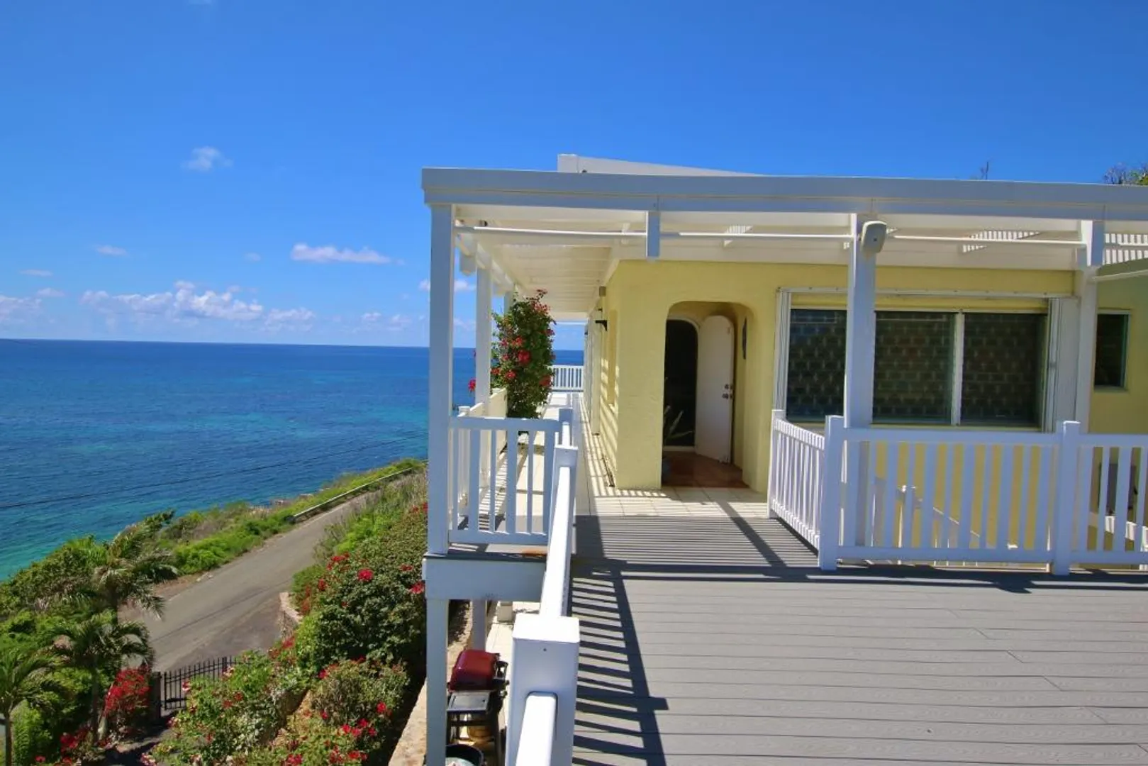 Sweet 2/2 home overlooking Grapetree Beach with a spacious 1 bedroom apartment below. Both have great views! Kitchens and 1 bath remodeled. Nice pool area with gazebo. Walk to the beach! Gated and nicely landscaped. Totally Solar (6000 watts) with 24 KW battery backup. New gas appliances. Workshop. Furnished.