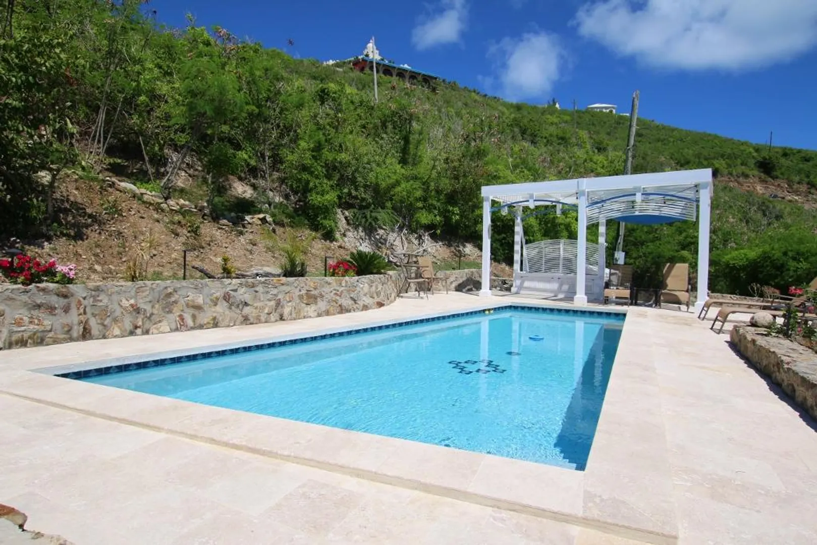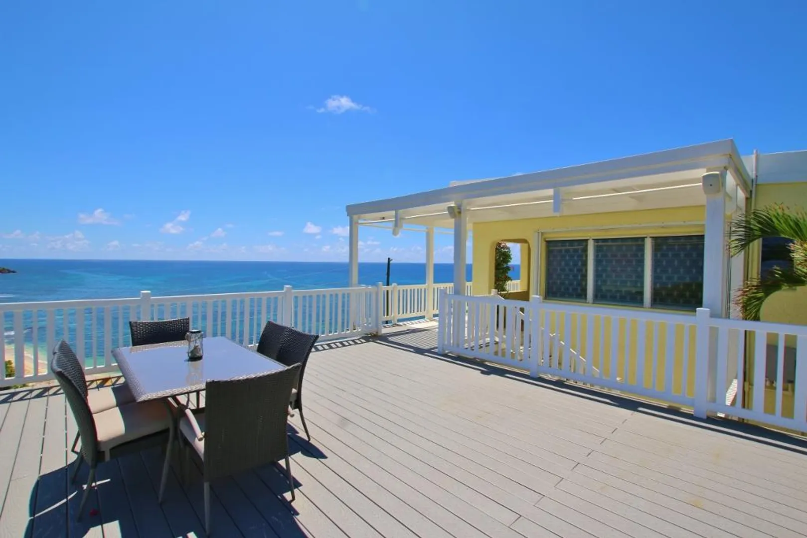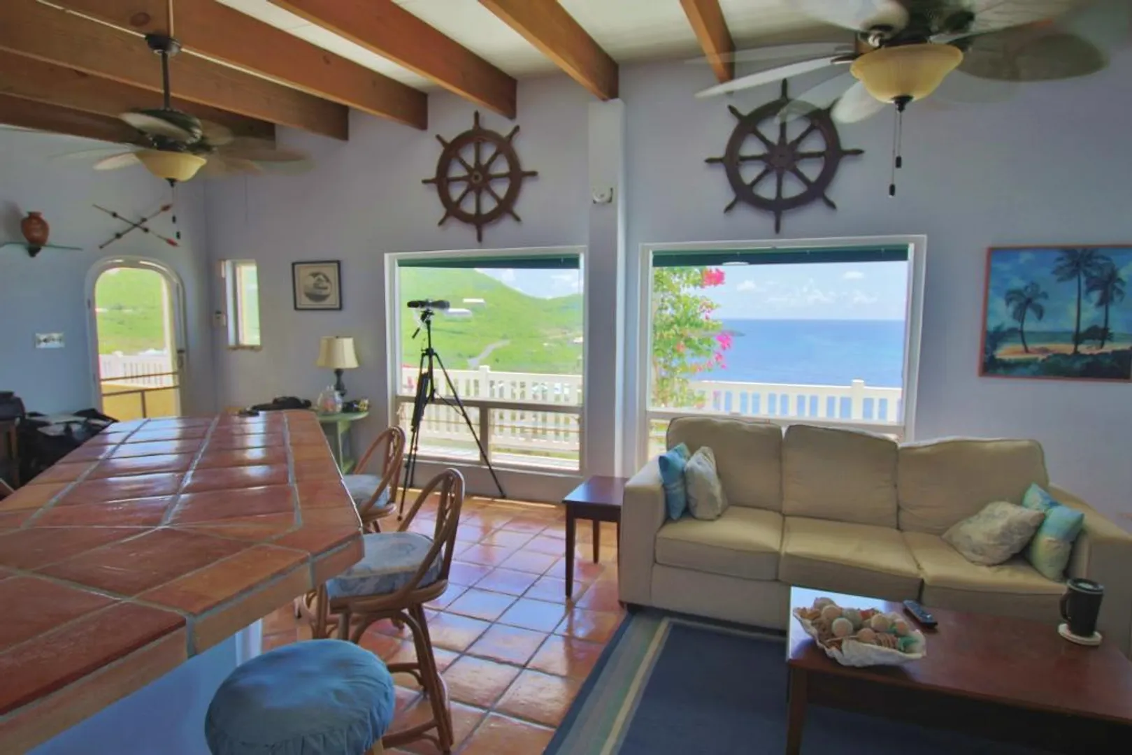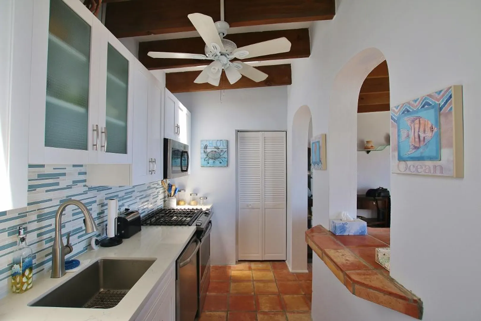 Sweet 2/2 home overlooking Grapetree Beach with a spacious 1 bedroom apartment below. Both have great views! Kitchens and 1 bath remodeled. Nice pool area with gazebo. Walk to the beach! Gated and nicely landscaped. Totally Solar (6000 watts) with 24 KW battery backup. New gas appliances. Workshop. Furnished.