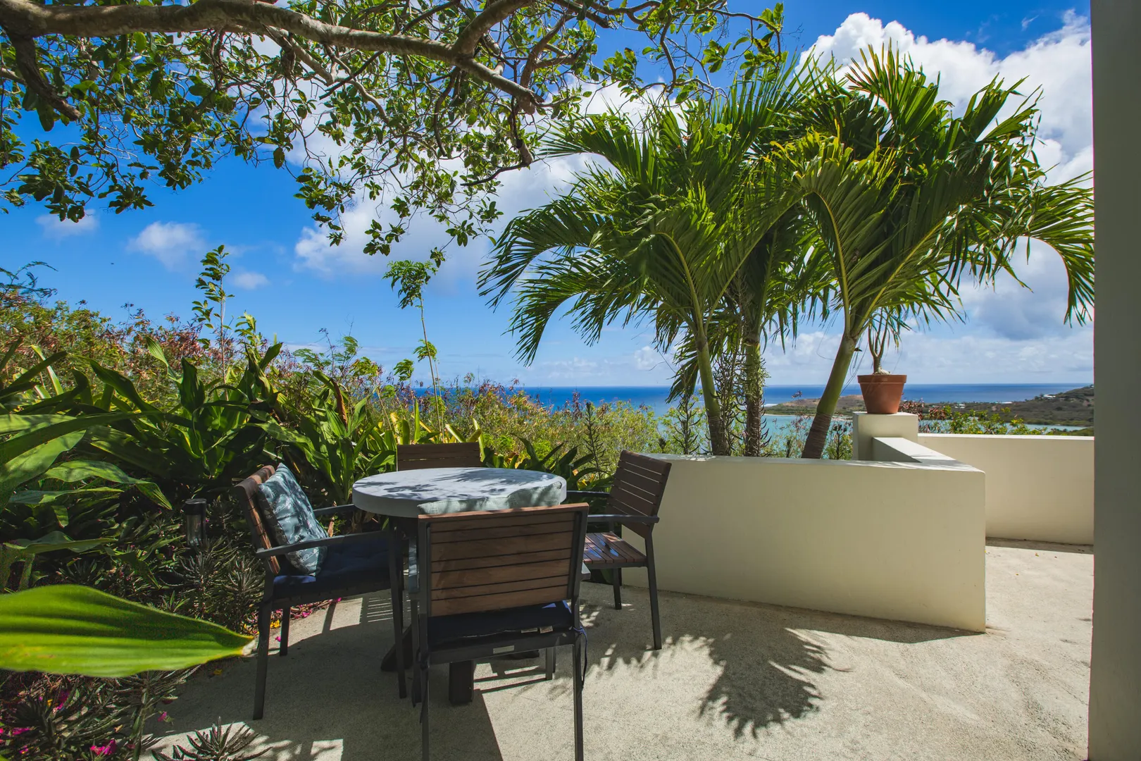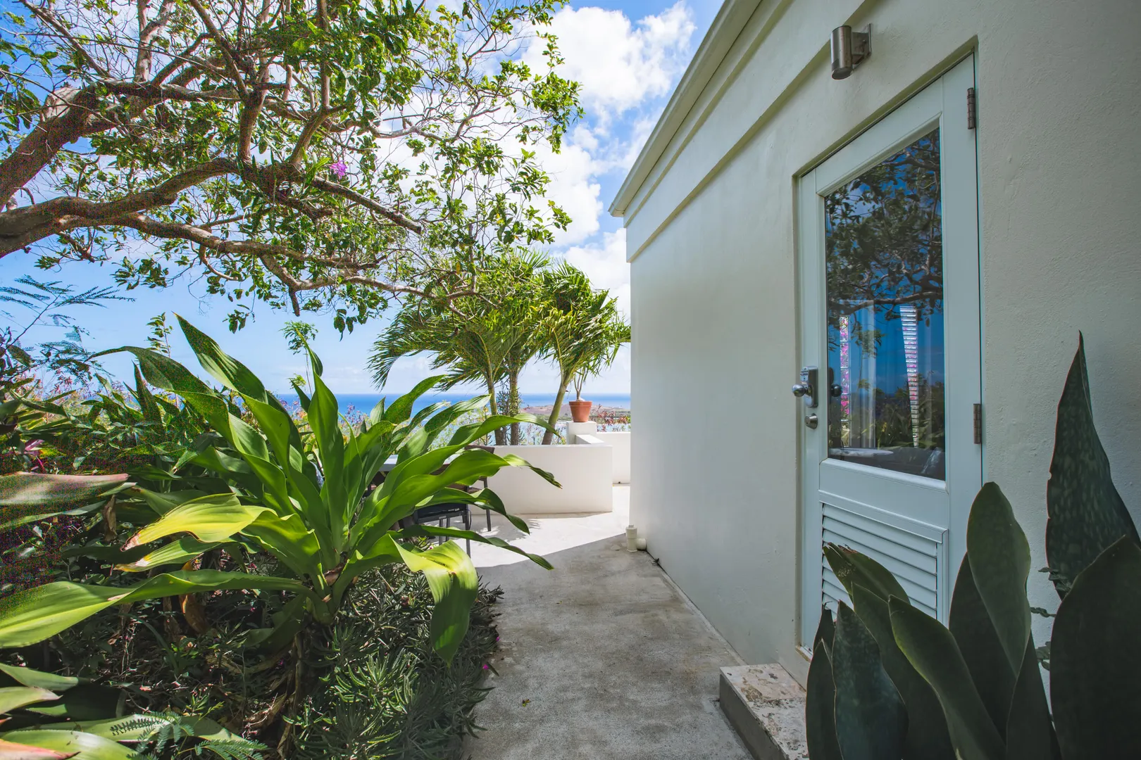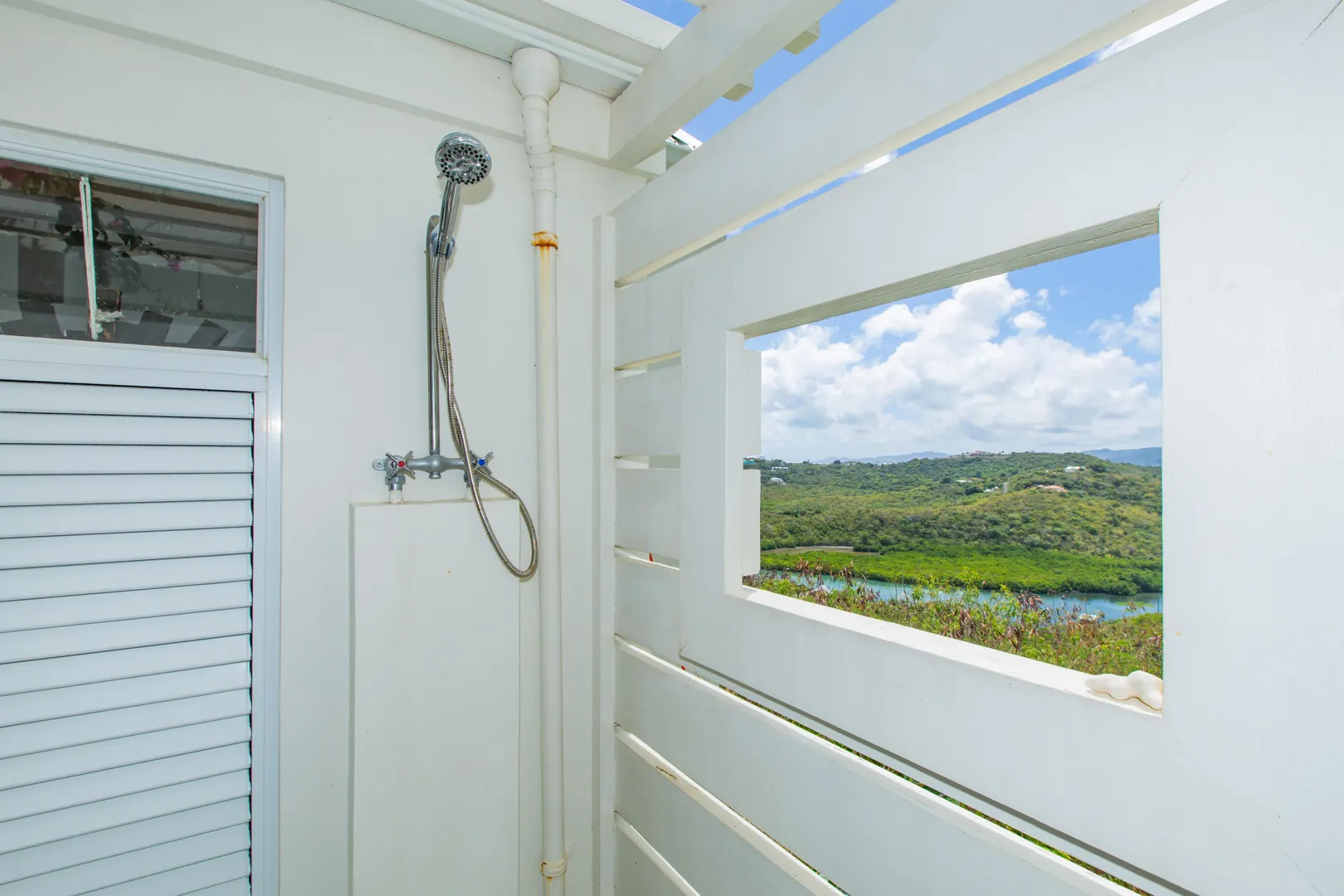 The Morning Star Cottage features panoramic 180 views of Salt River Bay, STT, and Columbus Landing and upscale finishes. Perfectly situated for privacy this studio cottage feels like boutique resort retreat. Imagine coming home each day and being welcomed via a lit, tropical tree-lined walkway leading to a tranquil setting featuring a goldfish pond with a fountain, private outdoor dining and lounging areas, and a spa-style bathroom with an outdoor shower window facing the Morning Star enclave. The cottage has keyless entry, a kitchenette, travertine floors, custom built-ins, upscale island-inspired furnishings, and private parking. Zoned R-1. It is a perfect vacation rental investment property. Schedule a showing today.