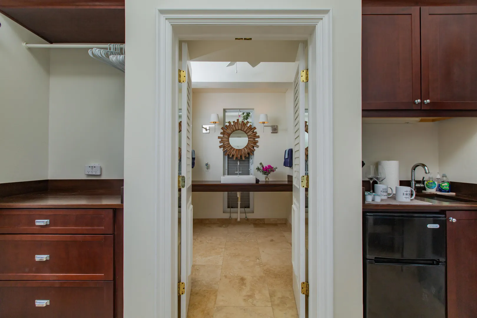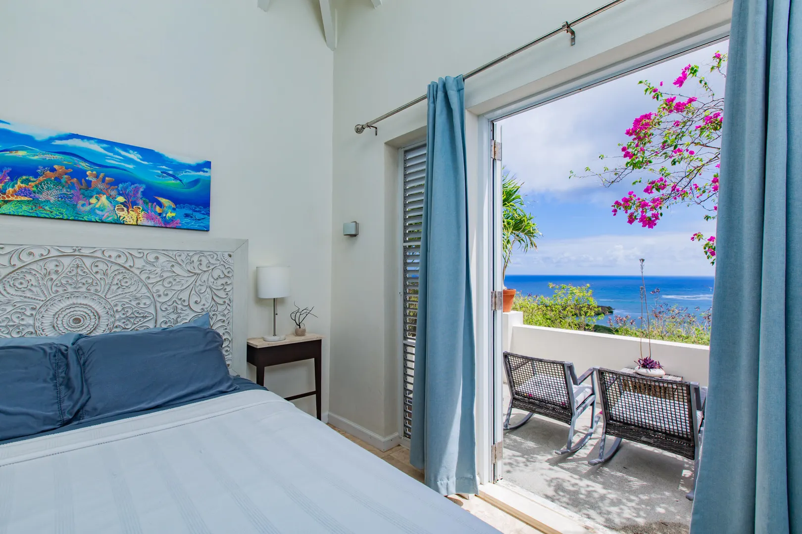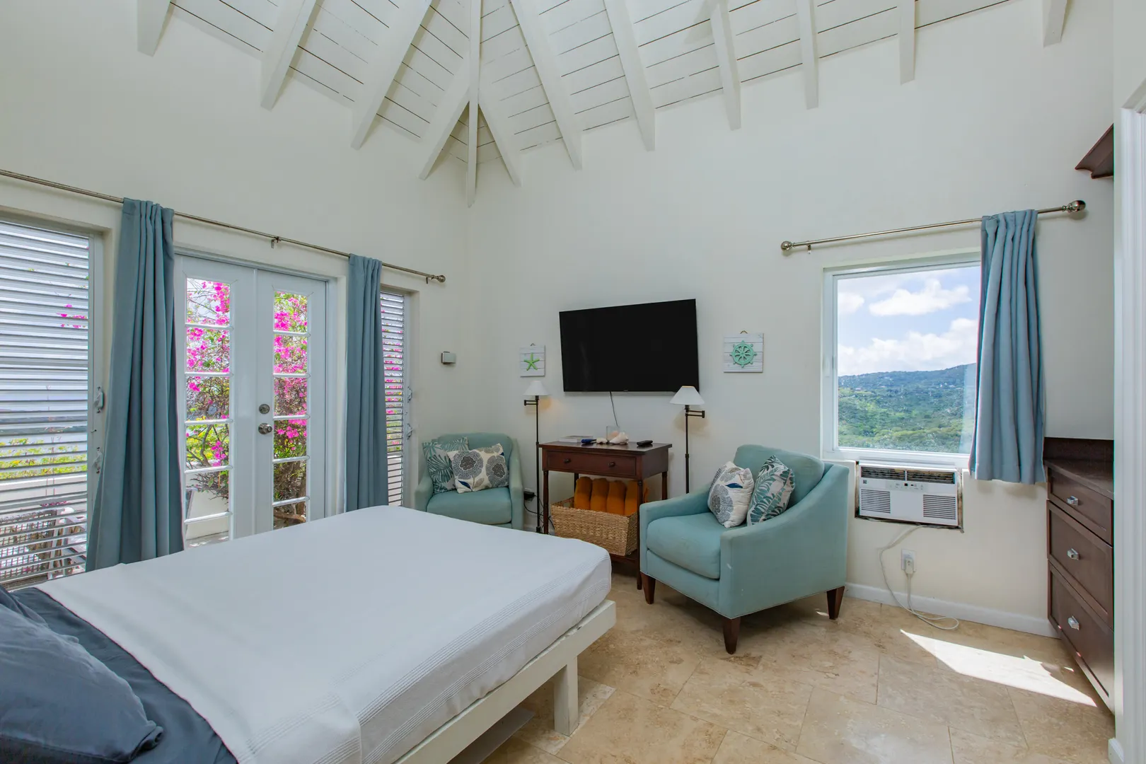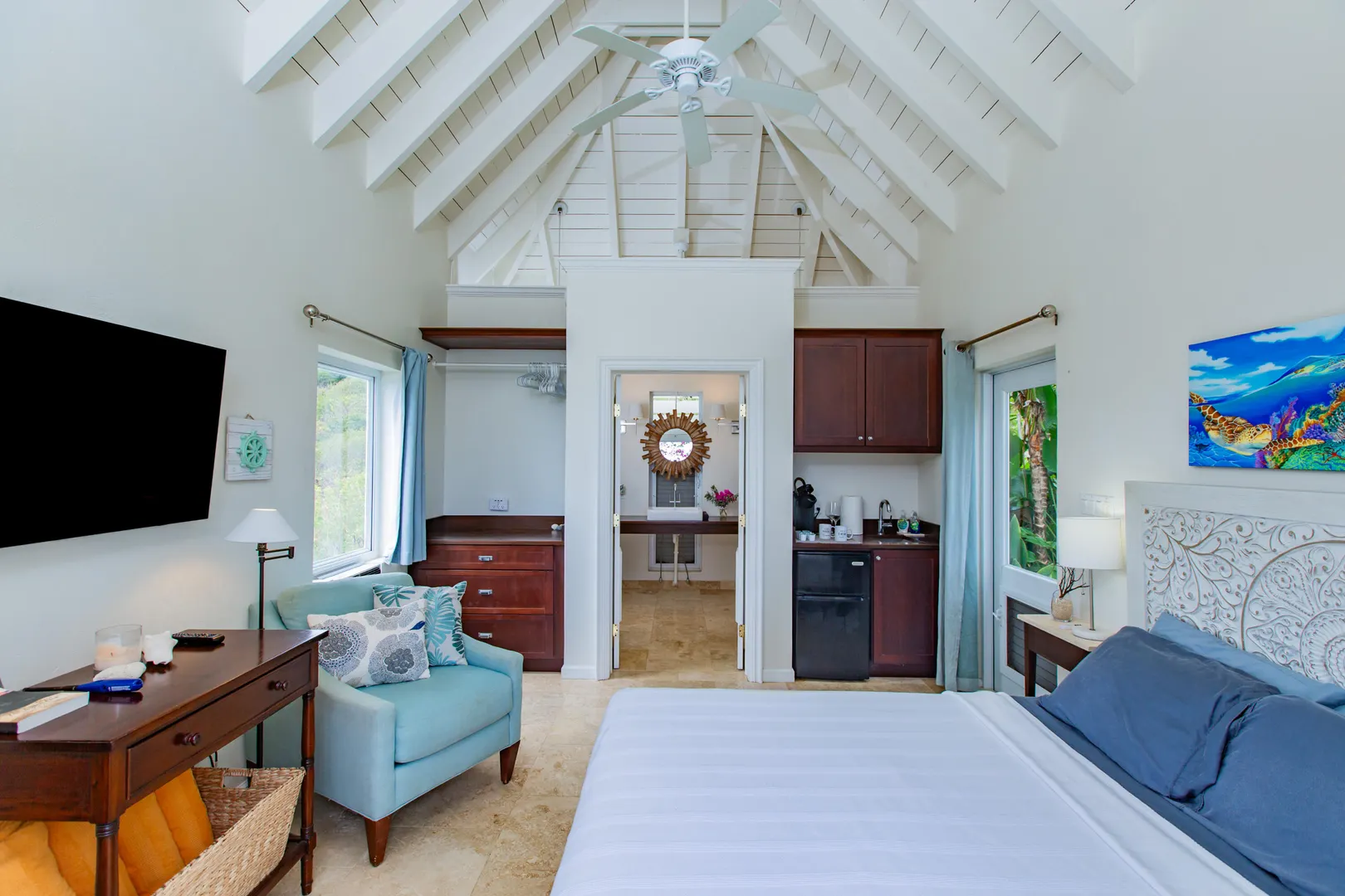 The Morning Star Cottage features panoramic 180 views of Salt River Bay, STT, and Columbus Landing and upscale finishes. Perfectly situated for privacy this studio cottage feels like boutique resort retreat. Imagine coming home each day and being welcomed via a lit, tropical tree-lined walkway leading to a tranquil setting featuring a goldfish pond with a fountain, private outdoor dining and lounging areas, and a spa-style bathroom with an outdoor shower window facing the Morning Star enclave. The cottage has keyless entry, a kitchenette, travertine floors, custom built-ins, upscale island-inspired furnishings, and private parking. Zoned R-1. It is a perfect vacation rental investment property. Schedule a showing today.