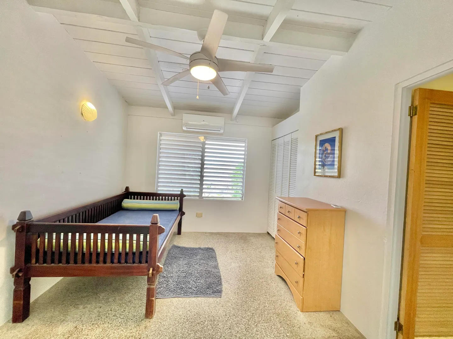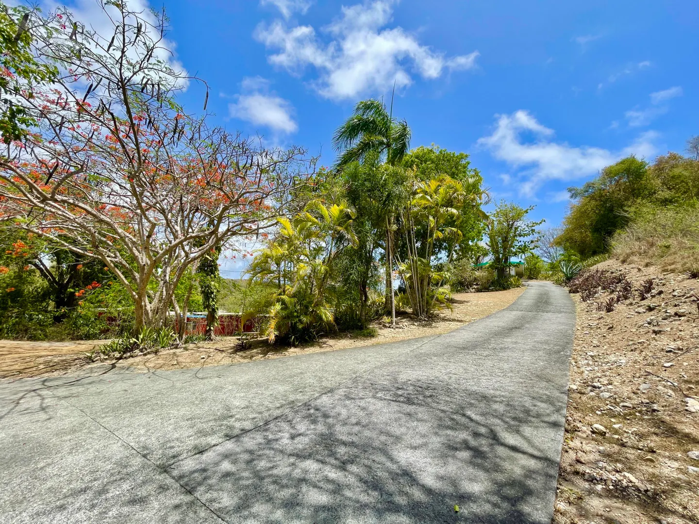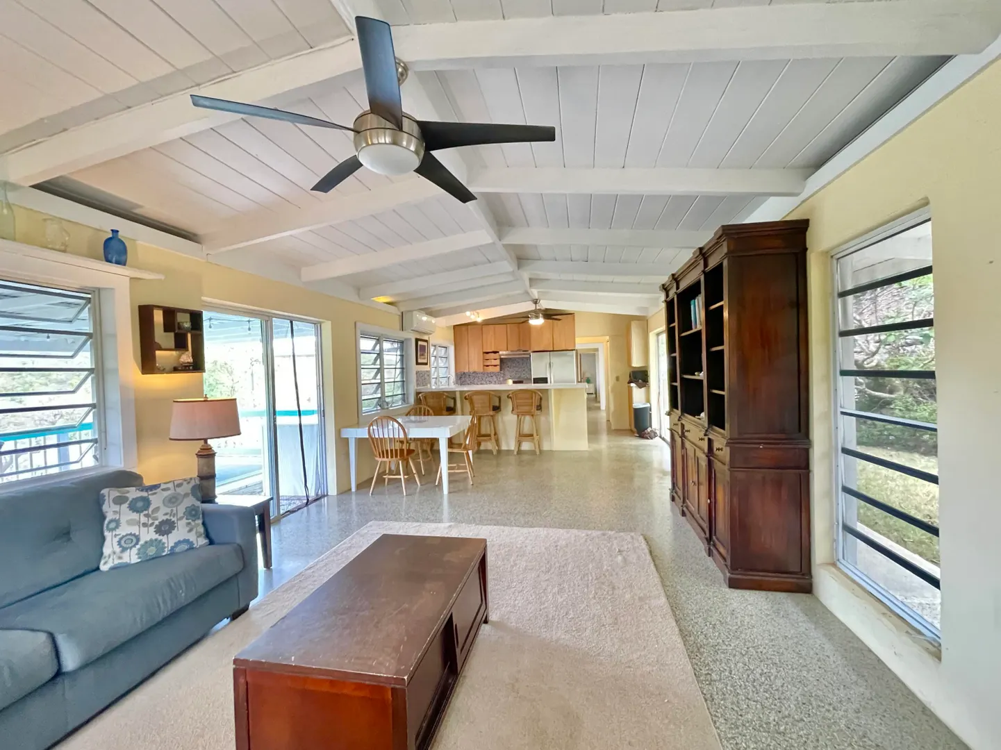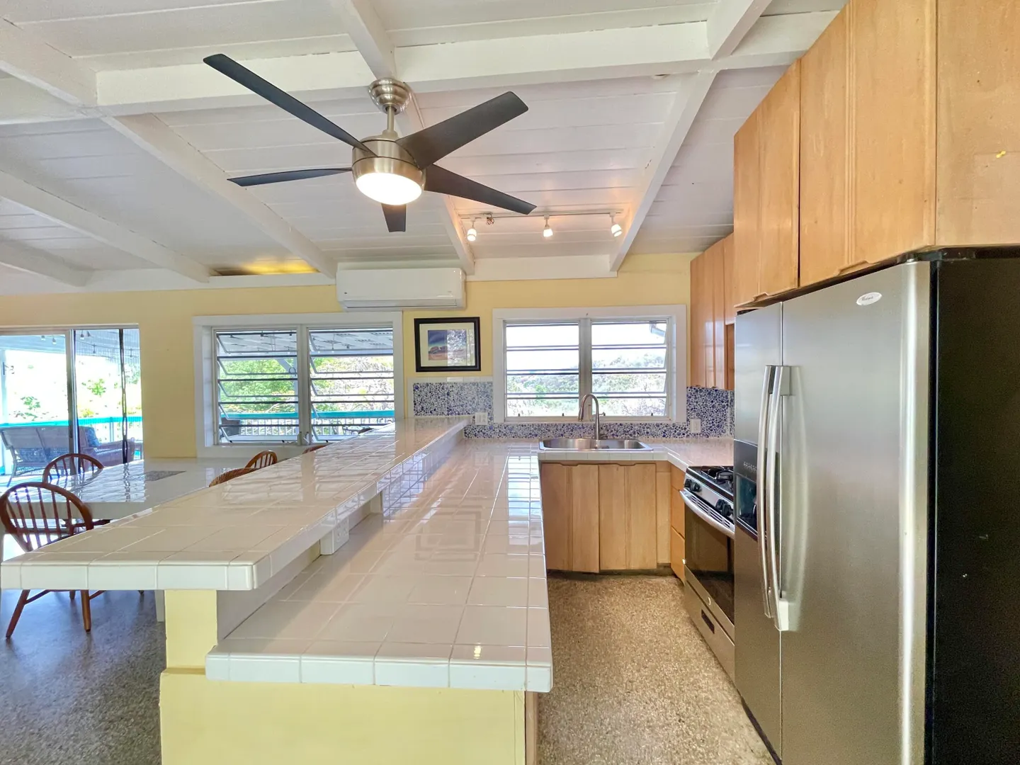 Charming three bedroom house on a 0.88 acre lot with mature landscaping including some beautiful Flamboyant trees with bright red flowers. The home is well laid out with terrazzo floors flowing throughout. The living/ kitchen area is laid out as an open space with access to the outdoor deck. The kitchen has stainless steel appliances and the countertops and backsplash was recently updated. You can enjoy the views of the green rolling hills from the outdoor covered deck, the perfect spot for a cup of coffee in the morning or dinners at night. At the far end of the house you'll find three bedrooms, all have sliding doors to provide egress and light. The house is perfect for someone wanting privacy, a place to garden and even comes with a chicken coop.