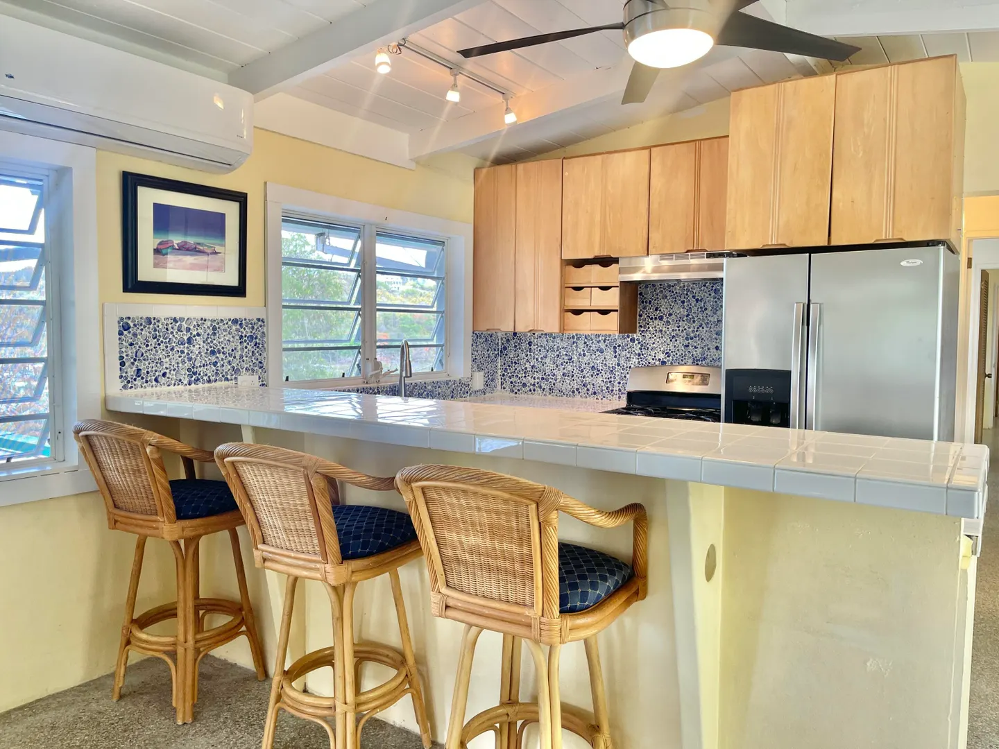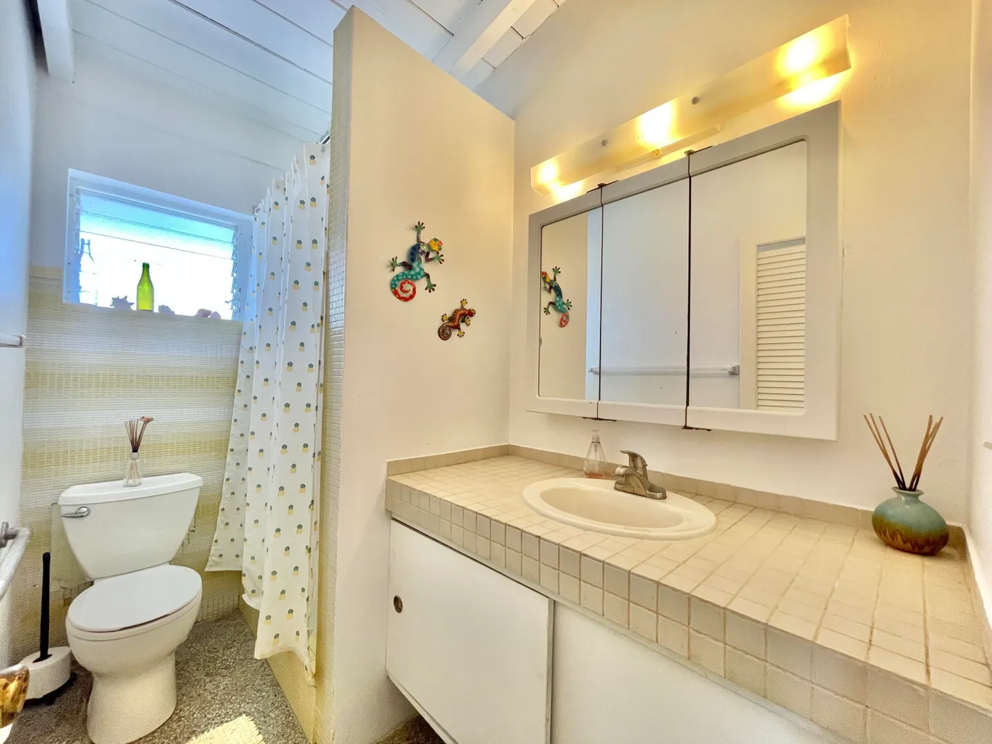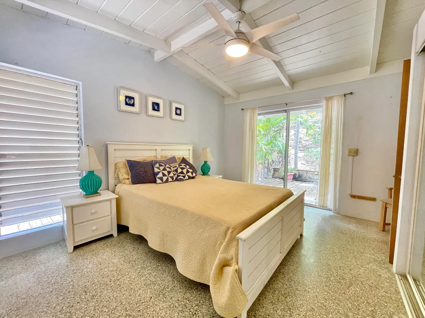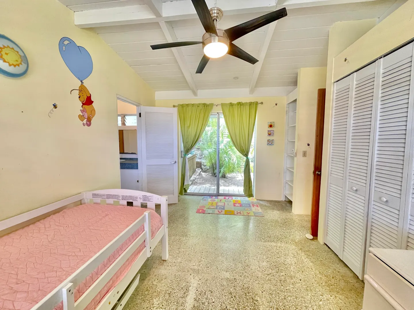 Charming three bedroom house on a 0.88 acre lot with mature landscaping including some beautiful Flamboyant trees with bright red flowers. The home is well laid out with terrazzo floors flowing throughout. The living/ kitchen area is laid out as an open space with access to the outdoor deck. The kitchen has stainless steel appliances and the countertops and backsplash was recently updated. You can enjoy the views of the green rolling hills from the outdoor covered deck, the perfect spot for a cup of coffee in the morning or dinners at night. At the far end of the house you'll find three bedrooms, all have sliding doors to provide egress and light. The house is perfect for someone wanting privacy, a place to garden and even comes with a chicken coop.