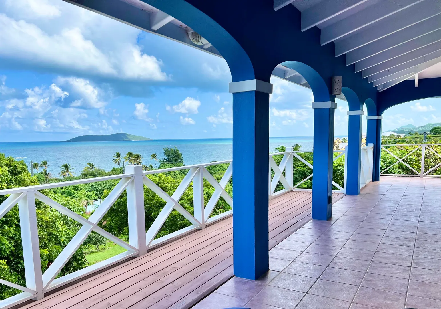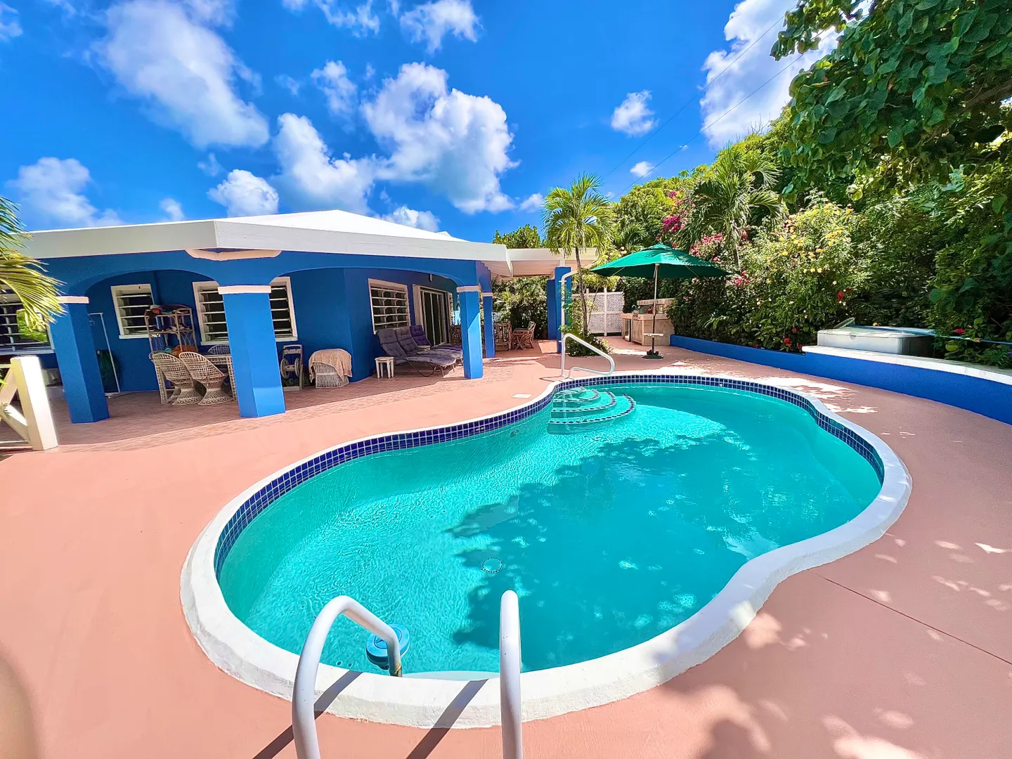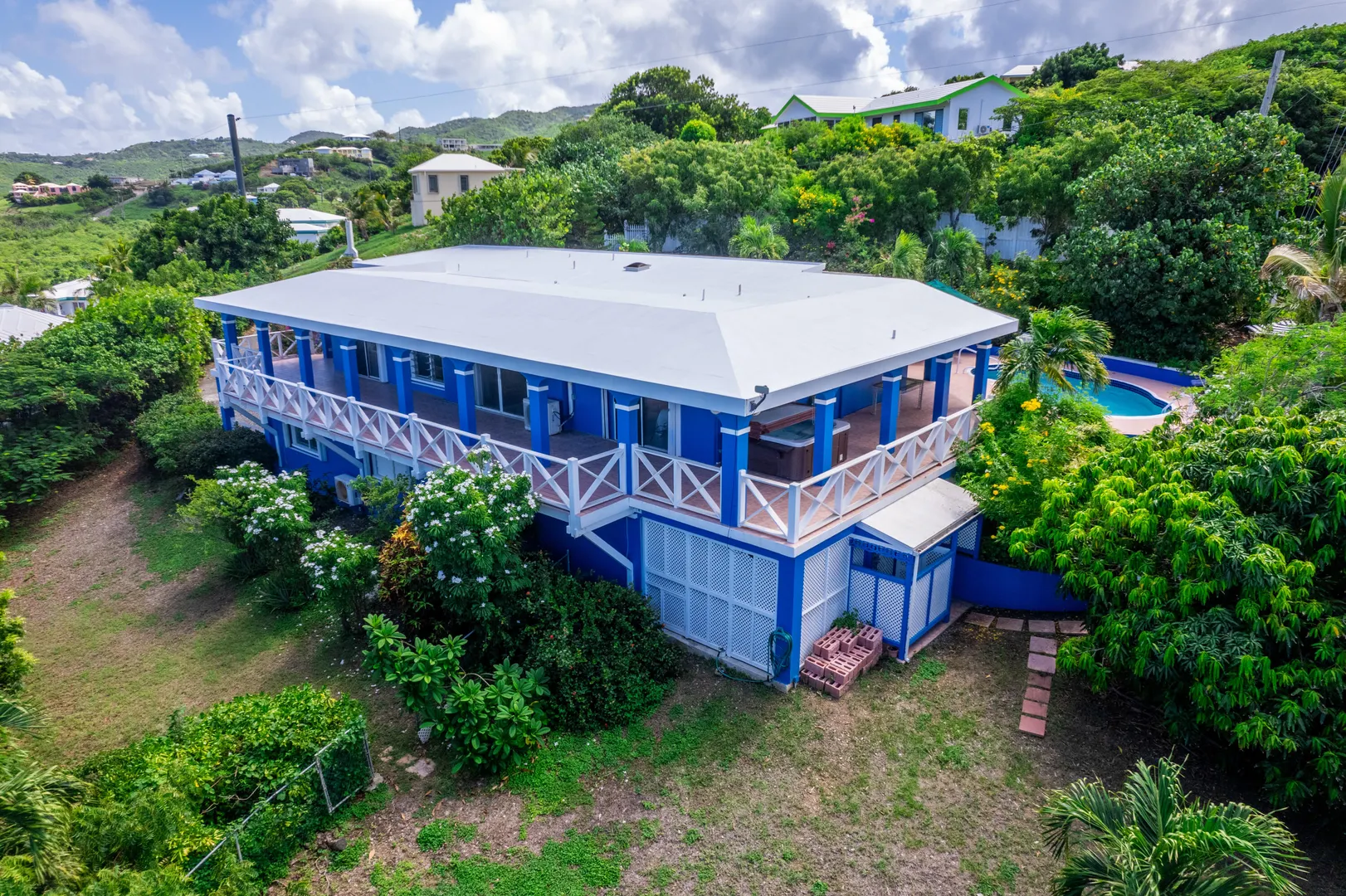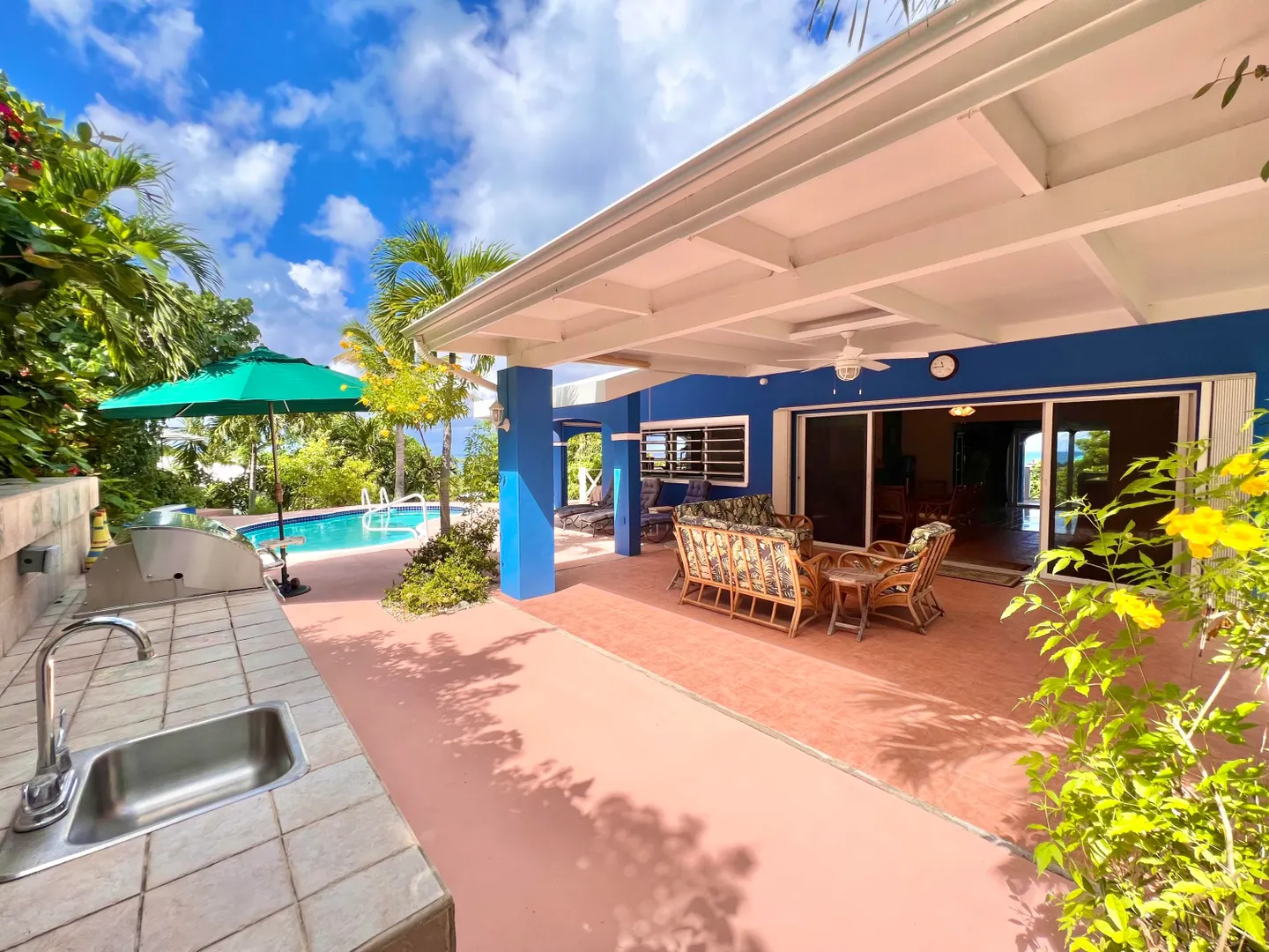 This one-of-a-kind Green Cay villa with 3-bedrooms, 2-baths, and 2-half baths in the main home, and a 1-bedroom,1-bath apartment with its very own driveway, has 180 degree sea views and is walking distance to a sandy beach. As you pull up to the villa, you'll be welcomed by lush gardens, a delightful courtyard, an outdoor kitchen area, a private swimming pool, and a hot tub with mesmerizing sea views. The expansive wrap-around deck is your stage for entertaining and relishing breathtaking vistas of Buck Island and the enchanting Caribbean Sea. This property offers a single-level layout with no steps to navigate, both in the main house and the apartment, ensuring easy access.
