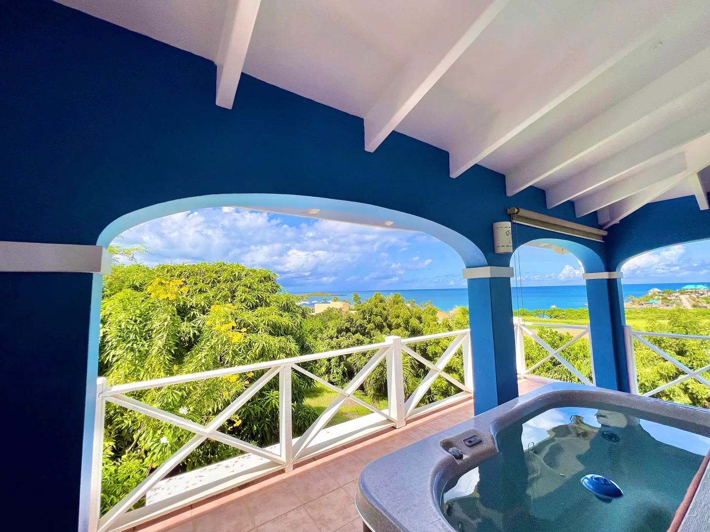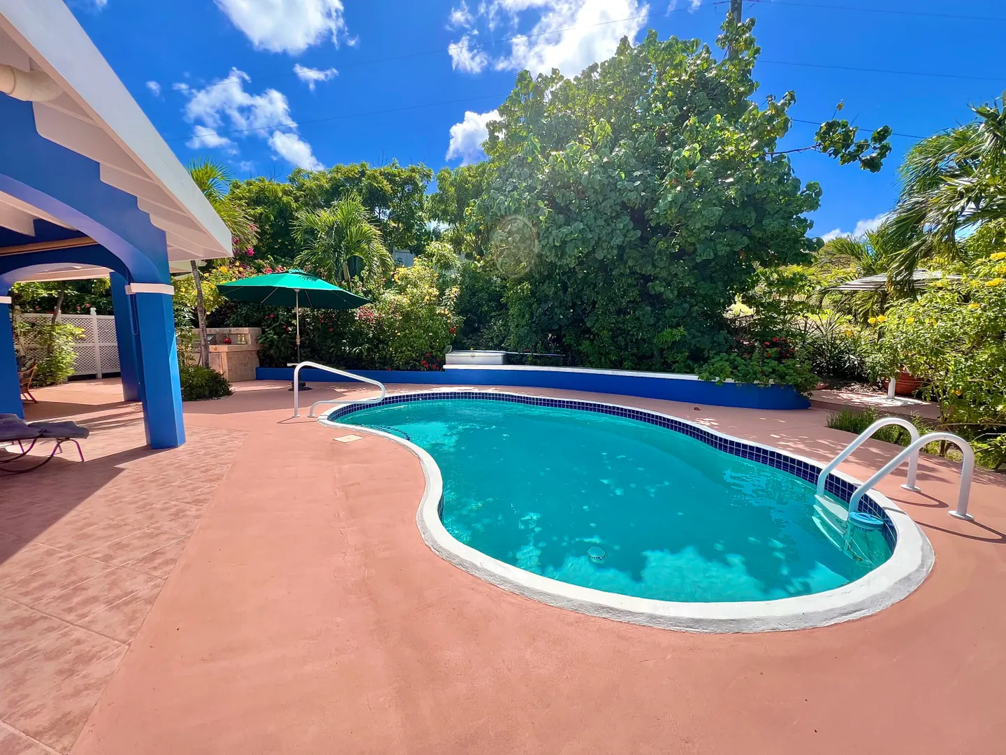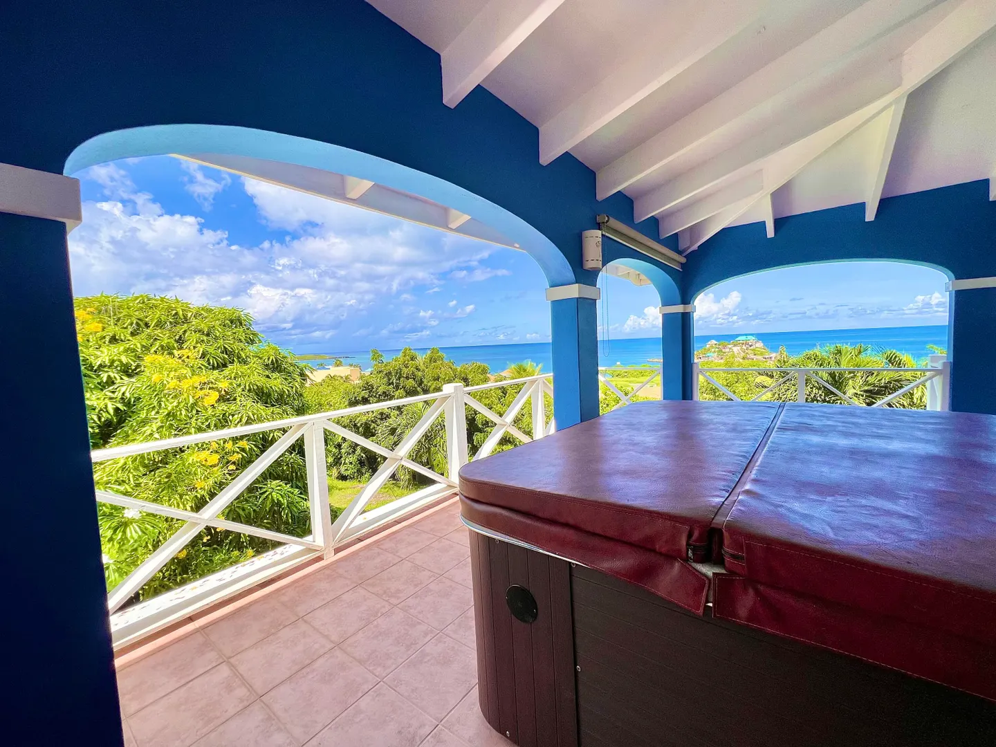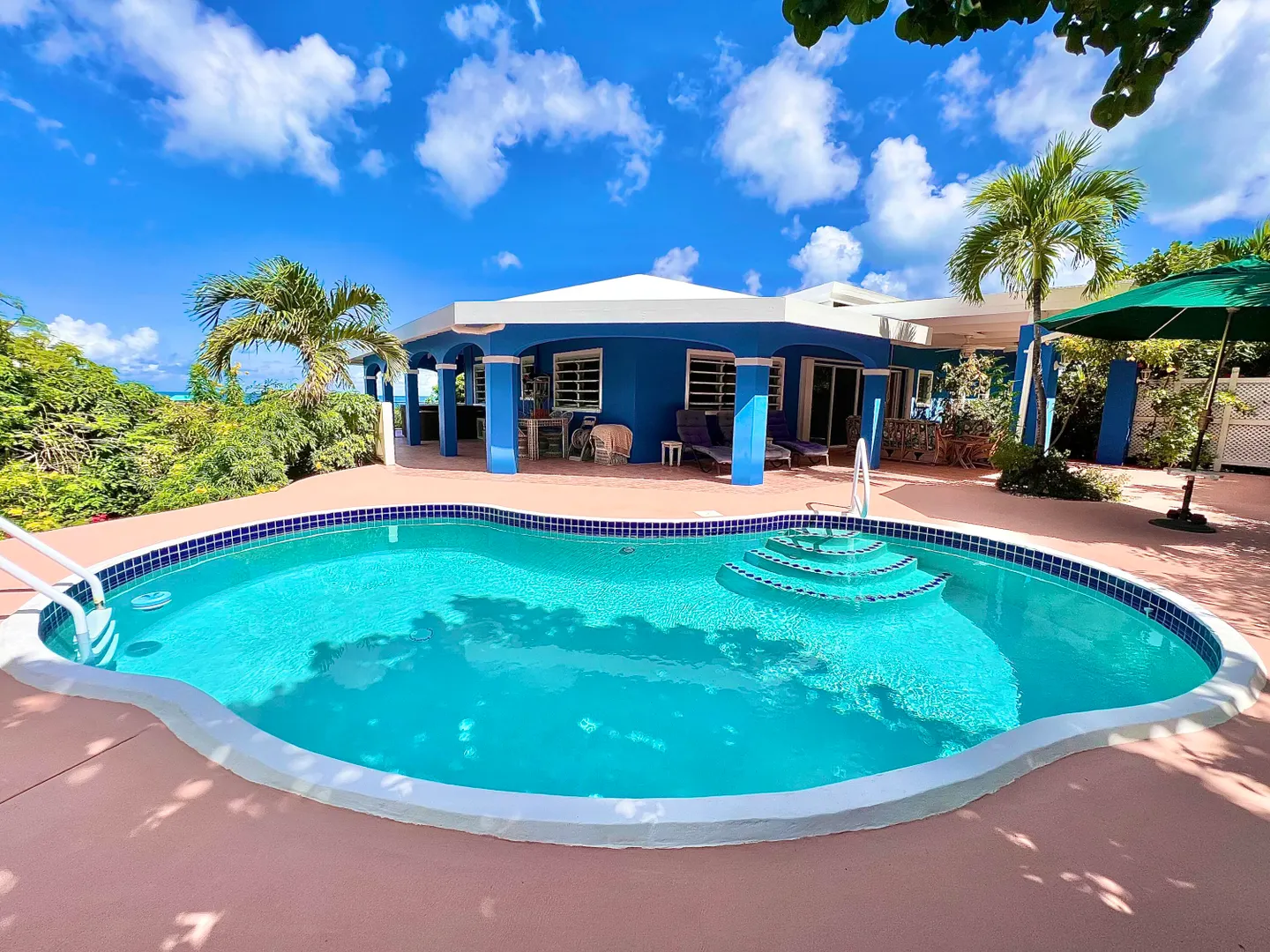 This one-of-a-kind Green Cay villa with 3-bedrooms, 2-baths, and 2-half baths in the main home, and a 1-bedroom,1-bath apartment with its very own driveway, has 180 degree sea views and is walking distance to a sandy beach. As you pull up to the villa, you'll be welcomed by lush gardens, a delightful courtyard, an outdoor kitchen area, a private swimming pool, and a hot tub with mesmerizing sea views. The expansive wrap-around deck is your stage for entertaining and relishing breathtaking vistas of Buck Island and the enchanting Caribbean Sea. This property offers a single-level layout with no steps to navigate, both in the main house and the apartment, ensuring easy access.