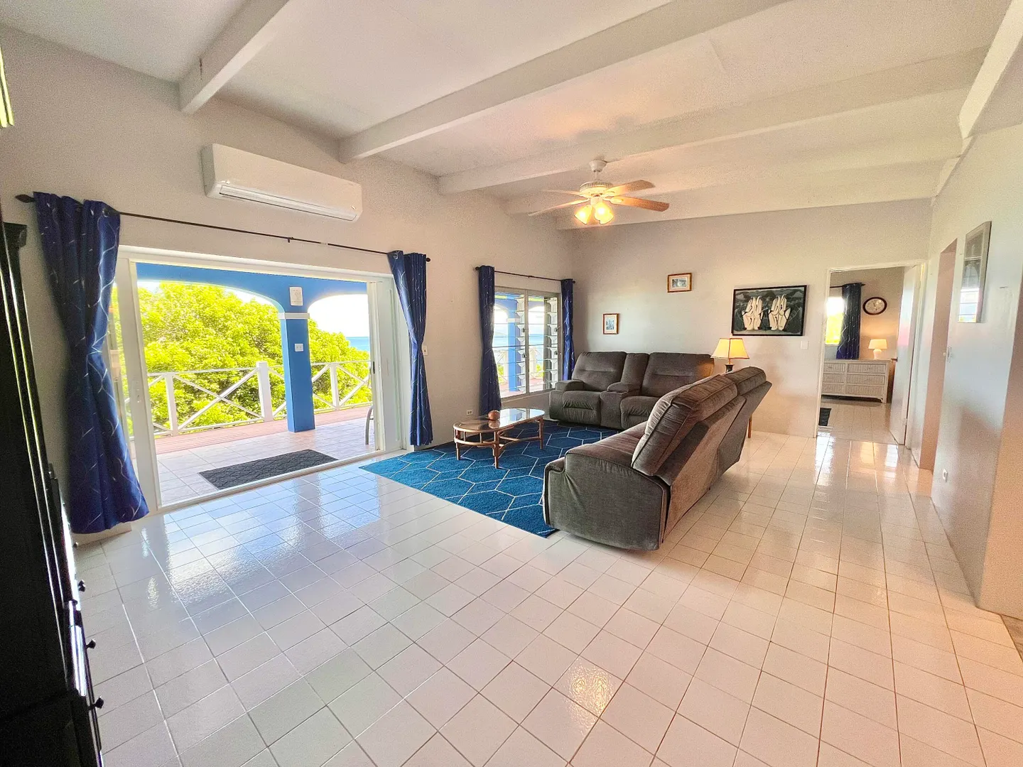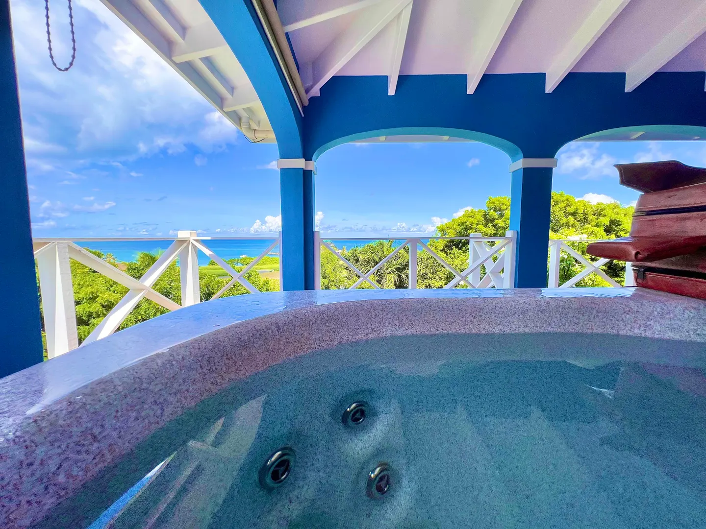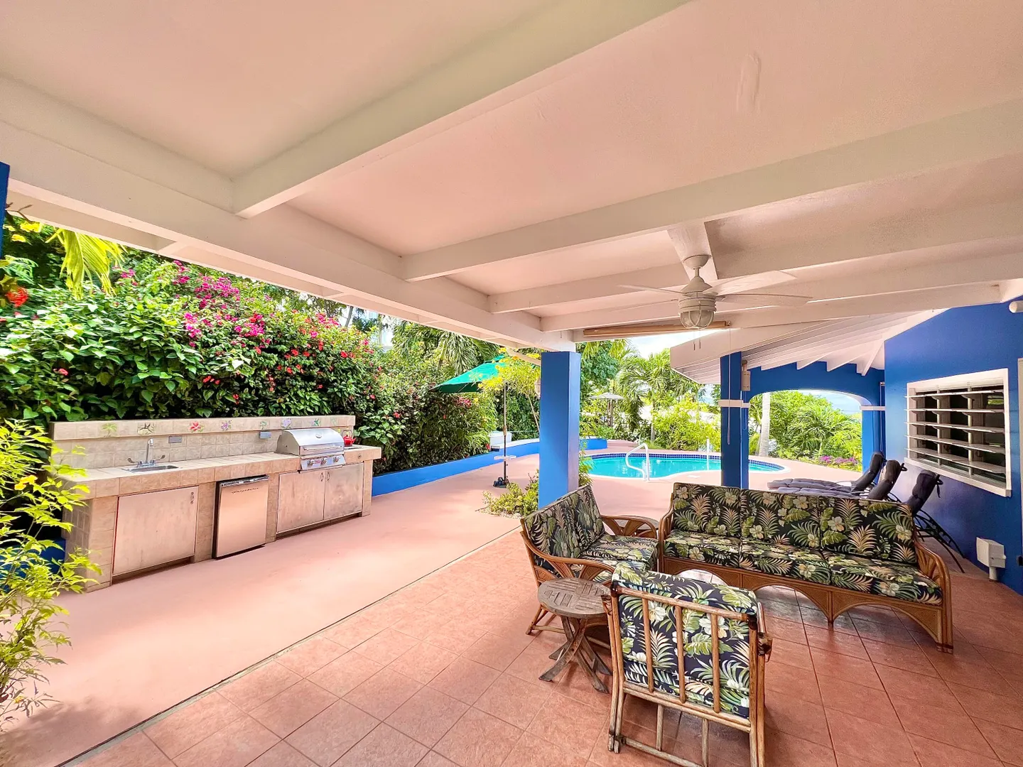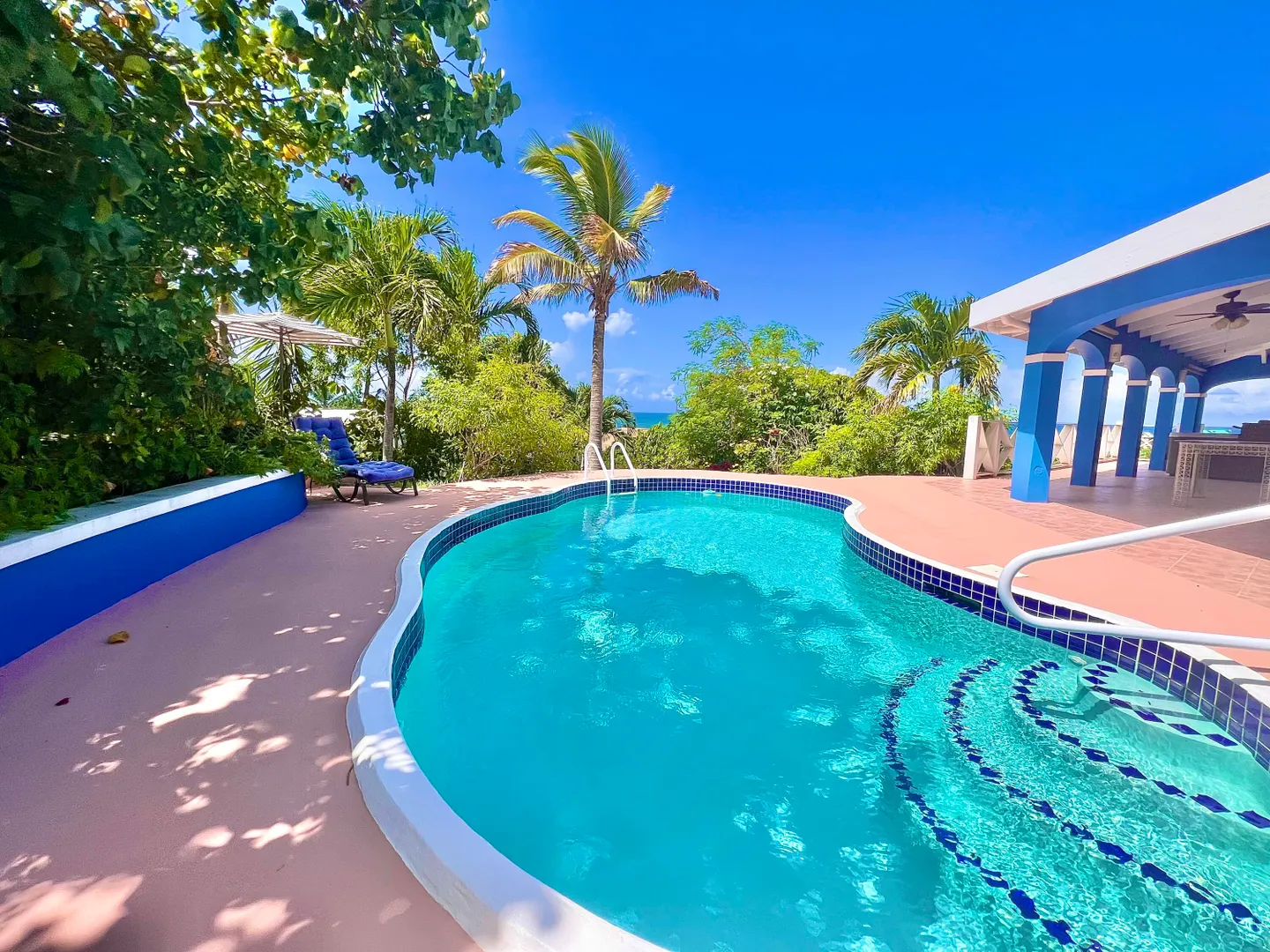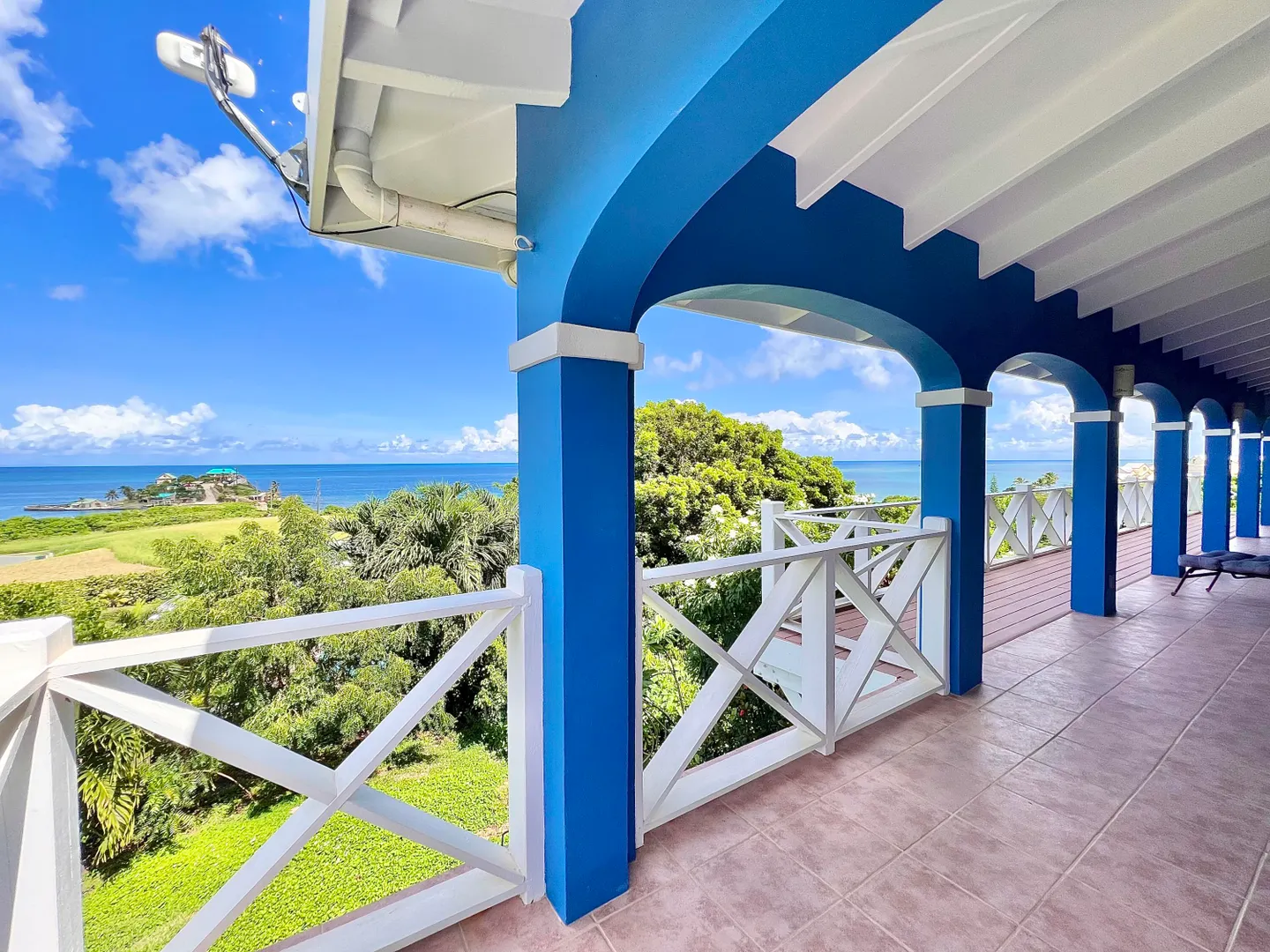 This one-of-a-kind Green Cay villa with 3-bedrooms, 2-baths, and 2-half baths in the main home, and a 1-bedroom,1-bath apartment with its very own driveway, has 180 degree sea views and is walking distance to a sandy beach. As you pull up to the villa, you'll be welcomed by lush gardens, a delightful courtyard, an outdoor kitchen area, a private swimming pool, and a hot tub with mesmerizing sea views. The expansive wrap-around deck is your stage for entertaining and relishing breathtaking vistas of Buck Island and the enchanting Caribbean Sea. This property offers a single-level layout with no steps to navigate, both in the main house and the apartment, ensuring easy access.