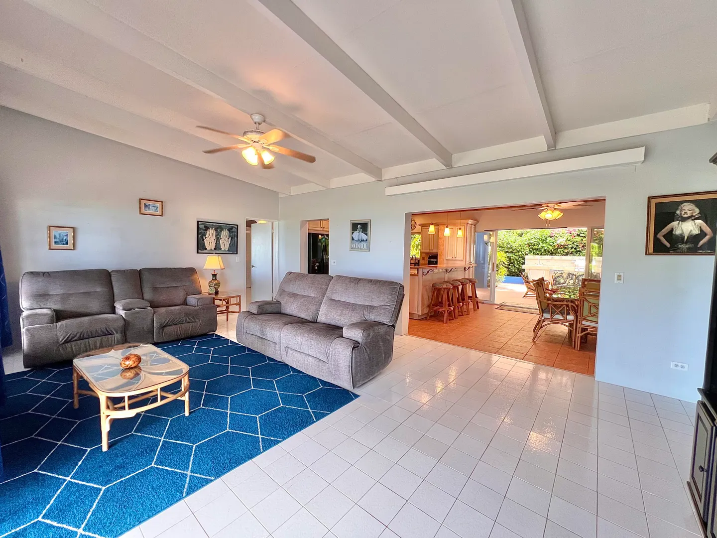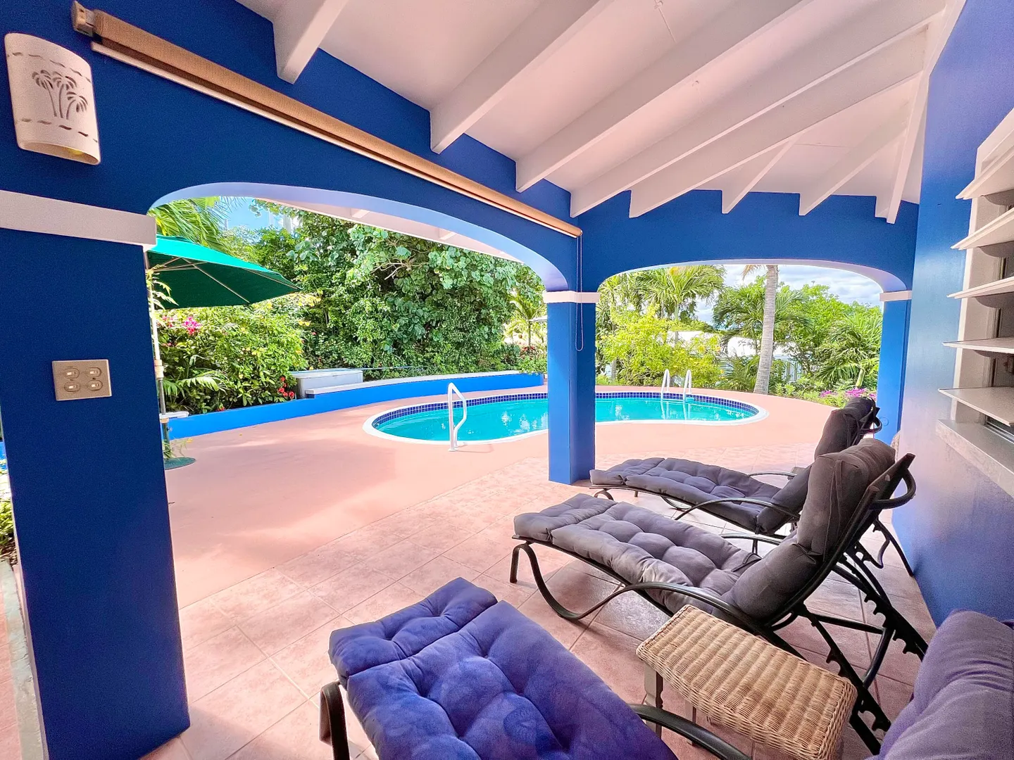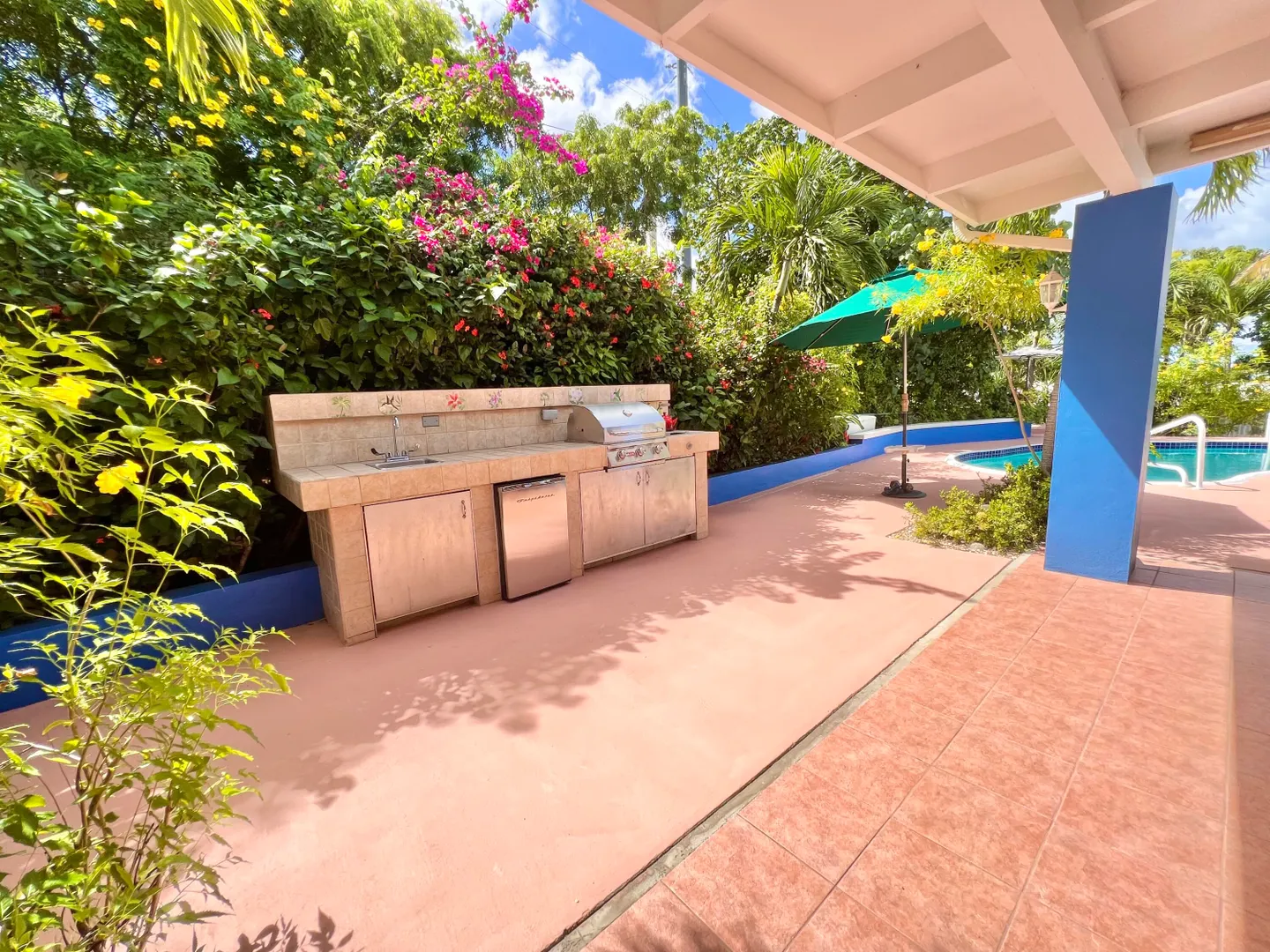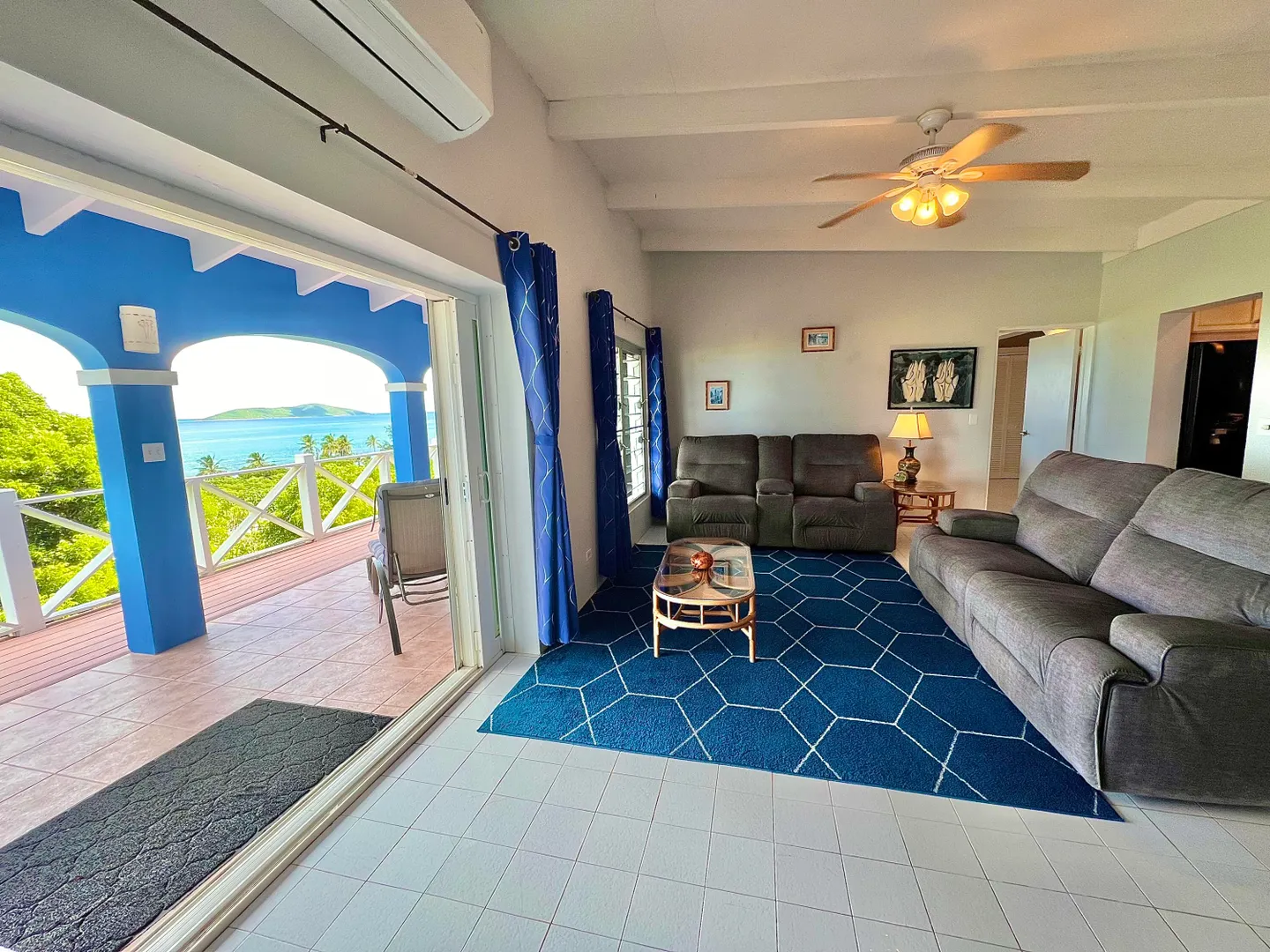 This one-of-a-kind Green Cay villa with 3-bedrooms, 2-baths, and 2-half baths in the main home, and a 1-bedroom,1-bath apartment with its very own driveway, has 180 degree sea views and is walking distance to a sandy beach. As you pull up to the villa, you'll be welcomed by lush gardens, a delightful courtyard, an outdoor kitchen area, a private swimming pool, and a hot tub with mesmerizing sea views. The expansive wrap-around deck is your stage for entertaining and relishing breathtaking vistas of Buck Island and the enchanting Caribbean Sea. This property offers a single-level layout with no steps to navigate, both in the main house and the apartment, ensuring easy access.