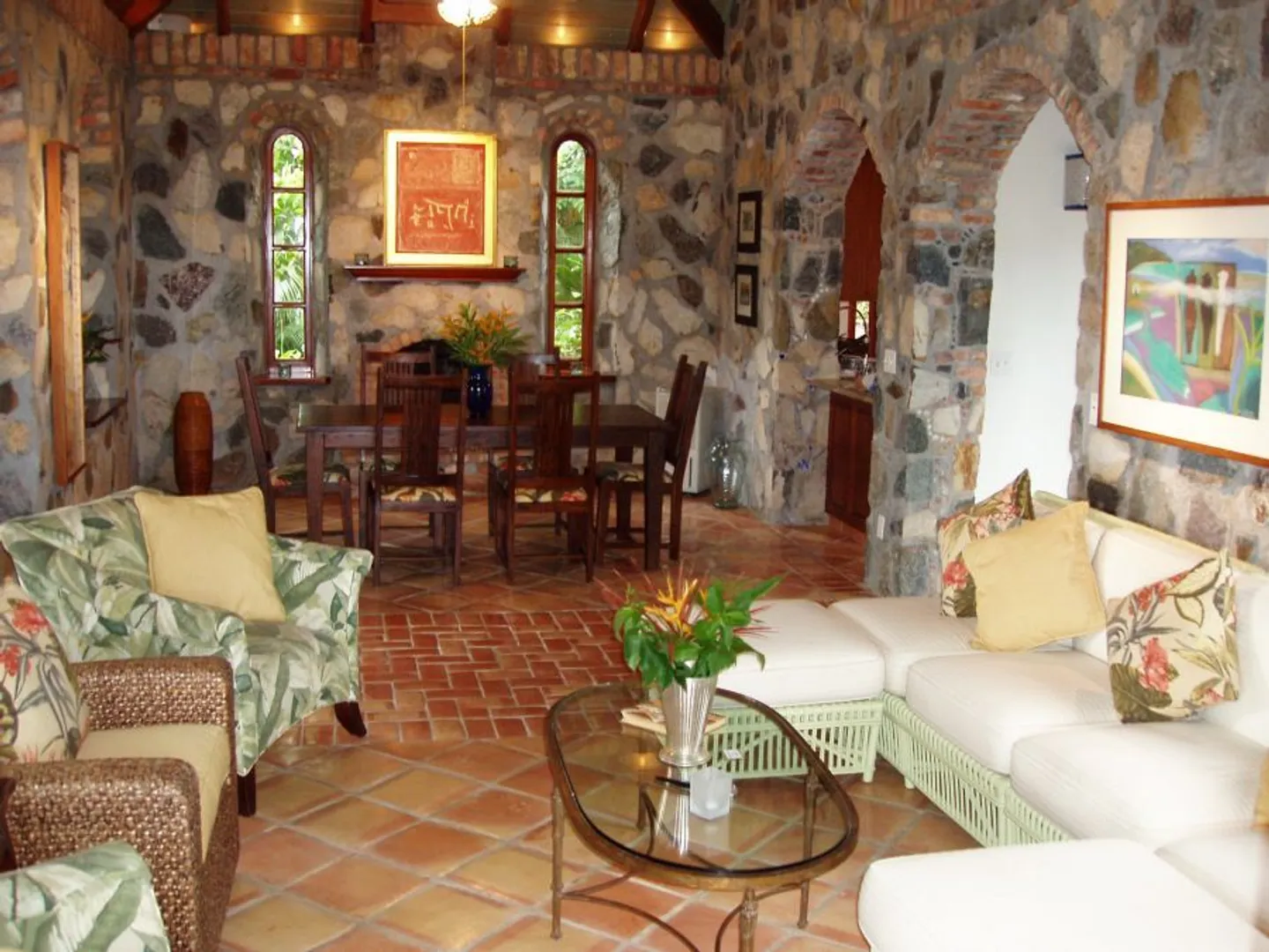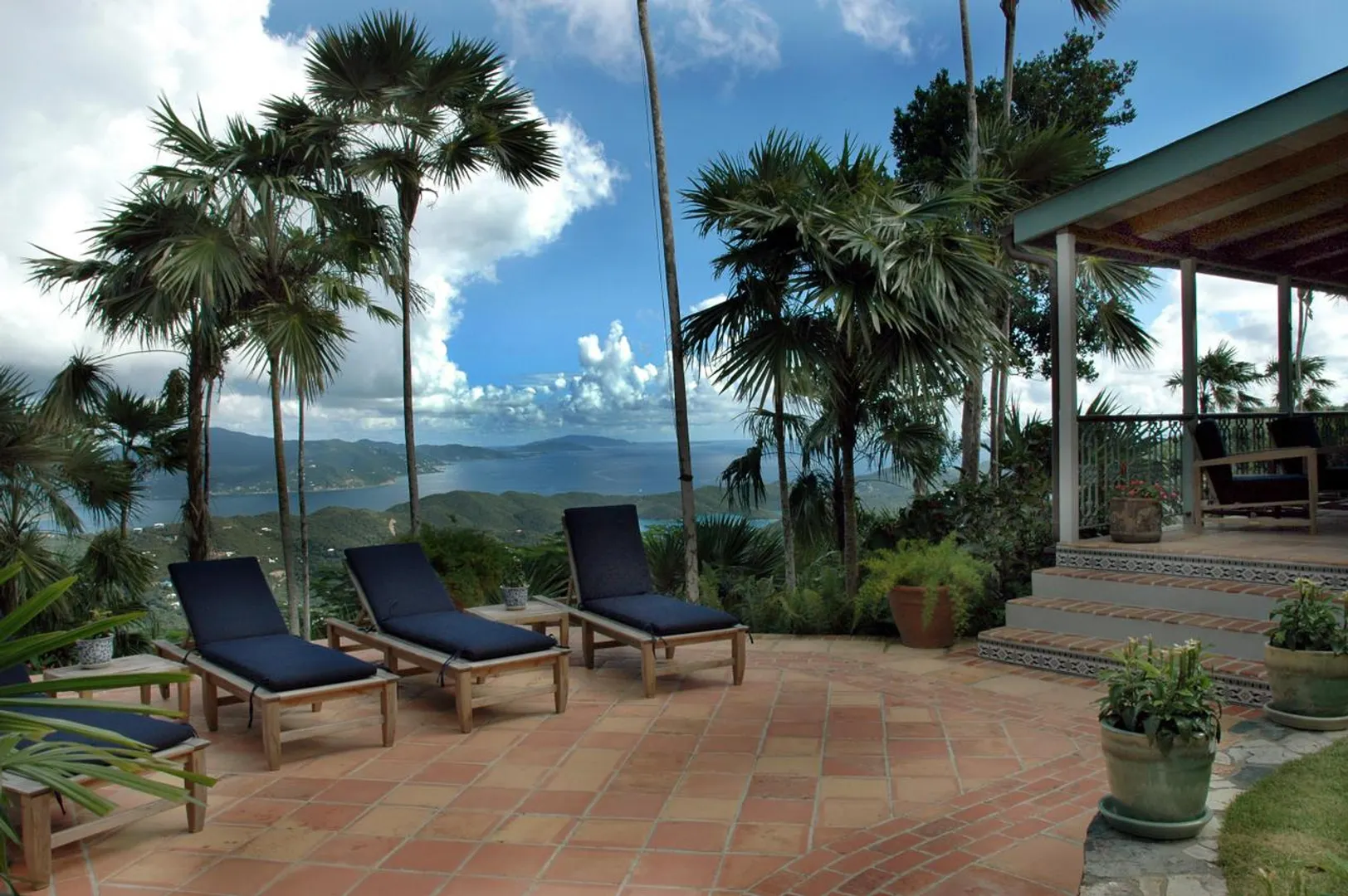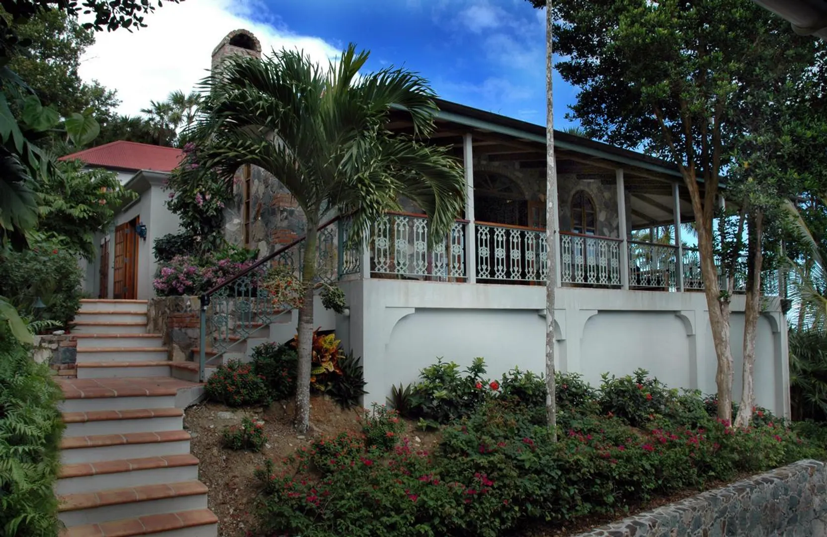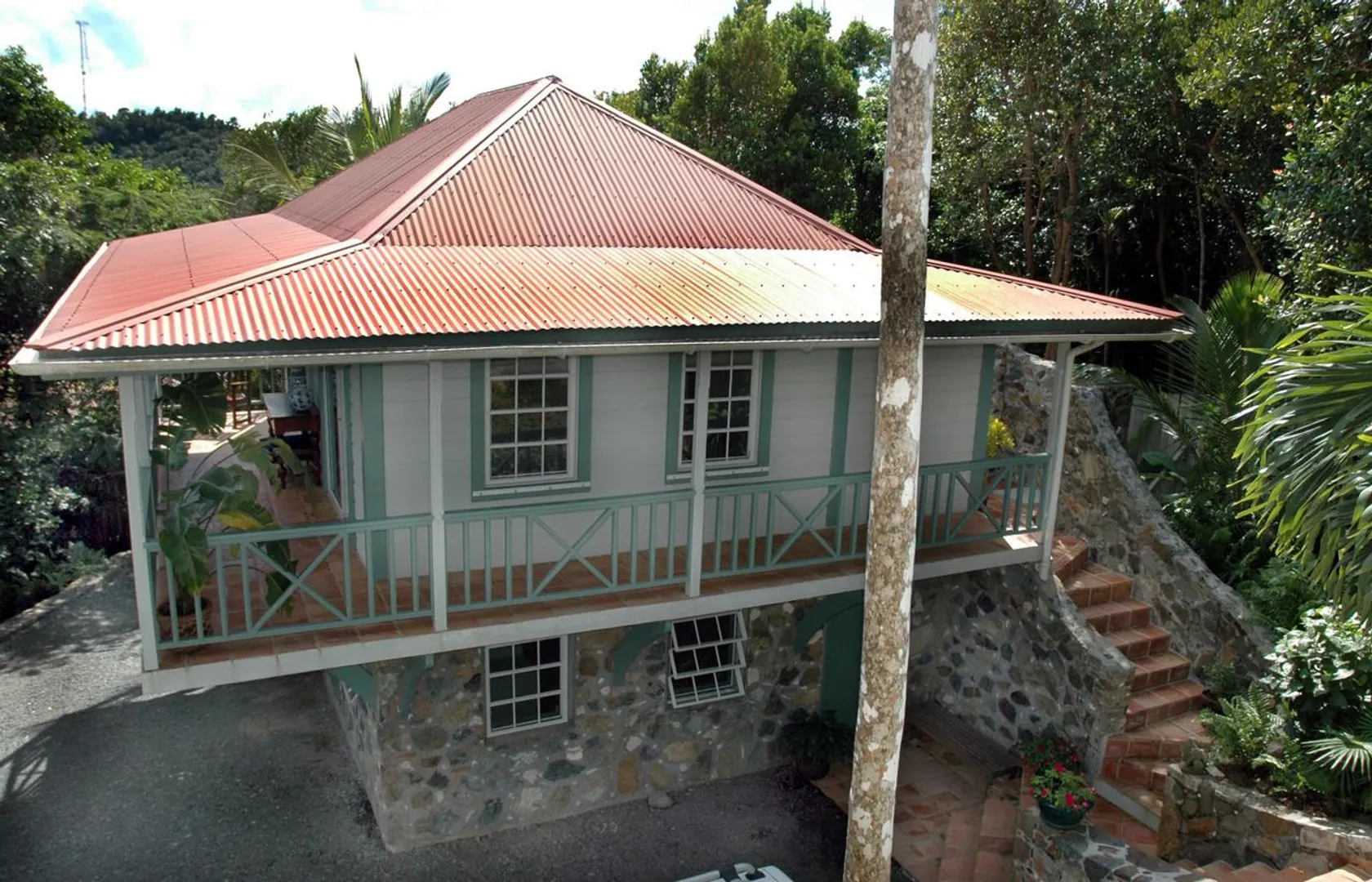 Bordeaux Mountain House enjoys a spectacular mountain top location with cooling breezes, exceptional views, privacy and tranquility, yet this custom designed villa is only a short ride from Cruz Bay, Coral Bay and the north shore National Park Beaches. This gated estate residence features an elegant stone and masonry main house plus a large guest house all in a lush tropical setting with abundant indoor and outdoor living space, an in-ground pool and oversize spa all on level terrain with easy access and ample parking. See SUPPLEMENT and DOCUMENTS for more details.NOTE: THIS SUPPLEMENT ALSO AVAILABLE AS PDF DOCUMENT SUITABLE FOR PRINTING. CLICK ON DOCUMENTS LINK TO VIEW. Bordeaux Mountain House: 10-8-4 Carolina Additional features, benefits and amenities... Custom designed by the builder as his family's private, gated compound - this home has a warmth and appeal that sets it apart from the typical vacation villa. Wooded site, gentle terrain, offers tranquility and privacy with expansive views of Coral Bay, the east end of St. John, the Sir Francis Drake Channel and many of the British Virgin Islands, all from an elevation of nearly 1000 ft. Conveniently located in the center of the island, about 15 minutes from Cruz Bay, 10 minutes to Coral Bay and about a 10-15 minute drive to the National park beaches on the north shore. Beautiful hand crafted native stone work, accented with Chicago brick, is used tastefully throughout much of the main house and for the lower level of the guest cottage. Gourmet kitchen with Viking gas stove, polished granite counter-tops, stainless steel appliances, custom cabinets, microwave, built-in wine cooler. Second great room with dining and living areas on the lower level adjacent to the pool deck. Custom mahogany doors, windows and cabinetry throughout the main house. Stone hearth in the upper great room is a fully functional fireplace for cool winter evenings. Wraparound covered verandahs with decorative wrought iron railings. All rooms in the main house, guesthouse, pool, sundeck and outside areas are wired for sound (Bose speakers). AM/FM, satellite radio, 6-disc CD player and Ipod connection available. Heated pool and spa with expansive tile deck cool to the touch and low maintenance. Fully equipped den/office/media room could be converted into another bedroom. Separate guest cottage with two bedrooms up and full bath; Lower level recreation room could become another full sized bedroom. Addition of full bath on existing slab is quite feasible.