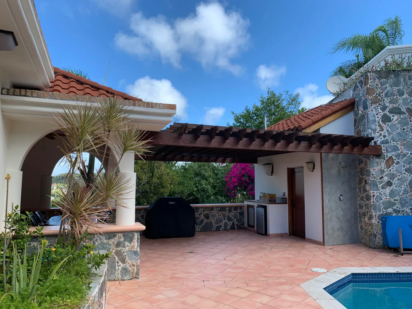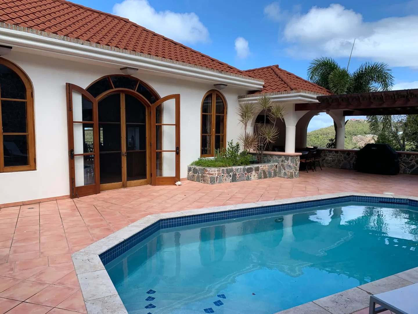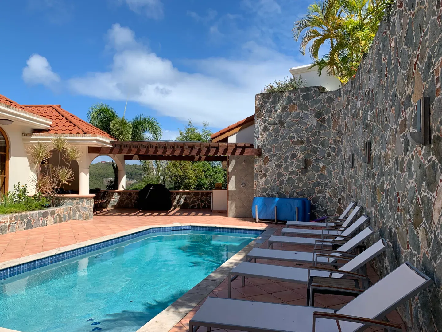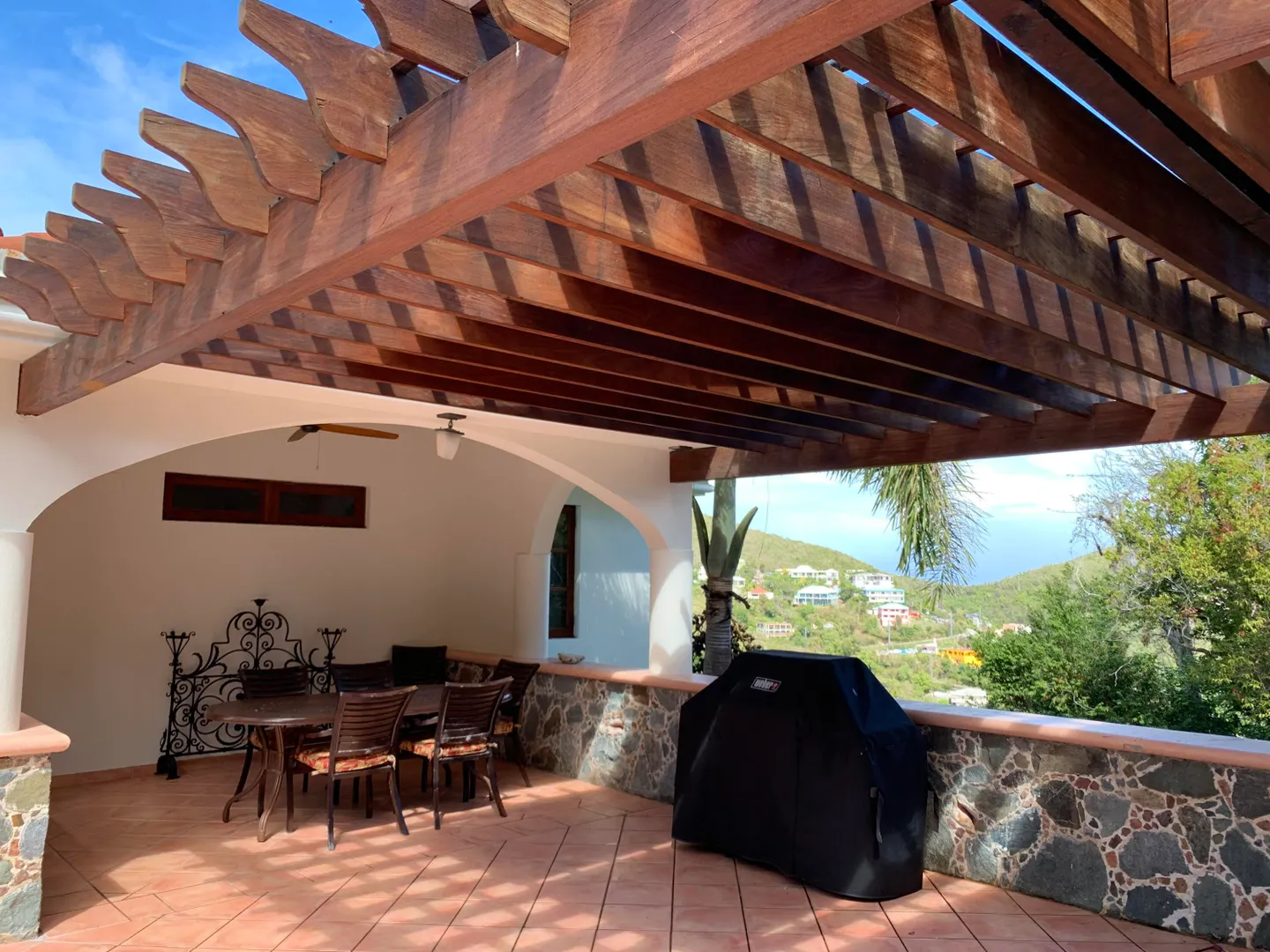 Solid masonry two story pool villa with panoramic ocean and island sunset views. High quality construction with custom mahogany doors, windows and cabinetry throughout. Four very private master suites on two levels accessed by interior staircase, face the views. Spacious covered verandas on both levels, hot tub and sun deck face the views to the West for spectacular sunsets! Covered, breezy dining pergola, pool and patio on main level offer a respite from the afternoon sun. Paved access roads and underground utilities. Plenty of room for additional units or separate guest house with it's own access.