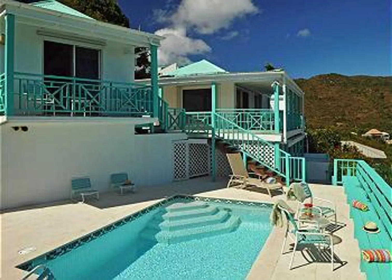 Price SLASHED! REEF BAY VIEW is a classic Mediterranean/Caribbean designed villa with pristine National Park views of Reef Bay, Ram Head, and the white sandy beach below. This classic villa has 3 buildings, with white walls & turquoise accents, connected by covered decks and walkways. Each room has commanding sights of the undeveloped National Park land & the soothing sounds of the waves on the beach. The main building has cathedral ceilings in the living room & kitchen, and a comfortable outdoor dining area, with 2 bedroom/bath pods on either side, and 2 bedrooms with adjoining bath on the pool & Juccuzi deck. This turn-key rental villa has terra cotta tile floors, a/c, and a superb location, adjacent to National Park land, and within walking distance to Reef Bay beach. A MUST SEE!