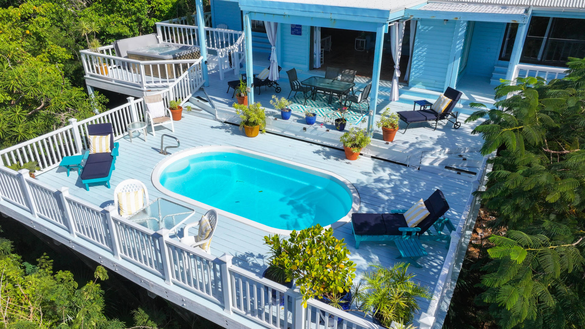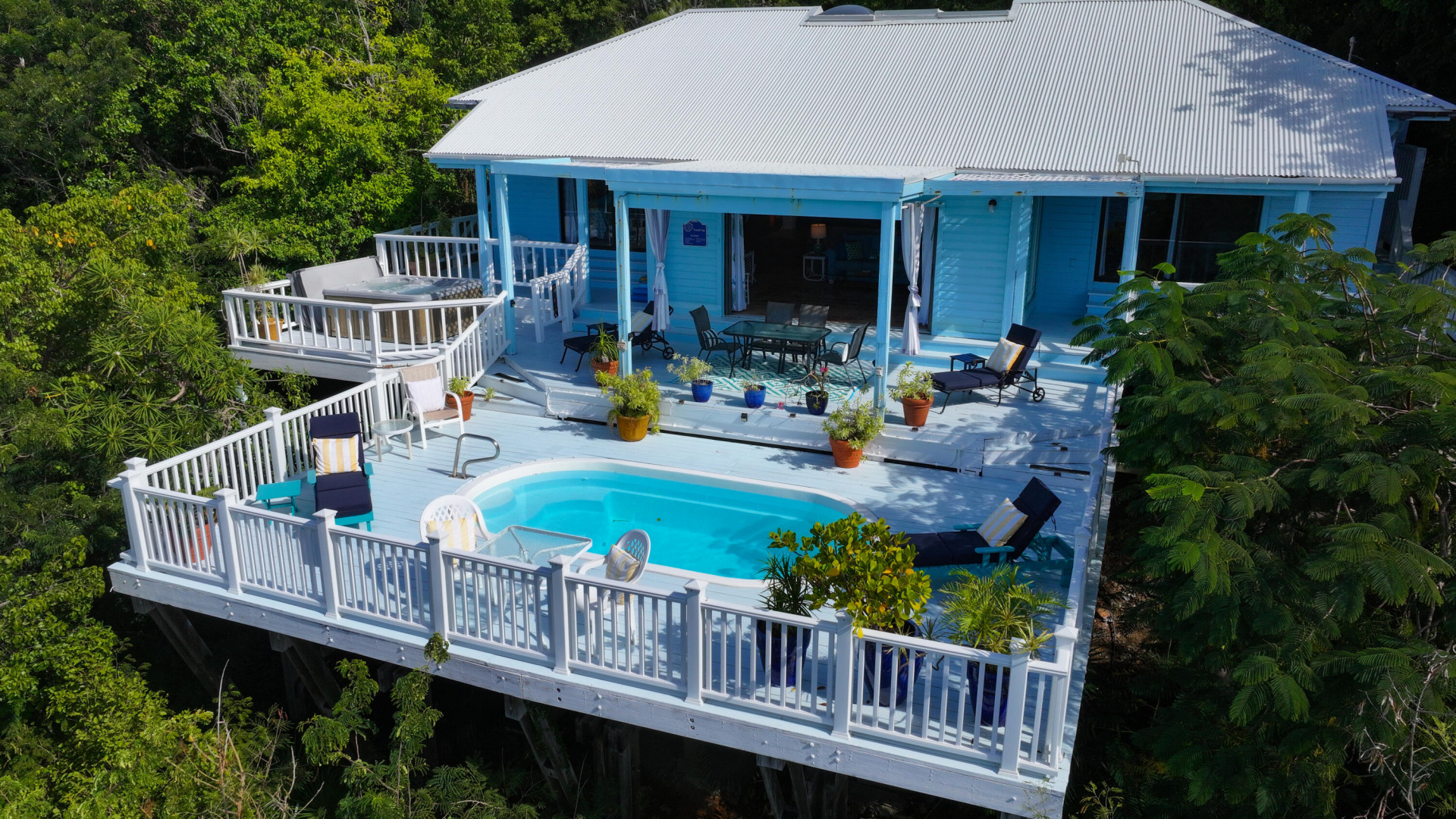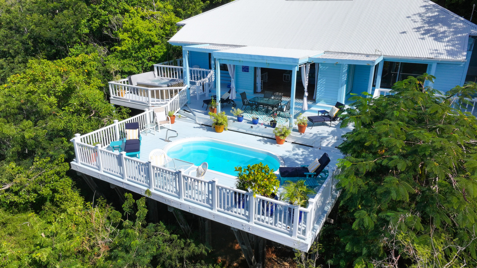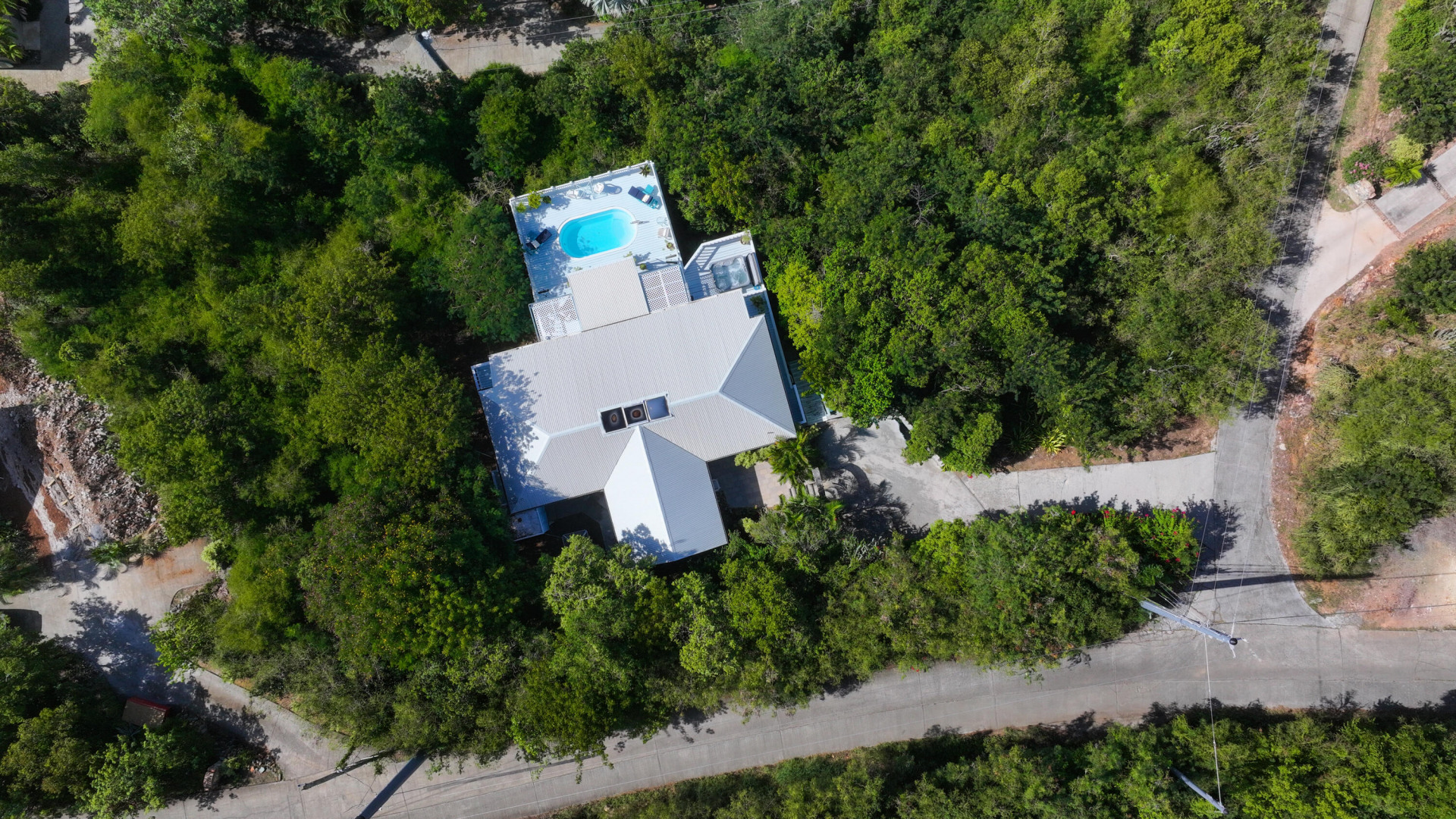 Enjoy the iridescent greens and blues of the Caribbean Sea from every area of this light and airy home. Hear the gentle lap of waves on the rocky beach nearby. This two bedroom home with pool and spa is sited on a corner lot for maximum privacy. Walk to two nearby beaches at Hart Bay and Chocolate Hole for excellent snorkeling, swimming and beach combing.