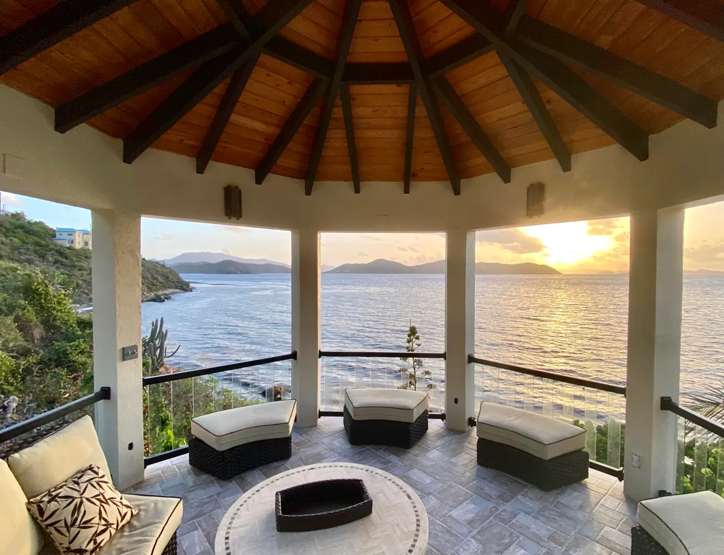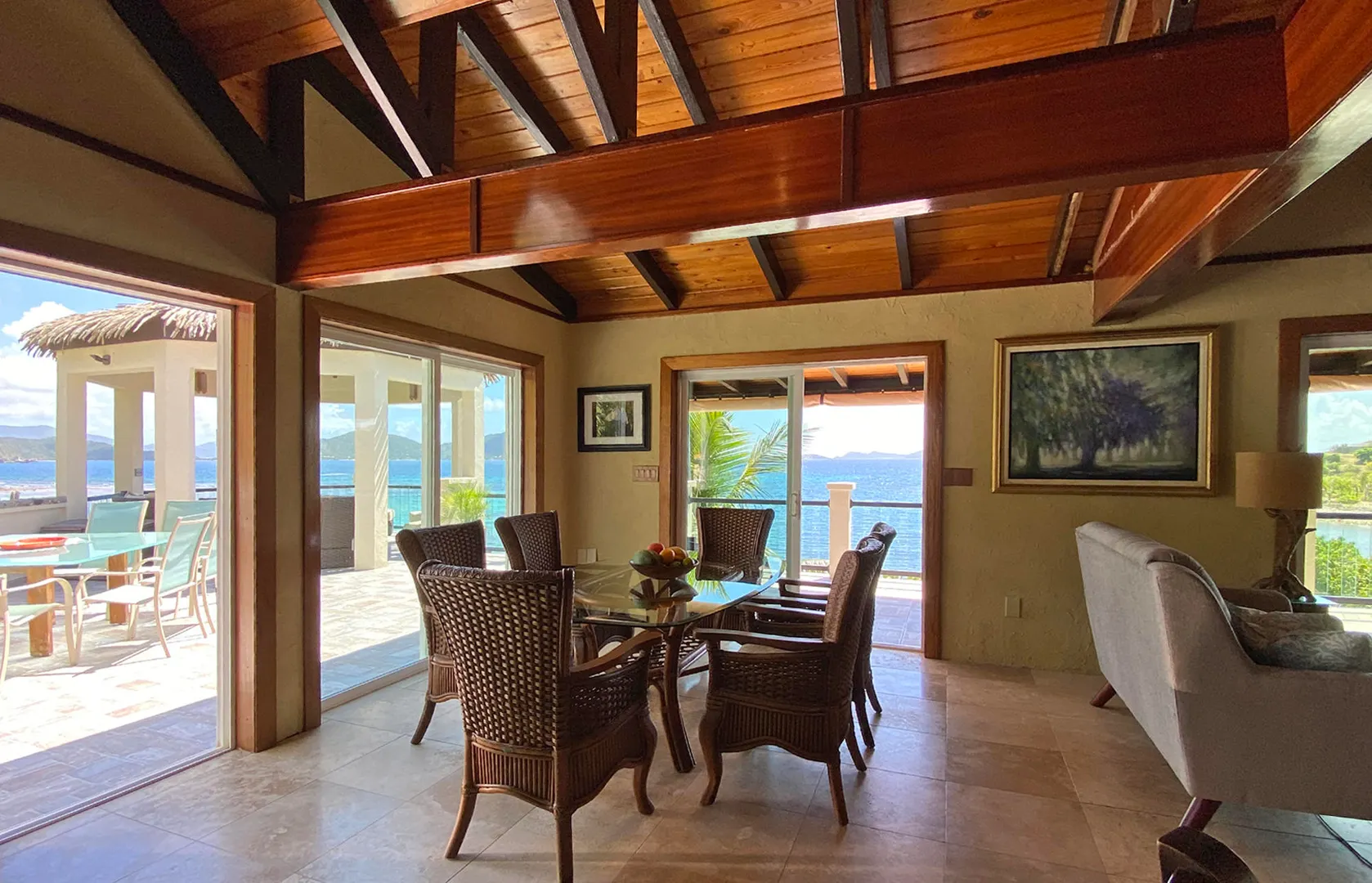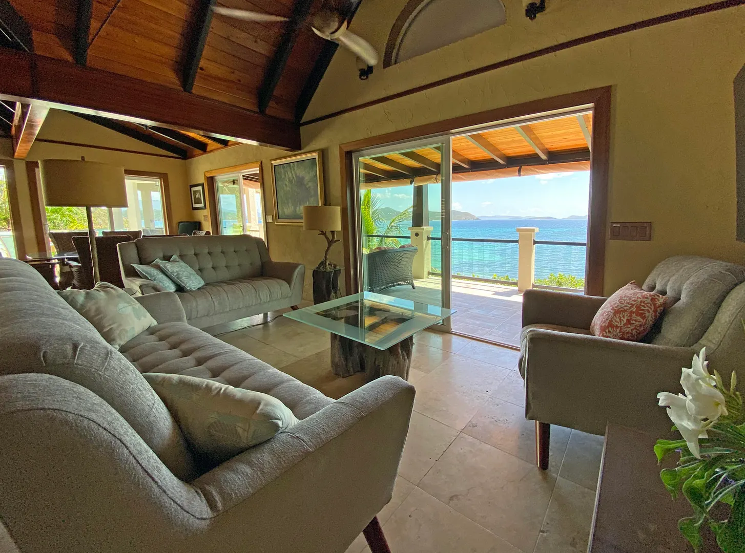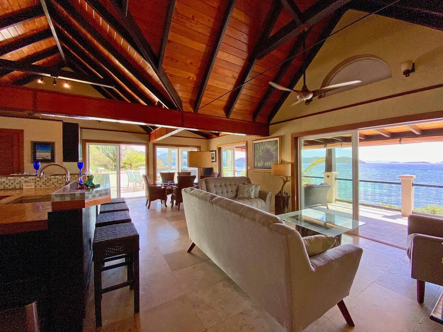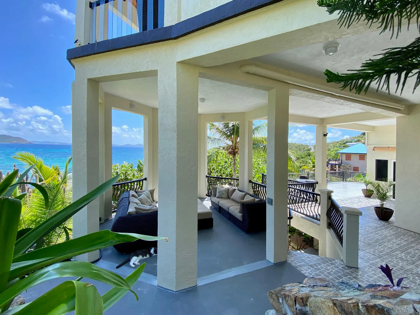 Pelican Beach 5 bedroom / 3.5 bath waterfront villa, awaken to amazing sunrises on this peaceful Coral Bay side.Pelican Beach, one of the few St. John vacation rentals available directly on the water, features fabulous outside living spaces with breathtaking views, cool evening breezes & almost daily visits from soaring, diving pelicans & you will be lulled into peaceful bliss by the sound of the surf, both day and night. Indoor living space includes 5 bedrooms W)AC, 2 fully equipped kitchens w) full size appliances & 3.5baths with 2 laundry facilities & office. Great snorkeling within footsteps of the waterfront seagrape deck.Relax in the gazebo, absorb the panoramic views from Tortola, East End, Flannigan Island & Norman Island. Walk to Miss Lucy's. Solar, Battery & generator systems