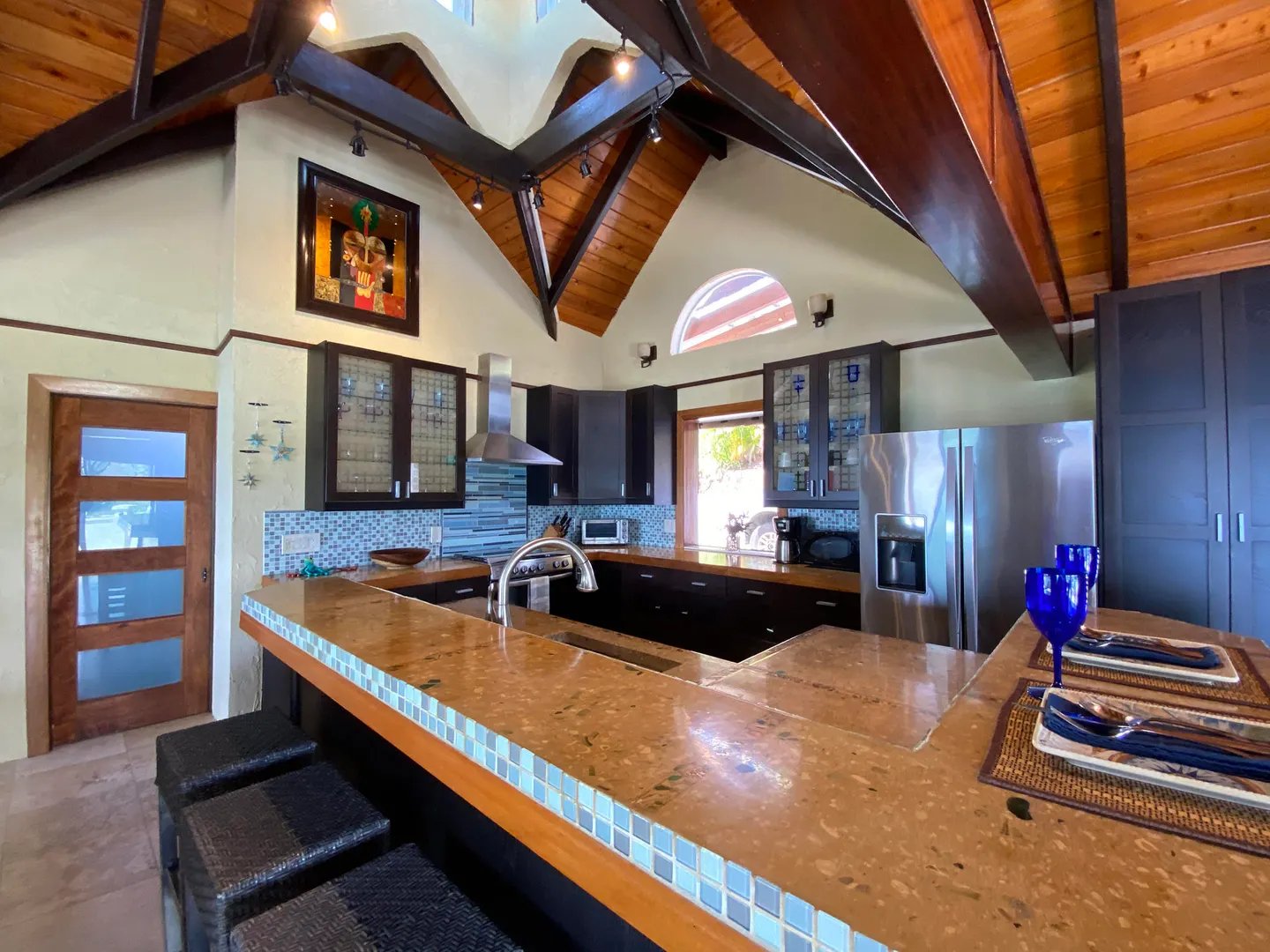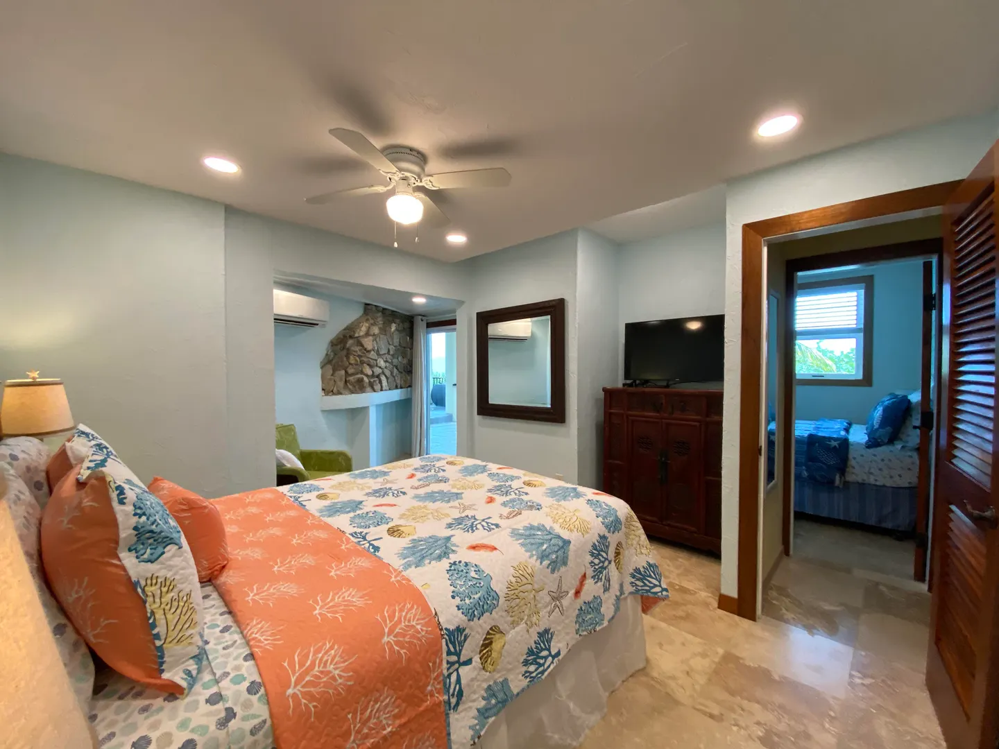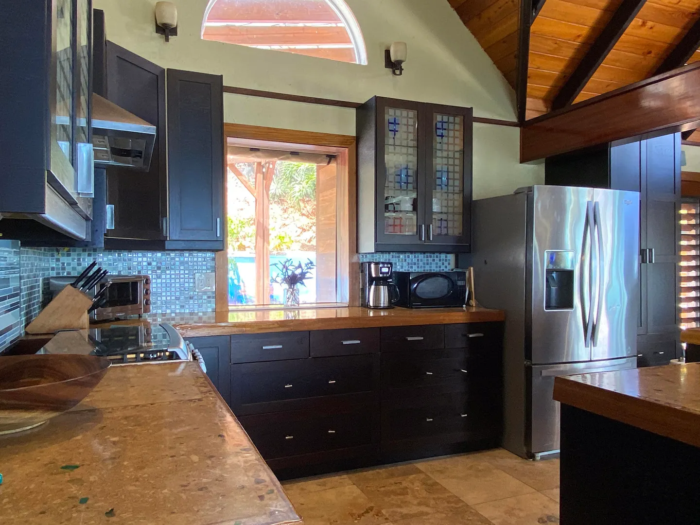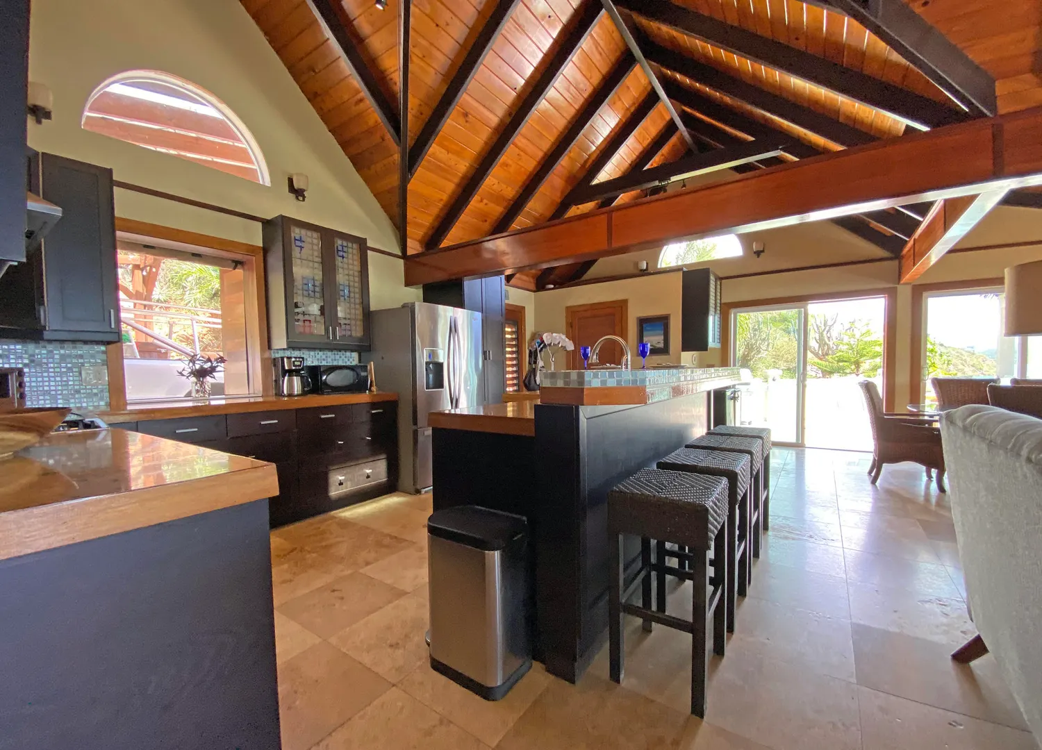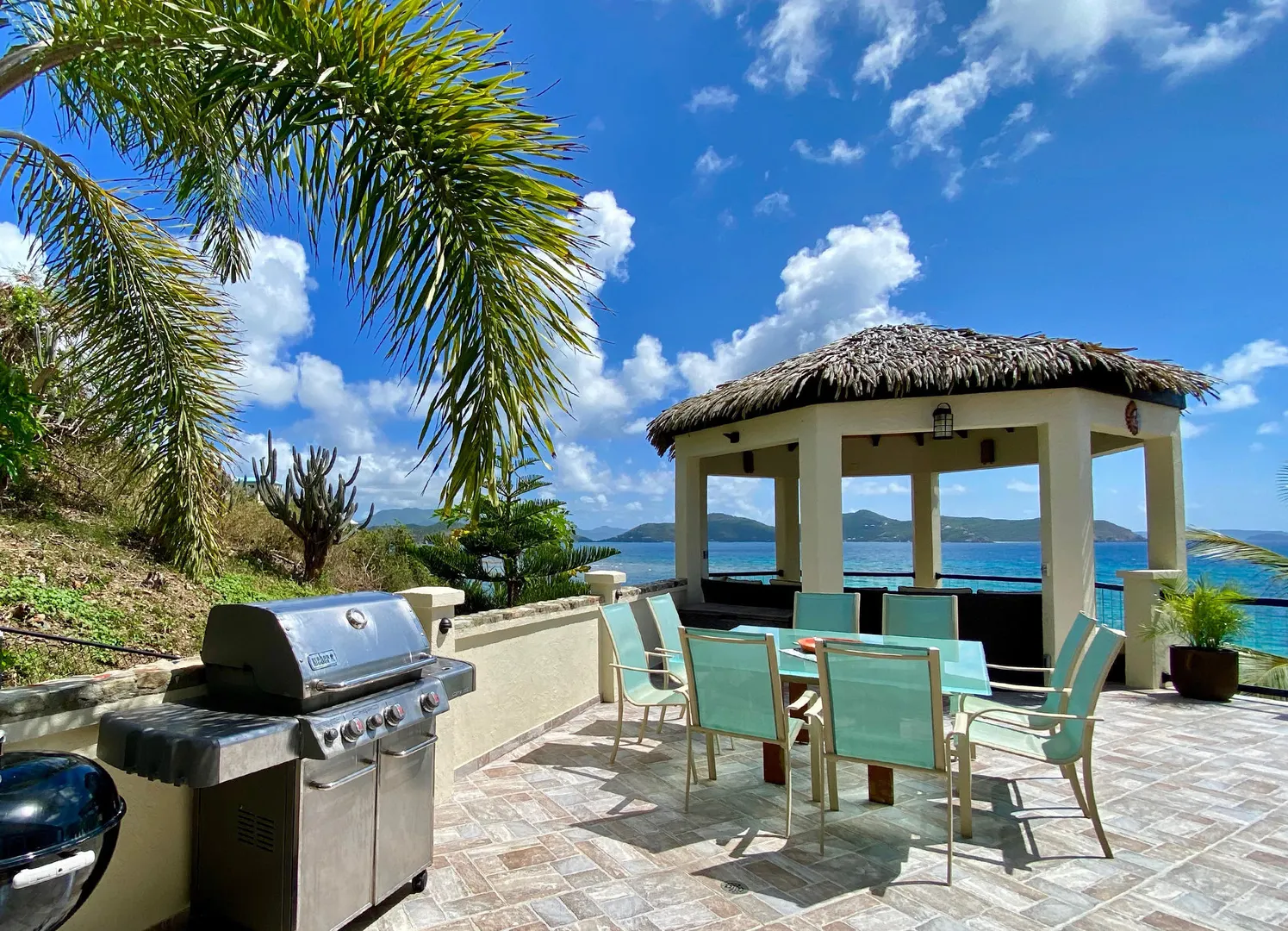 Pelican Beach 5 bedroom / 3.5 bath waterfront villa, awaken to amazing sunrises on this peaceful Coral Bay side.Pelican Beach, one of the few St. John vacation rentals available directly on the water, features fabulous outside living spaces with breathtaking views, cool evening breezes & almost daily visits from soaring, diving pelicans & you will be lulled into peaceful bliss by the sound of the surf, both day and night. Indoor living space includes 5 bedrooms W)AC, 2 fully equipped kitchens w) full size appliances & 3.5baths with 2 laundry facilities & office. Great snorkeling within footsteps of the waterfront seagrape deck.Relax in the gazebo, absorb the panoramic views from Tortola, East End, Flannigan Island & Norman Island. Walk to Miss Lucy's. Solar, Battery & generator systems