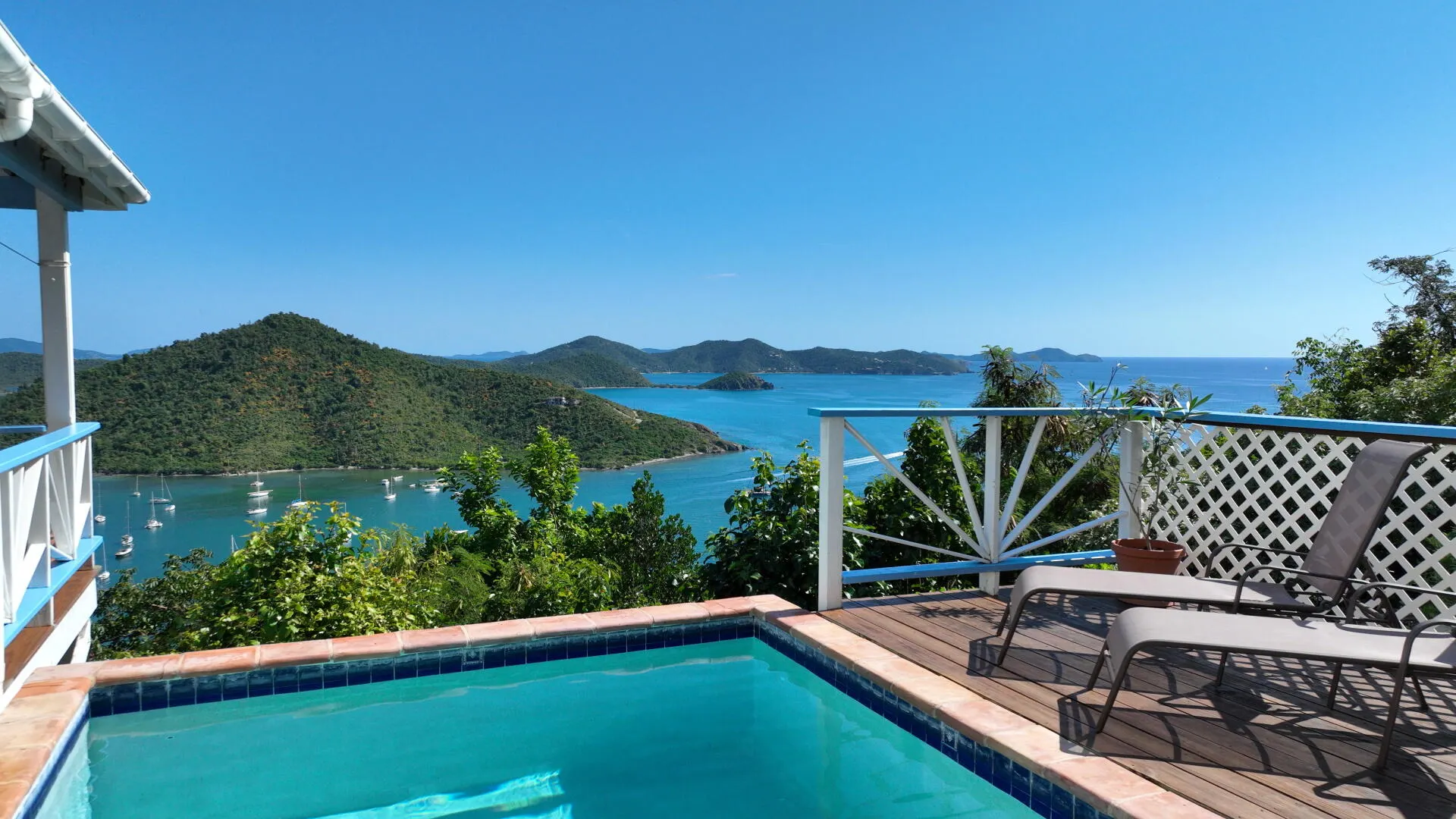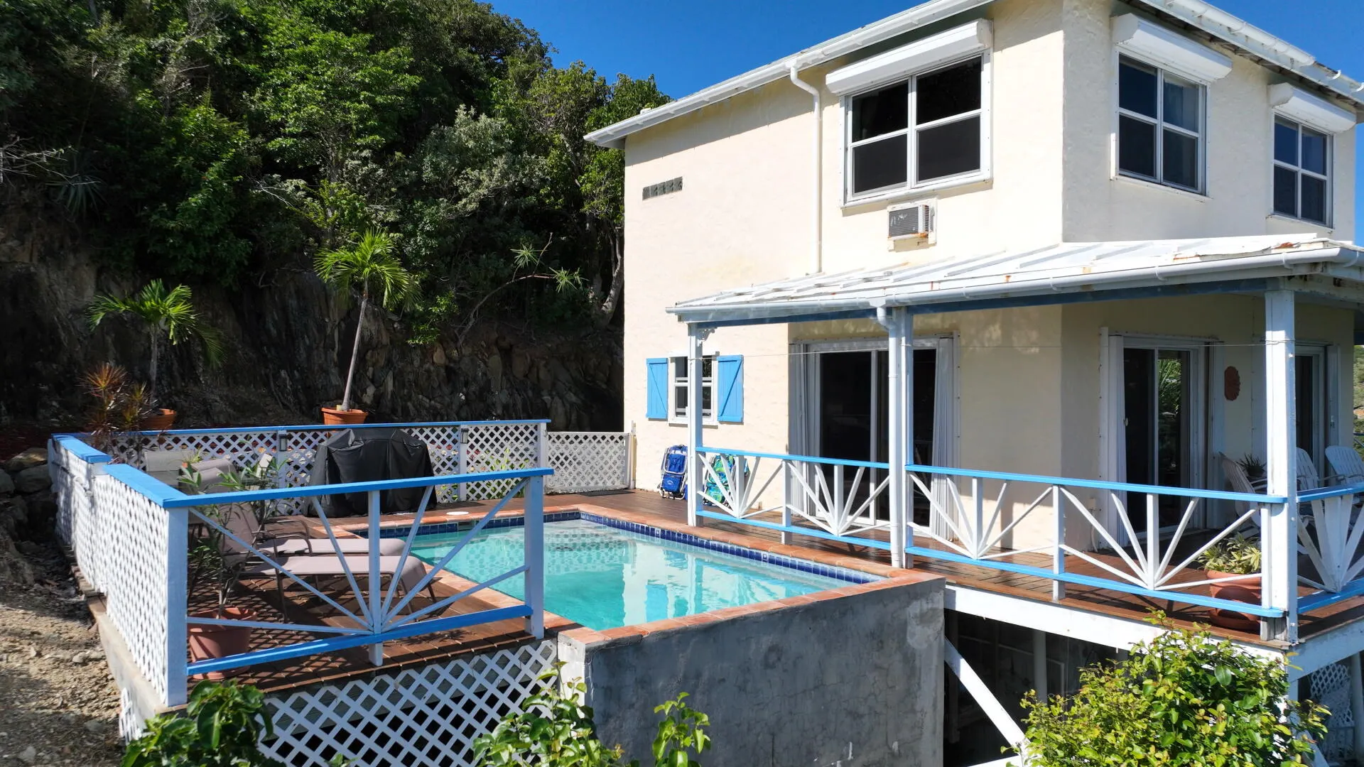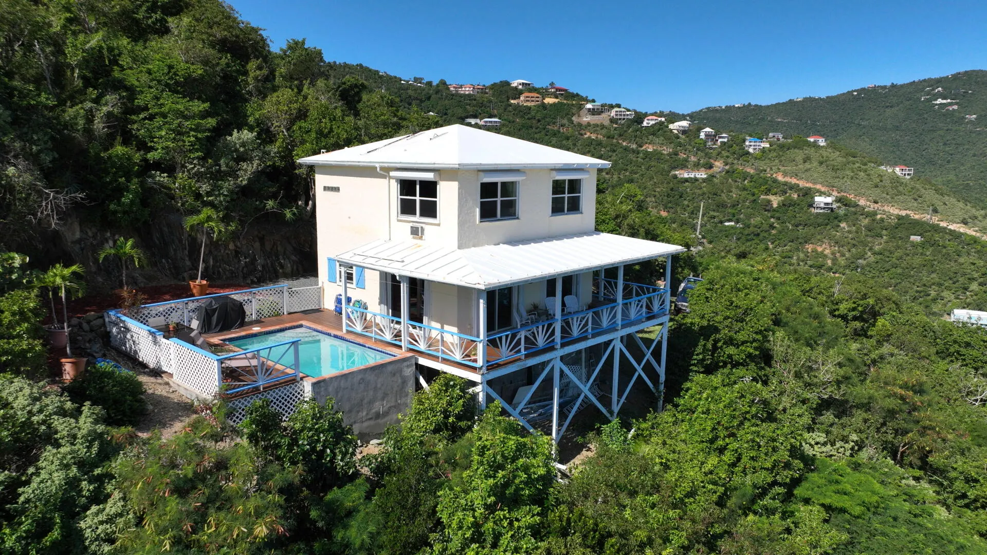 Perched 400' above Coral Bay, Rhumb Runners captures steady easterly breezes & amazing 270 sea views of Coral Bay & down island. Located at the end of the road, this very private, fully fenced 2 bedroom, 2.5 bath masonry home w/ masonry pool is a very successful turnkey rental, catering to many repeat rental guests since 2001. The bright & airy great room w/4 sliding glass doors overlook the covered porch & pool deck that offers sea views from every vantage point. A full-sized custom kitchen offers KraftMaid solid wood cabinets, SS appliances & stone countertops. The interior staircase leads to 2 bedrooms w/a/c, ensuite baths & large windows. Custom textured plastered walls throughout. New paint, decks & windows in 2018. Sellers willing to convey adjacent .26 acre with full price offer!