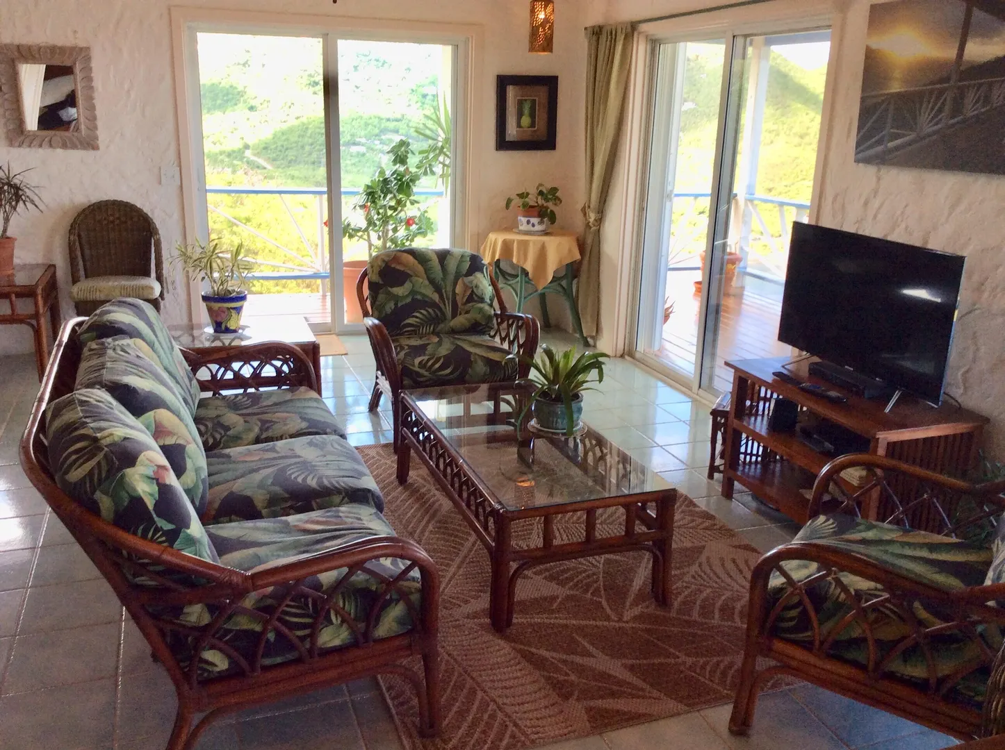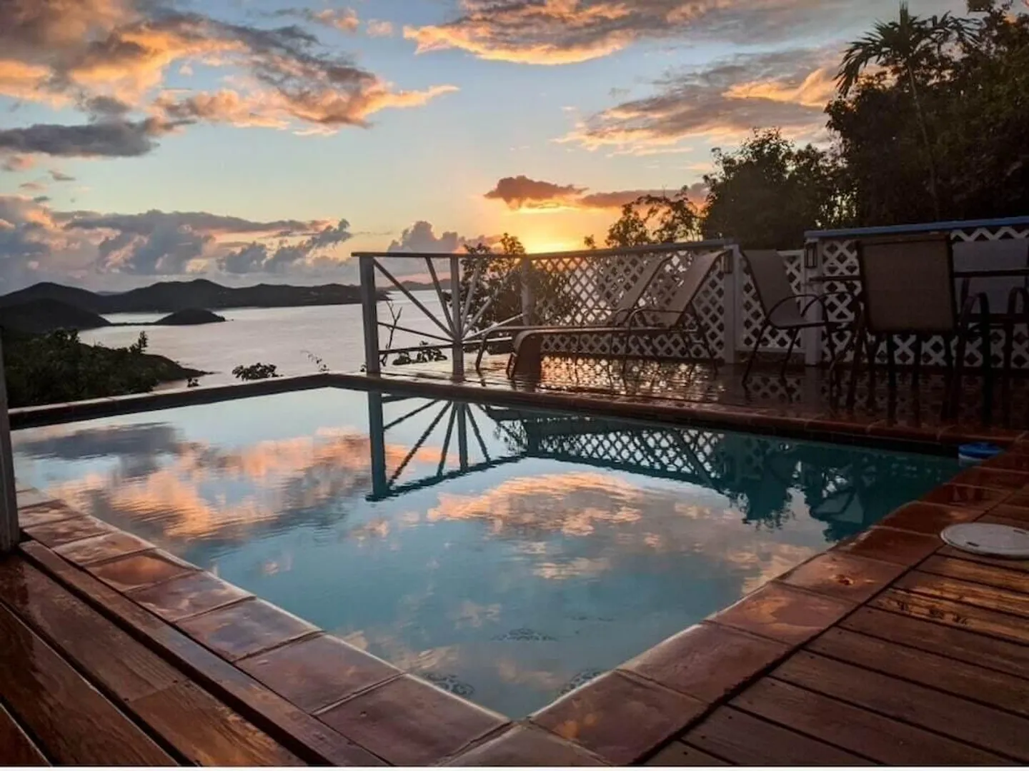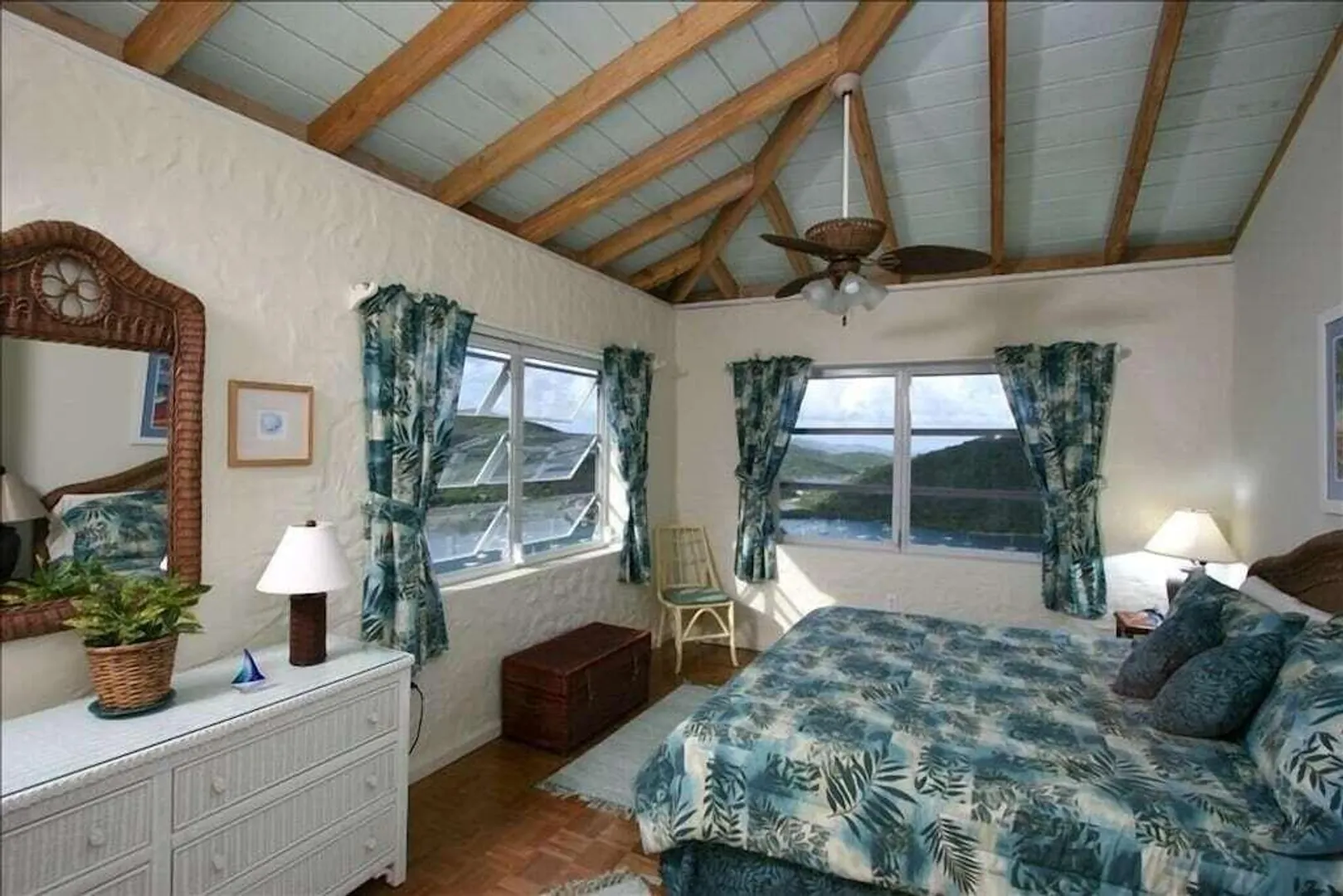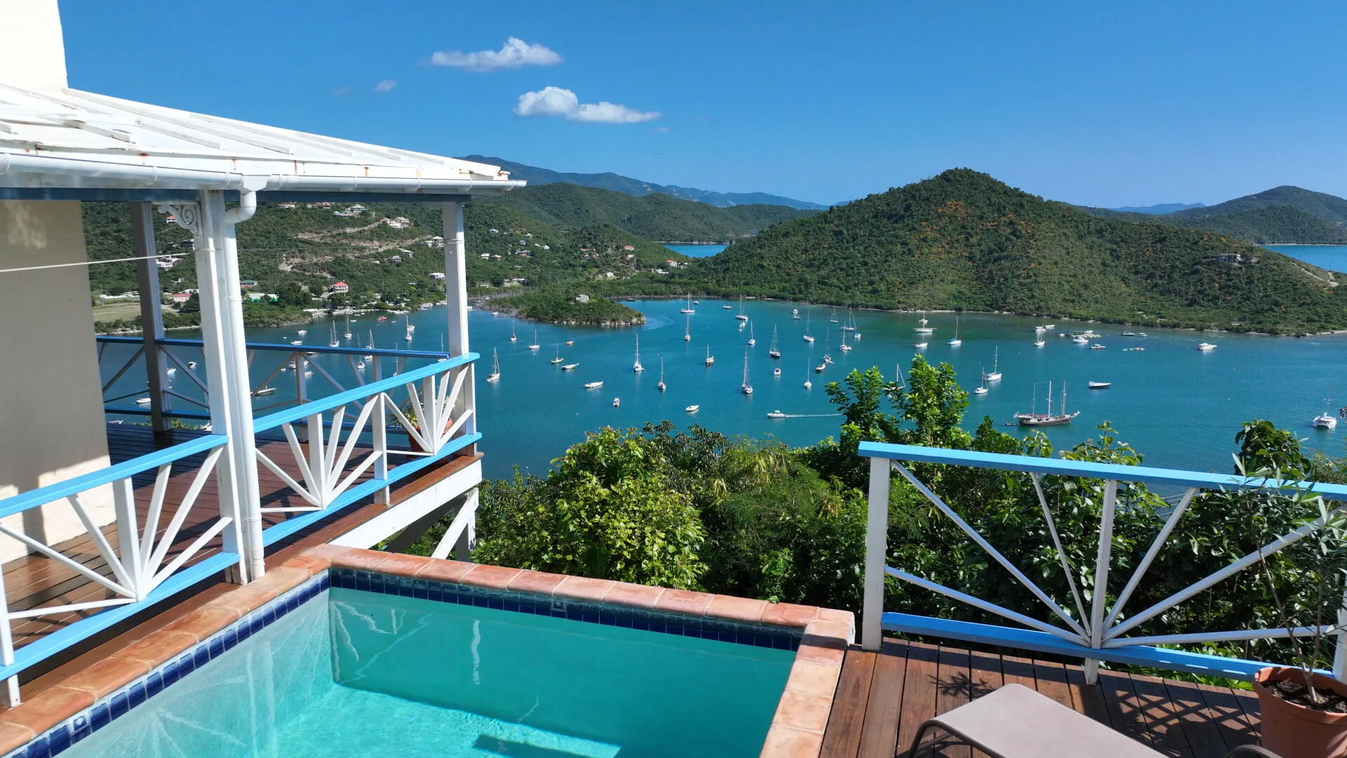 Perched 400' above Coral Bay, Rhumb Runners captures steady easterly breezes & amazing 270 sea views of Coral Bay & down island. Located at the end of the road, this very private, fully fenced 2 bedroom, 2.5 bath masonry home w/ masonry pool is a very successful turnkey rental, catering to many repeat rental guests since 2001. The bright & airy great room w/4 sliding glass doors overlook the covered porch & pool deck that offers sea views from every vantage point. A full-sized custom kitchen offers KraftMaid solid wood cabinets, SS appliances & stone countertops. The interior staircase leads to 2 bedrooms w/a/c, ensuite baths & large windows. Custom textured plastered walls throughout. New paint, decks & windows in 2018. Sellers willing to convey adjacent .26 acre with full price offer!
