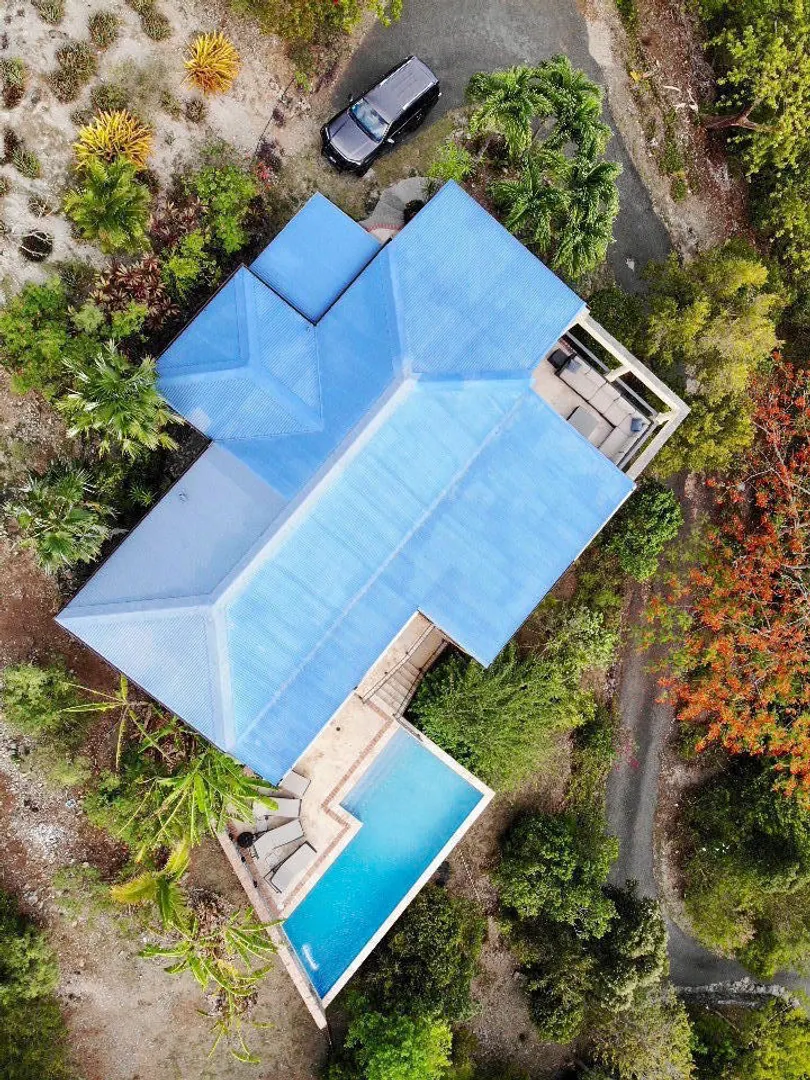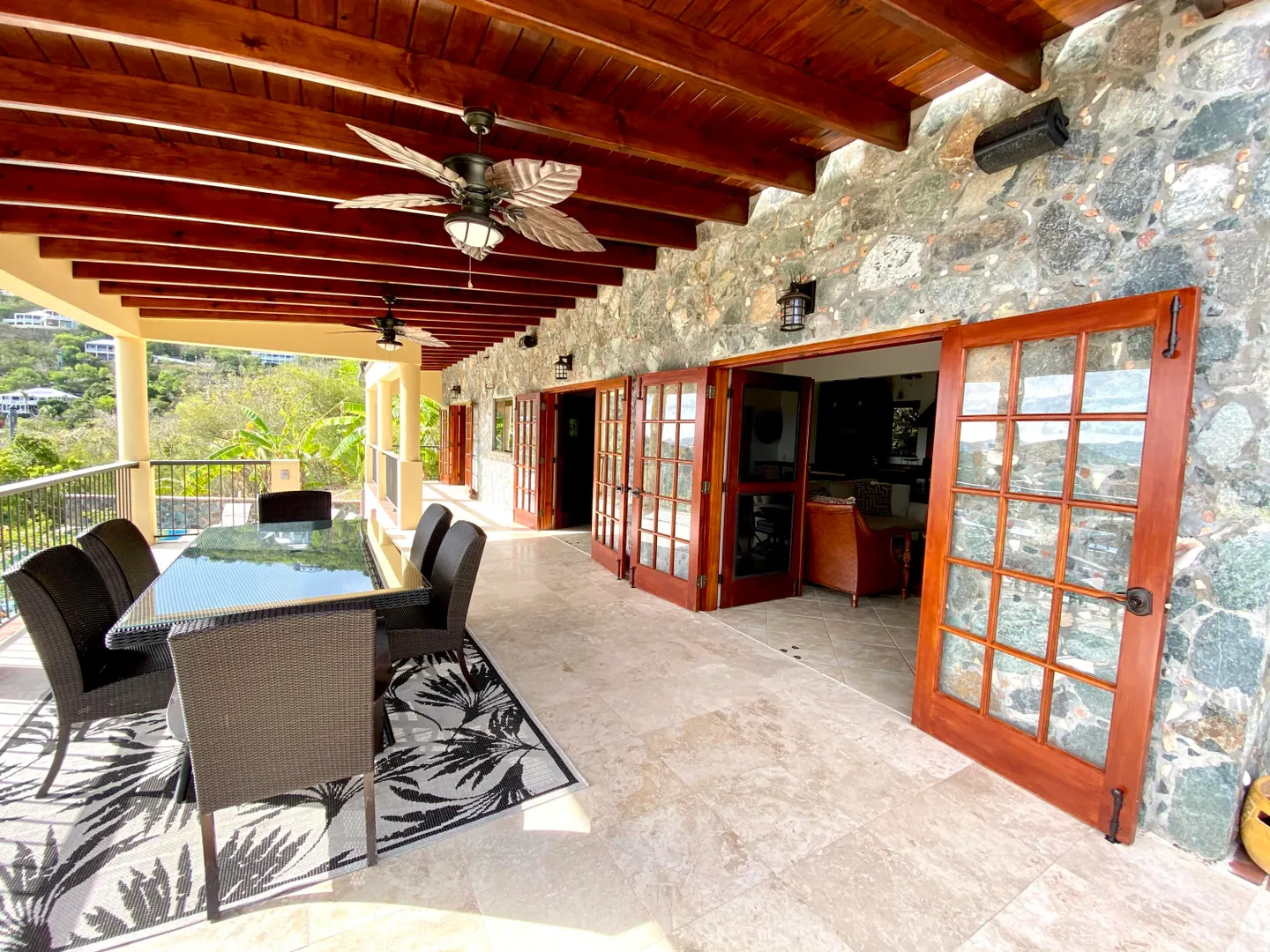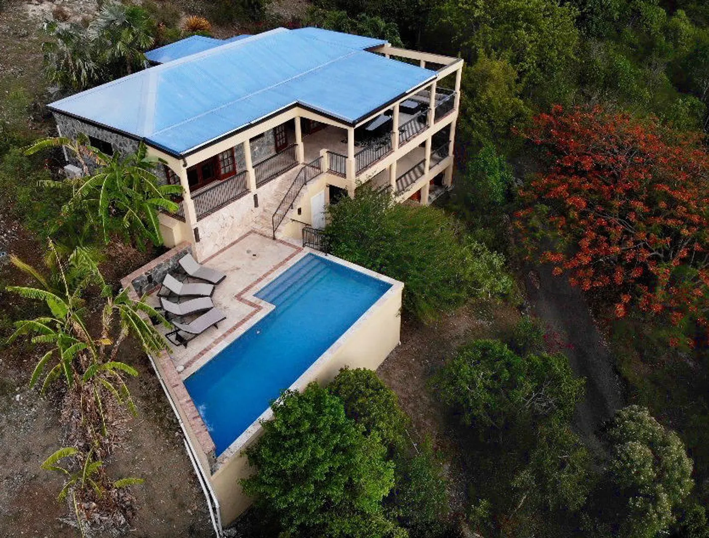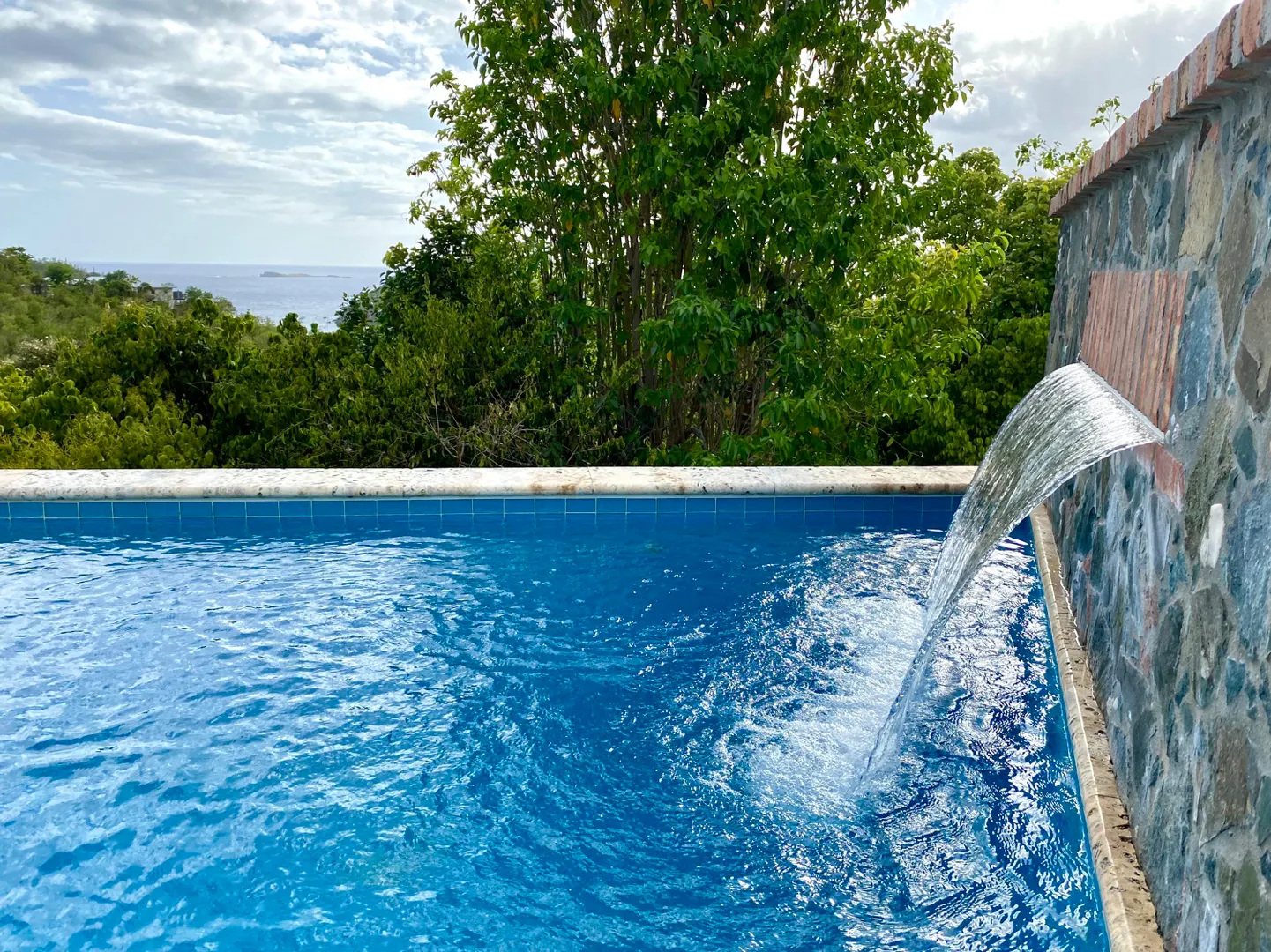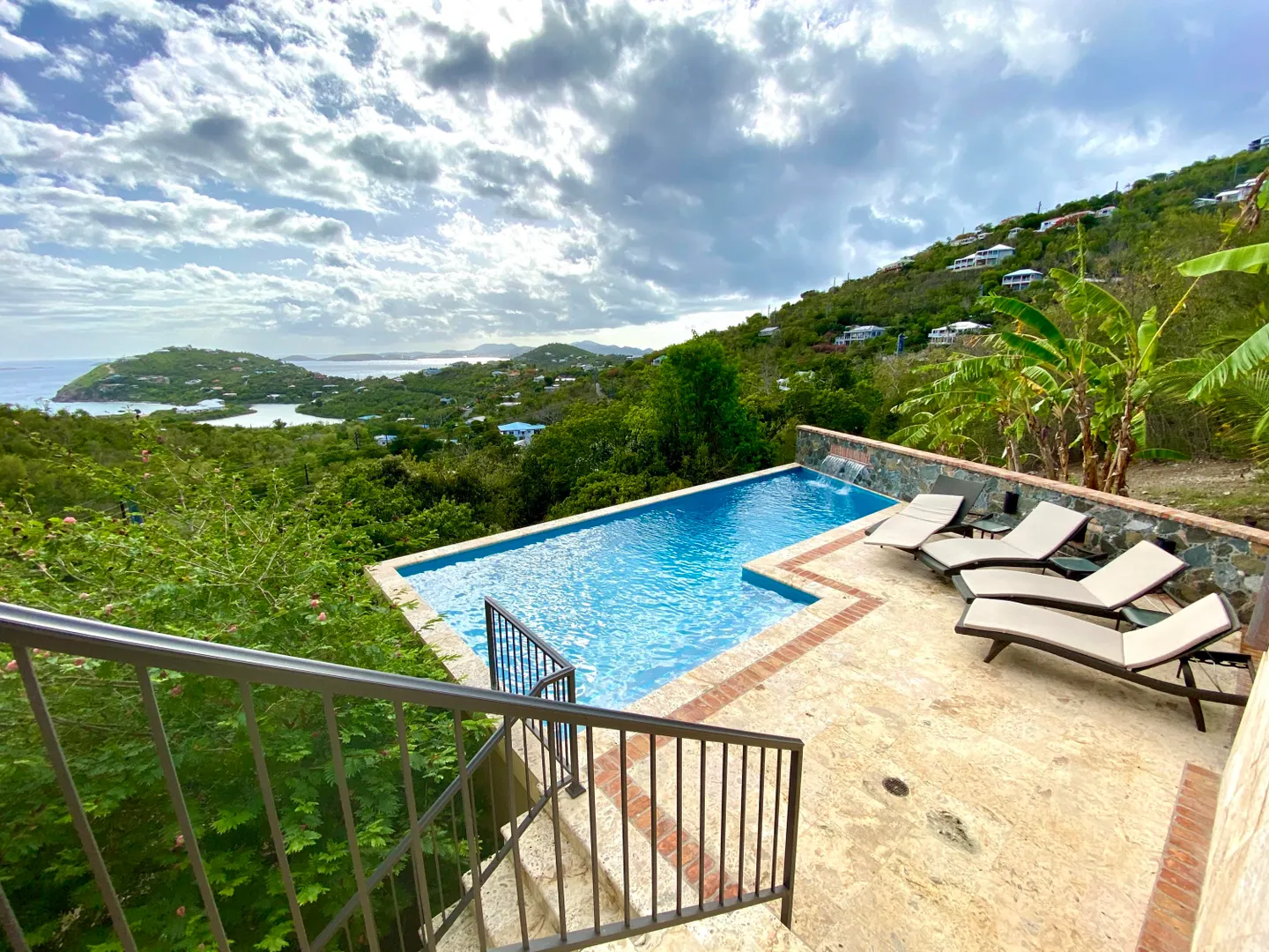 Beneath the Mango Tree - A turn key property for your family residence or vacation home. Gorgeous island stonework highlights the upper level of this home, consisting of the master suite, ensuite bath with an outdoor stone shower, and kitchen/great room. Mahogany french doors open to the wraparound patio bringing the outside in. An office space overlooks the new pool veranda, offering sparkling ocean views while you work from home. The lower level features two guest suites with an additional laundry/storage room. While this has recently been a family home, it offers excellent short term potential. Tastefully decorated, comfortably air conditioned, and professionally landscaped. Close to Cruz Bay, local private schools, and the ocean!