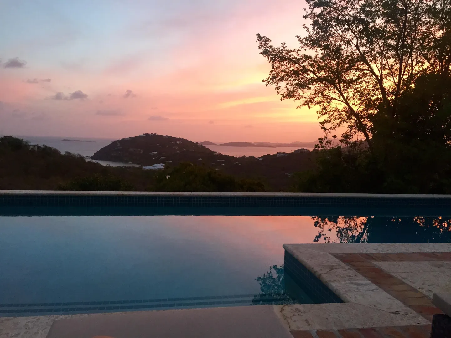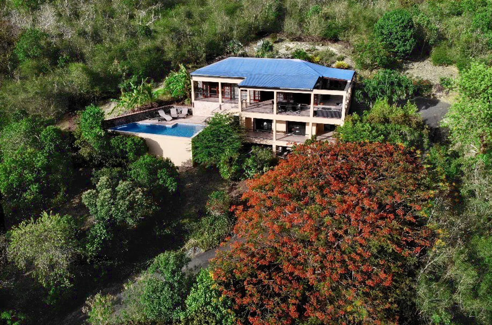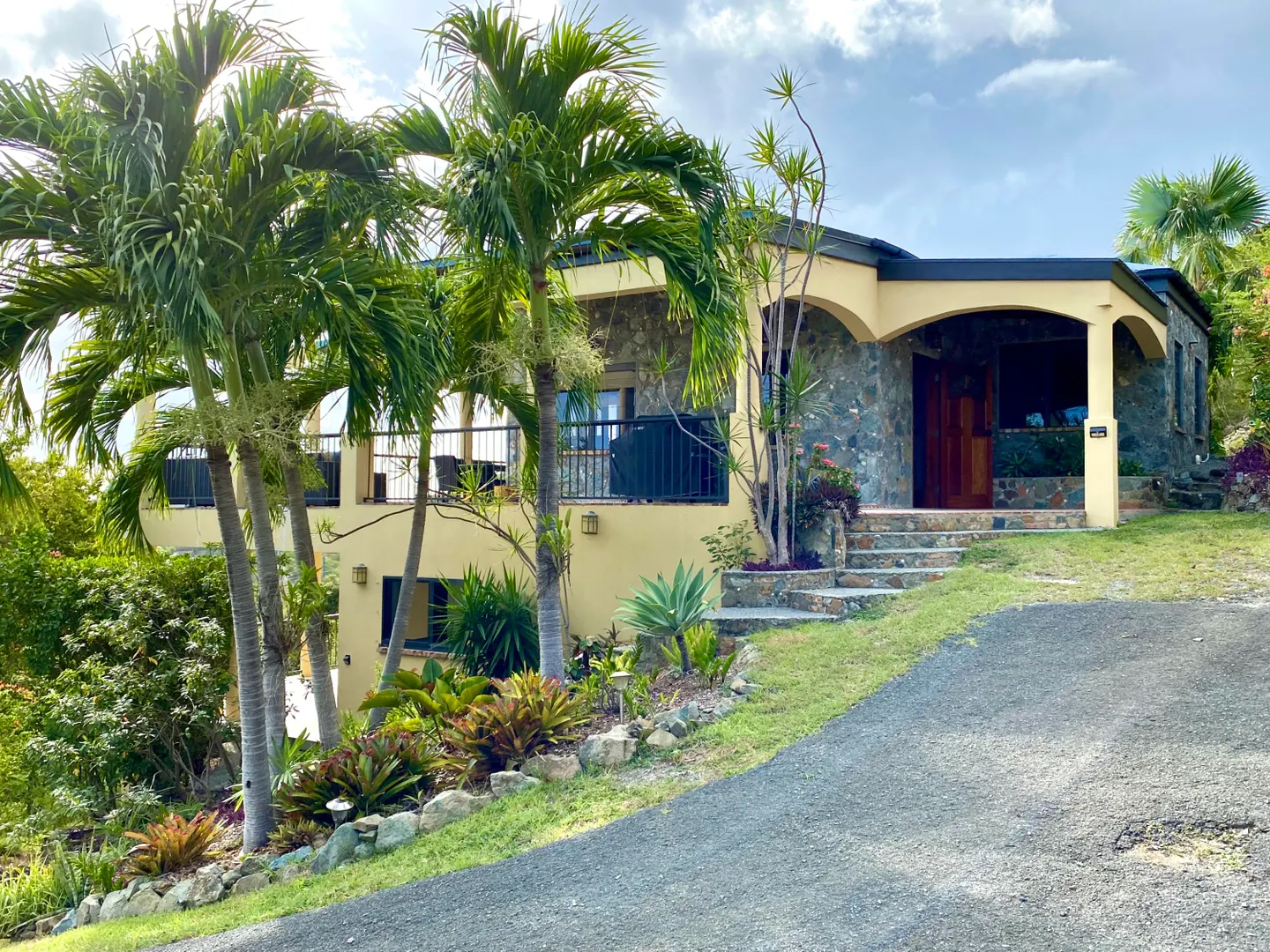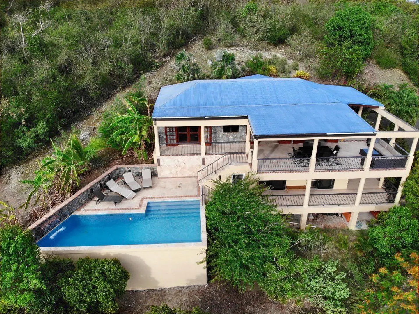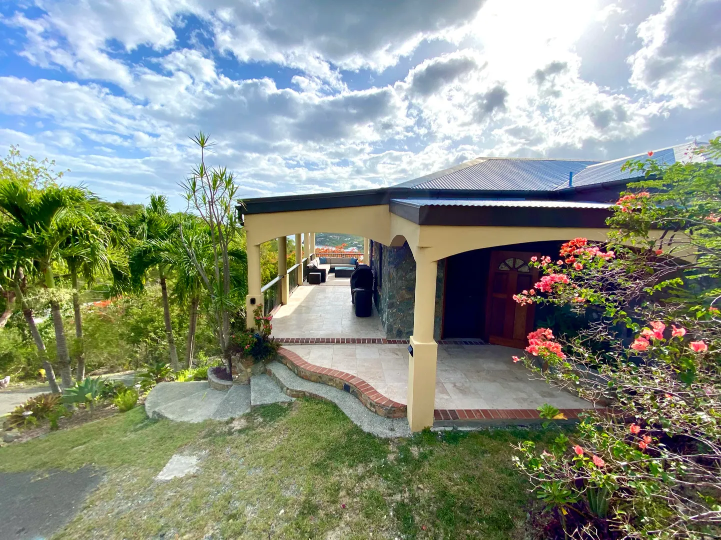 Beneath the Mango Tree - A turn key property for your family residence or vacation home. Gorgeous island stonework highlights the upper level of this home, consisting of the master suite, ensuite bath with an outdoor stone shower, and kitchen/great room. Mahogany french doors open to the wraparound patio bringing the outside in. An office space overlooks the new pool veranda, offering sparkling ocean views while you work from home. The lower level features two guest suites with an additional laundry/storage room. While this has recently been a family home, it offers excellent short term potential. Tastefully decorated, comfortably air conditioned, and professionally landscaped. Close to Cruz Bay, local private schools, and the ocean!