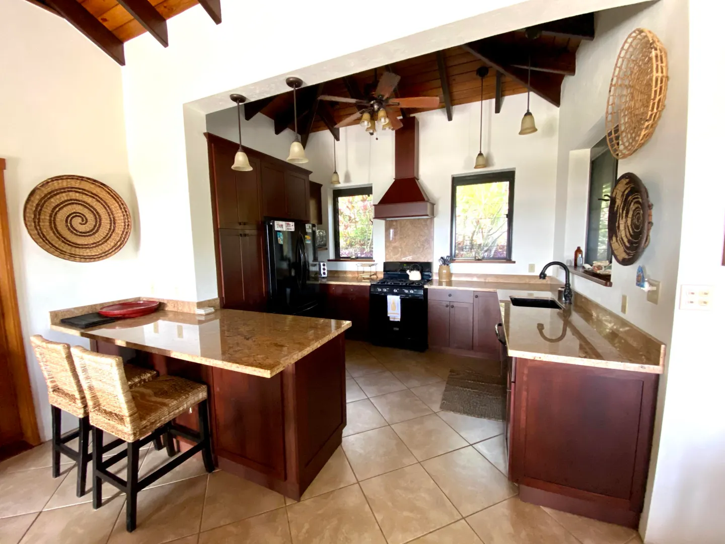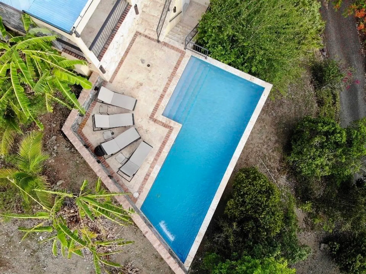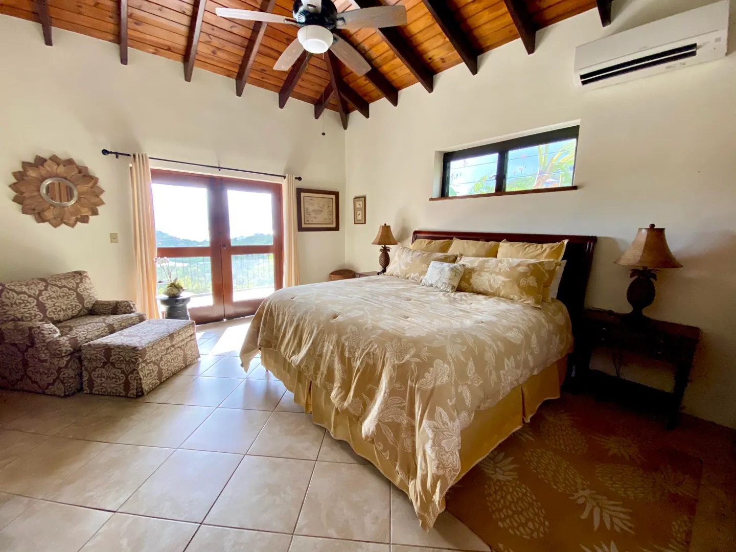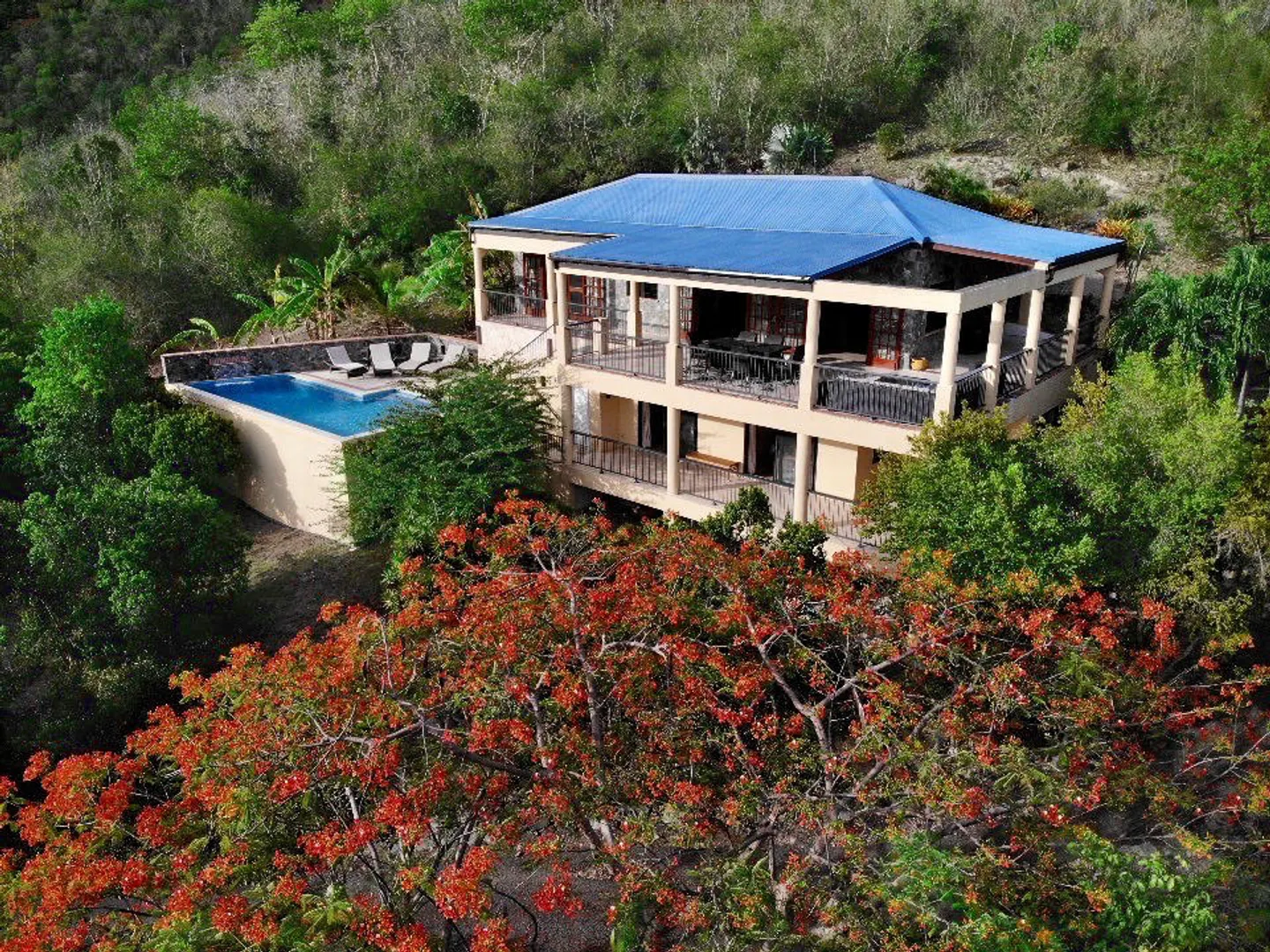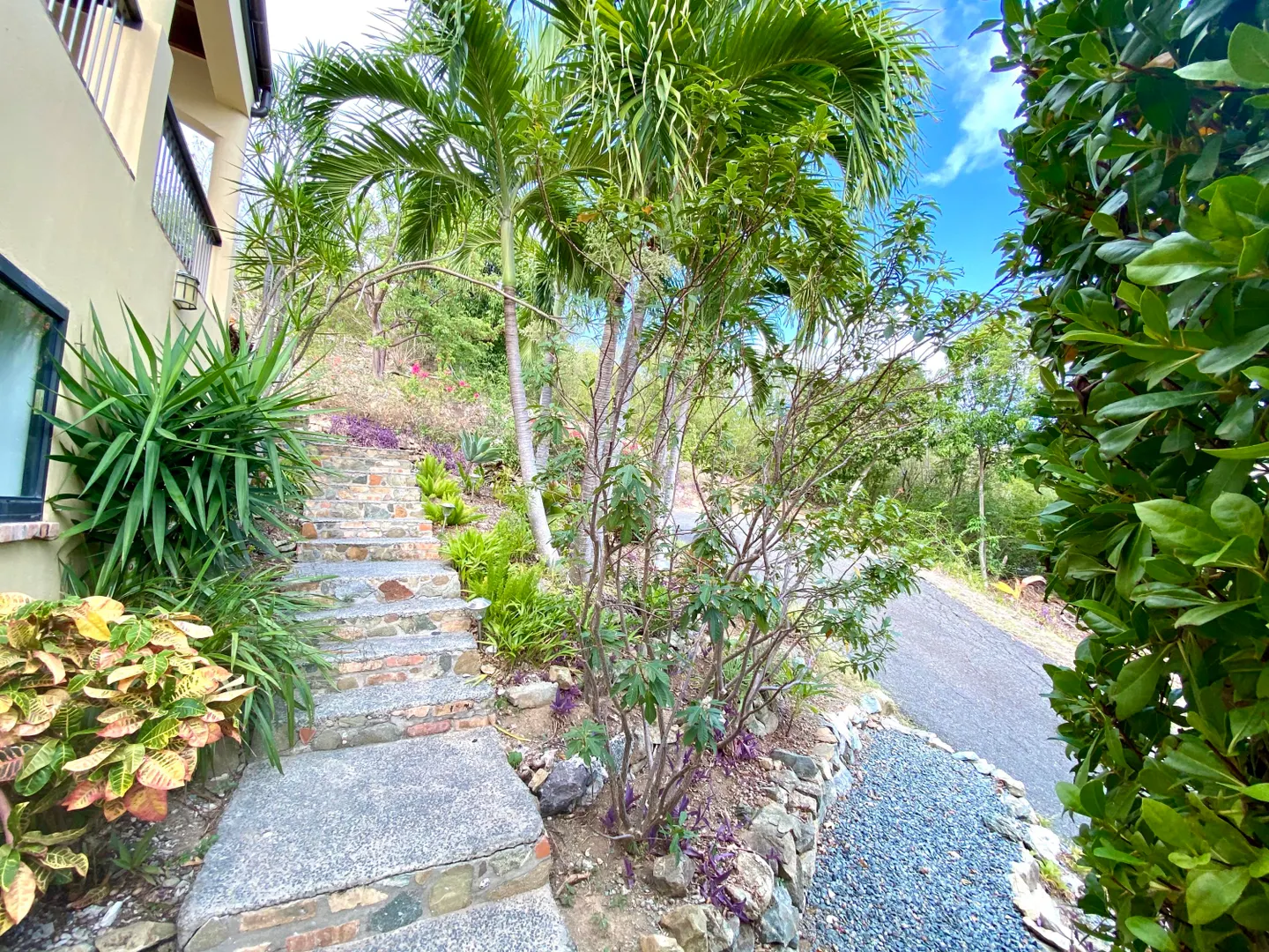Beneath the Mango Tree - A turn key property for your family residence or vacation home. Gorgeous island stonework highlights the upper level of this home, consisting of the master suite, ensuite bath with an outdoor stone shower, and kitchen/great room. Mahogany french doors open to the wraparound patio bringing the outside in. An office space overlooks the new pool veranda, offering sparkling ocean views while you work from home. The lower level features two guest suites with an additional laundry/storage room. While this has recently been a family home, it offers excellent short term potential. Tastefully decorated, comfortably air conditioned, and professionally landscaped. Close to Cruz Bay, local private schools, and the ocean!