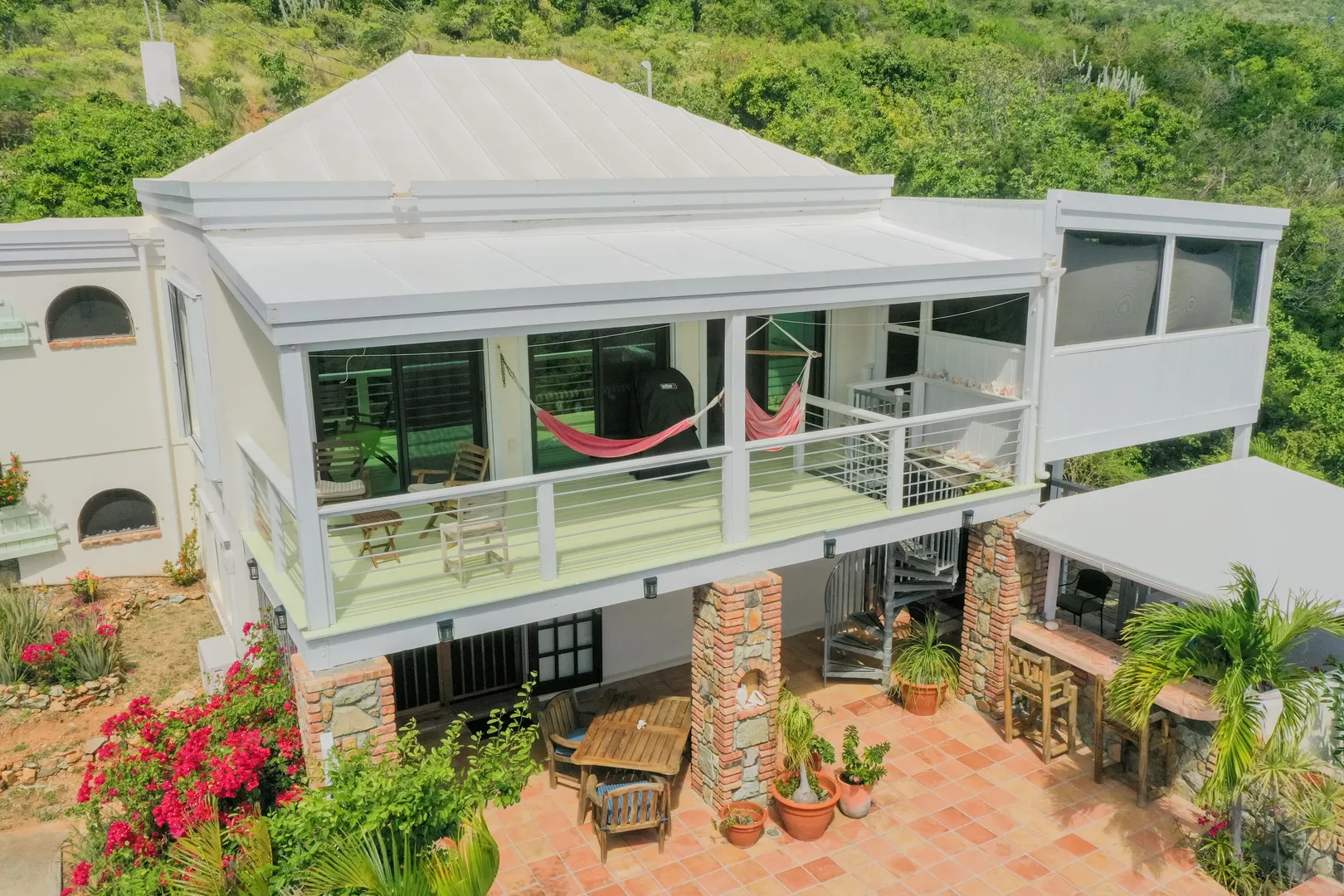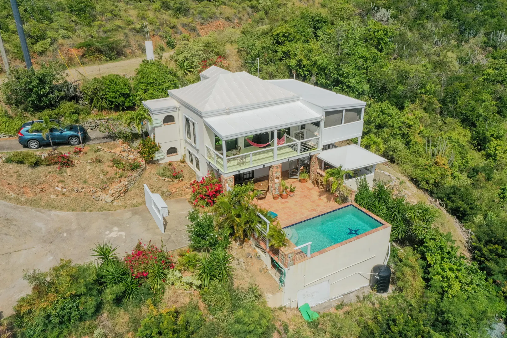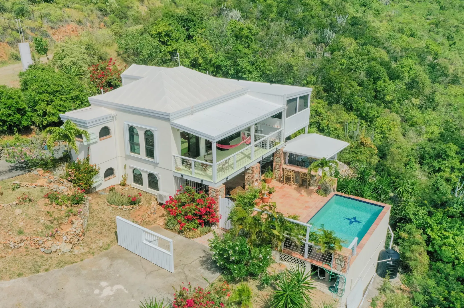 Take your pick of 4 beaches within walking distance from Villa La Sirena! Located in quiet Estate Mandahl, LaSirena offers 2 bedrooms & 3 baths plus a sleeping loft. Recent improvements include a beautiful new sun porch, new windows & doors, new roll down shutters, new a/c units & newly refinished kitchen concrete counter tops & appliances. The saltwater masonry pool is surrounded by a tiled deck & covered pool cabana/bar & lush landscaping. Bothupper & lower levels of La Sirena offer covered verandahs overlooking lush National Park lands. Many Caribbean touches throughout such as Saltillo tile, bricked finished windowsills, teak furniture, arched openings & hand painted murals. Property has been very well maintained & when previously short-term rented, it was a solid performer.