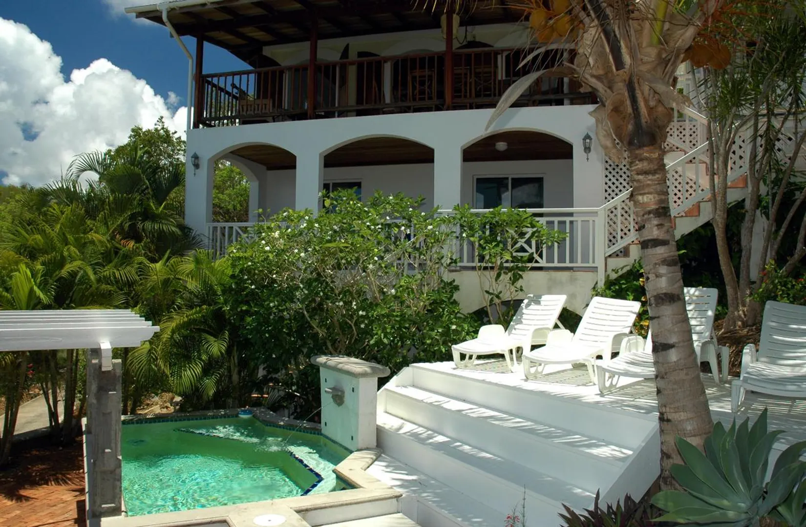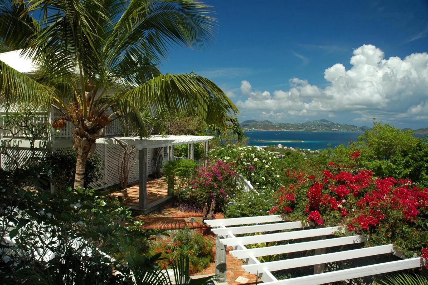SIX PALMS is wonderful, private villa that could be (and has been) a very successful rental property. Great sunset views over Pillsbury Sound, St. Thomas and the outer Cays accents the solid masonry construction of this two unit home. Can be occupied as a 5 bedroom home or a 3 bedroom main house and 2 bedroom cottage. Quiet, end of the road cul-de-sac location close to town makes this unique!