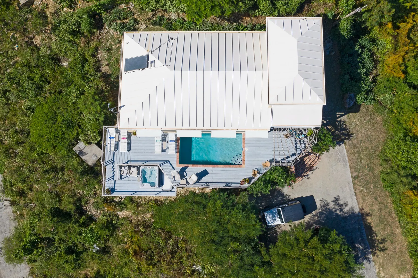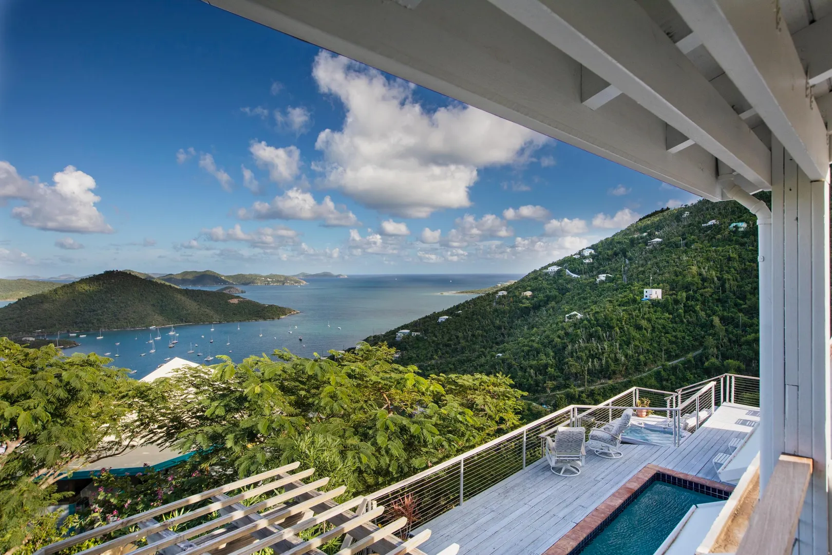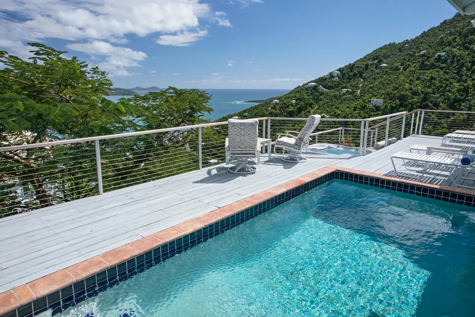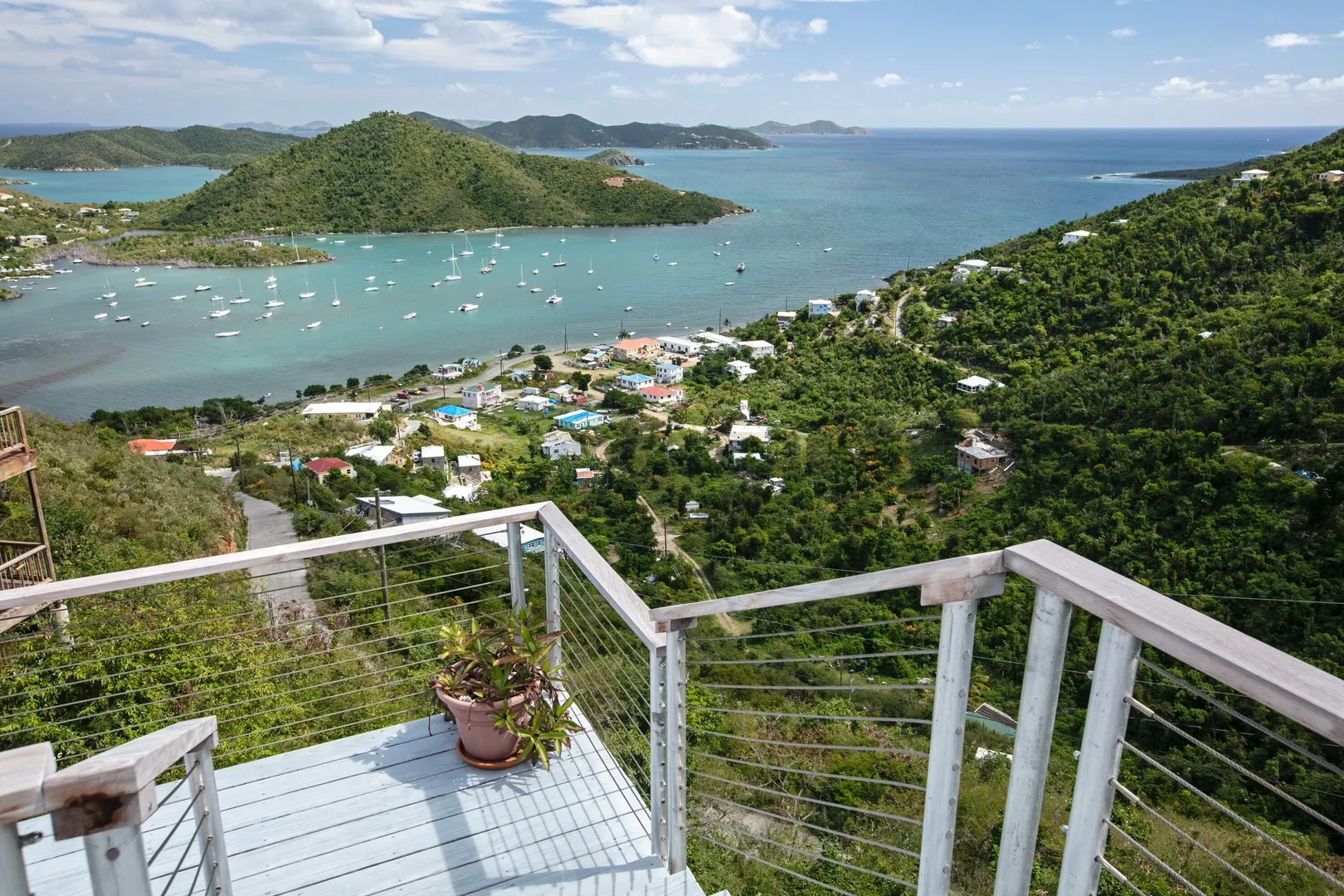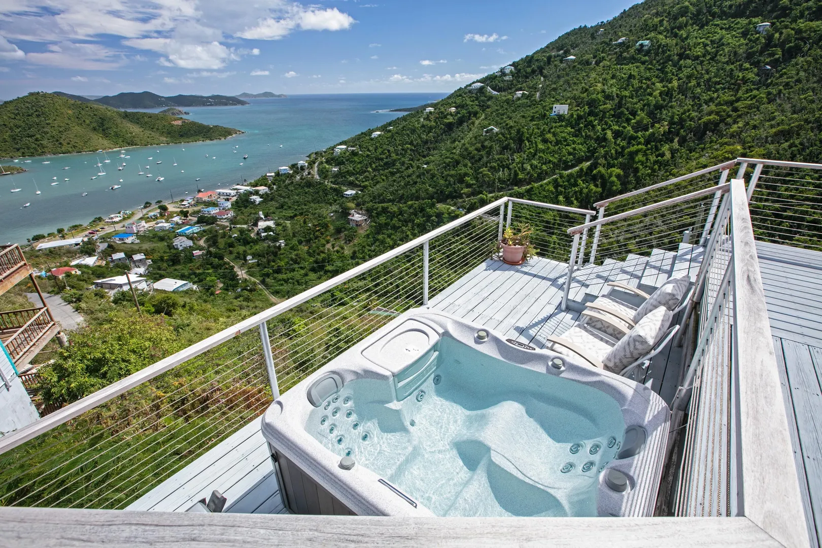 Brisas Del Mar translation sea breezes, is a solid masonry 3 bedroom, 3 bath successful short term rental perched high overlooking Coral Bay, Hurricane Hole and the BVI. The main floor includes a large great room with cathedral ceilings, ample living and entertaining space, two bedroom en-suites, and pool deck. The upper king suite is accessed by spiral staircase and features private balcony. All bedrooms enjoy beautiful views and have direct interior access to the great room, making this home perfect for families with children. Renovation completed 2018/2019 by Dan Boyd included new cable railing with Epi detailing, new hot tub, all new windows and patio sliders, new hurricane shutters, painting inside and out, and new interior appointments. This house is very well maintained and loved.