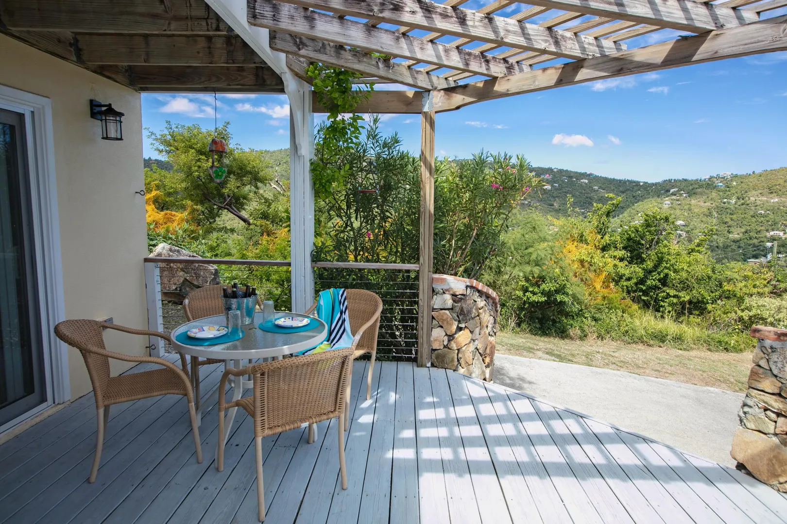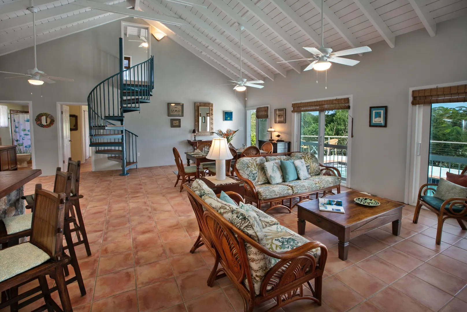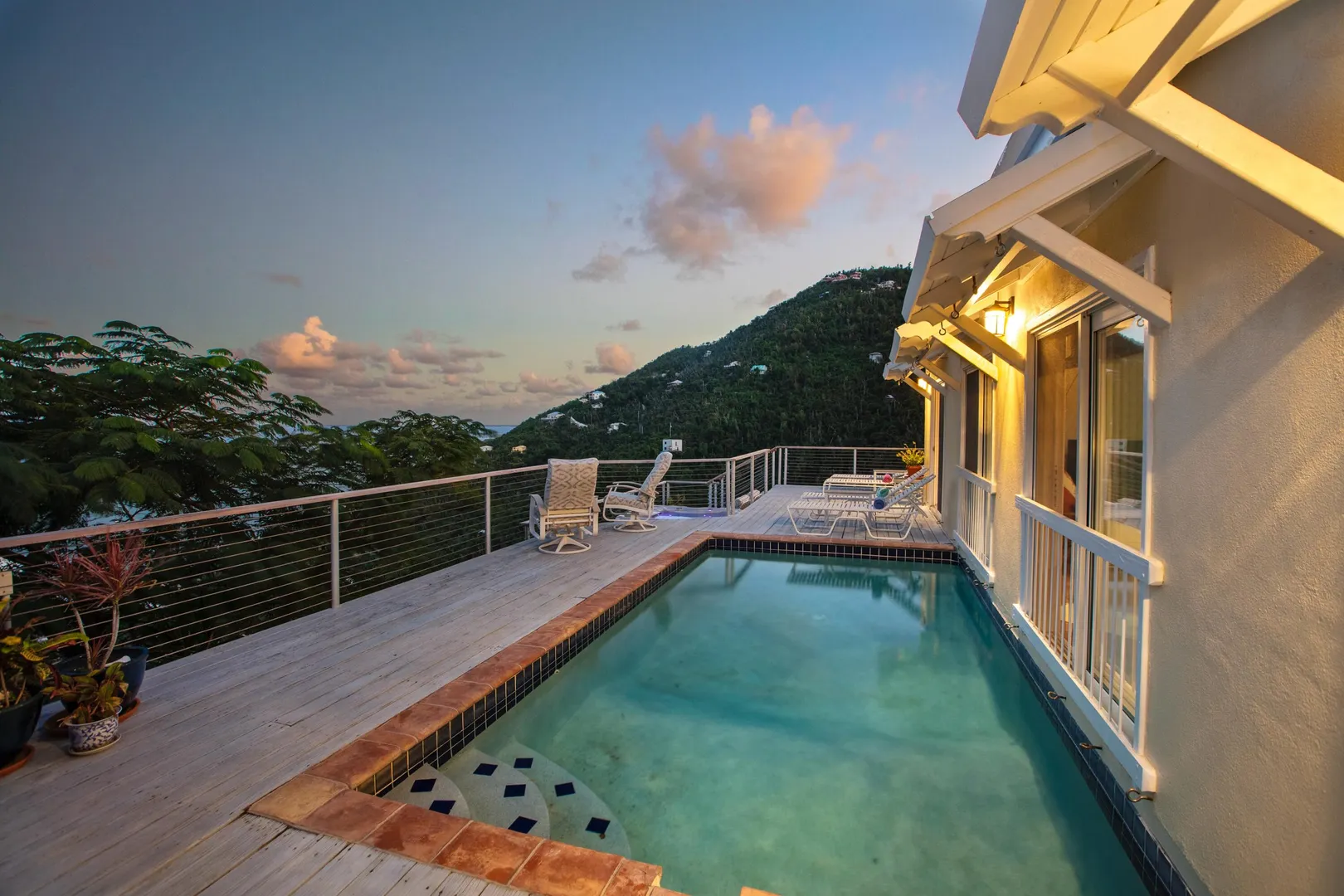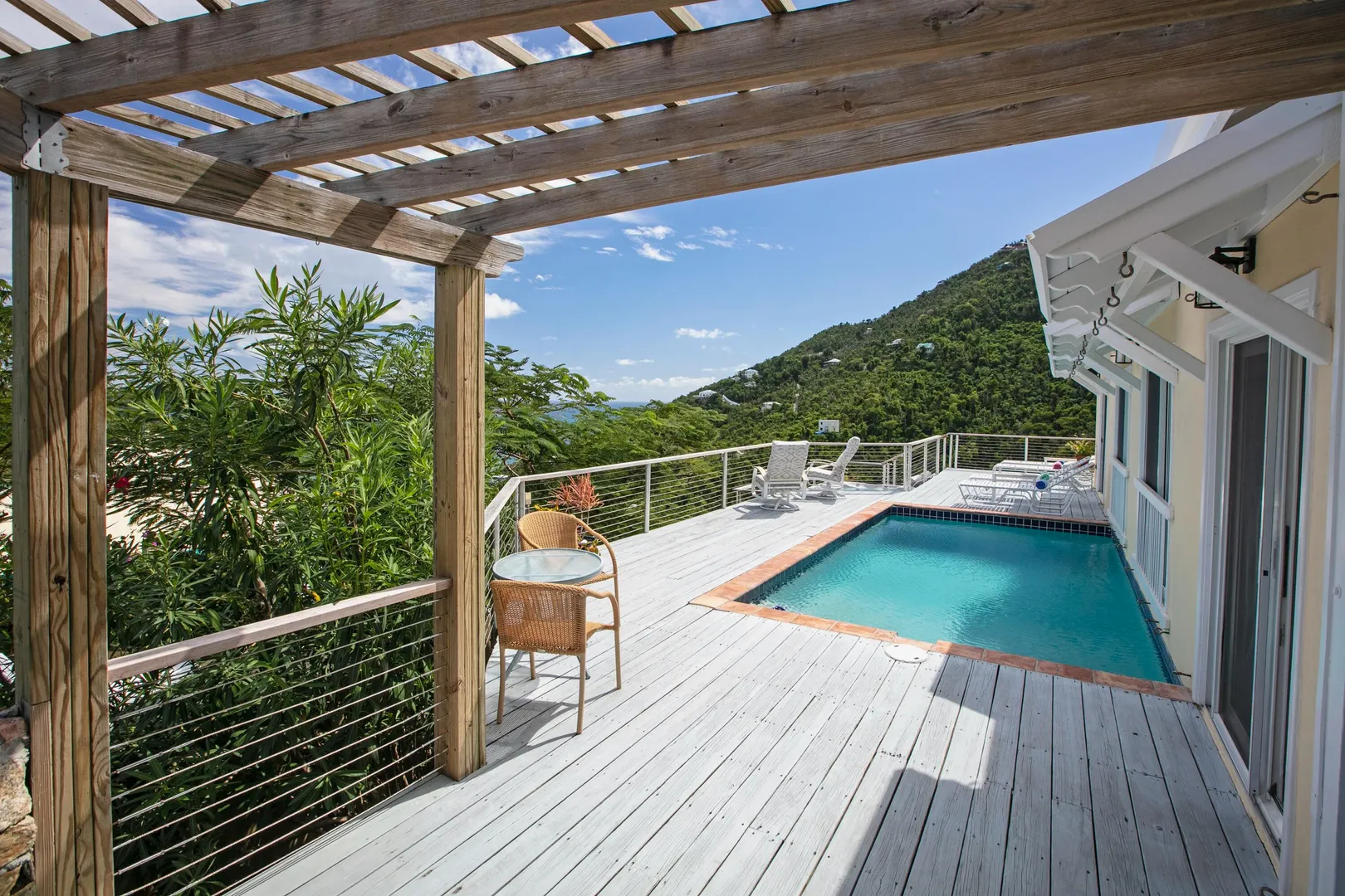 Brisas Del Mar translation sea breezes, is a solid masonry 3 bedroom, 3 bath successful short term rental perched high overlooking Coral Bay, Hurricane Hole and the BVI. The main floor includes a large great room with cathedral ceilings, ample living and entertaining space, two bedroom en-suites, and pool deck. The upper king suite is accessed by spiral staircase and features private balcony. All bedrooms enjoy beautiful views and have direct interior access to the great room, making this home perfect for families with children. Renovation completed 2018/2019 by Dan Boyd included new cable railing with Epi detailing, new hot tub, all new windows and patio sliders, new hurricane shutters, painting inside and out, and new interior appointments. This house is very well maintained and loved.