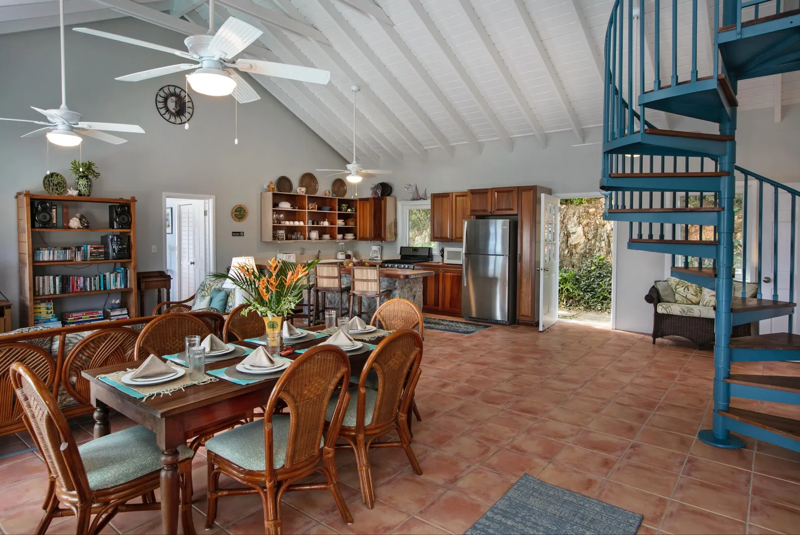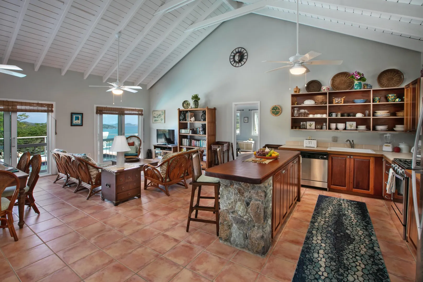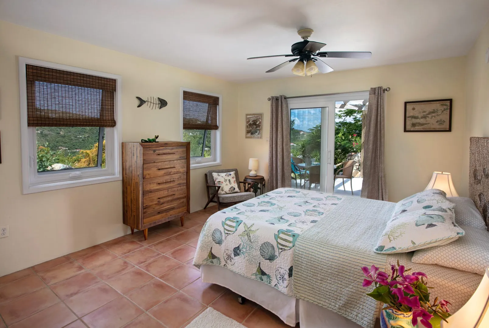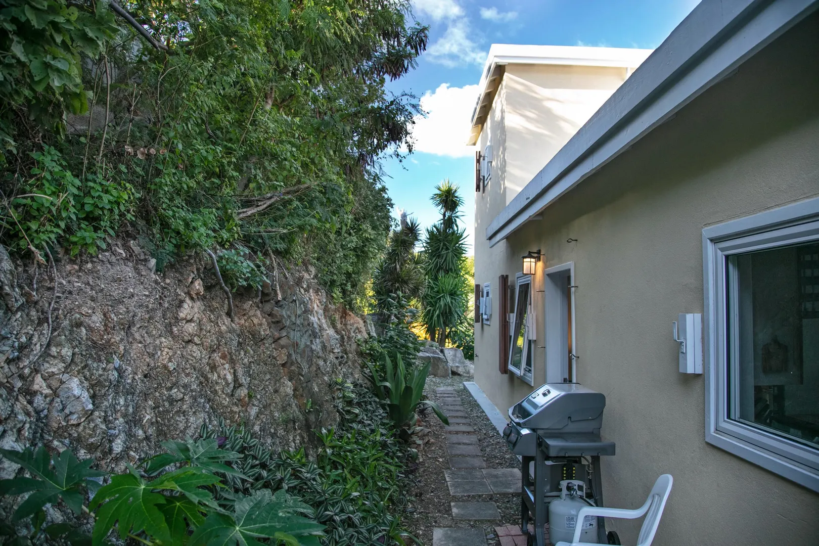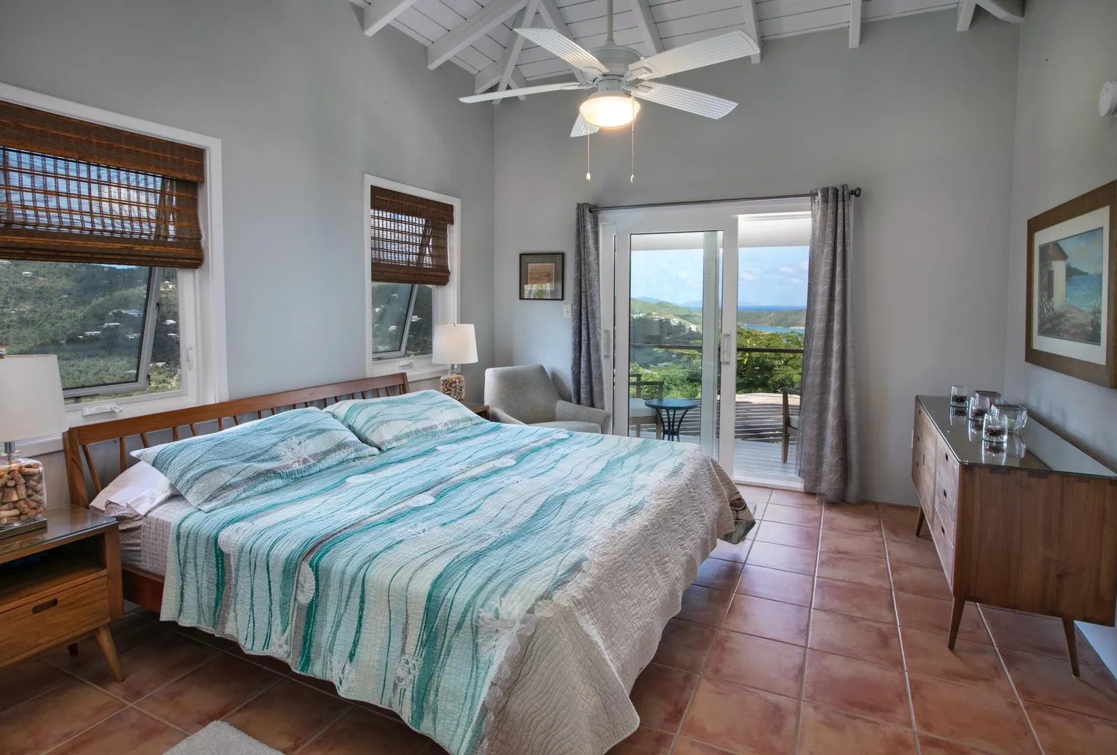 Brisas Del Mar translation sea breezes, is a solid masonry 3 bedroom, 3 bath successful short term rental perched high overlooking Coral Bay, Hurricane Hole and the BVI. The main floor includes a large great room with cathedral ceilings, ample living and entertaining space, two bedroom en-suites, and pool deck. The upper king suite is accessed by spiral staircase and features private balcony. All bedrooms enjoy beautiful views and have direct interior access to the great room, making this home perfect for families with children. Renovation completed 2018/2019 by Dan Boyd included new cable railing with Epi detailing, new hot tub, all new windows and patio sliders, new hurricane shutters, painting inside and out, and new interior appointments. This house is very well maintained and loved.