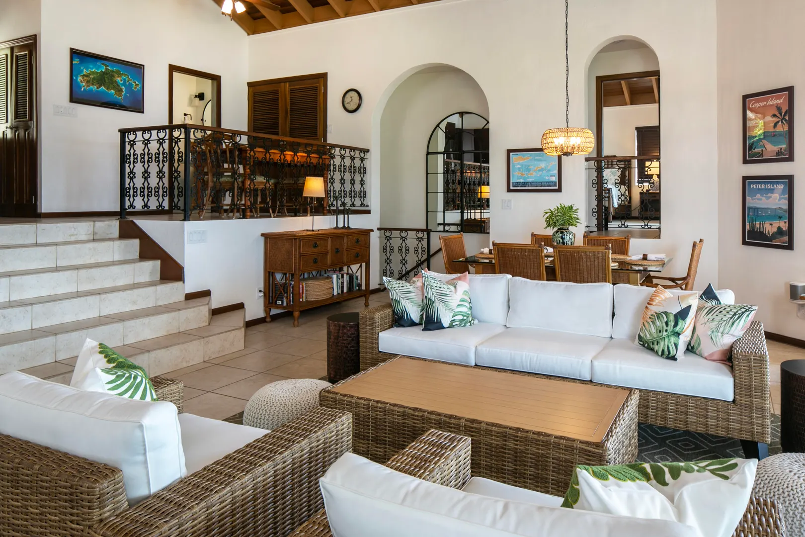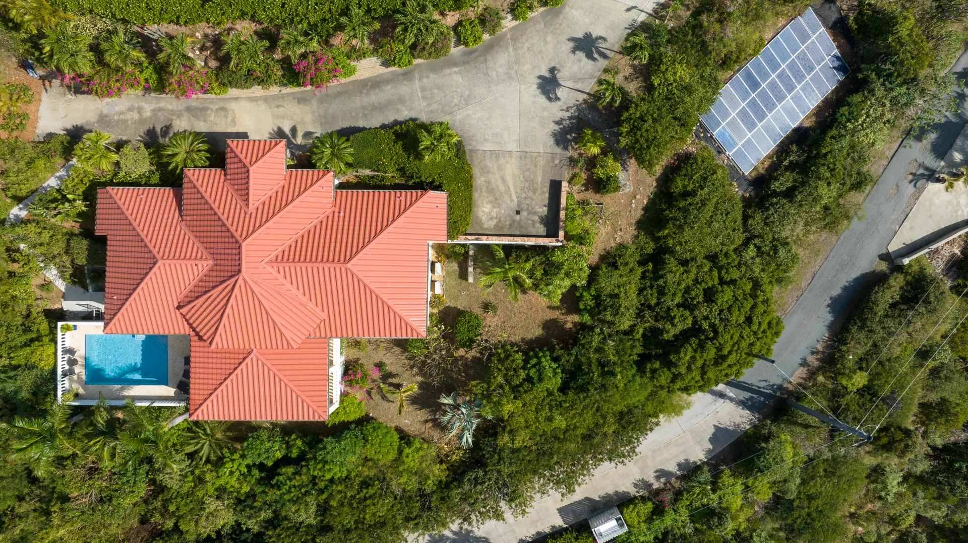 SEA PALMS is an extremely well maintained home with panoramic ocean & sunset views, steady breezes & a large great room opening up to a covered masonry terrace. Minutes from Cruz Bay in coveted Great Cruz Bay, it offers privacy, convenience, & access to a neighborhood boat dock. The home features 3 bedroom suites with full interior access, a new kitchen with modern appliances, & AC throughout. Smart home systems include pool, AC, locking & water controls. 33 solar panels charge four Tesla batteries. Hurricane rated glass doors, & armor screens. Outdoor living is centered around a saltwater pool with coral stone decks. Set on a large corner lot with guest house potential, Sea Palms delivers a polished & private island lifestyle.